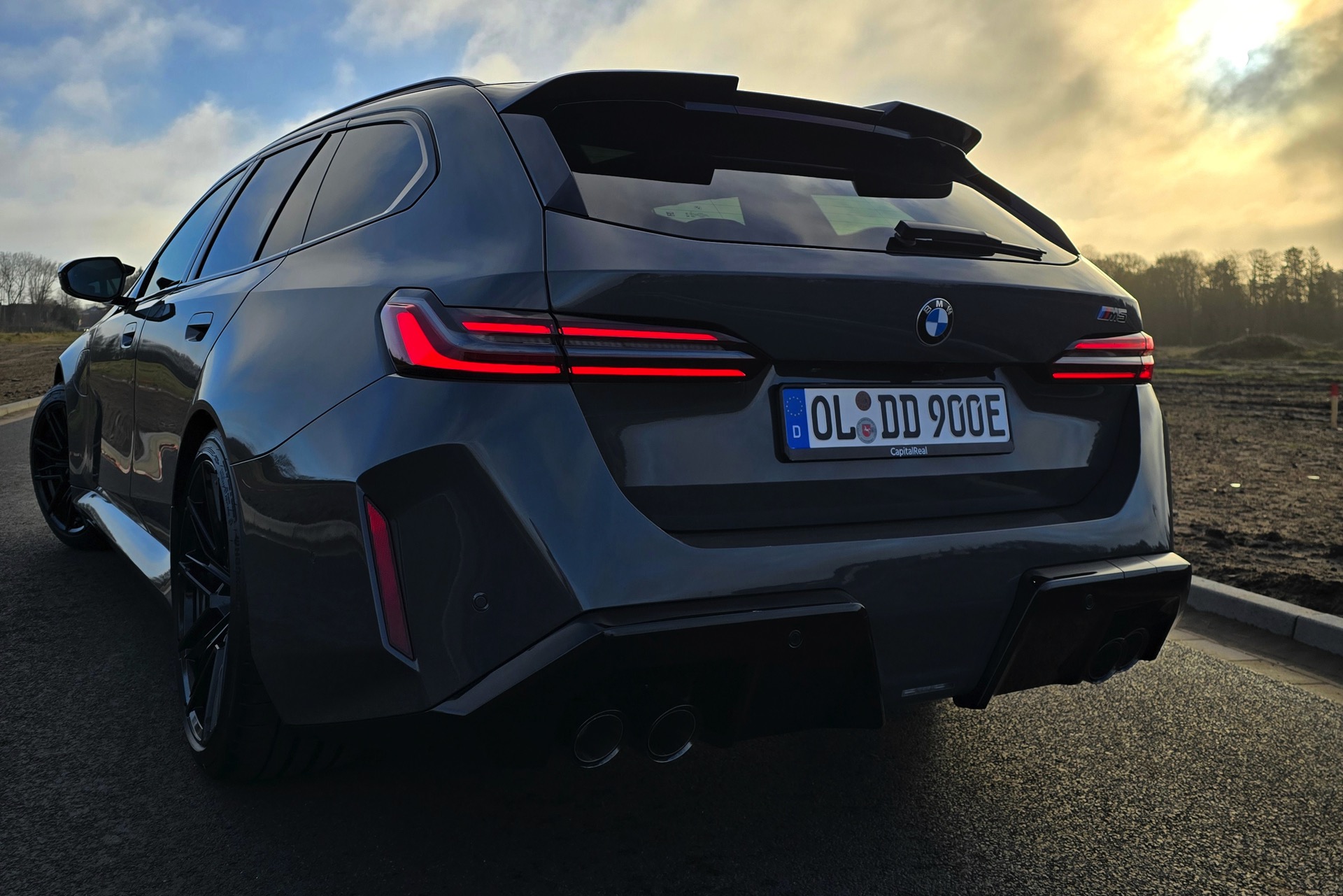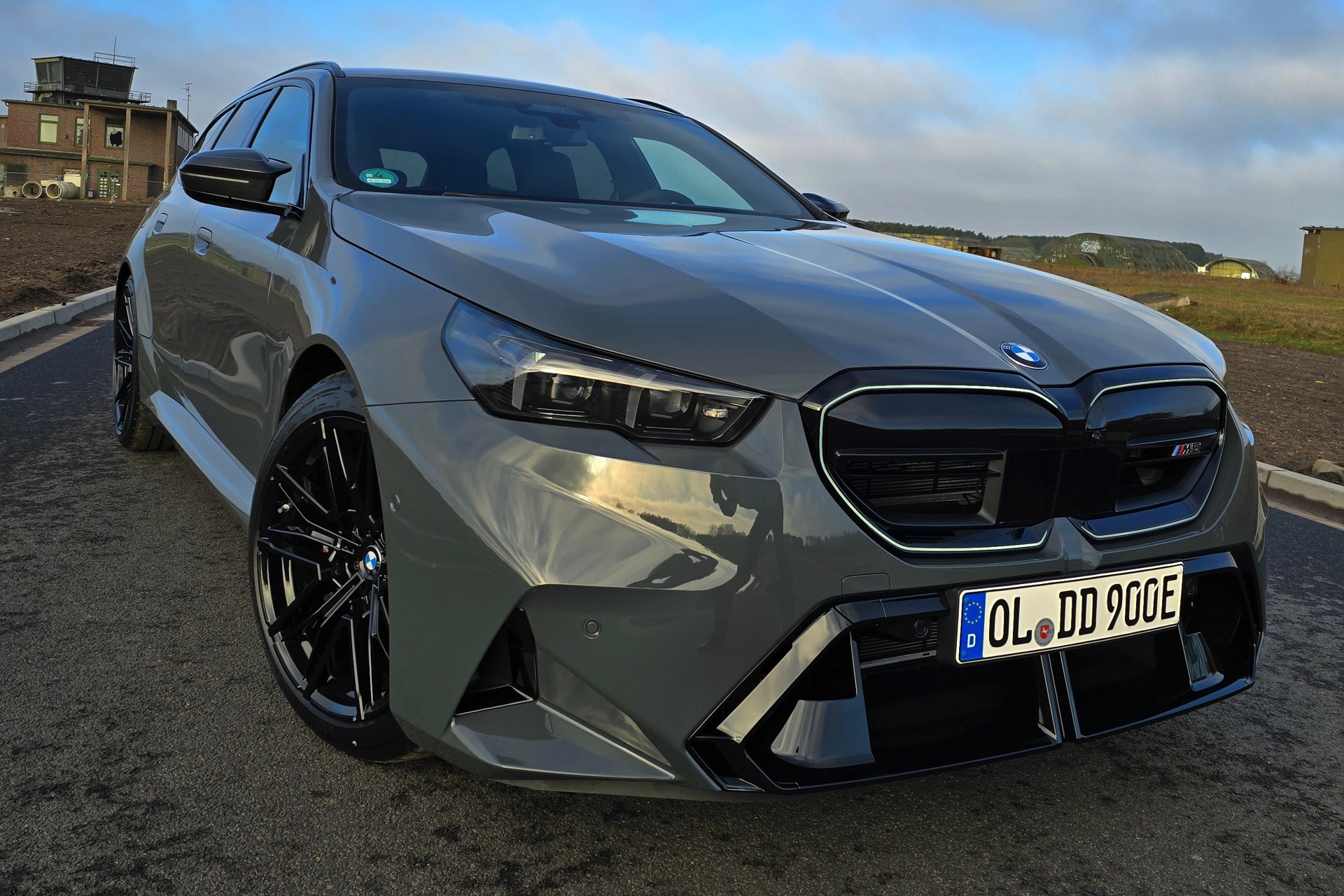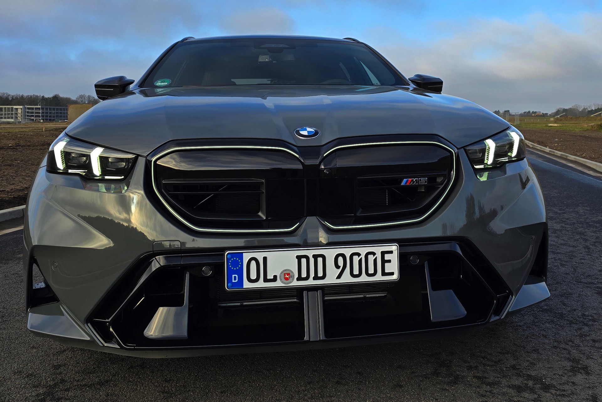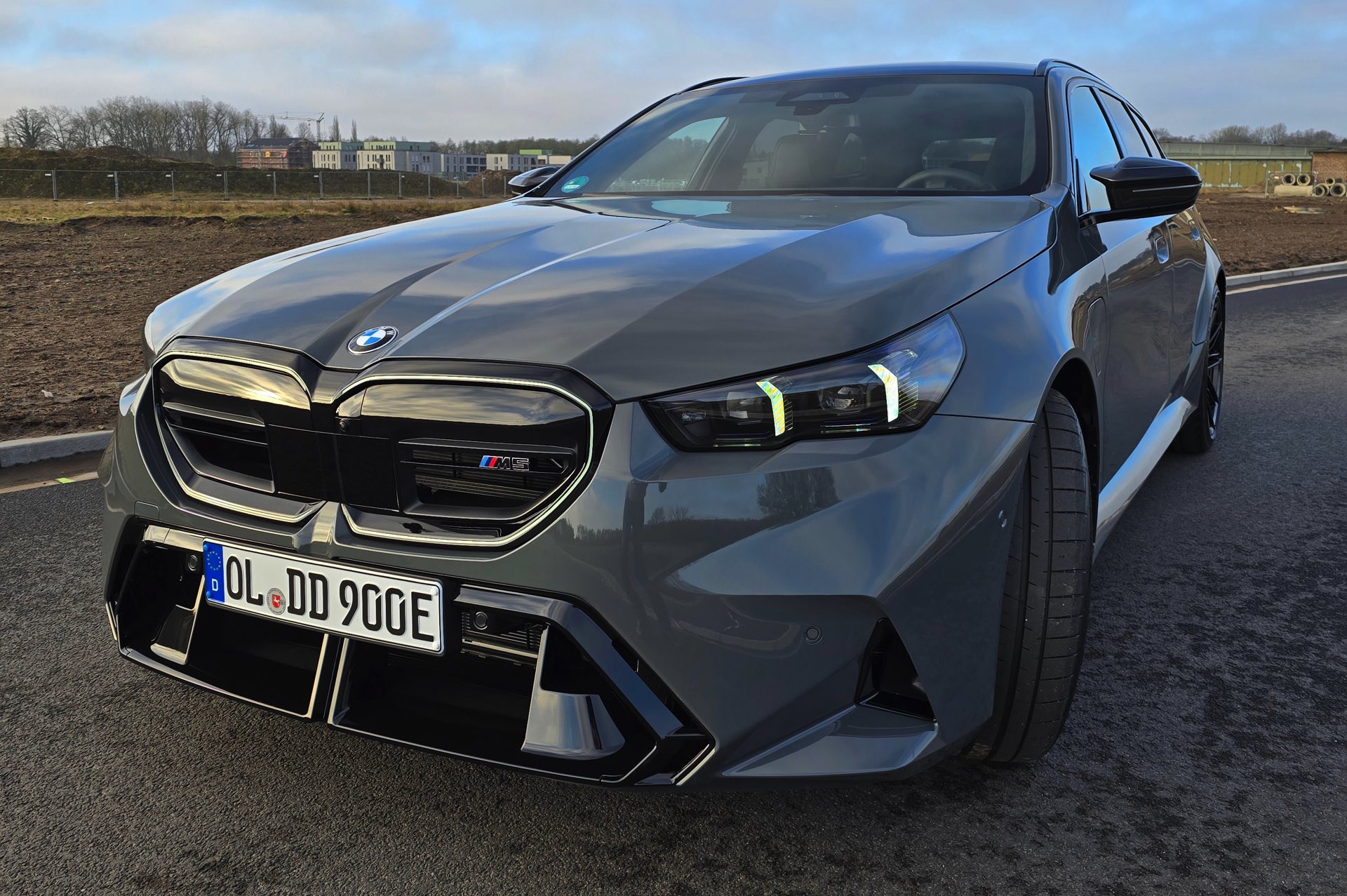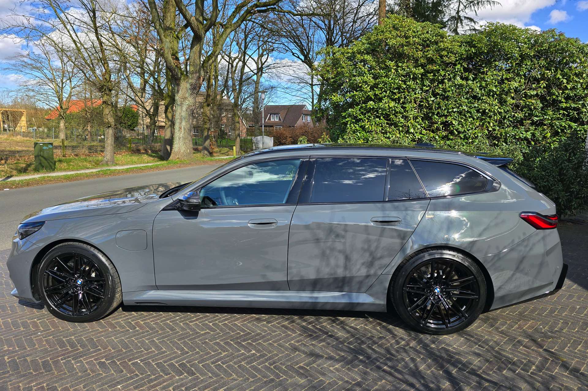 Nachdem die Farbe im vergangenen Sommer als eine von wenigen Individual-Optionen für das BMW M2 Facelift (G87 LCI) wieder zum Gesprächsthema wurde, hat sich auch einer unserer Leser bei der Konfiguration seines neuen BMW M5 Touring (G99) für Grigio Telesto entschieden. Seine Fotos liefern uns einen Eindruck von der Wirkung der Lackierung, die die Formen des Power-Kombis wunderbar herausstellt: Von der mächtigen Frontschürze mit ihrem riesigen Lufteinlass über die vorne wie hinten deutlich verbreiterten Kotflügel bis hin zur markanten Heckpartie mit ihrem zweigeteilten Diffusor kommen sämtliche Design-Highlights des neuen M5 Touring hervorragend zur Geltung.
