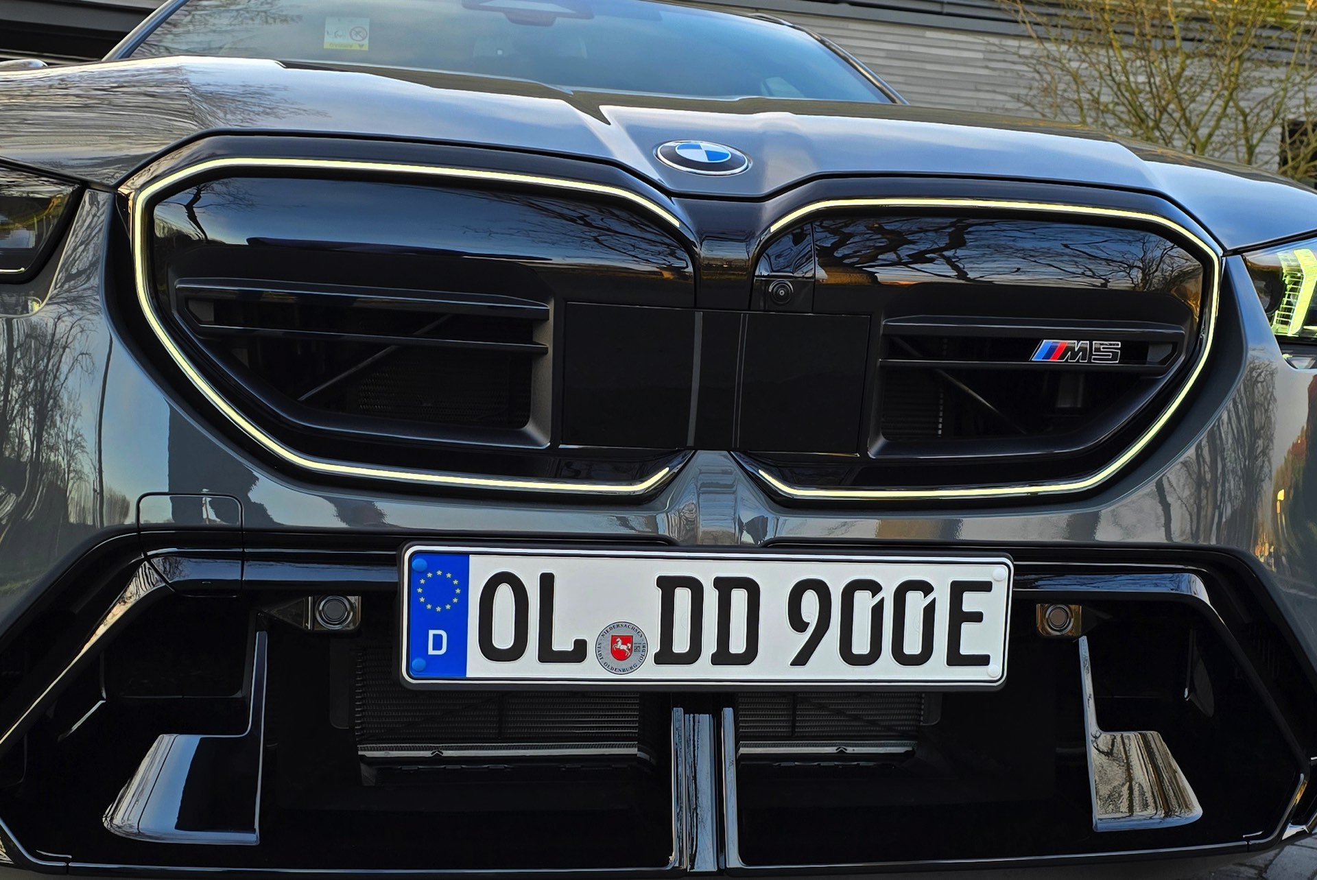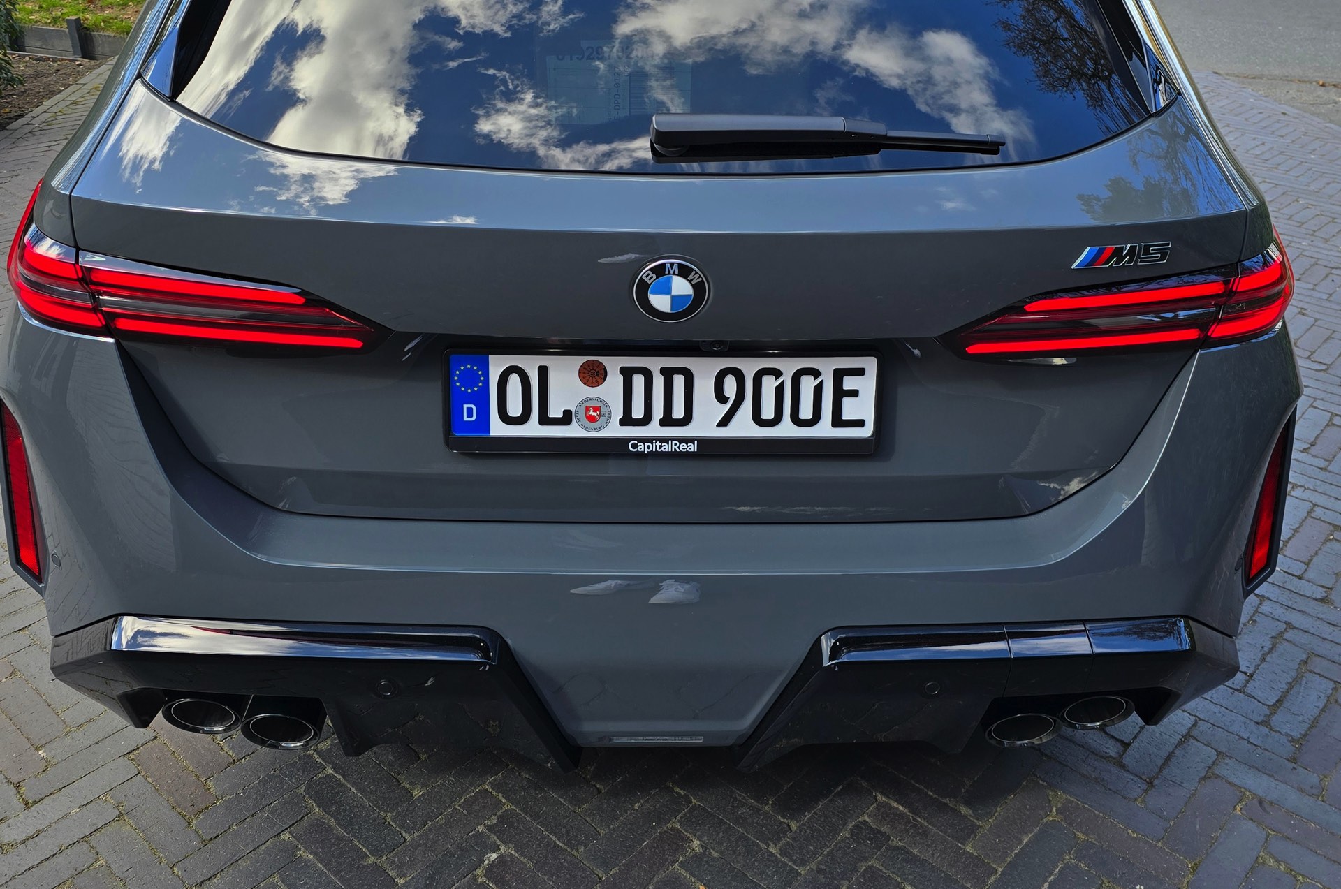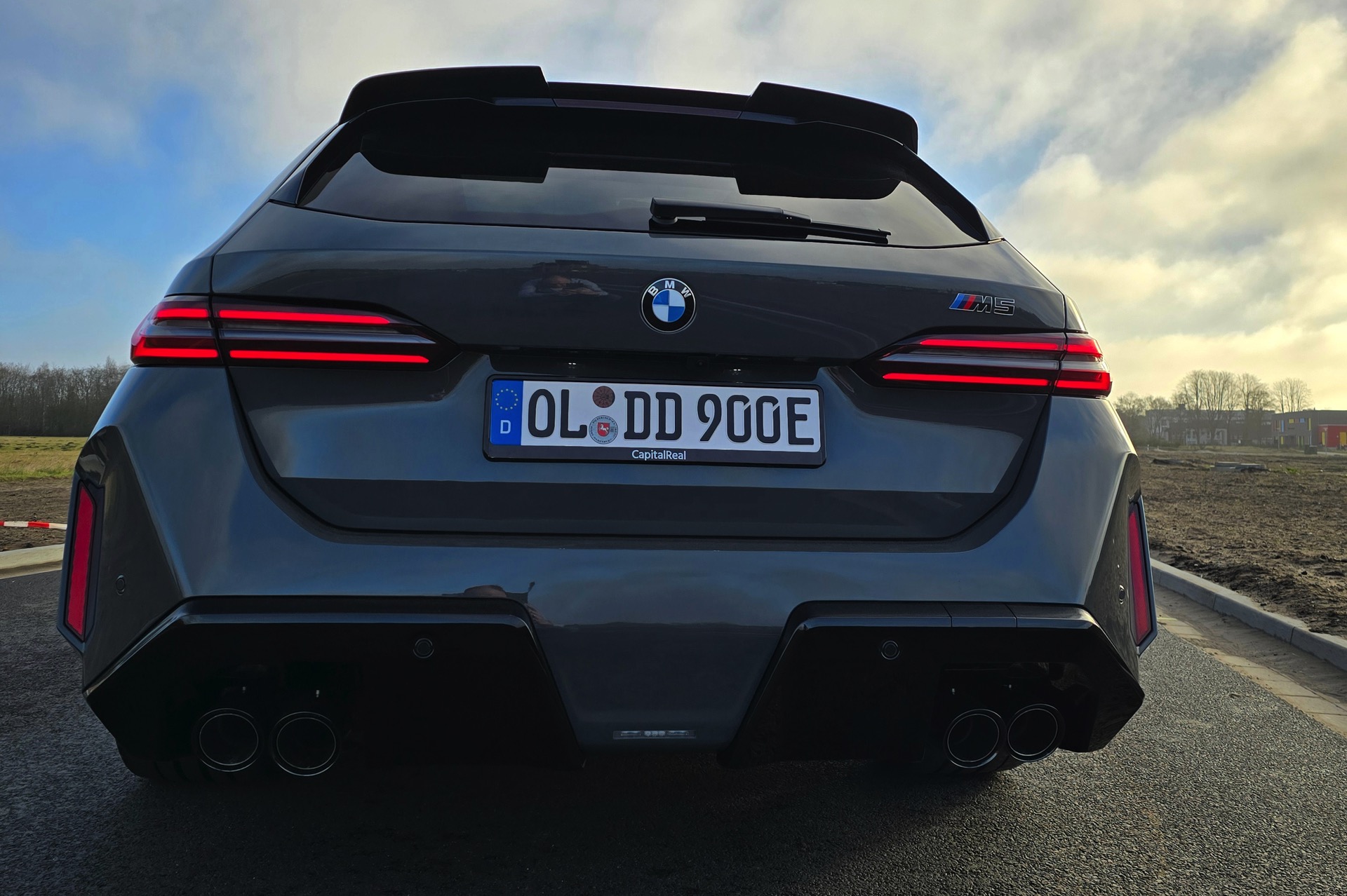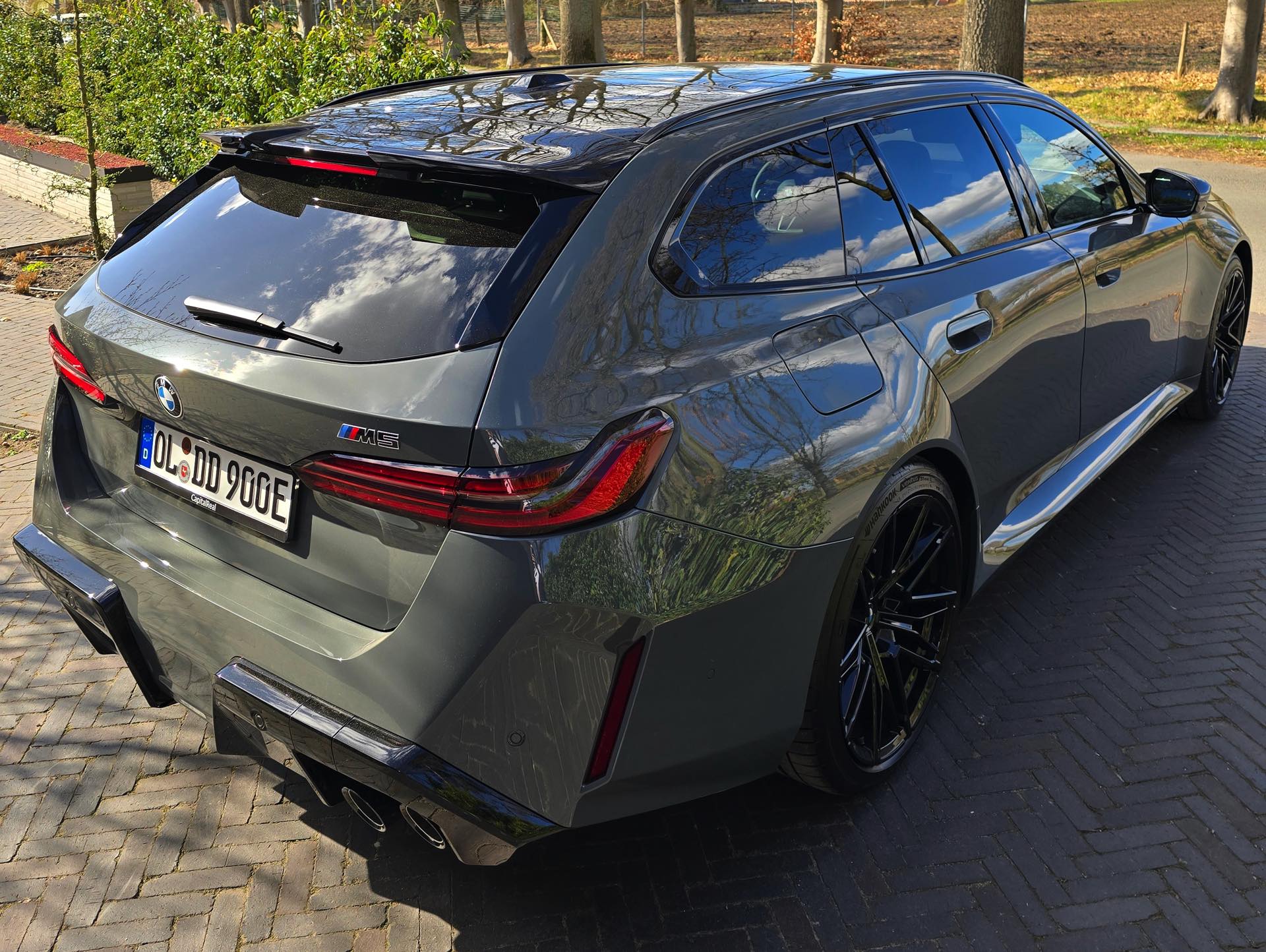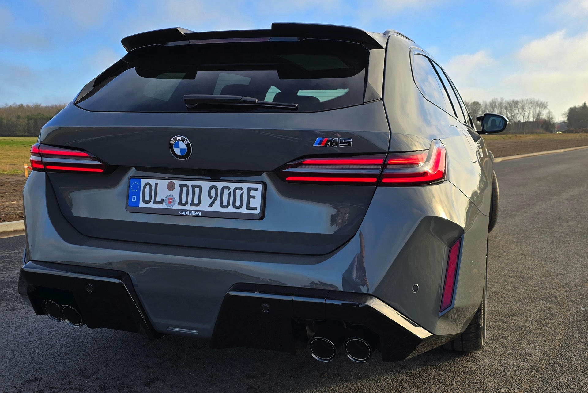 Nachdem die Farbe im vergangenen Sommer als eine von wenigen Individual-Optionen für das BMW M2 Facelift (G87 LCI) wieder zum Gesprächsthema wurde, hat sich auch einer unserer Leser bei der Konfiguration seines neuen BMW M5 Touring (G99) für Grigio Telesto entschieden. Seine Fotos liefern uns einen Eindruck von der Wirkung der Lackierung, die die Formen des Power-Kombis wunderbar herausstellt: Von der mächtigen Frontschürze mit ihrem riesigen Lufteinlass über die vorne wie hinten deutlich verbreiterten Kotflügel bis hin zur markanten Heckpartie mit ihrem zweigeteilten Diffusor kommen sämtliche Design-Highlights des neuen M5 Touring hervorragend zur Geltung.