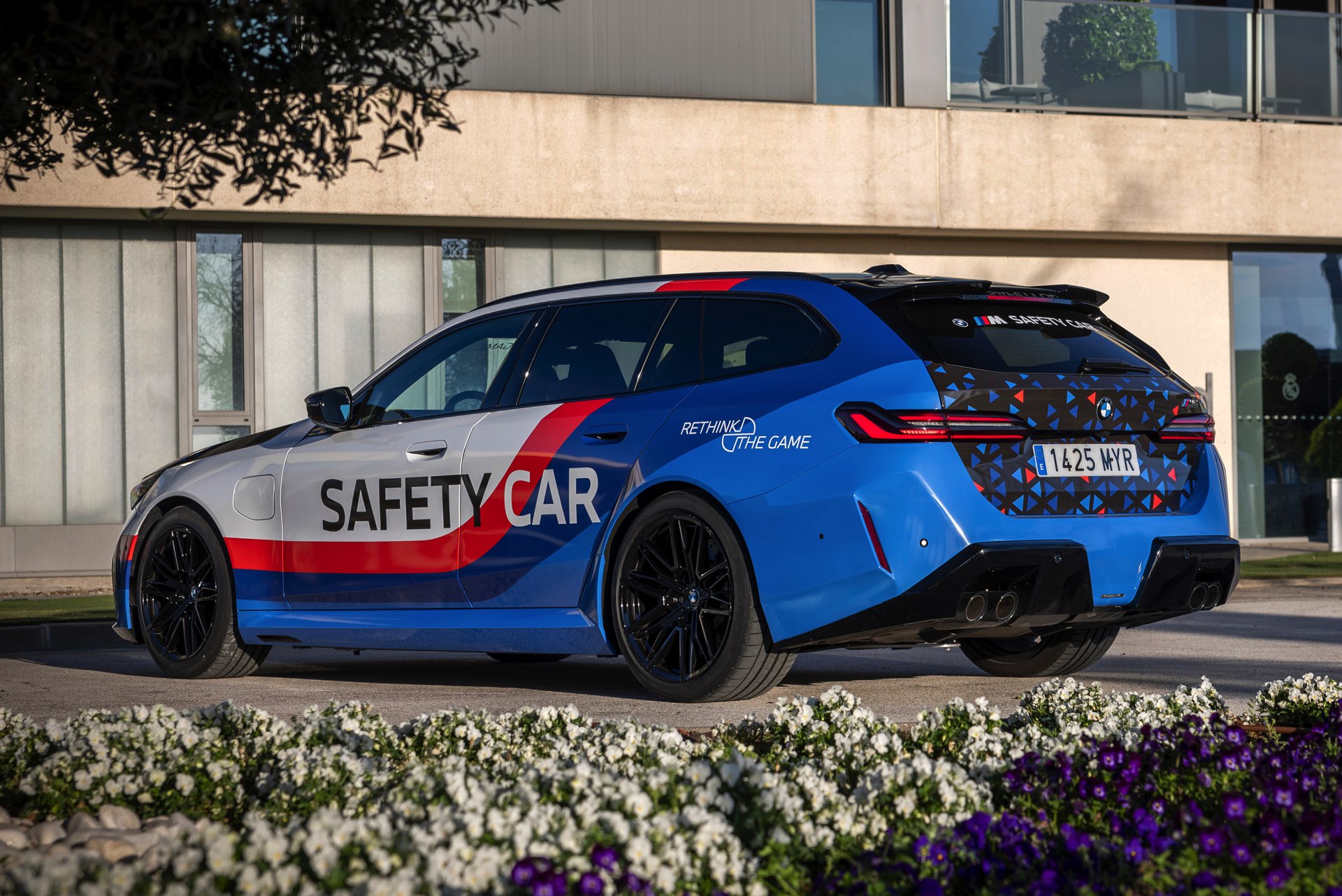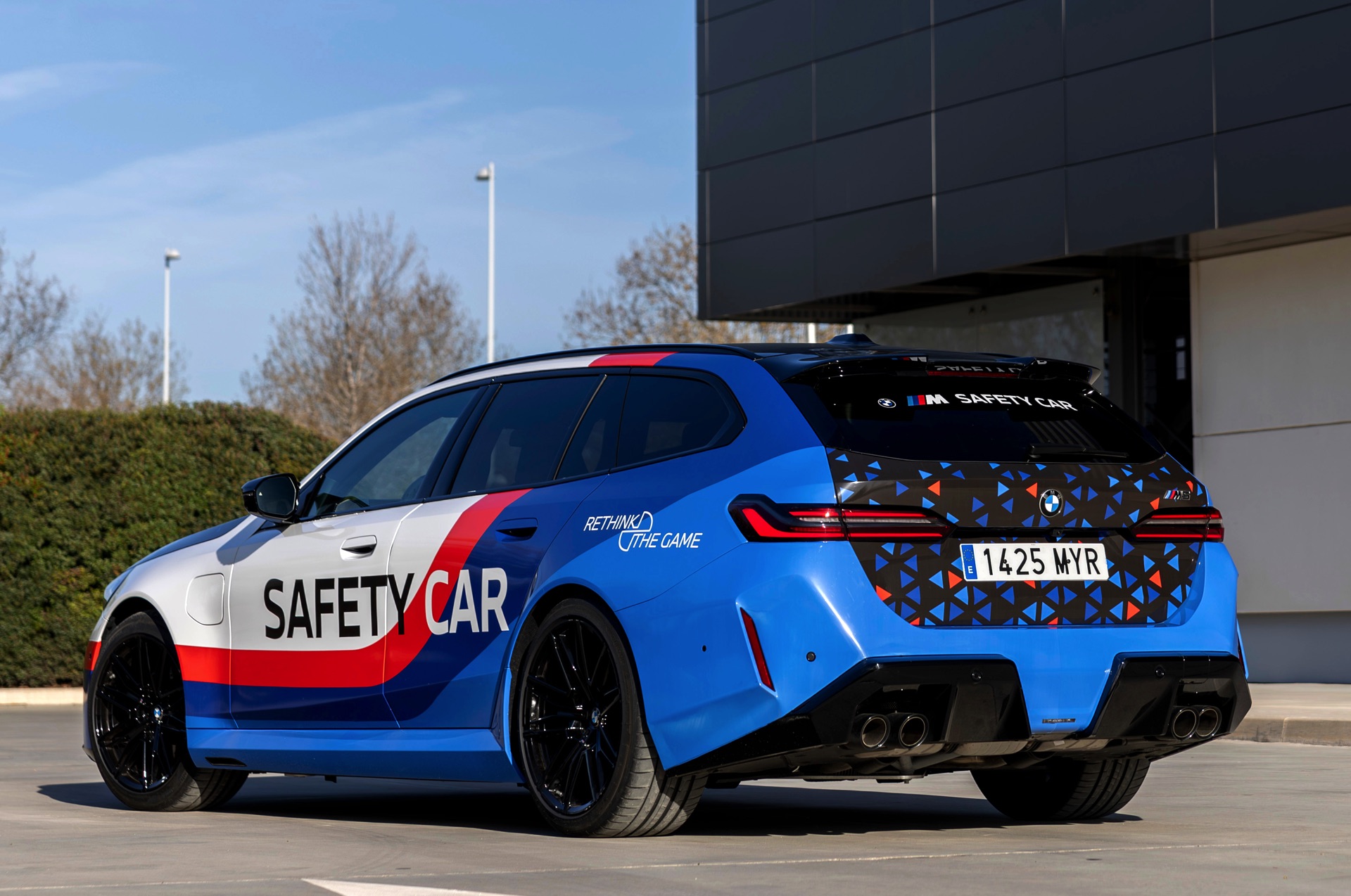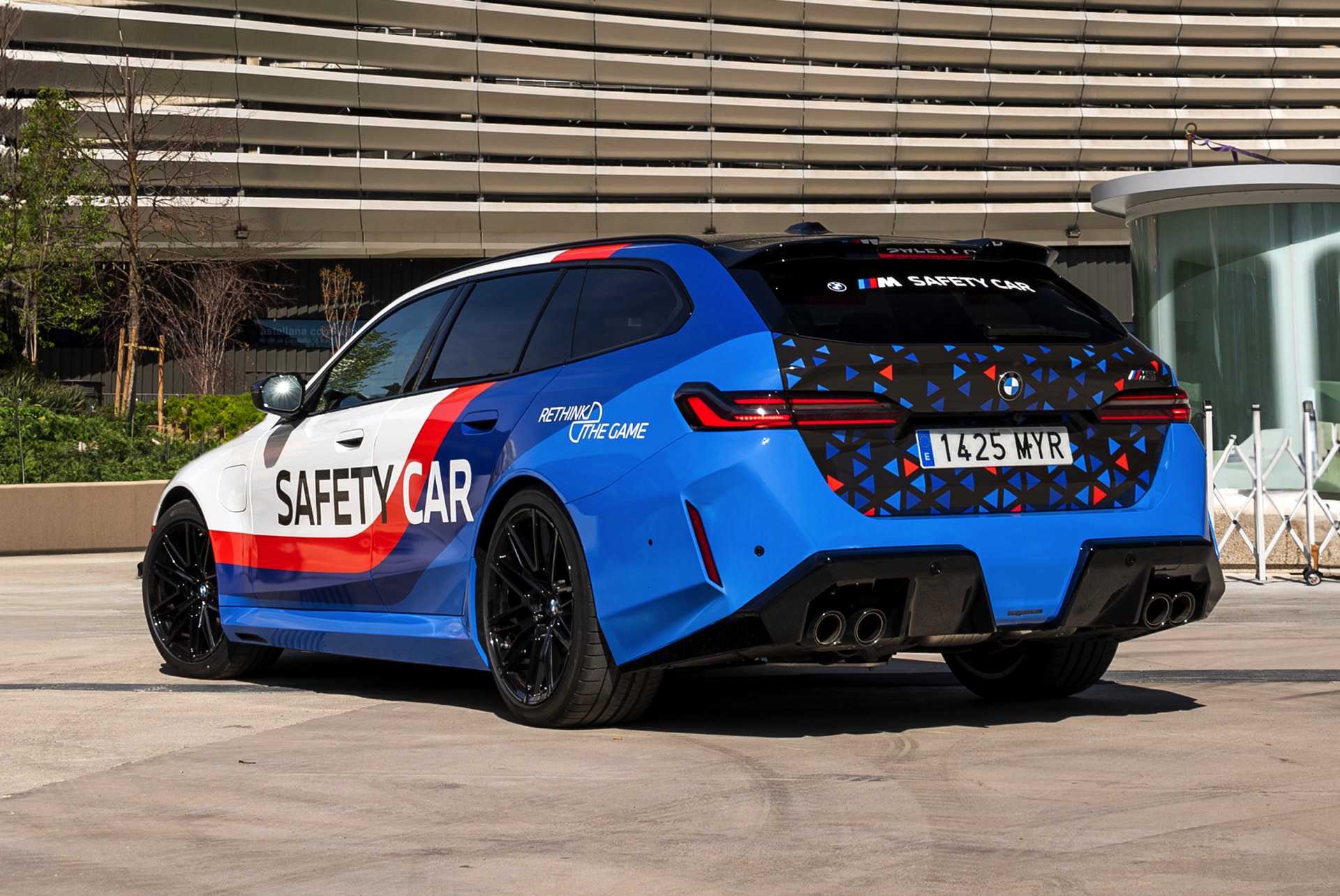 Für den Einsatz im Pool der Sicherheitsfahrzeuge von Real Madrid hat der BMW M5 Touring eine Folierung erhalten, die nicht nur auf den ersten Blick an Safety Cars im Motorsport erinnert: Mit den Farben von BMW Motorsport und großen Schriftzügen an der Seite könnte der Kombi kaum auffälliger unterwegs sein – was im krassen Gegensatz zu seiner eigentlichen Lackierung steht, denn gemessen an seiner Performance ist ein BMW M5 Touring in Schwarz eigentlich ausgesprochen unauffällig. Wie aus dem schwarzen Kombi innerhalb kurzer Zeit ein auffällig beklebtes Safety Car wird, zeigt uns BMW Spanien mit einem Zeitraffer-Video von der Folierung: