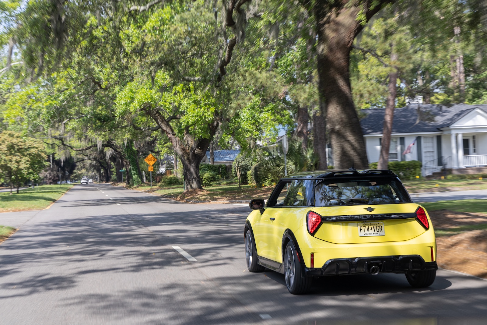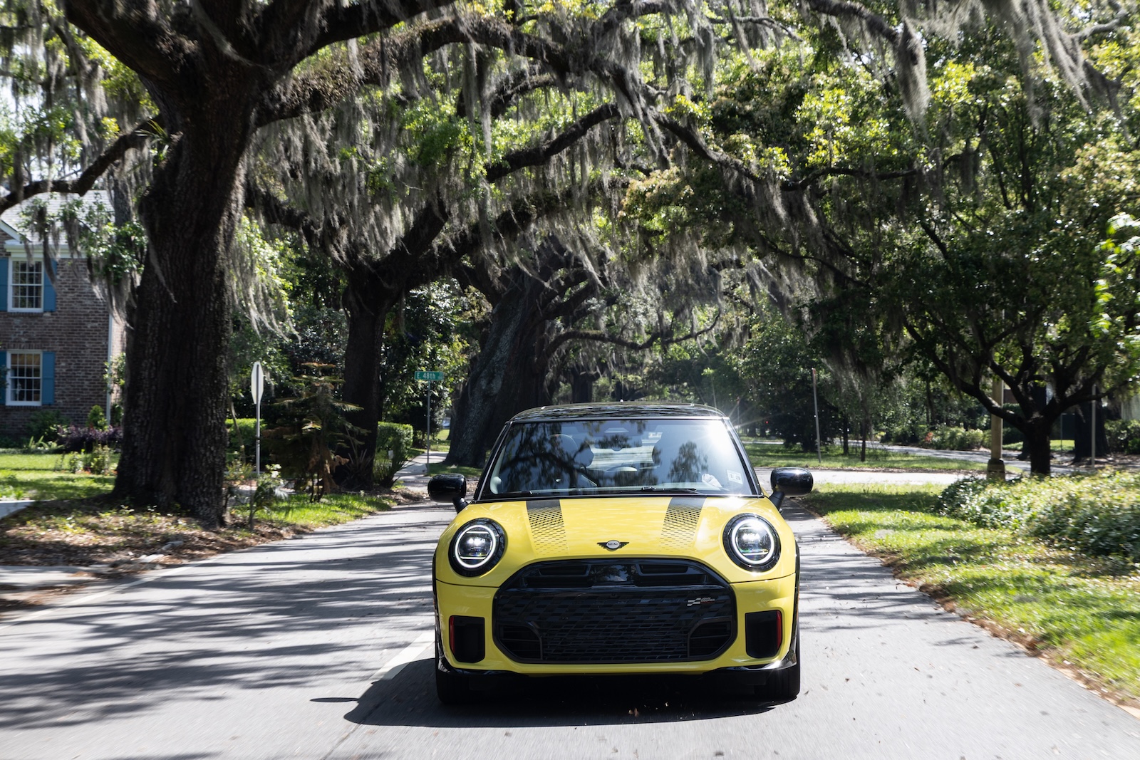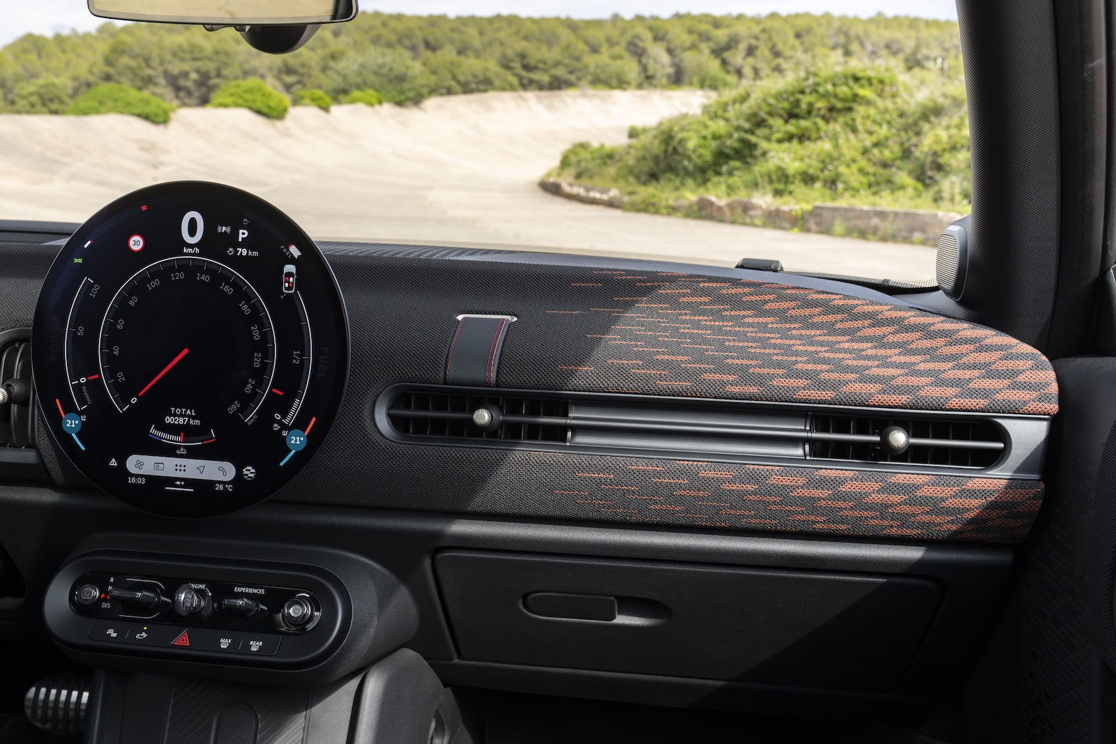 Das siebenstufige Doppelkupplungsgetriebe zeigt sich prächtig auf den bissigen Vierzylinder-Turbo abgestimmt, der seine Gangwechsel – auf Wunsch manuell über Schaltpaddle am Lenkrad zu beeinflussen – mit leichten Zischgeräuschen und Auspuffploppen untermalt. Die Lenkung ist ungemein präzise und an die spürbaren Antriebskräfte gewöhnt man sich schneller als gedacht: Der JCW will heiß gefahren werden, keine zahme Nummer auf der Landstraße, sondern auf Wunsch von Pilotin oder Pilot eben auch einmal nah am Grenzbereich. Für das exzellente Fahrgefühl helfen der niedrige Schwerpunkt und die schmucken 18-Zöller mit recht schmalen Reifen im Format 215/40 R 18, die sich bei warmen Temperaturen engagiert mit der Fahrbahnoberfläche verzahnen.