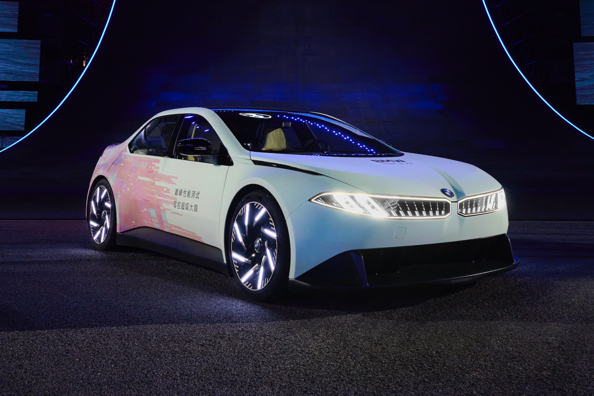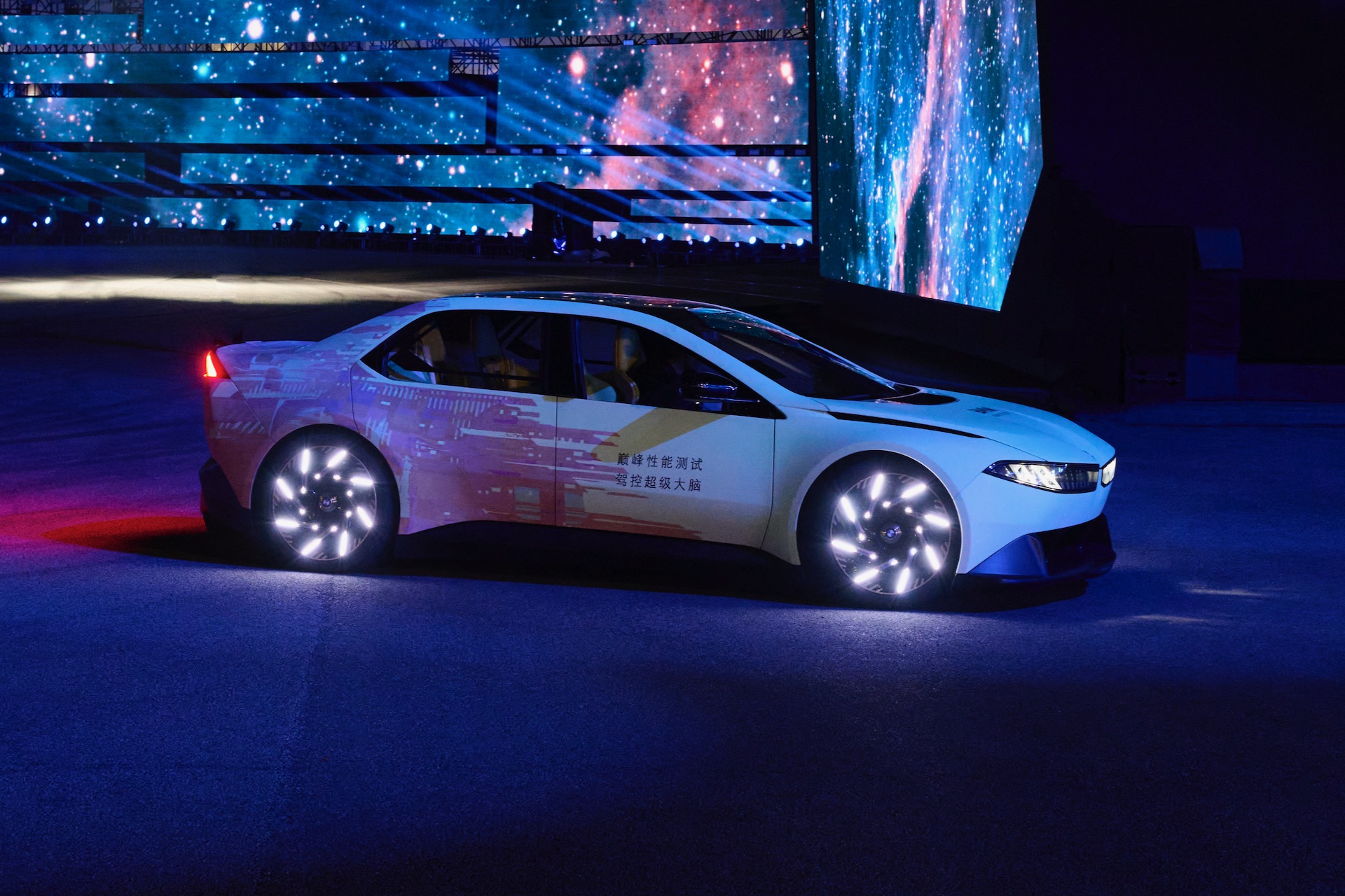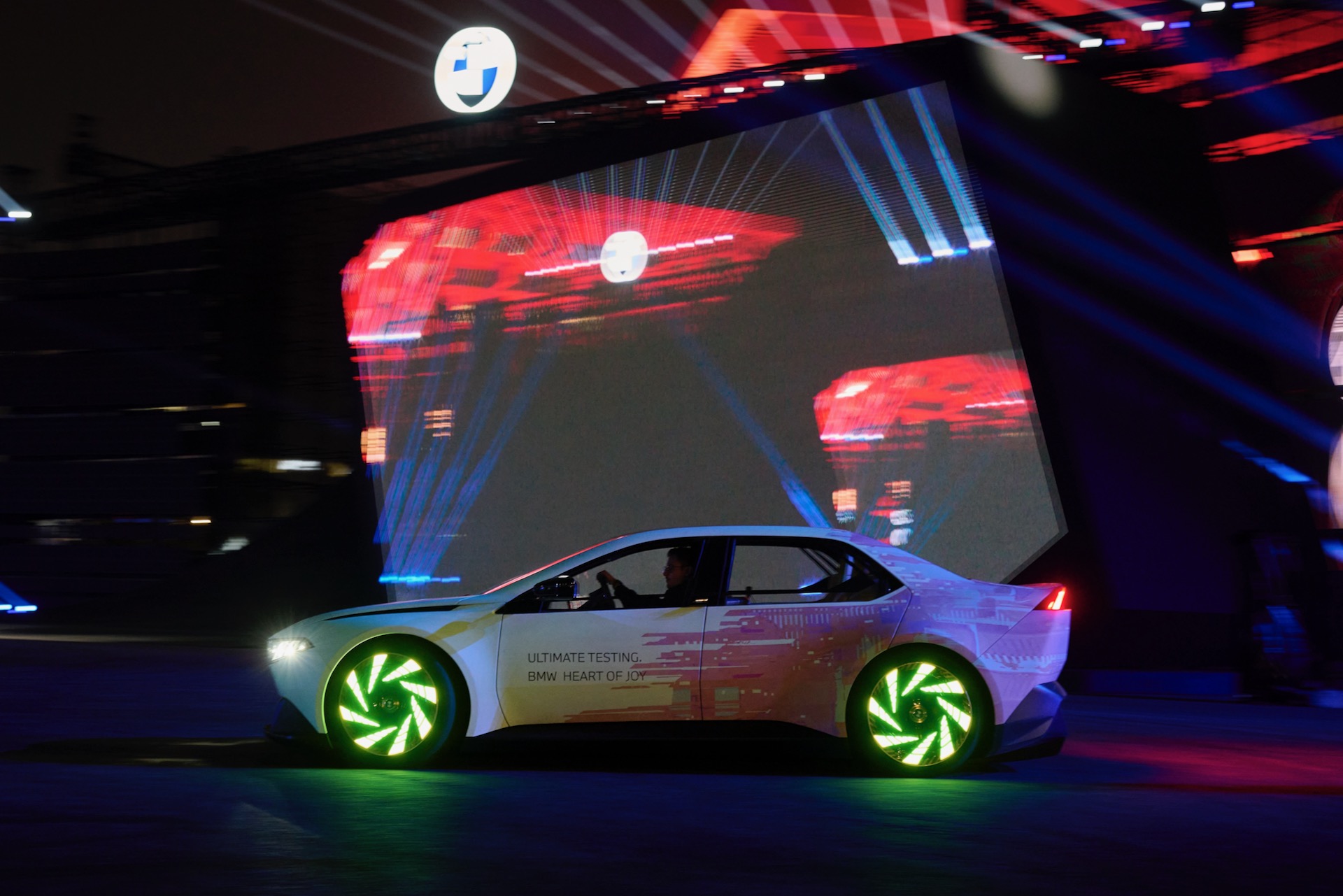 Einige Wochen nach seiner Premiere im Erlkönig-Kleid zeigt sich der BMW Vision Driving Experience im Rahmen der Shanghai Motor Show 2025 erstmals ungetarnt. Unter der Tarnfolie steckt allerdings kein gewöhnlicher Lack, sondern eine selbstleuchtende Sonderlackierung, die bei Dunkelheit fast so spektakulär wirkt wie es der Antrieb des meist nur kurz VDX genannten Vision-Cars ist. Mit Jens Klingmann und „Driftbrother“ Elias Houndtonji hat BMW gleich zwei Experten mit profunder Rennerfahrung mitgebracht, die das enorme Fahrdynamik-Potenzial des weit über 1.000 PS und rund 18.000 Newtonmeter starken Elektroautos auf den Asphalt bringen können.