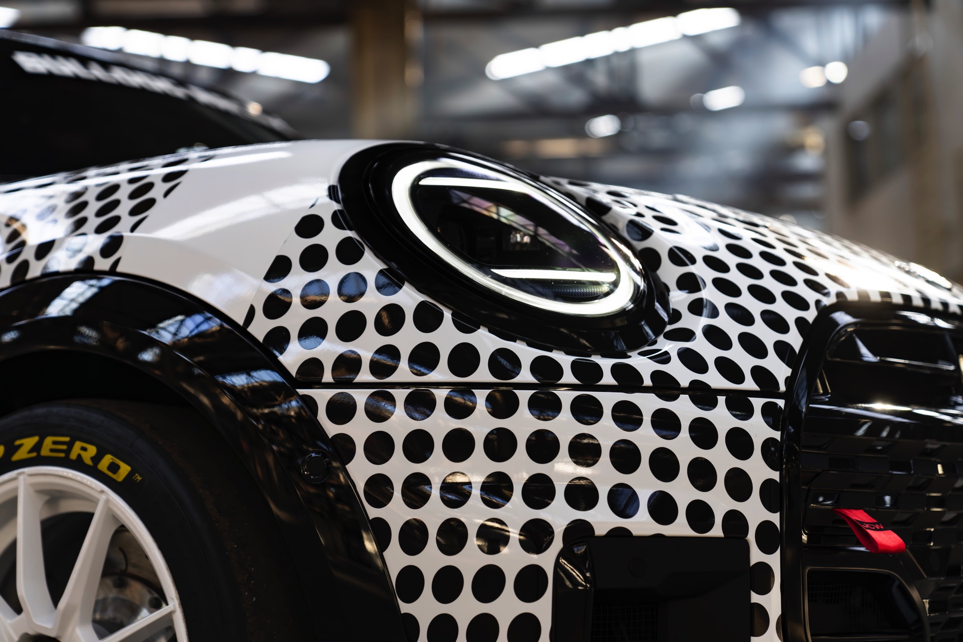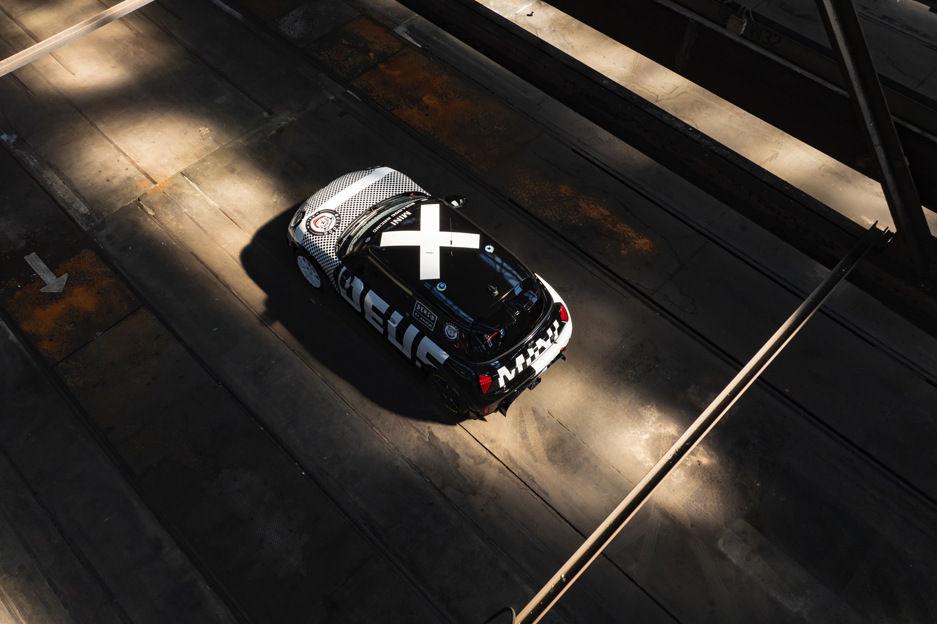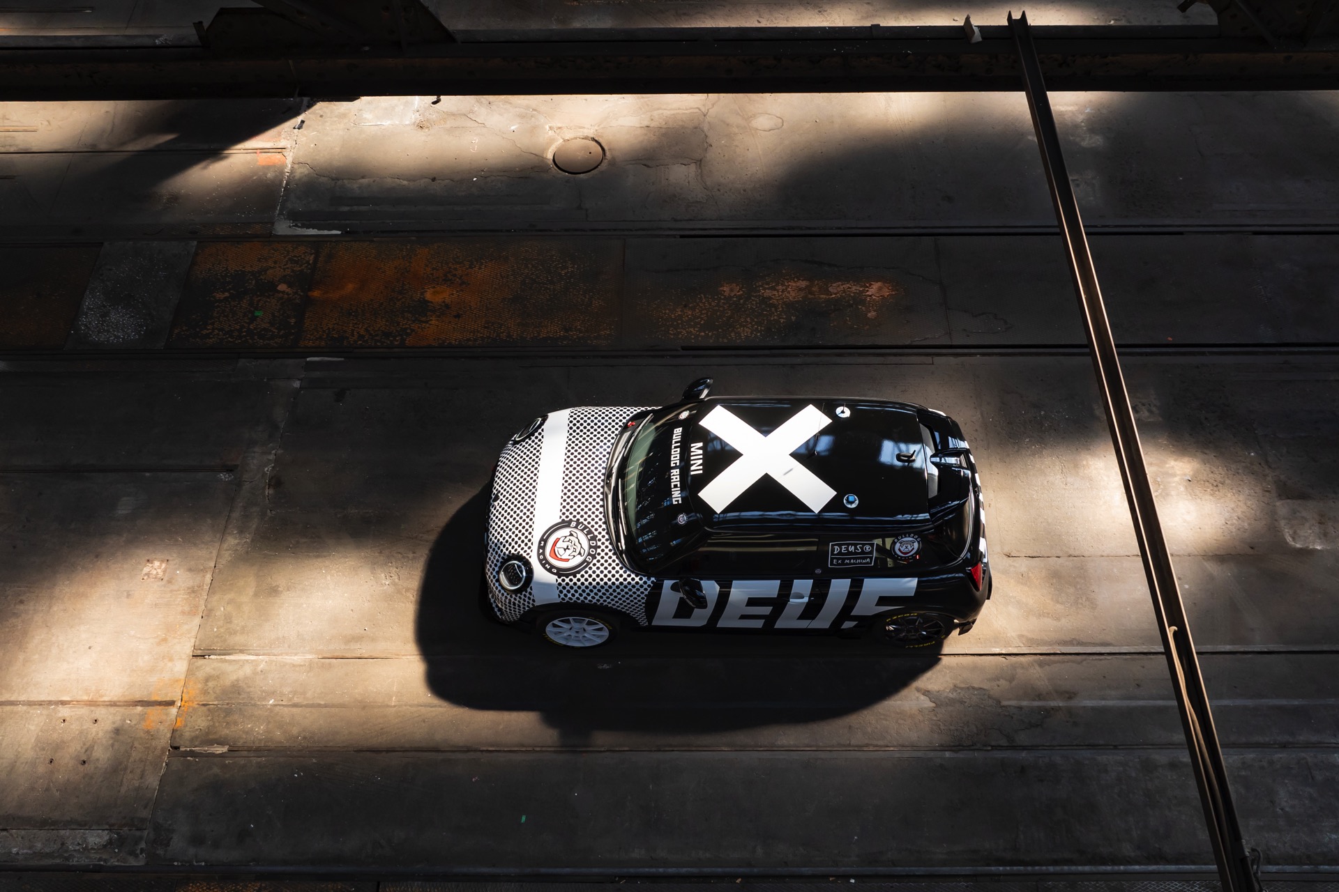 Für die Ausgestaltung der Folierung waren weder die Designer von Deus Ex Machina noch die von MINI verantwortlich, stattdessen wurde die BMW-Tochter Designworks ins Boot geholt. Das Ergebnis ist nicht nur ein konsequenter Schwarz-Weiß-Look, sondern auch eine unmissverständliche Botschaft in XXL: Auf den Seiten steht übergroß DEUS, das Dach ist mit einem riesigen X gekennzeichnet und am Heck folgt der MINI-Schriftzug – so wird die Kooperation DEUS x MINI bei jeder Vorbeifahrt in der Grünen Hölle lesbar sein.