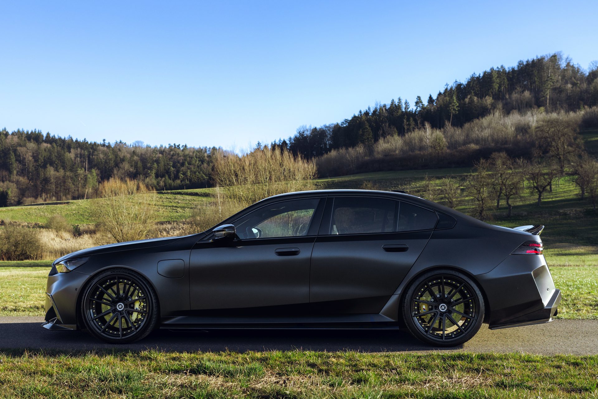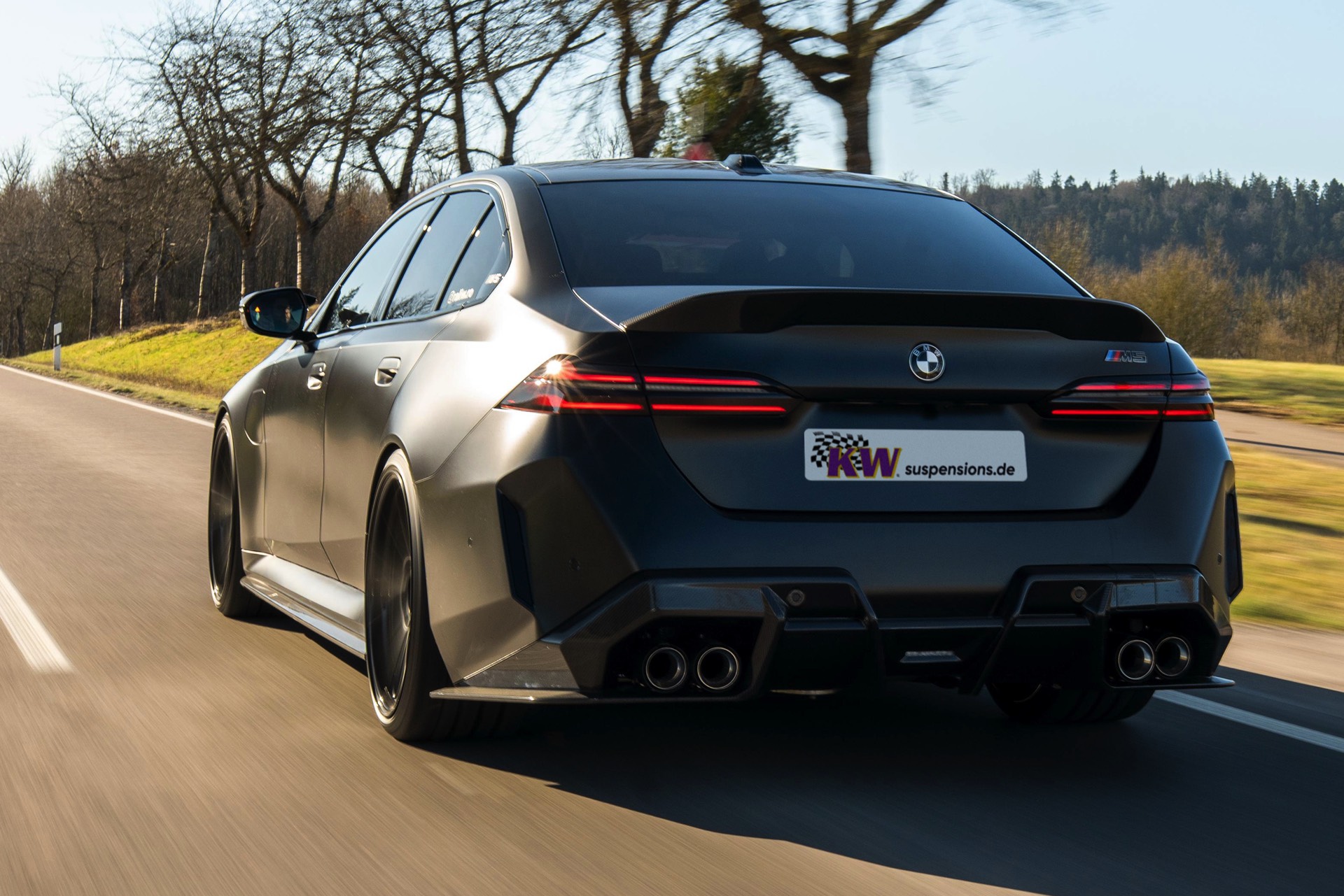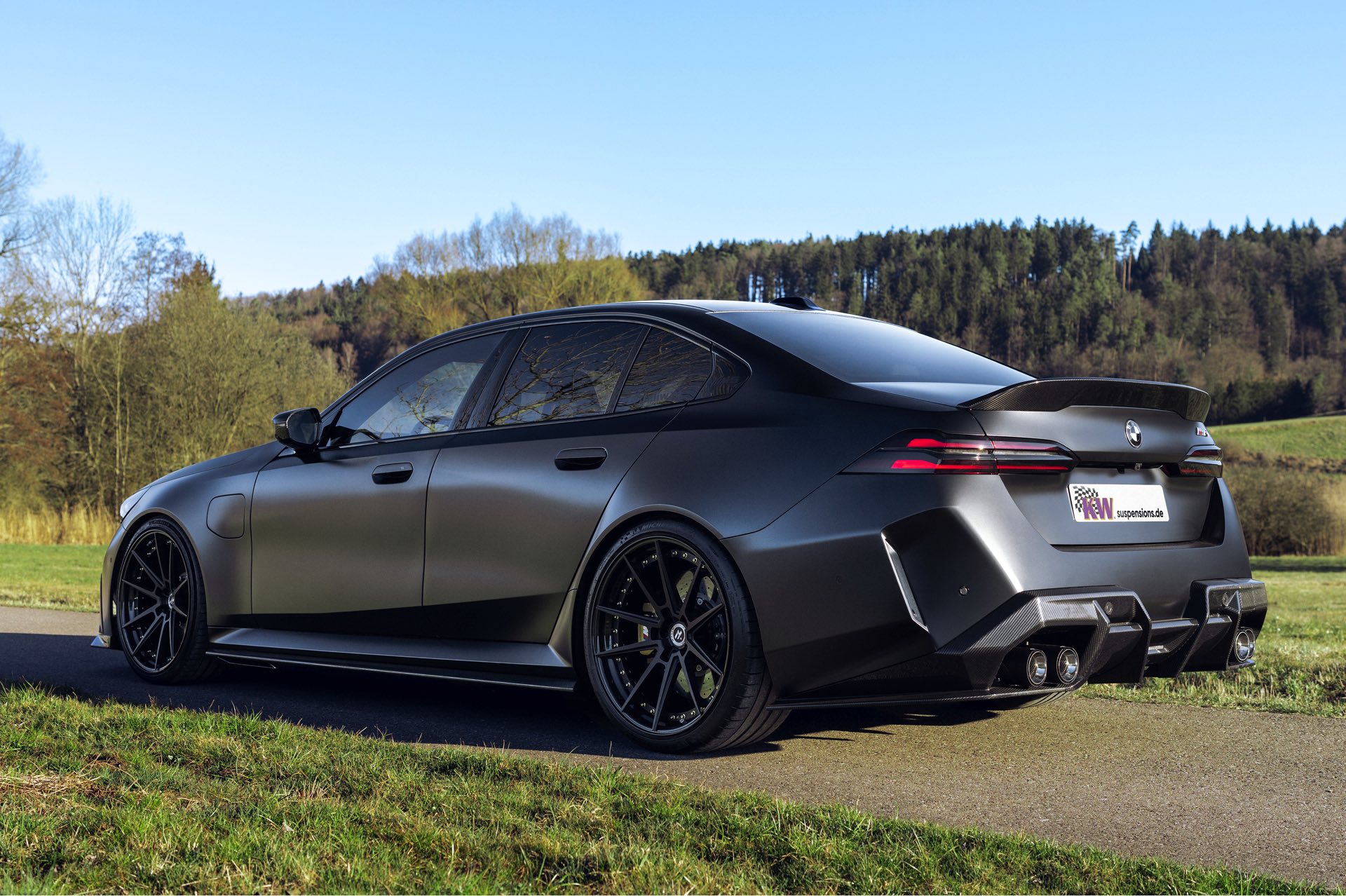 Die dunkle Seite des neuen BMW M5 (G90) zeigt sich auf einigen neuen Fotos von KW, denn die Experten für sportliche Fahrwerke präsentieren ihr Gewindefahrwerk V4 an einem M5 mit ebenso matter wie dunkler Lackierung. Die Power-Limousine kann mit Hilfe des KW V4 stufenlos näher an den Asphalt gebracht werden, wodurch sich die Tieferlegung exakt an die persönlichen Vorlieben bezüglich Optik und Fahrdynamik anpassen lässt. Während es an der Vorderachse 15 bis 30 Millimeter nach unten gehen kann, ist das Fenster an der Hinterachse mit 10 bis 30 Millimetern sogar noch etwas größer.