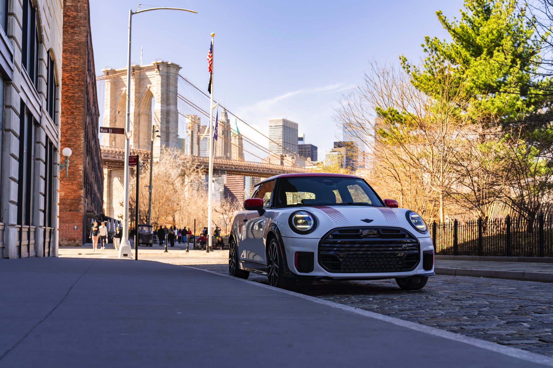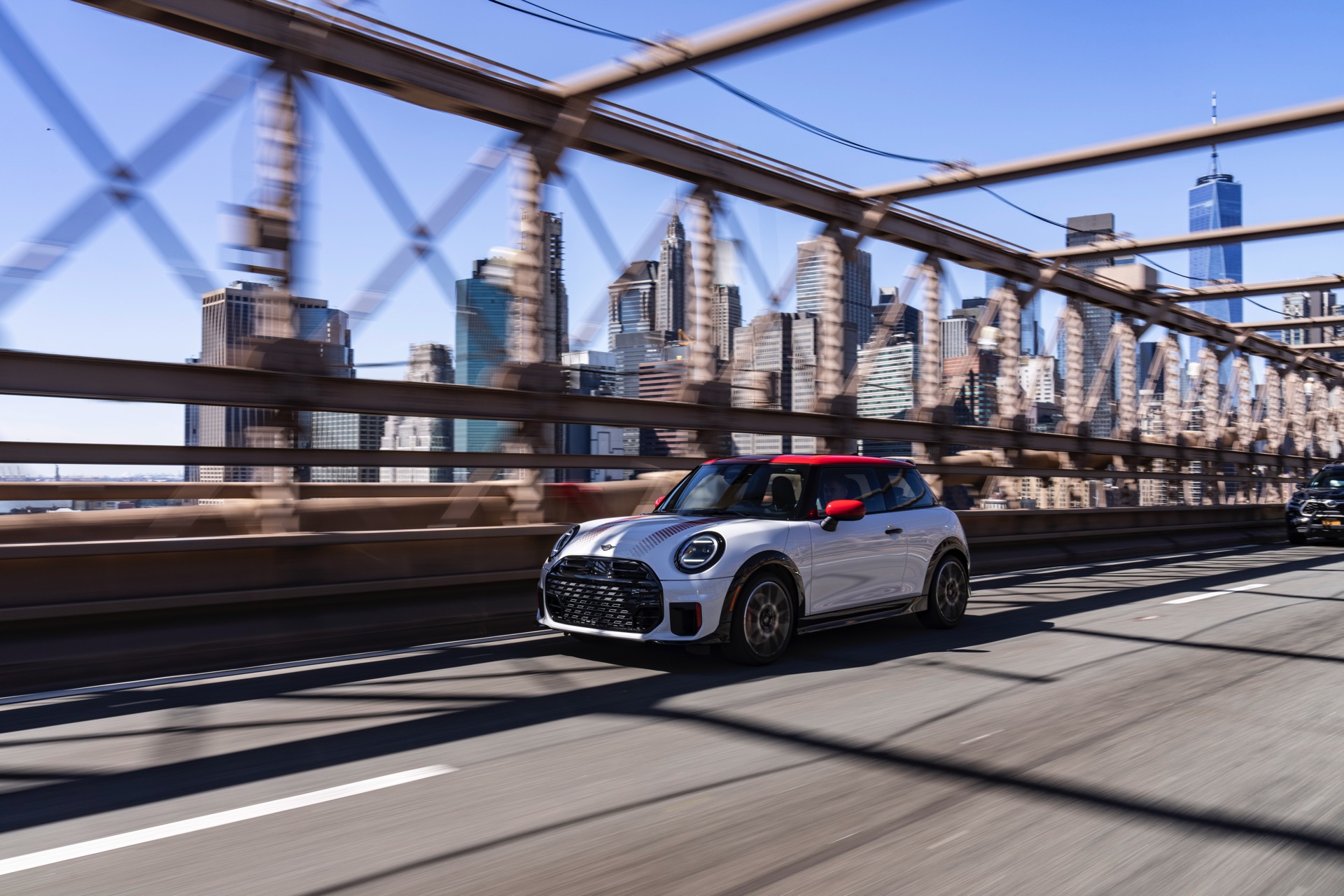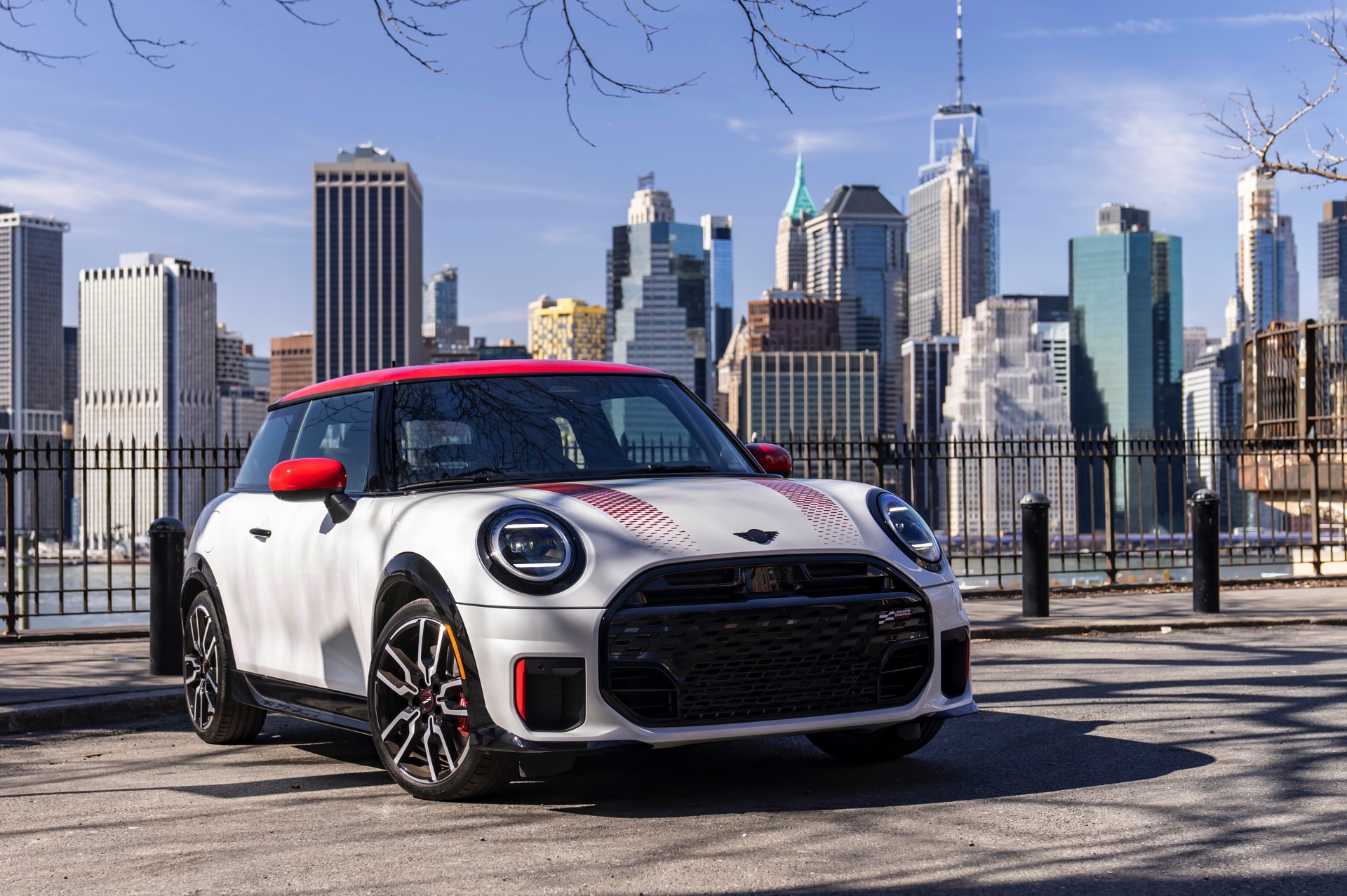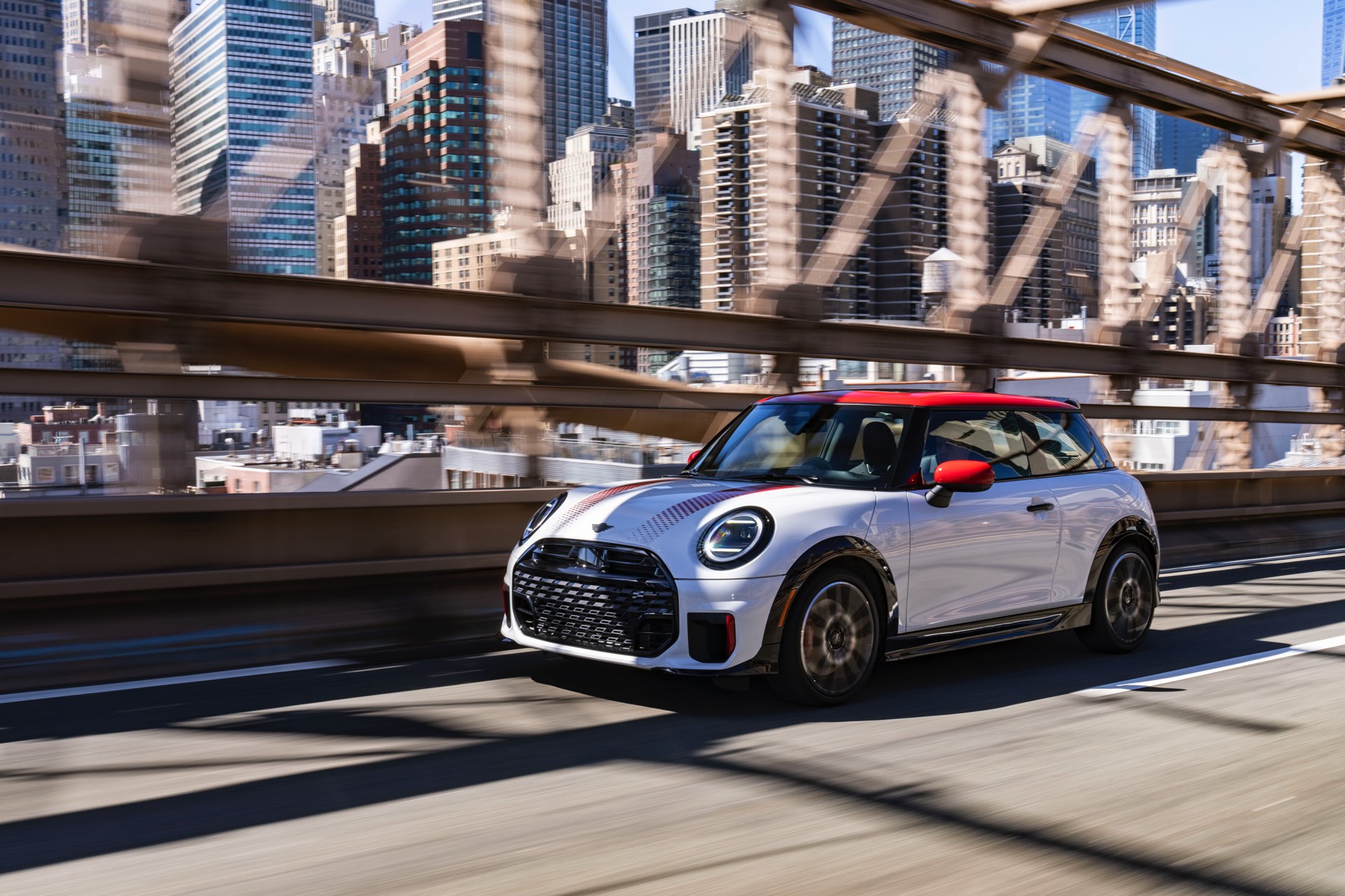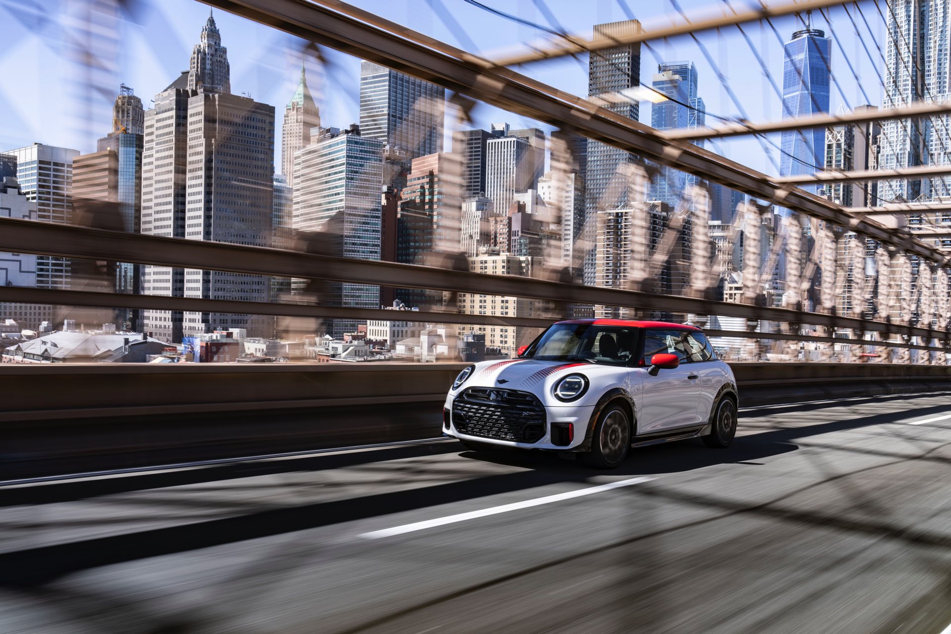 Ein wendiger und agiler Kleinwagen mit ordentlich Leistung kann seine Stärken in diesem Umfeld bei fast jeder Fahrt ausspielen und natürlich gestaltet sich auch die Parkplatz-Suche mit seinem Format wesentlich einfacher als mit einem SUV amerikanischer Prägung. Ein aktuelles Foto-Set zeigt uns die dynamischste Ausprägung des neuen MINI Cooper (F66) im unverwechselbaren Umfeld der US-Metropole: Im Fokus steht und fährt ein MINI John Cooper Works in Nanuq White, der mit rotem Kontrastdach, roten Außenspiegeln und roten Haubenstreifen auf seinen sportlichen Anspruch hinweist. "