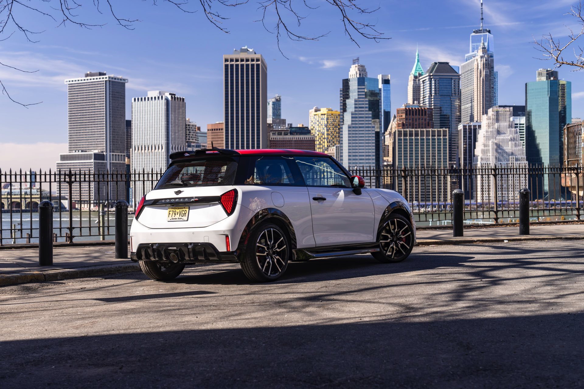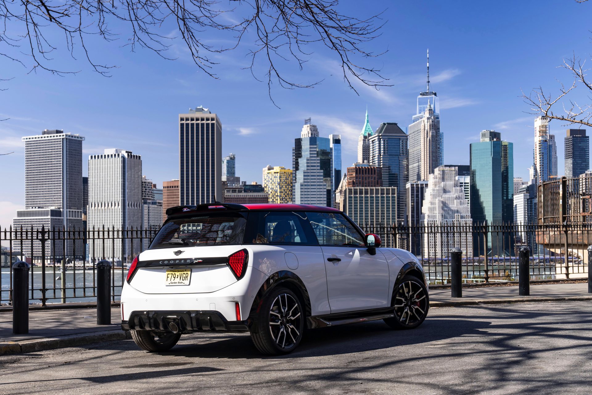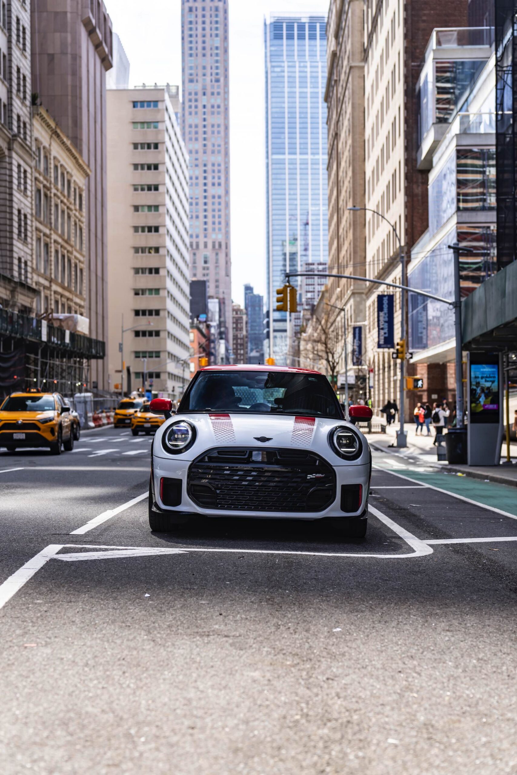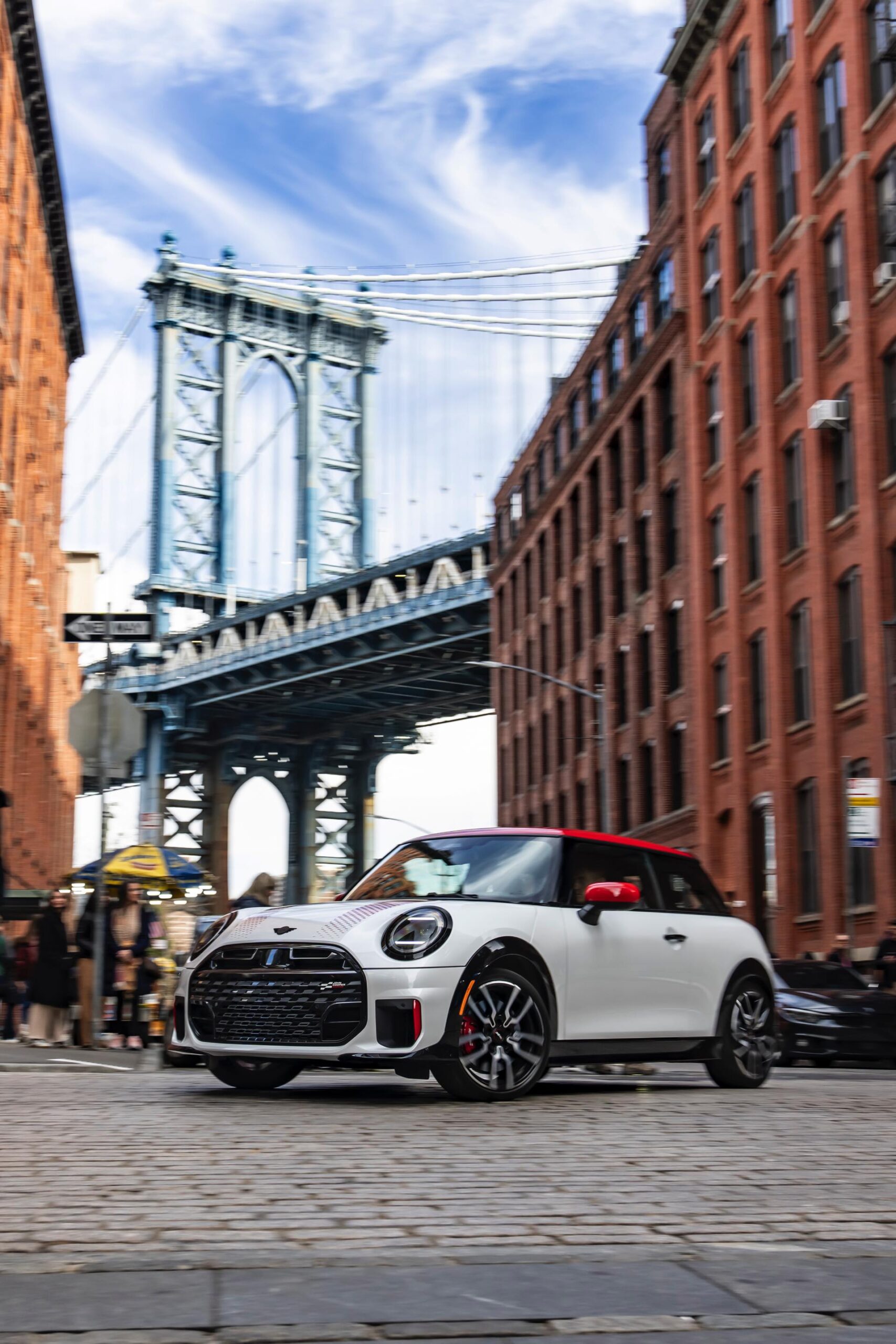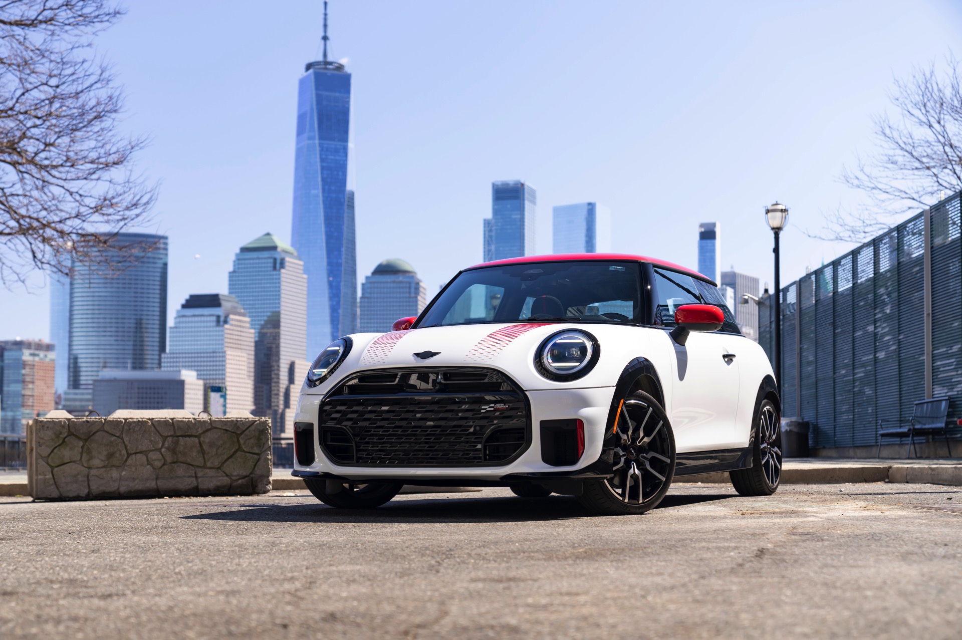 Ein wendiger und agiler Kleinwagen mit ordentlich Leistung kann seine Stärken in diesem Umfeld bei fast jeder Fahrt ausspielen und natürlich gestaltet sich auch die Parkplatz-Suche mit seinem Format wesentlich einfacher als mit einem SUV amerikanischer Prägung. Ein aktuelles Foto-Set zeigt uns die dynamischste Ausprägung des neuen MINI Cooper (F66) im unverwechselbaren Umfeld der US-Metropole: Im Fokus steht und fährt ein MINI John Cooper Works in Nanuq White, der mit rotem Kontrastdach, roten Außenspiegeln und roten Haubenstreifen auf seinen sportlichen Anspruch hinweist. "