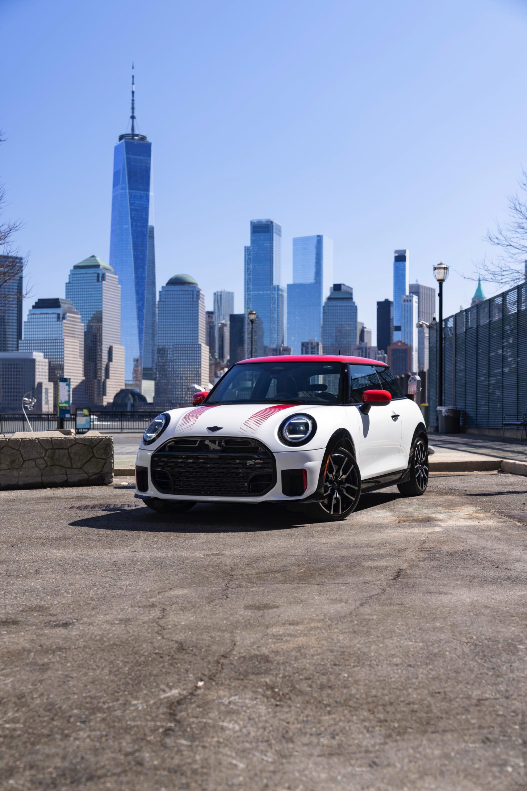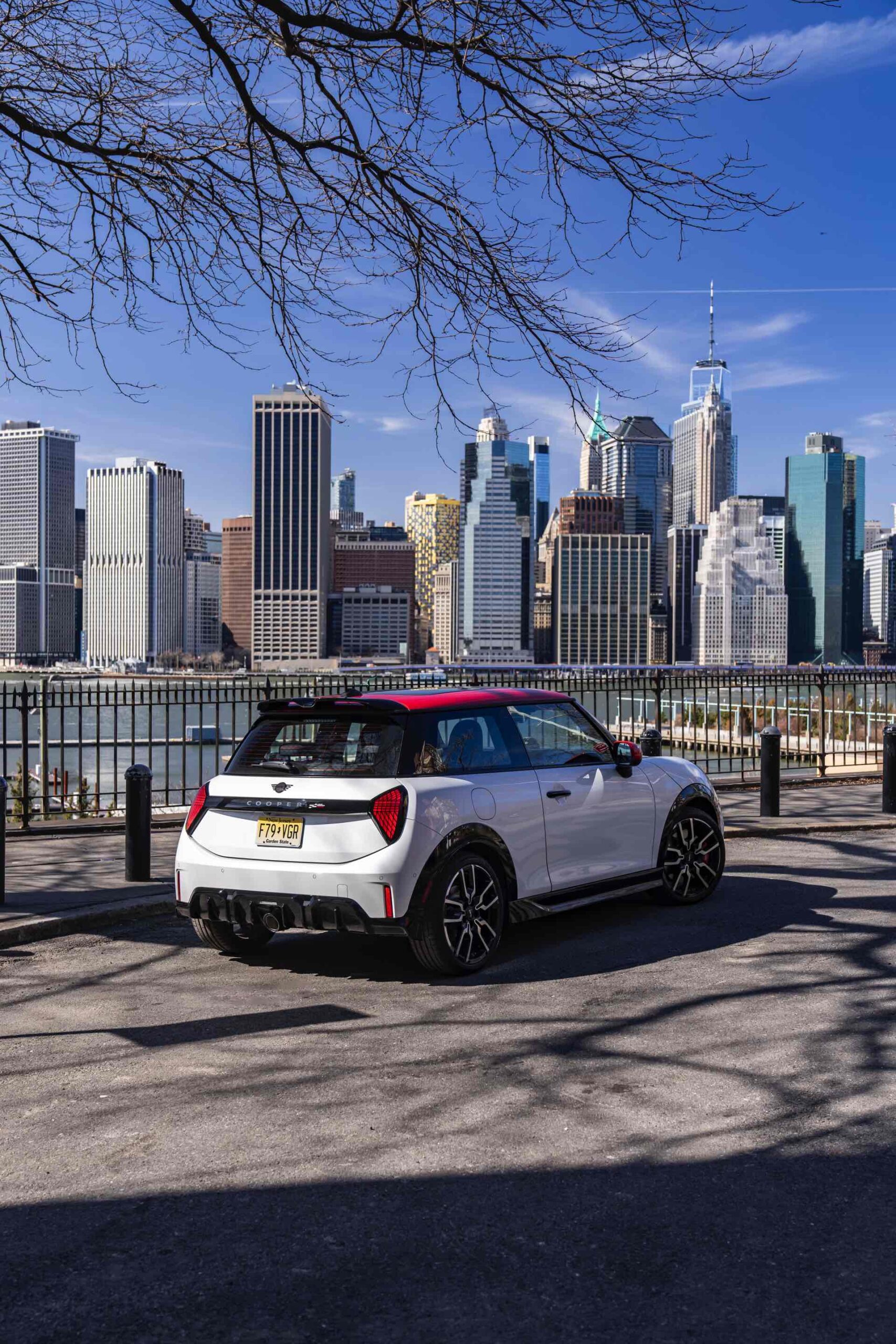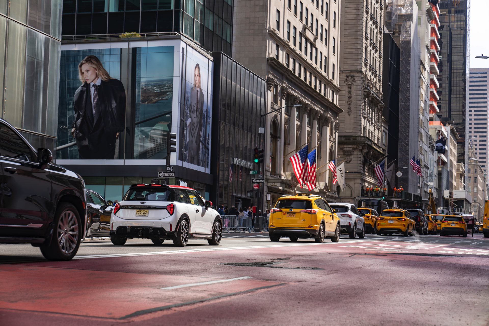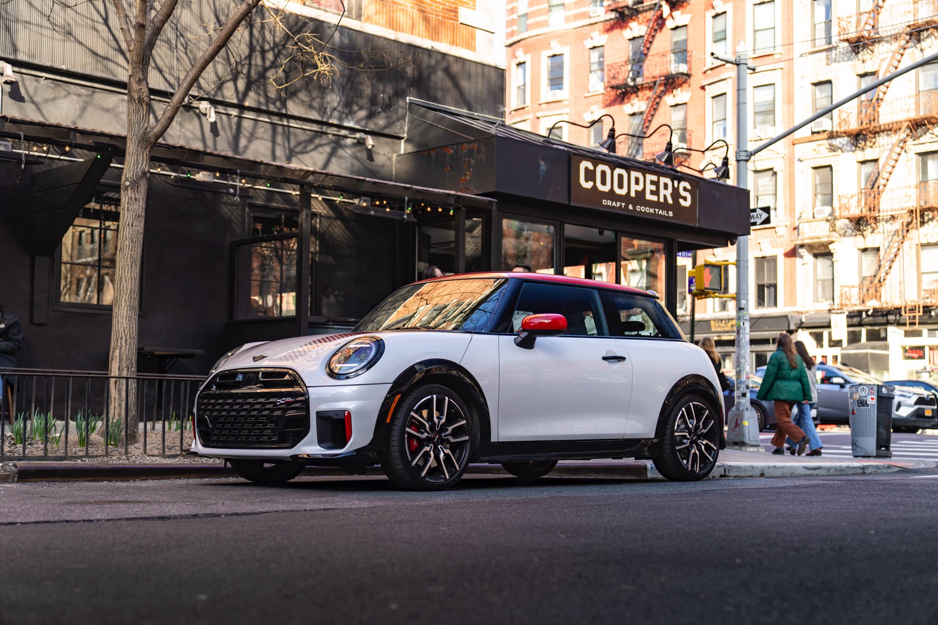 Ein wendiger und agiler Kleinwagen mit ordentlich Leistung kann seine Stärken in diesem Umfeld bei fast jeder Fahrt ausspielen und natürlich gestaltet sich auch die Parkplatz-Suche mit seinem Format wesentlich einfacher als mit einem SUV amerikanischer Prägung. Ein aktuelles Foto-Set zeigt uns die dynamischste Ausprägung des neuen MINI Cooper (F66) im unverwechselbaren Umfeld der US-Metropole: Im Fokus steht und fährt ein MINI John Cooper Works in Nanuq White, der mit rotem Kontrastdach, roten Außenspiegeln und roten Haubenstreifen auf seinen sportlichen Anspruch hinweist. "