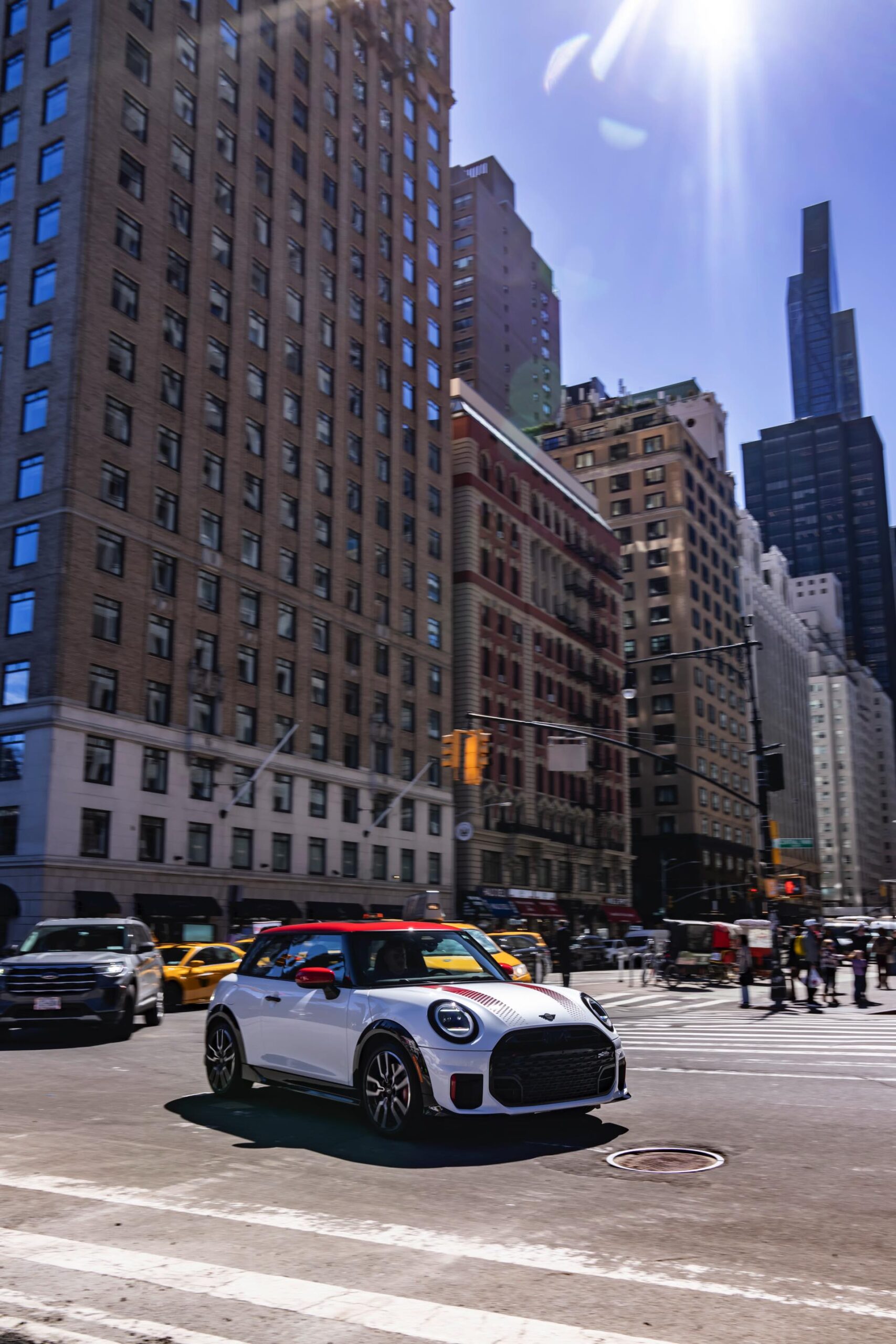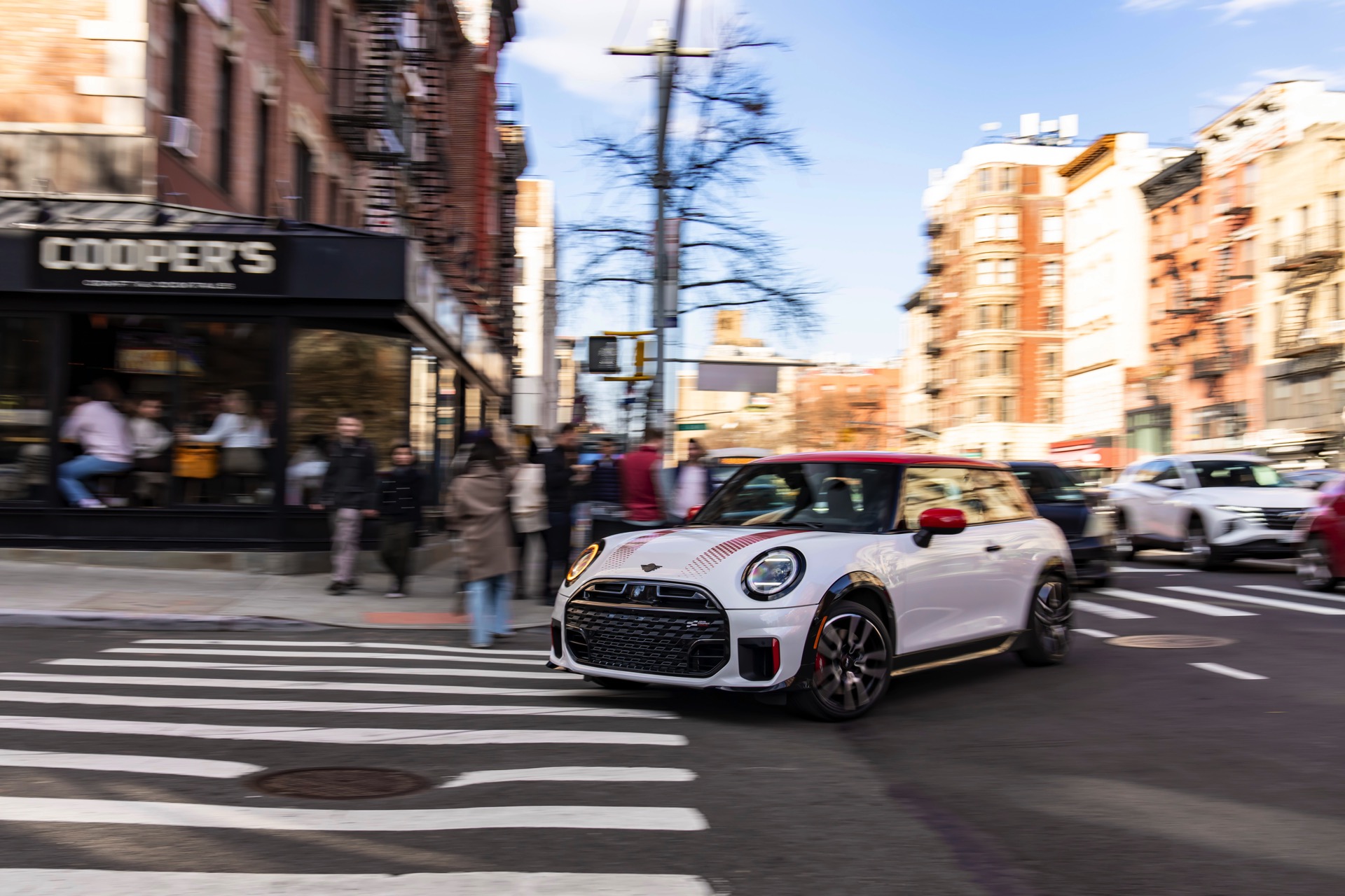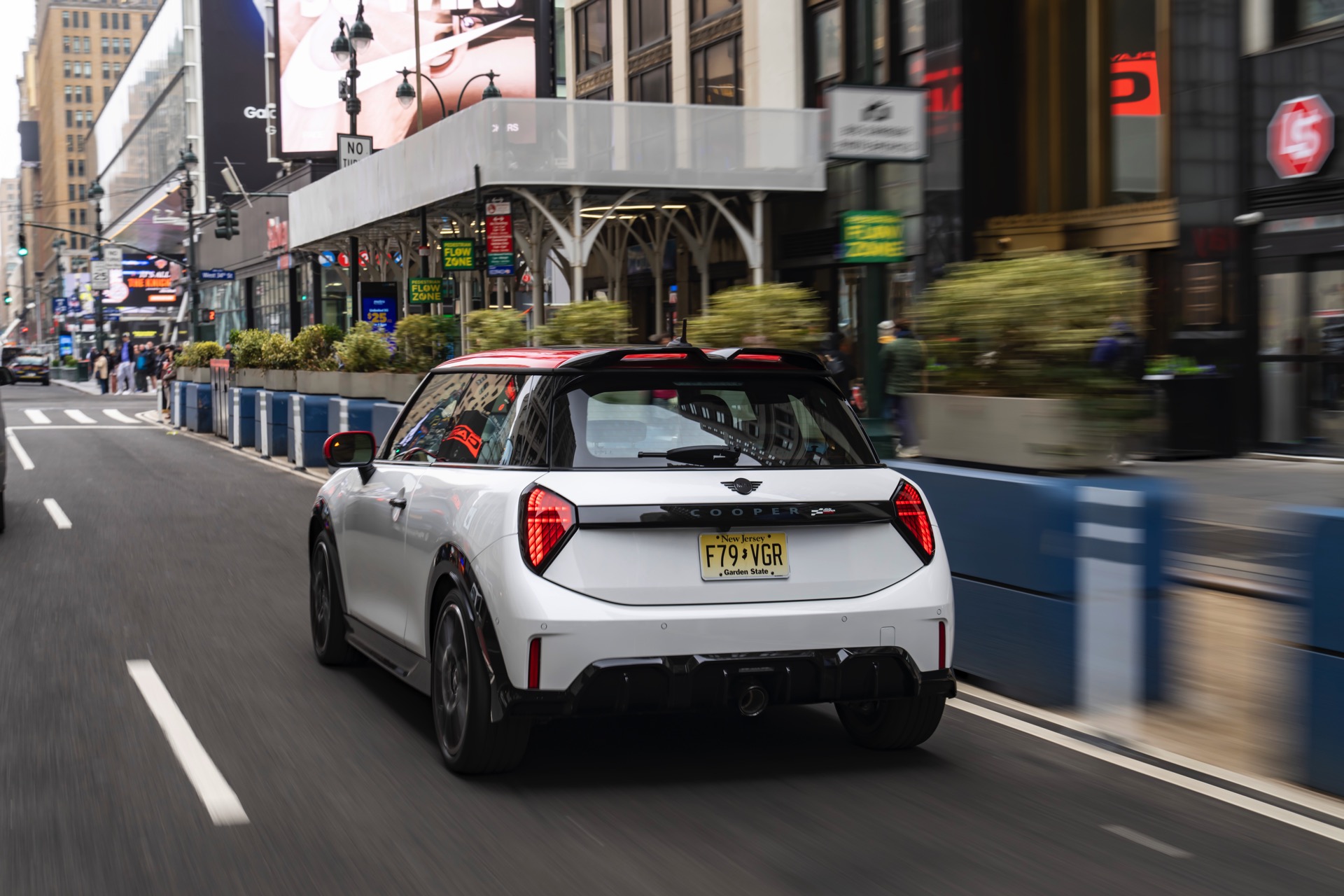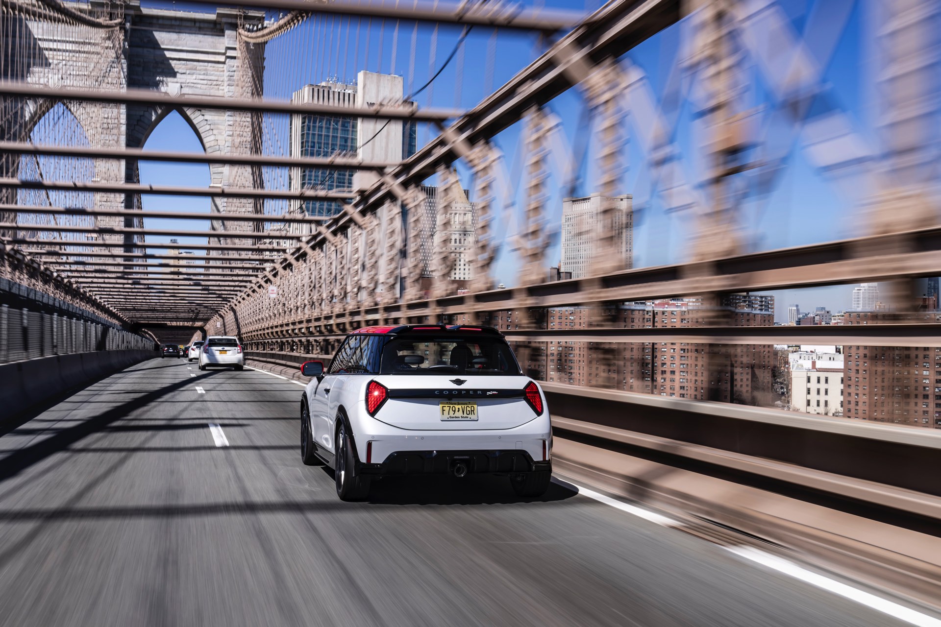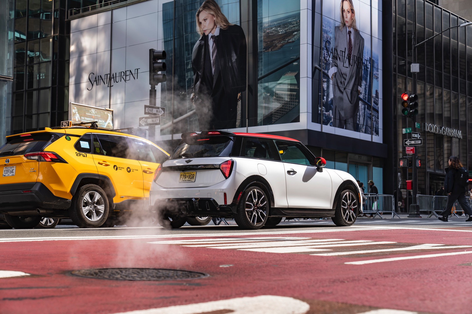 Ein wendiger und agiler Kleinwagen mit ordentlich Leistung kann seine Stärken in diesem Umfeld bei fast jeder Fahrt ausspielen und natürlich gestaltet sich auch die Parkplatz-Suche mit seinem Format wesentlich einfacher als mit einem SUV amerikanischer Prägung. Ein aktuelles Foto-Set zeigt uns die dynamischste Ausprägung des neuen MINI Cooper (F66) im unverwechselbaren Umfeld der US-Metropole: Im Fokus steht und fährt ein MINI John Cooper Works in Nanuq White, der mit rotem Kontrastdach, roten Außenspiegeln und roten Haubenstreifen auf seinen sportlichen Anspruch hinweist. "