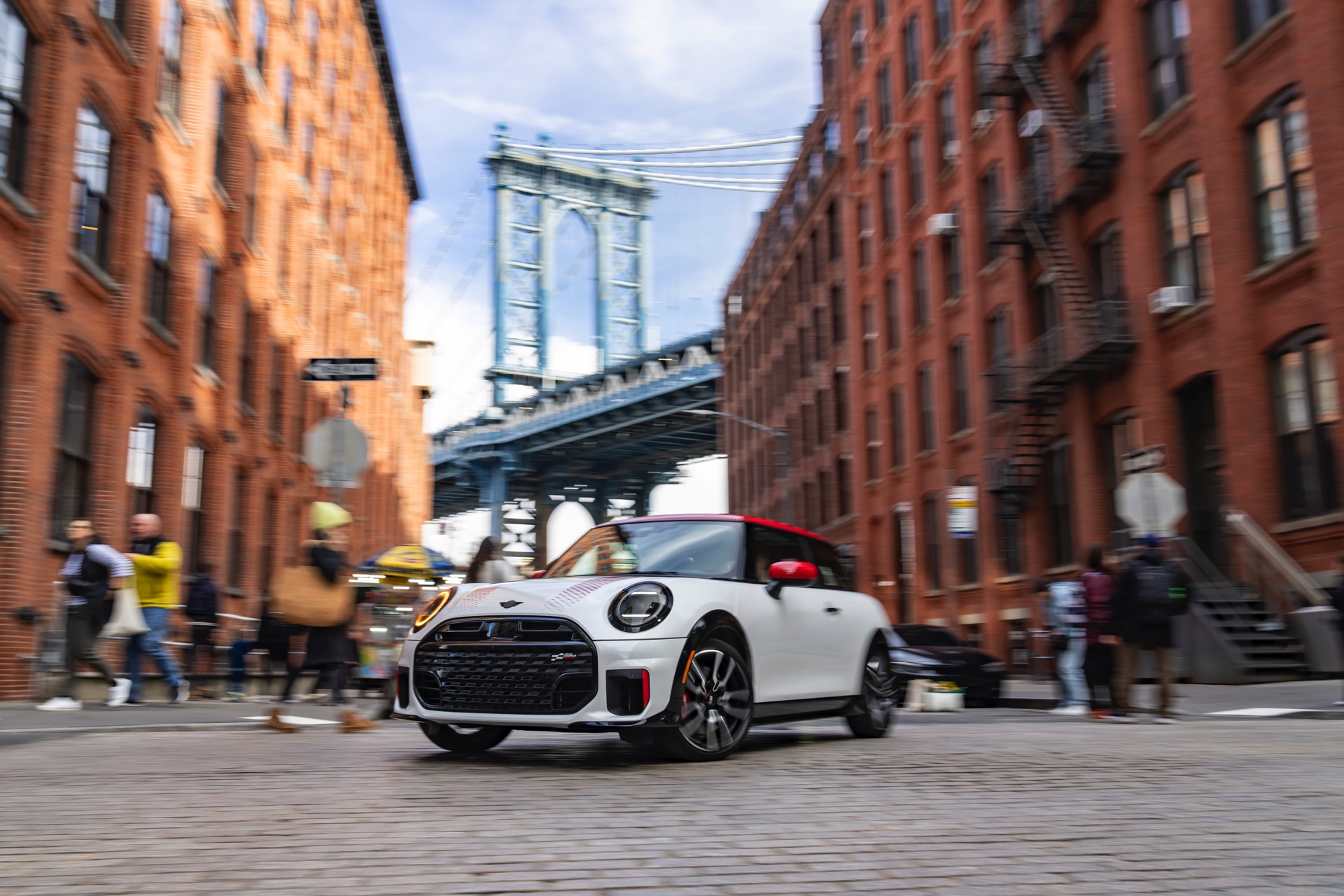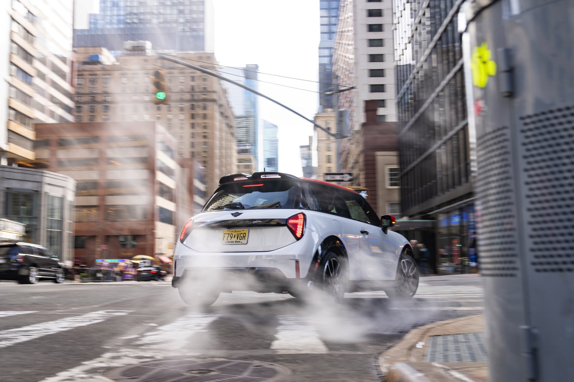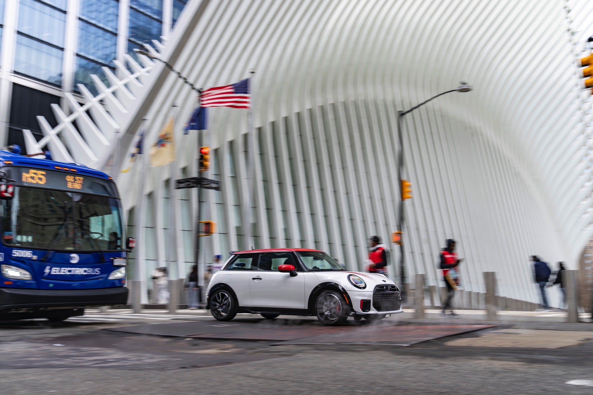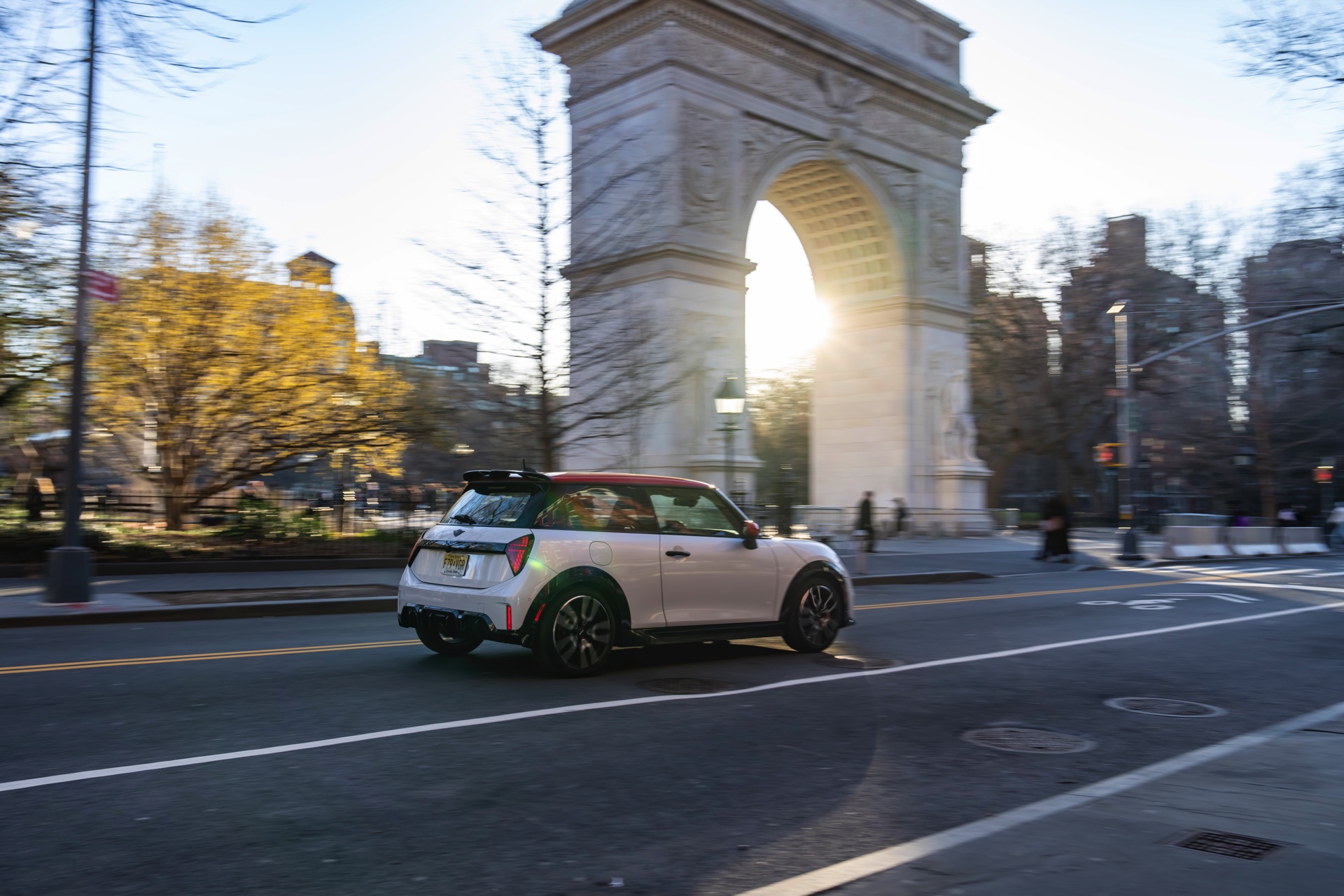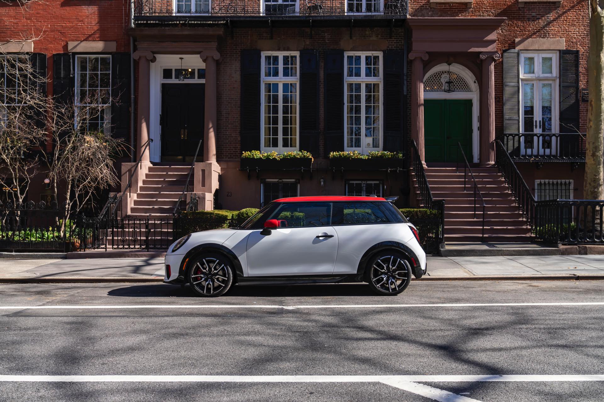 Ein wendiger und agiler Kleinwagen mit ordentlich Leistung kann seine Stärken in diesem Umfeld bei fast jeder Fahrt ausspielen und natürlich gestaltet sich auch die Parkplatz-Suche mit seinem Format wesentlich einfacher als mit einem SUV amerikanischer Prägung. Ein aktuelles Foto-Set zeigt uns die dynamischste Ausprägung des neuen MINI Cooper (F66) im unverwechselbaren Umfeld der US-Metropole: Im Fokus steht und fährt ein MINI John Cooper Works in Nanuq White, der mit rotem Kontrastdach, roten Außenspiegeln und roten Haubenstreifen auf seinen sportlichen Anspruch hinweist. "