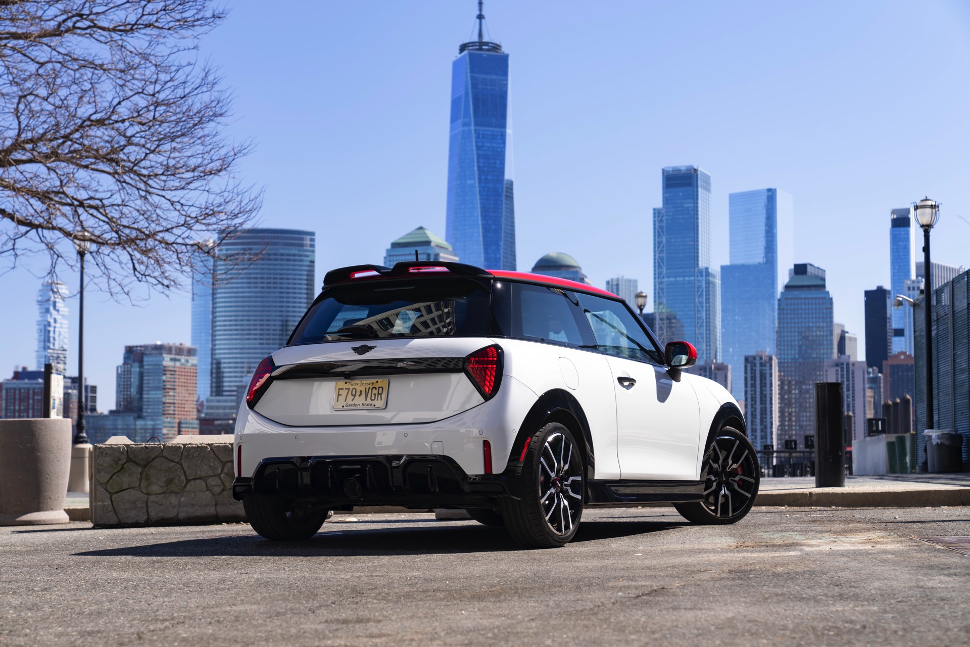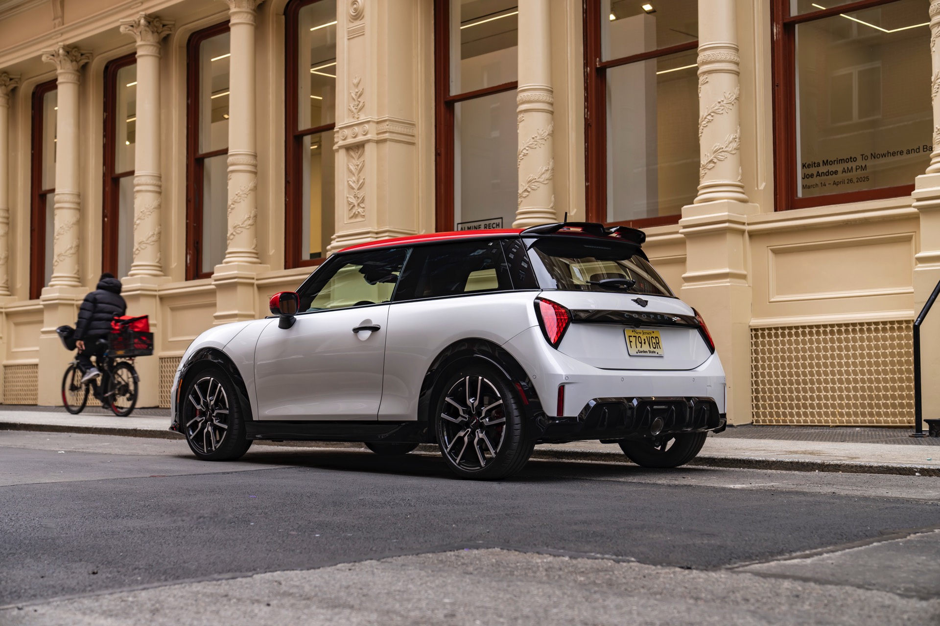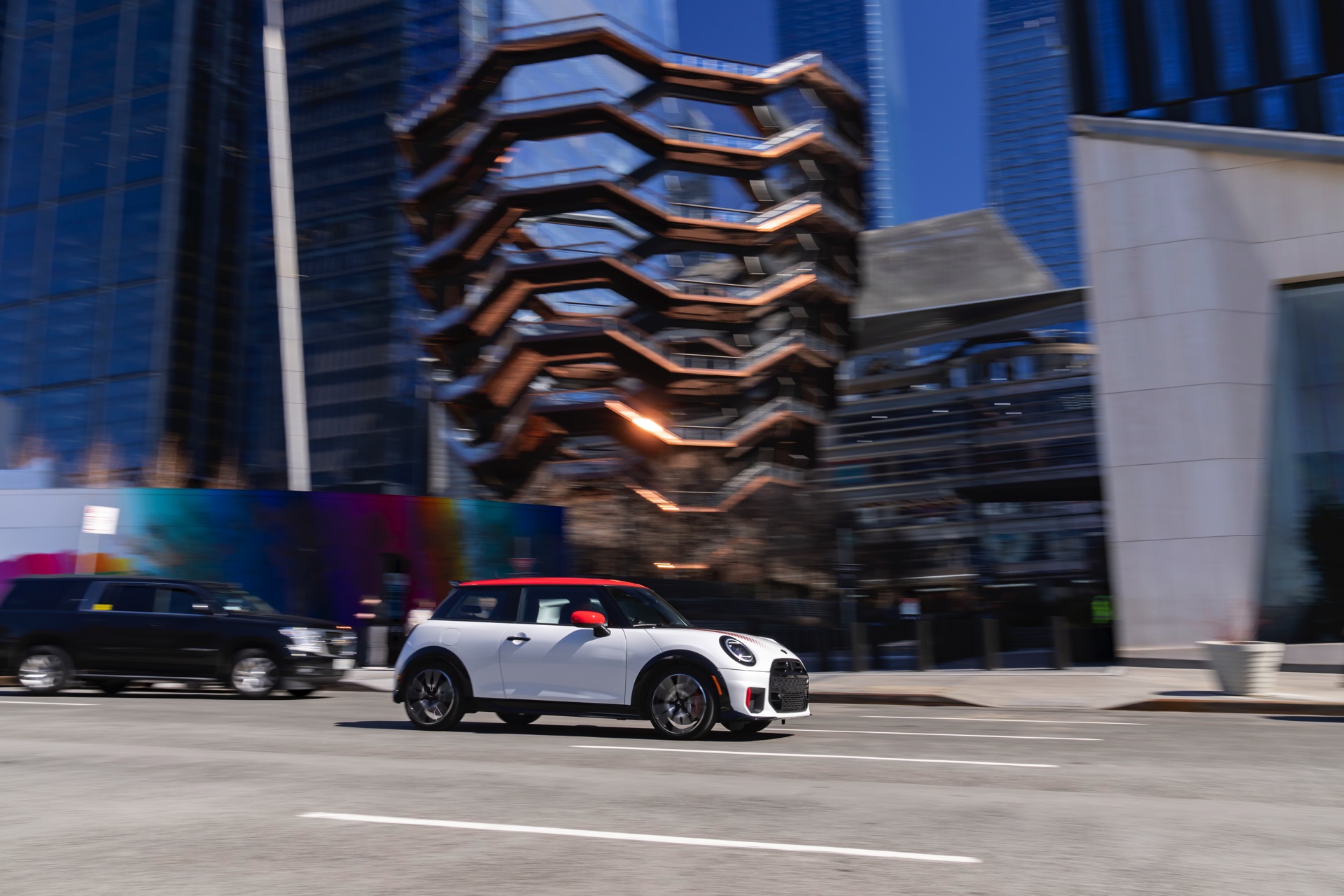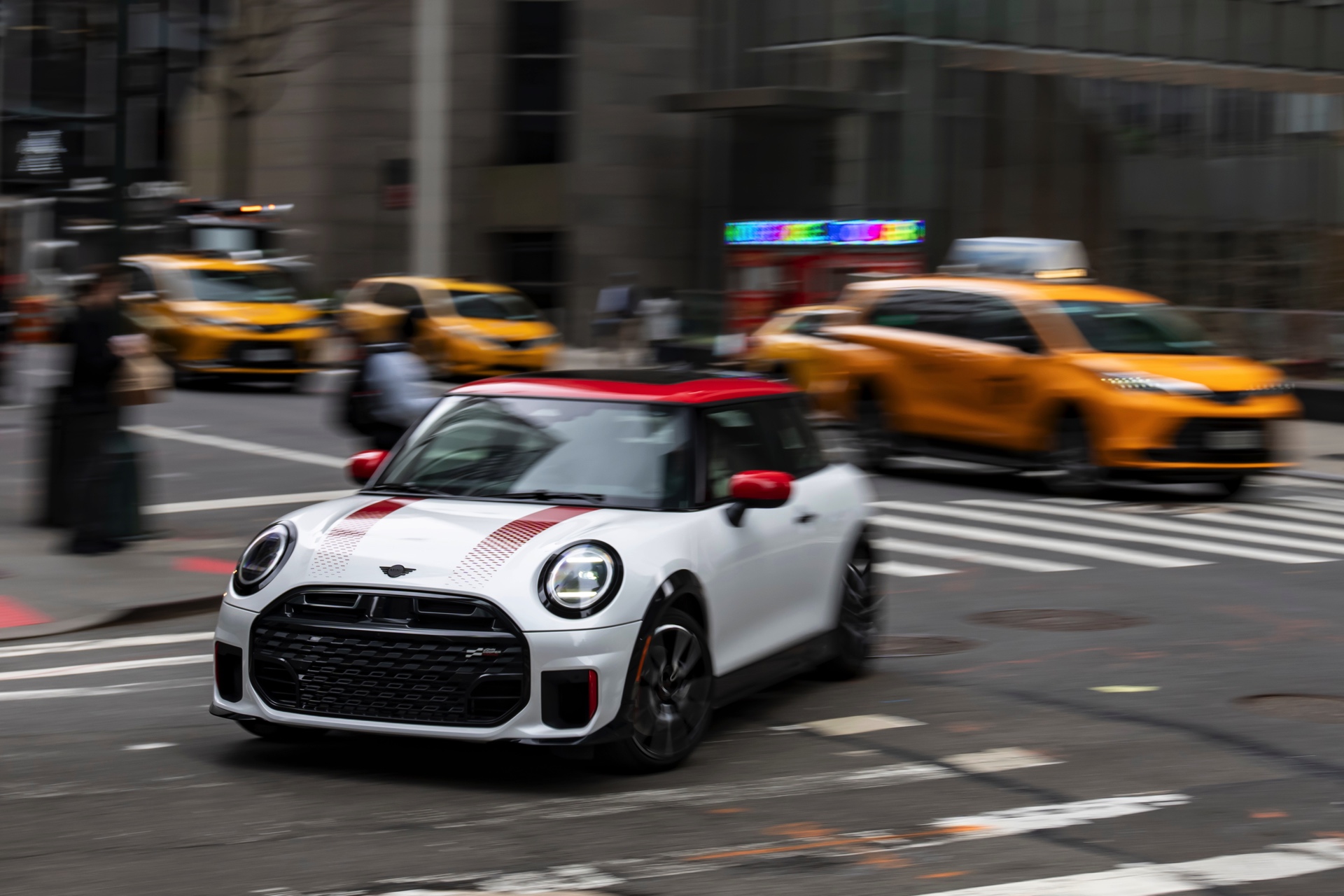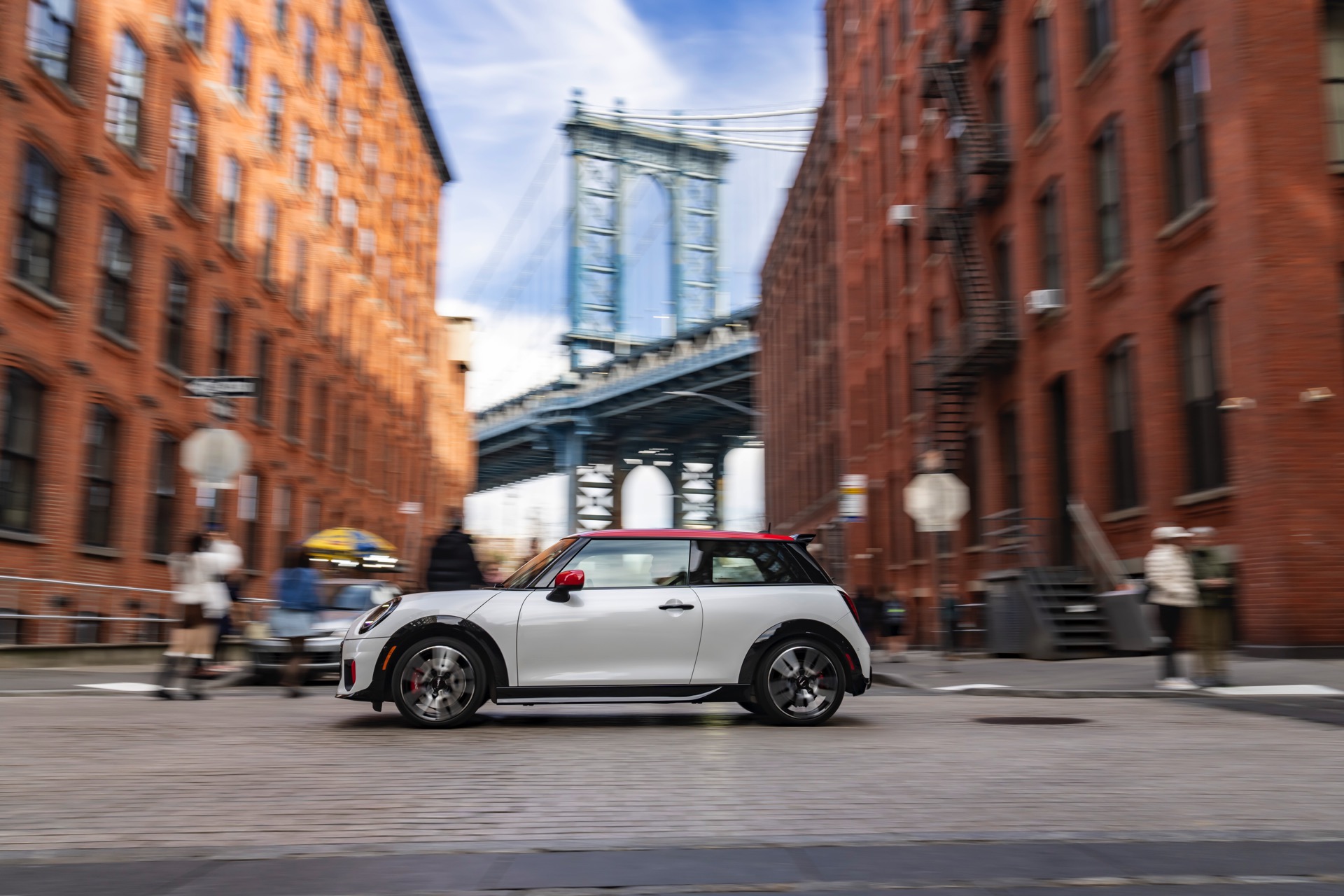 Ein wendiger und agiler Kleinwagen mit ordentlich Leistung kann seine Stärken in diesem Umfeld bei fast jeder Fahrt ausspielen und natürlich gestaltet sich auch die Parkplatz-Suche mit seinem Format wesentlich einfacher als mit einem SUV amerikanischer Prägung. Ein aktuelles Foto-Set zeigt uns die dynamischste Ausprägung des neuen MINI Cooper (F66) im unverwechselbaren Umfeld der US-Metropole: Im Fokus steht und fährt ein MINI John Cooper Works in Nanuq White, der mit rotem Kontrastdach, roten Außenspiegeln und roten Haubenstreifen auf seinen sportlichen Anspruch hinweist. "