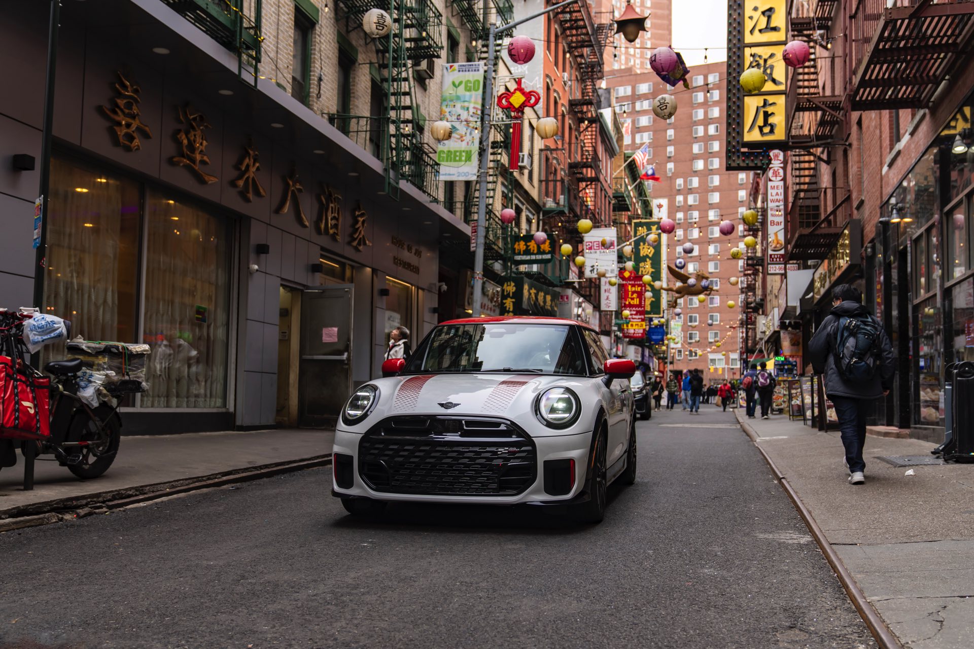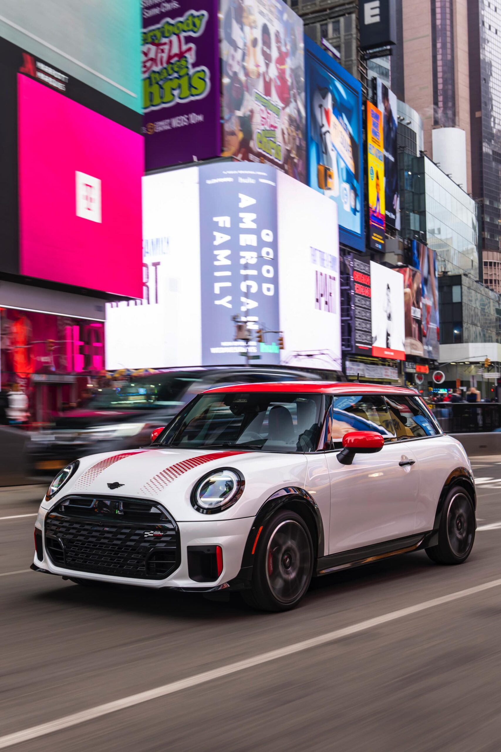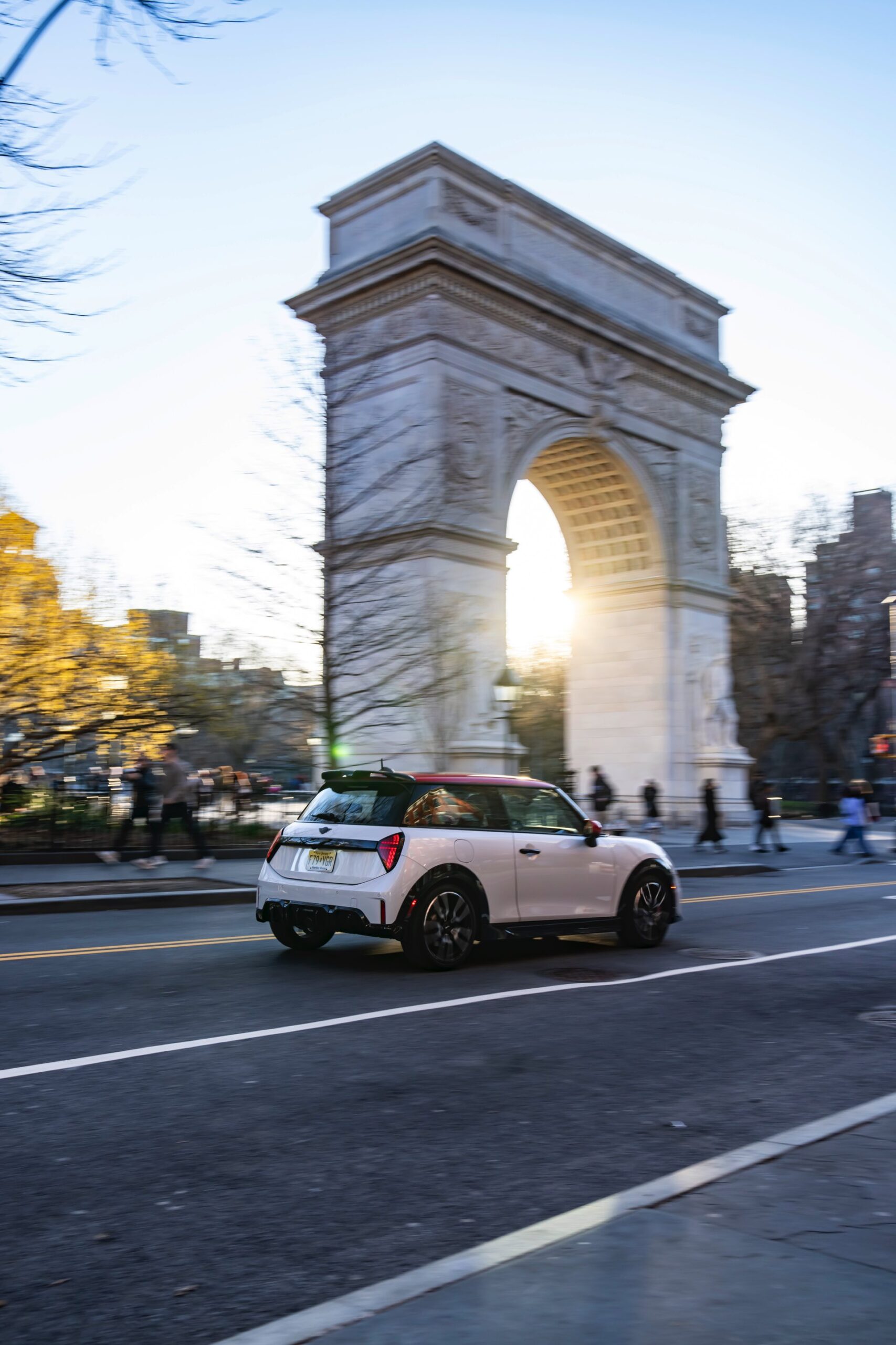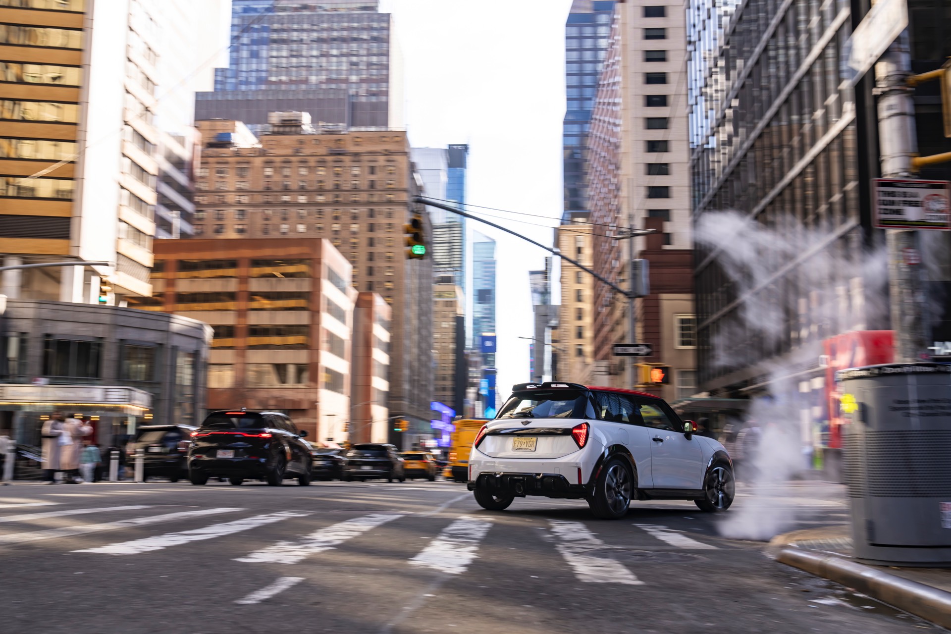 Ein wendiger und agiler Kleinwagen mit ordentlich Leistung kann seine Stärken in diesem Umfeld bei fast jeder Fahrt ausspielen und natürlich gestaltet sich auch die Parkplatz-Suche mit seinem Format wesentlich einfacher als mit einem SUV amerikanischer Prägung. Ein aktuelles Foto-Set zeigt uns die dynamischste Ausprägung des neuen MINI Cooper (F66) im unverwechselbaren Umfeld der US-Metropole: Im Fokus steht und fährt ein MINI John Cooper Works in Nanuq White, der mit rotem Kontrastdach, roten Außenspiegeln und roten Haubenstreifen auf seinen sportlichen Anspruch hinweist. "