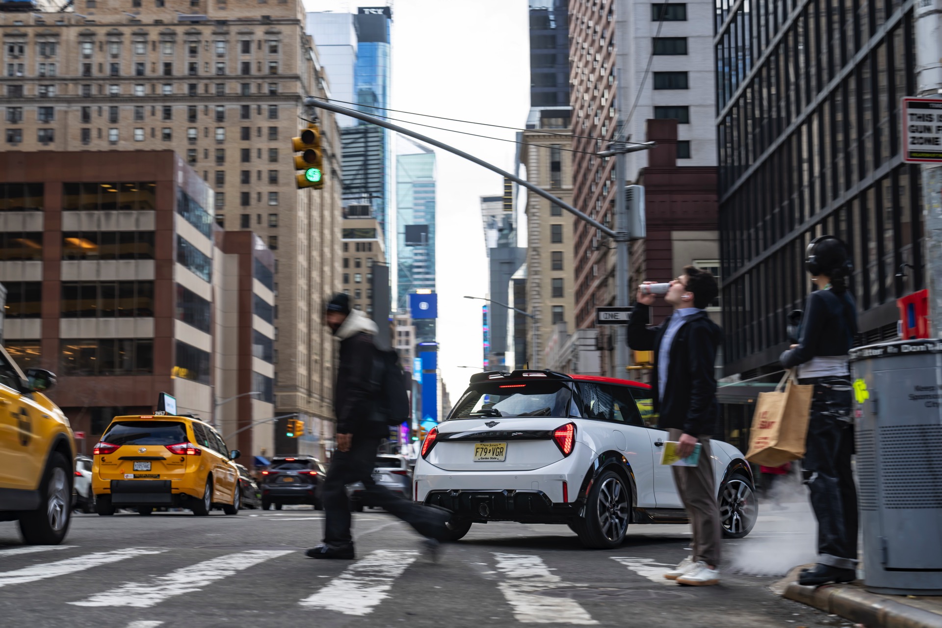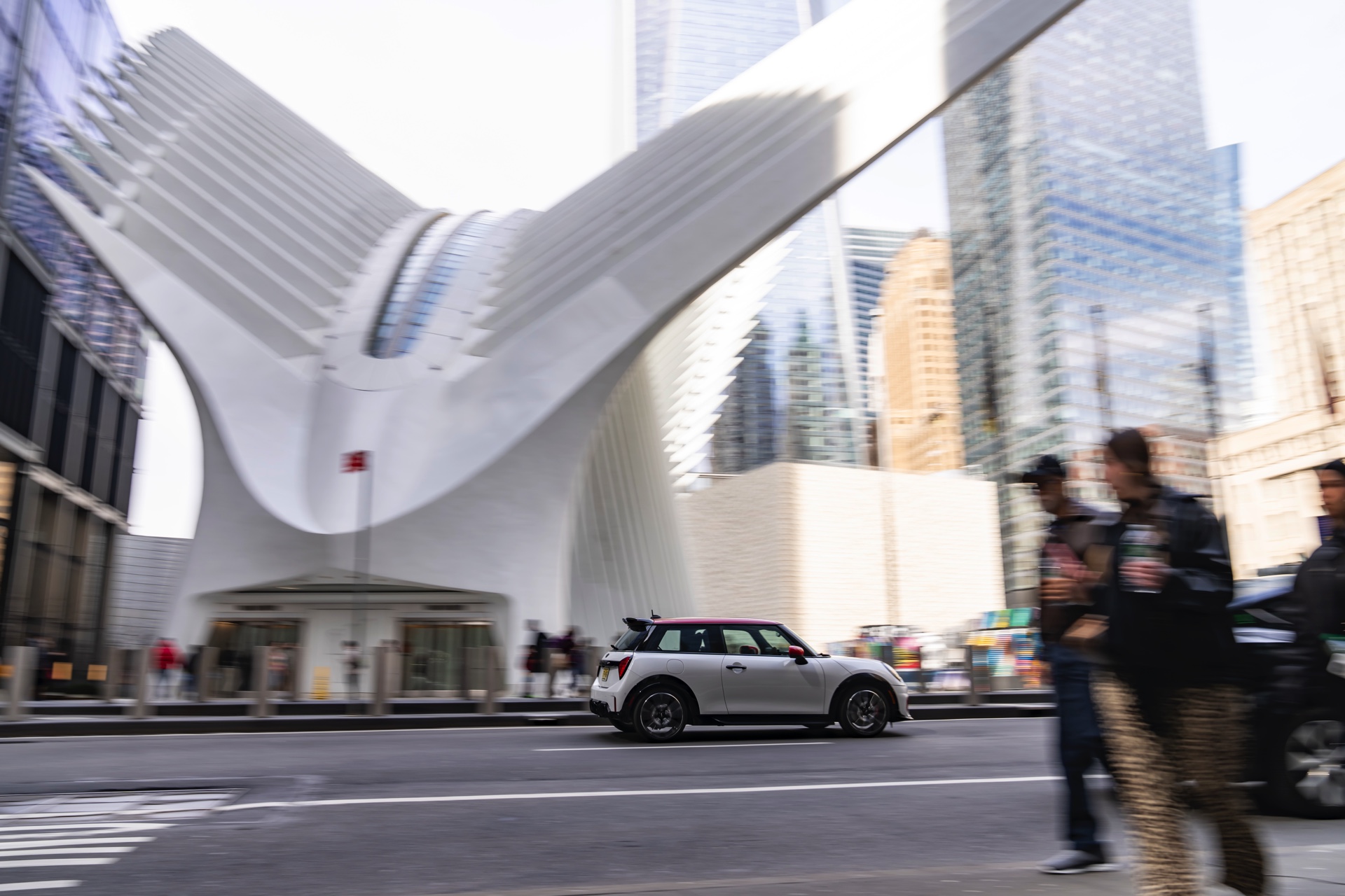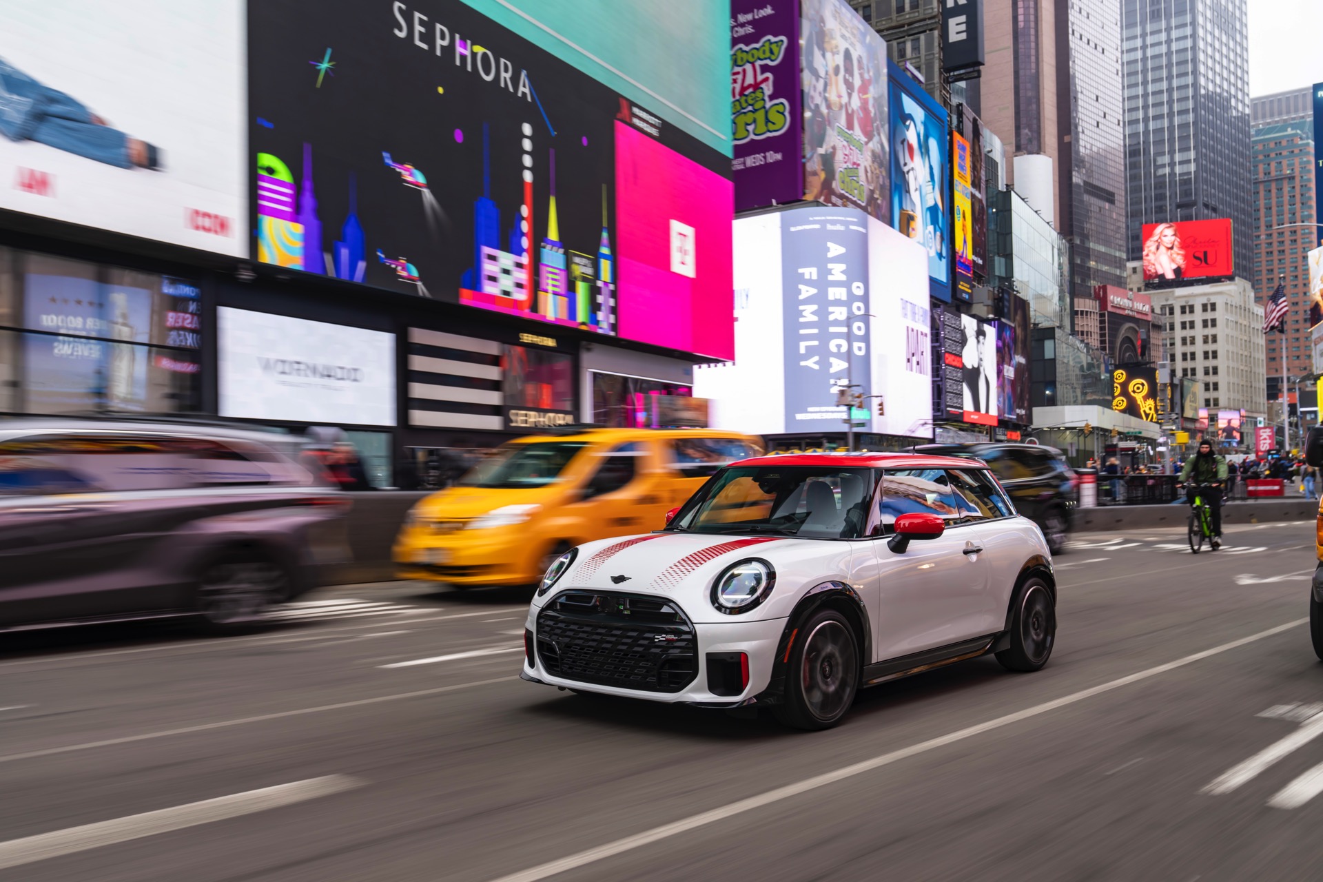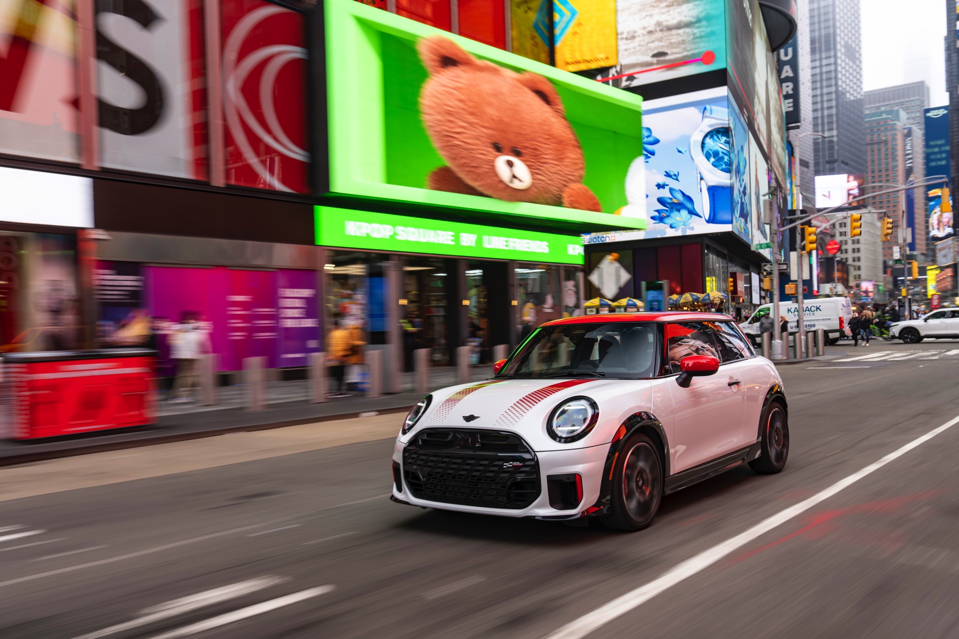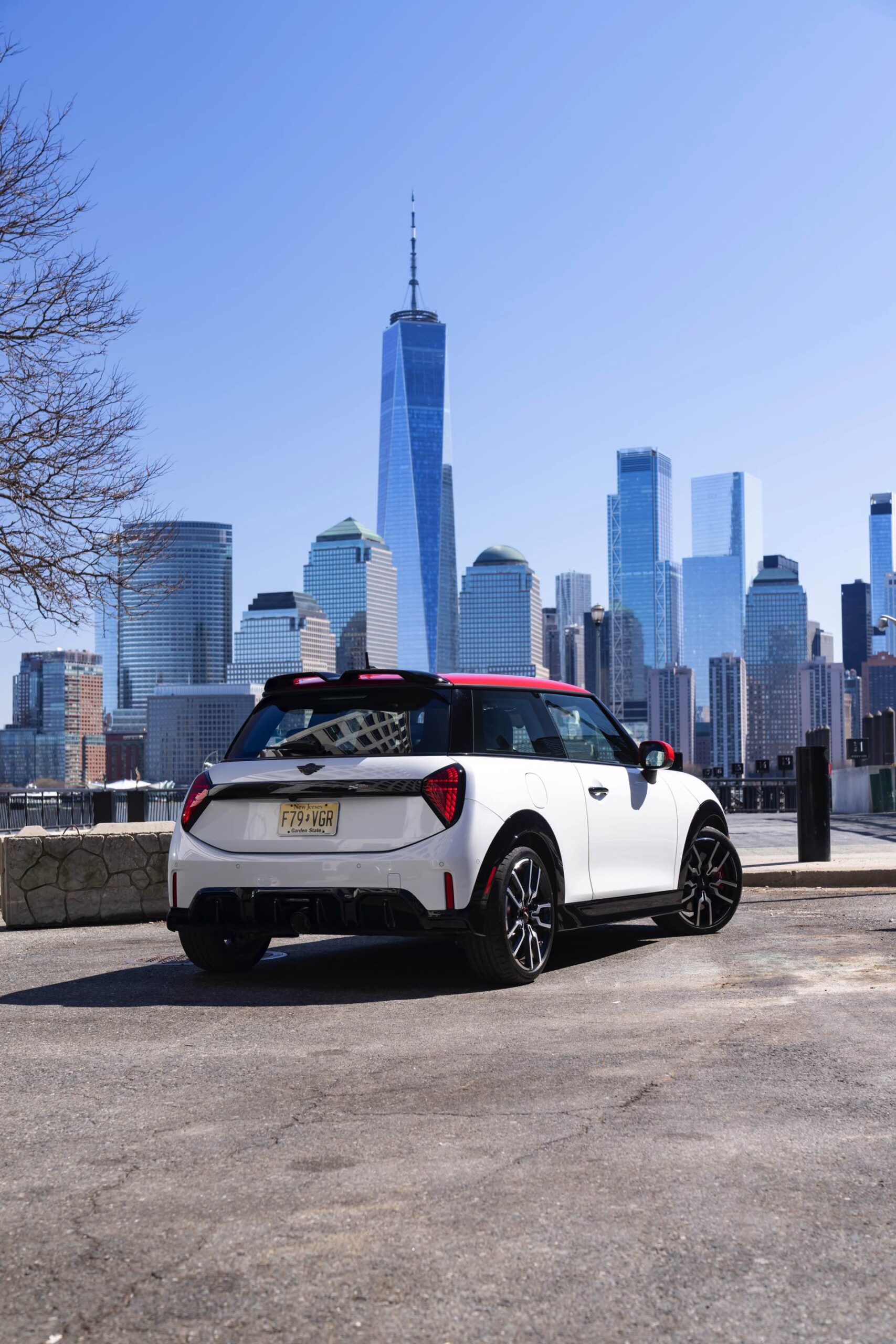 Ein wendiger und agiler Kleinwagen mit ordentlich Leistung kann seine Stärken in diesem Umfeld bei fast jeder Fahrt ausspielen und natürlich gestaltet sich auch die Parkplatz-Suche mit seinem Format wesentlich einfacher als mit einem SUV amerikanischer Prägung. Ein aktuelles Foto-Set zeigt uns die dynamischste Ausprägung des neuen MINI Cooper (F66) im unverwechselbaren Umfeld der US-Metropole: Im Fokus steht und fährt ein MINI John Cooper Works in Nanuq White, der mit rotem Kontrastdach, roten Außenspiegeln und roten Haubenstreifen auf seinen sportlichen Anspruch hinweist. "