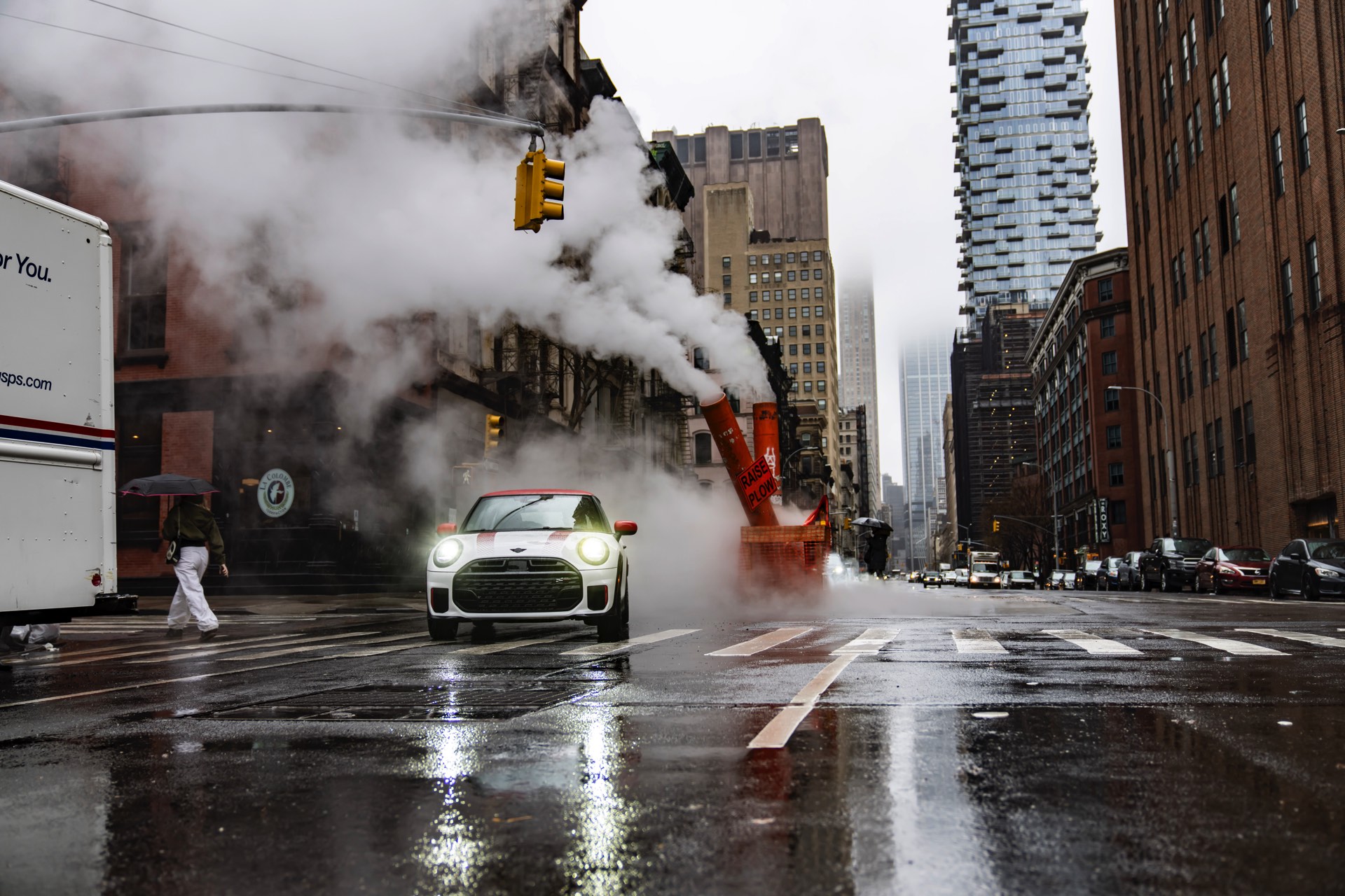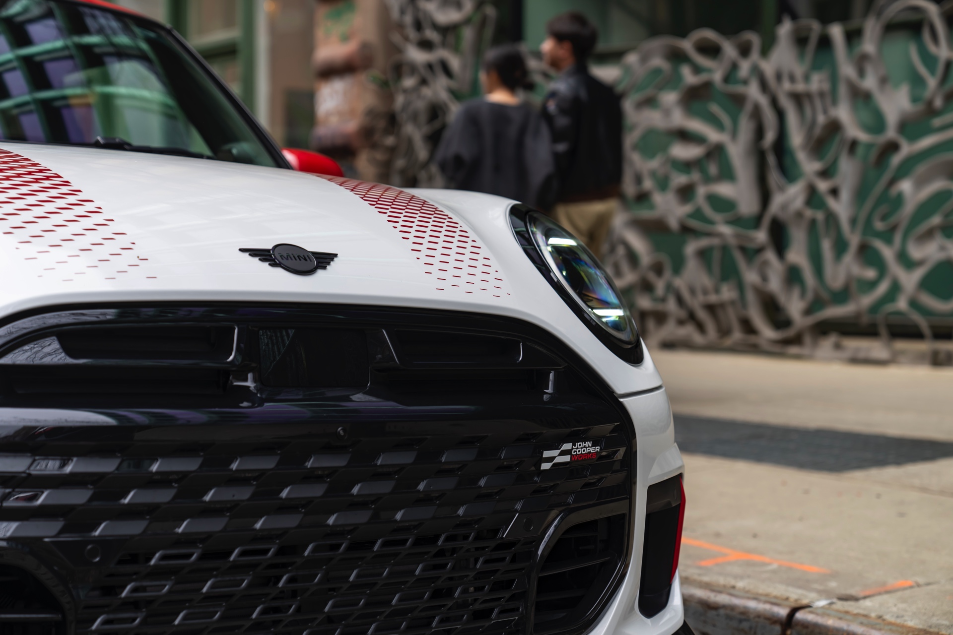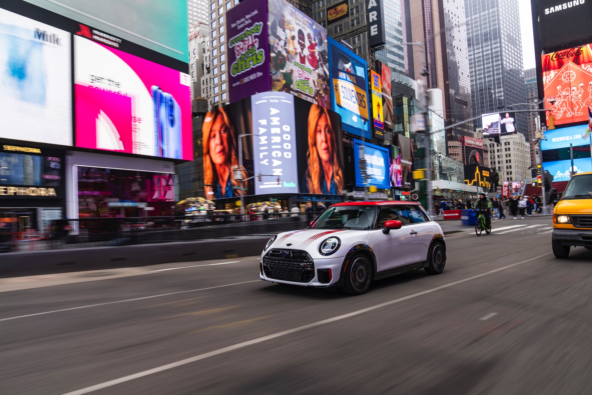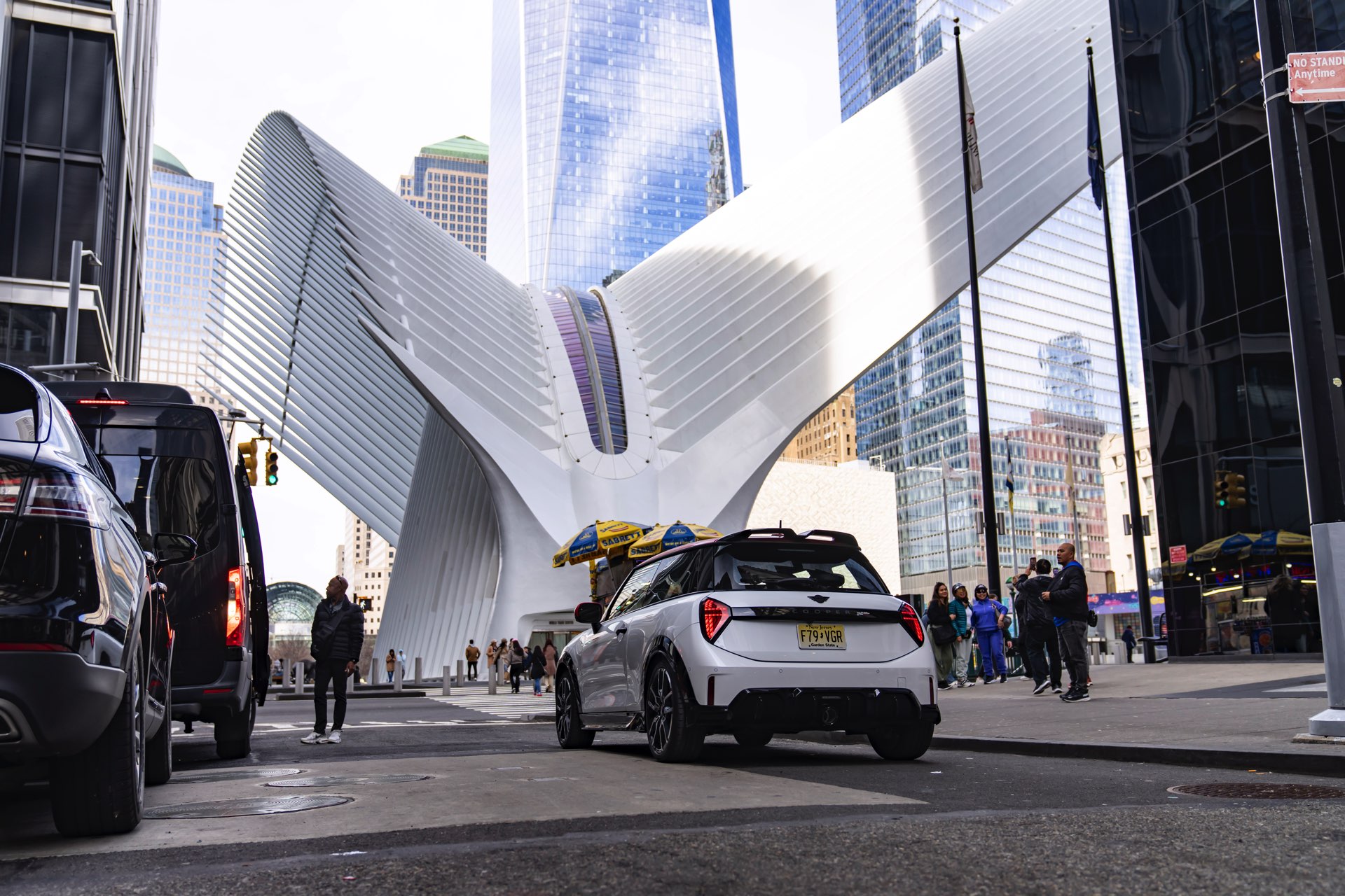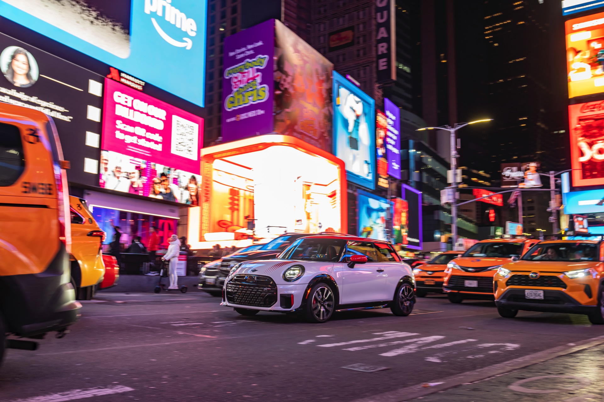 Ein wendiger und agiler Kleinwagen mit ordentlich Leistung kann seine Stärken in diesem Umfeld bei fast jeder Fahrt ausspielen und natürlich gestaltet sich auch die Parkplatz-Suche mit seinem Format wesentlich einfacher als mit einem SUV amerikanischer Prägung. Ein aktuelles Foto-Set zeigt uns die dynamischste Ausprägung des neuen MINI Cooper (F66) im unverwechselbaren Umfeld der US-Metropole: Im Fokus steht und fährt ein MINI John Cooper Works in Nanuq White, der mit rotem Kontrastdach, roten Außenspiegeln und roten Haubenstreifen auf seinen sportlichen Anspruch hinweist. "
