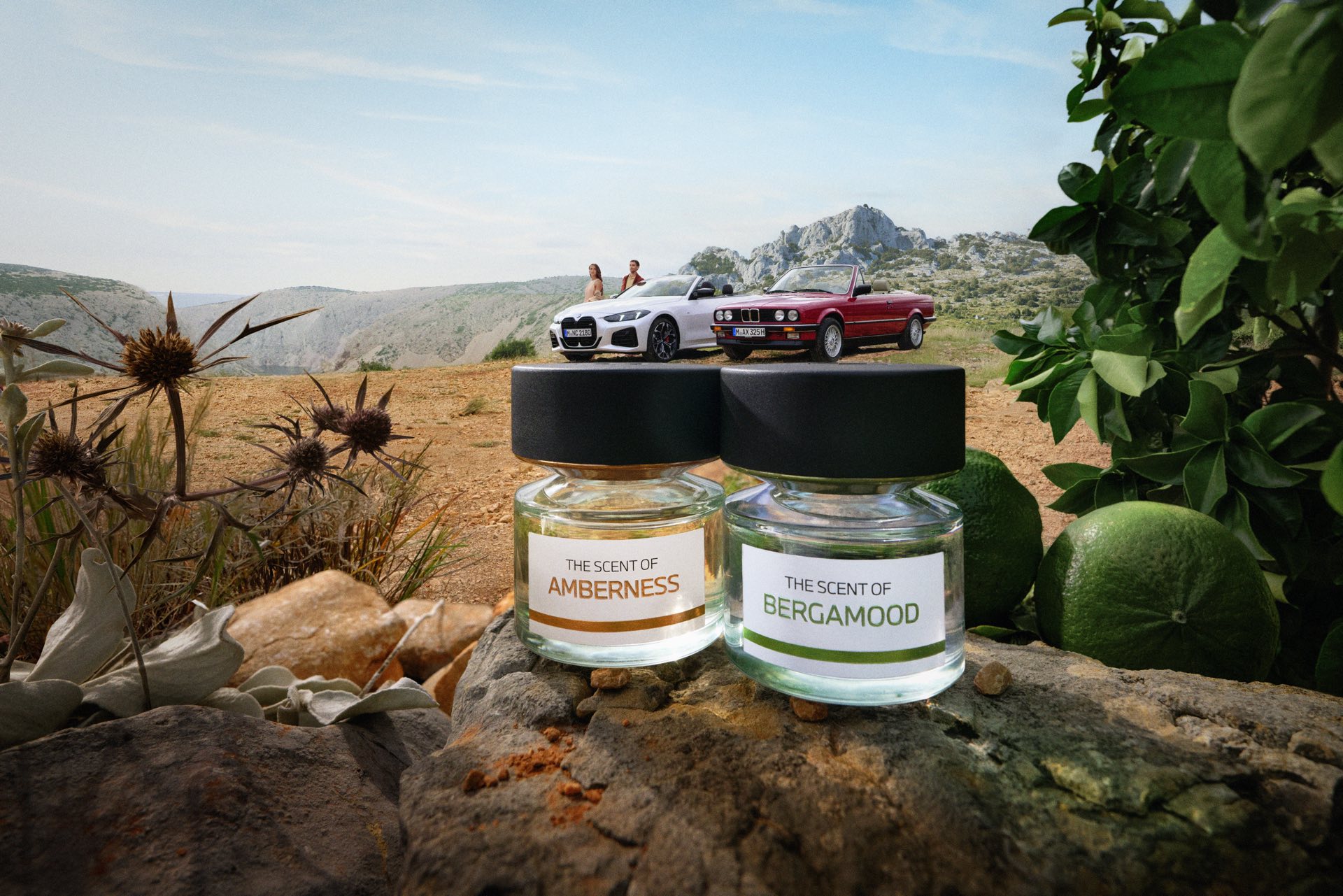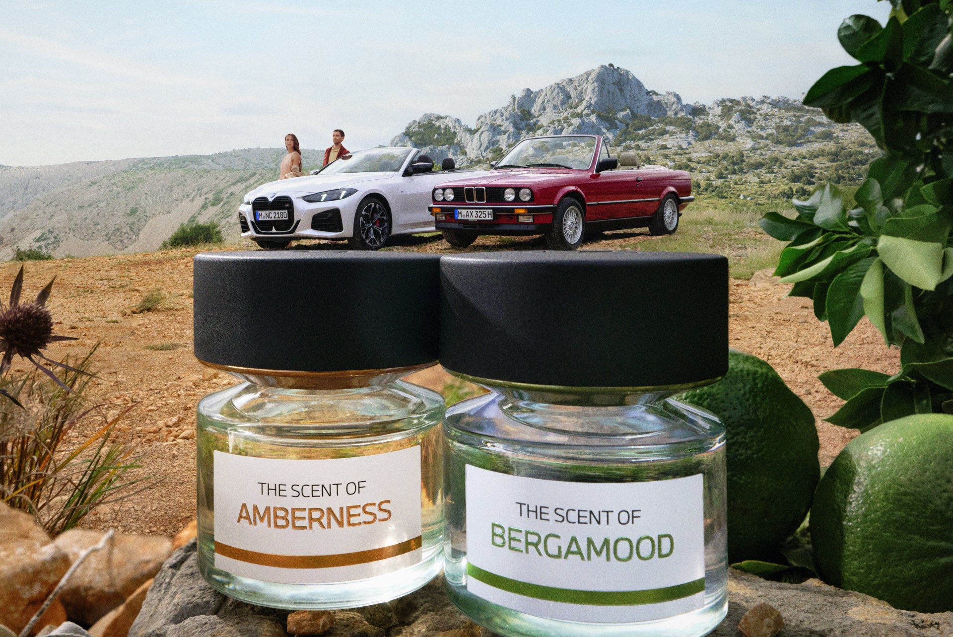 Den Launch der beiden Düfte unterstützt BMW mit zwei Fahrzeugen, die sinnbildlich für den zeitlosen Wunsch nach Freiheit und Freude am Fahren stehen: An der Seite eines aktuellen 4er Cabrio (G23 LCI) steht auch ein rotes 3er Cabrio der Generation E30, das bereits mit H-Kennzeichen unterwegs ist. Genau wie die Fahrzeuge aus München richten sich auch Amberness und Bergamood an Männer und Frauen gleichermaßen. Für den Duft von Amberness sorgen in erster Linie französischer Muskatellersalbei und guatemalischer Kardamom, aber auch italienischer Bergamotte und ägyptischer Geranie. Abgerundet wird der Duft mit feinen Noten von Madagascar Vanille, indonesischem Patschuli und haitianischem Vetiver.