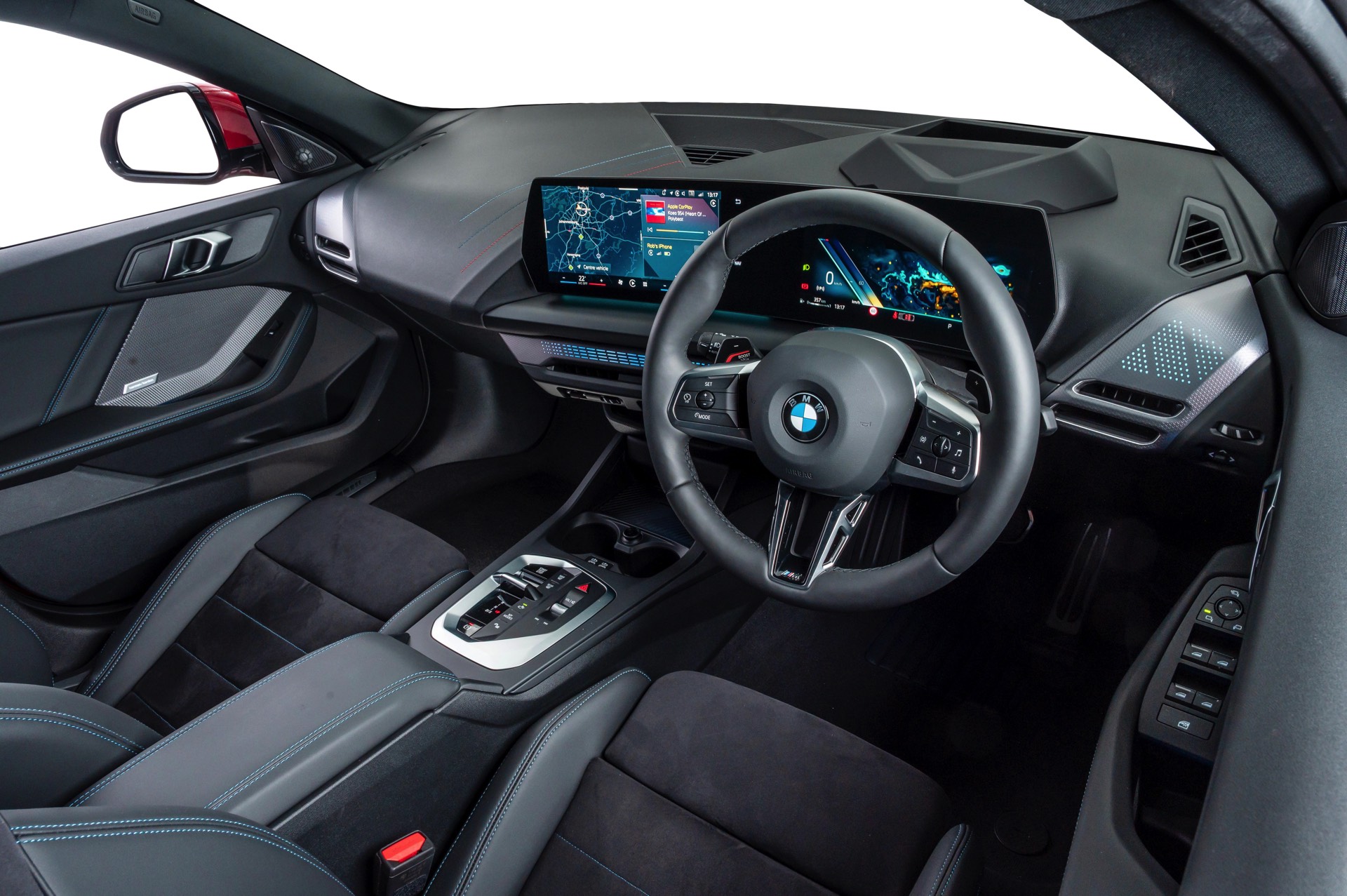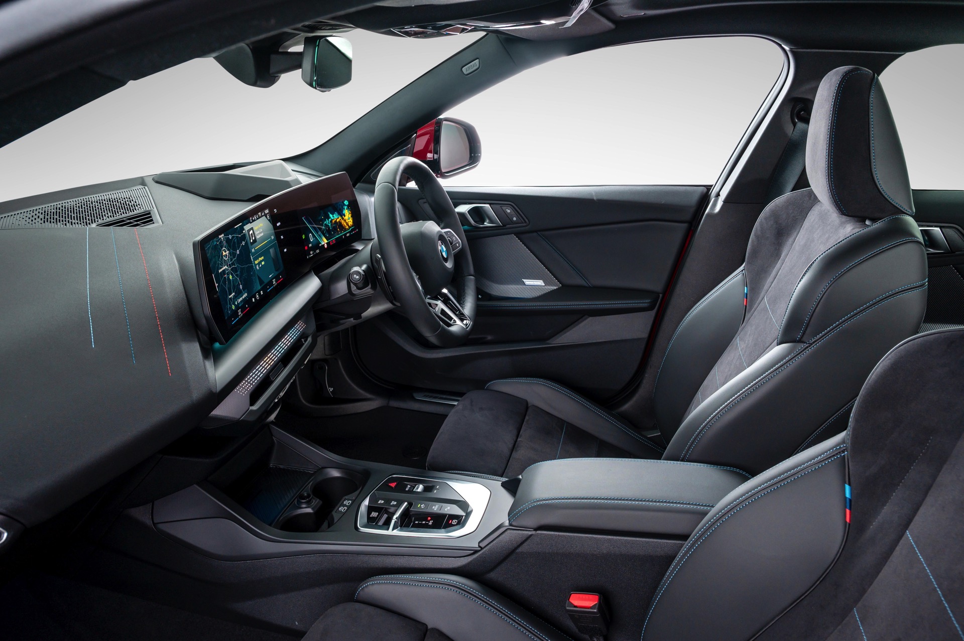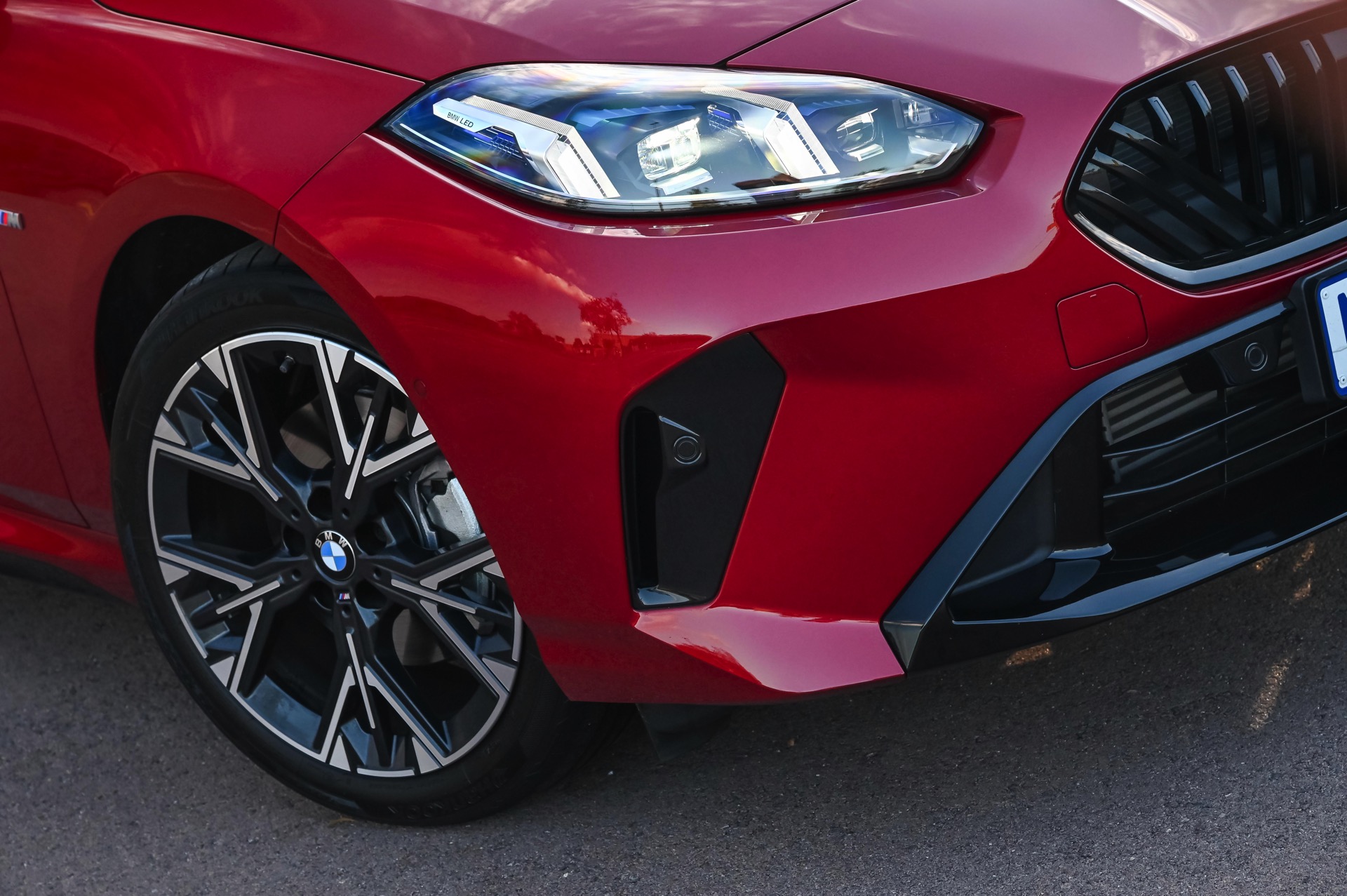 Dank des M Sport Pro-Pakets kombiniert das gezeigte BMW 2er Gran Coupé seine Lackierung in Fire Red mit einer Vielzahl schwarz lackierter Details, darunter neben den Nieren-Rahmen auch die Fenster-Einfassungen samt der geprägten 2 im Bereich des Hofmeisterknicks. Passend dazu trägt der F74 auch das optionale Kontrast-Dach mit schwarzer Lackierung, das in Deutschland für nur 360 Euro Aufpreis bestellt werden kann.