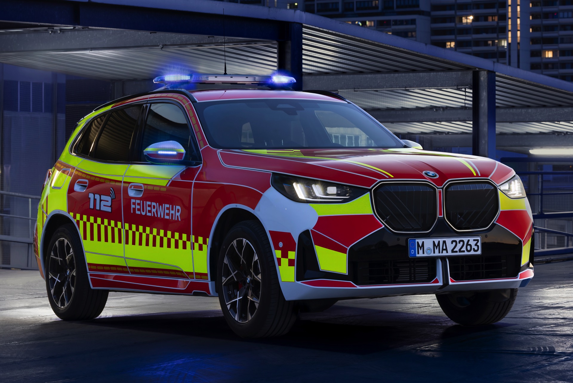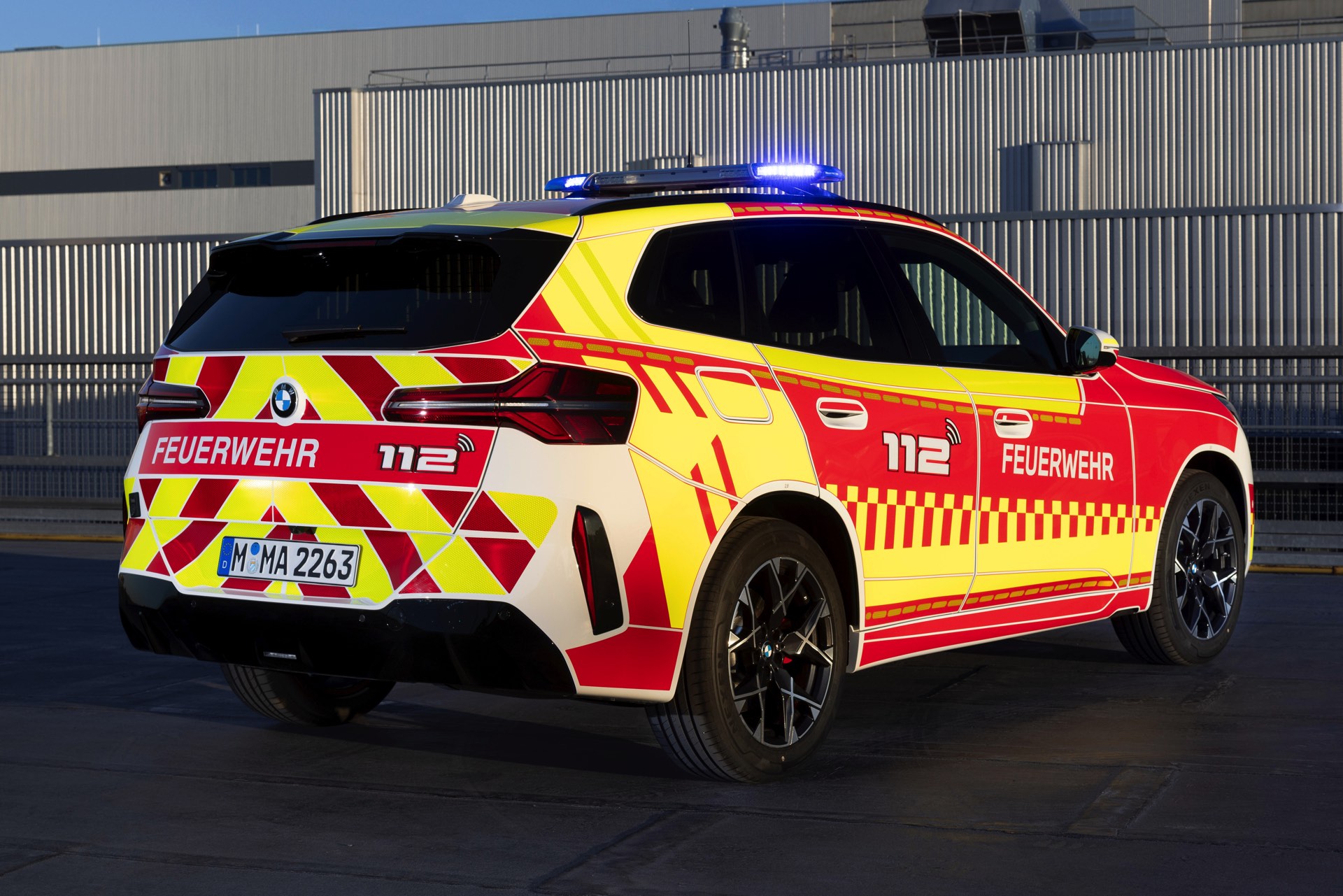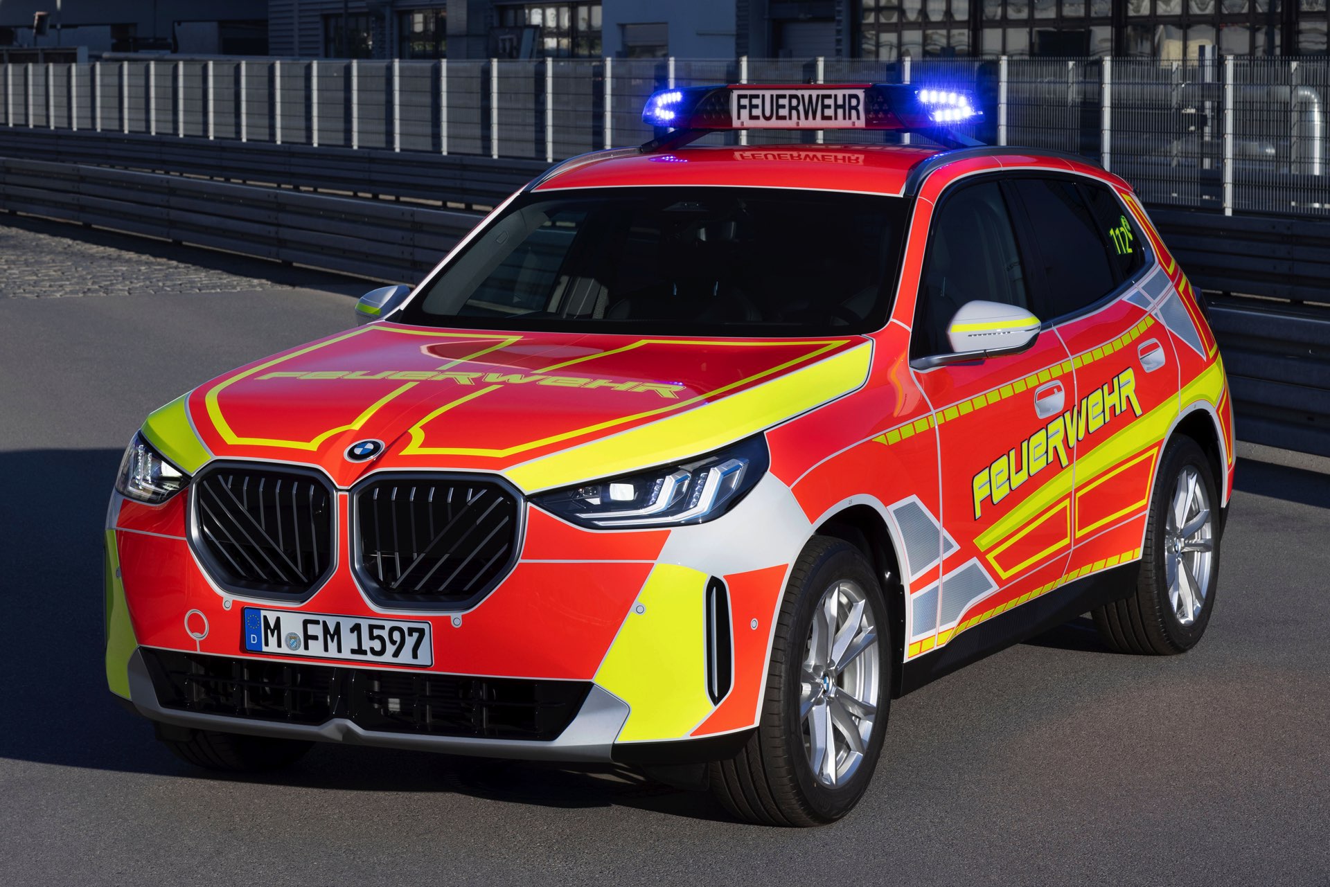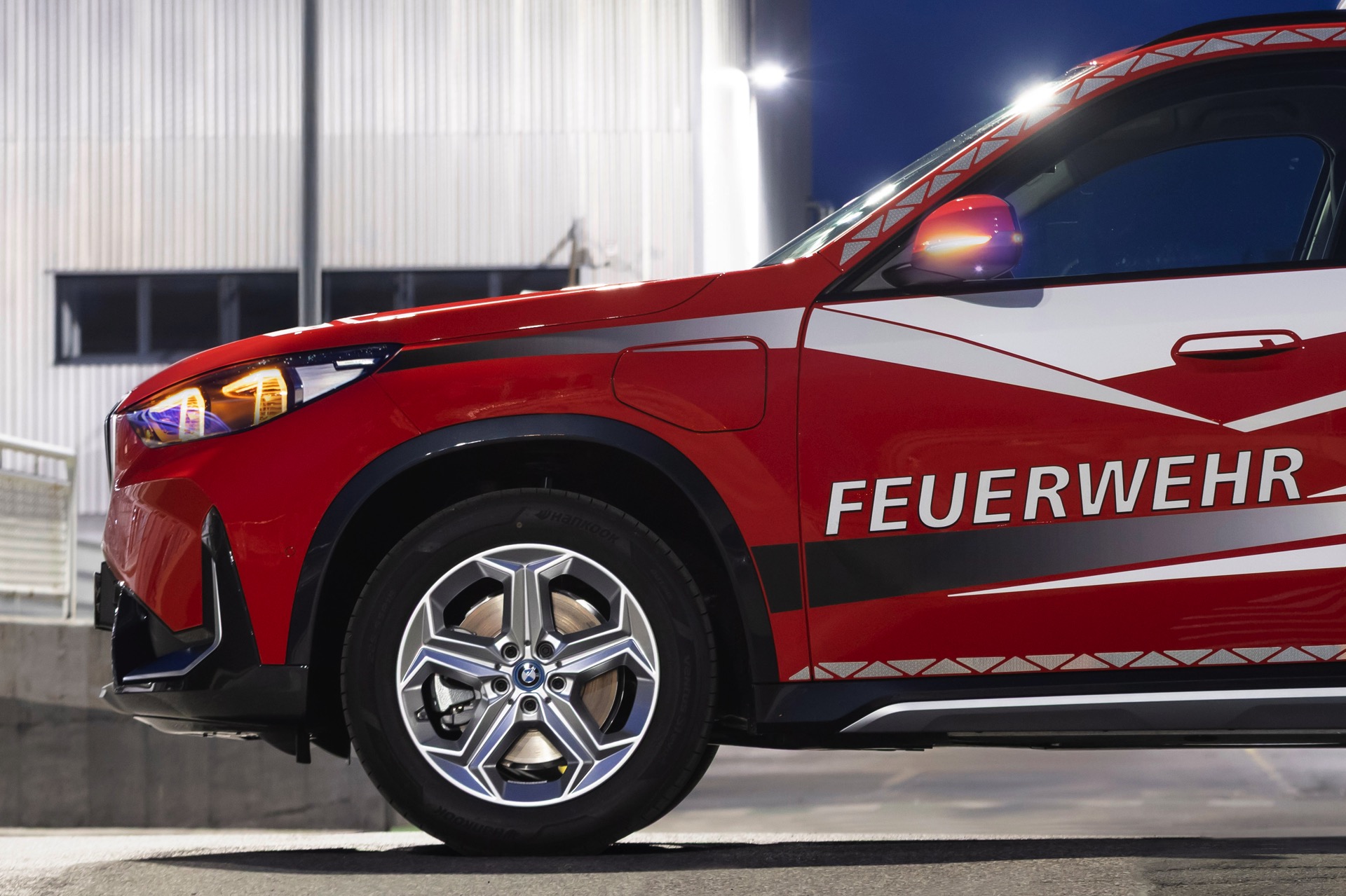 Eine Liga unterhalb des X3 ist der BMW X1 (U11) unterwegs, der auf der RettMobil 2025 ebenfalls im Feuerwehr-Look zu sehen ist. Als BMW X1 xDrive25e mit Plug-in-Hybrid-Antrieb bietet er gemäß WLTP bis zu 83 Kilometer Elektro-Reichweite und könnte so zumindest den einen oder anderen Einsatz lokal emissionsfrei absolvieren. Natürlich kommt auch der Feuerwehr-X1 mit einer speziellen Lichtsignalanlage samt Frontblitzern und zusätzlichen LEDs in der Heckklappe.
