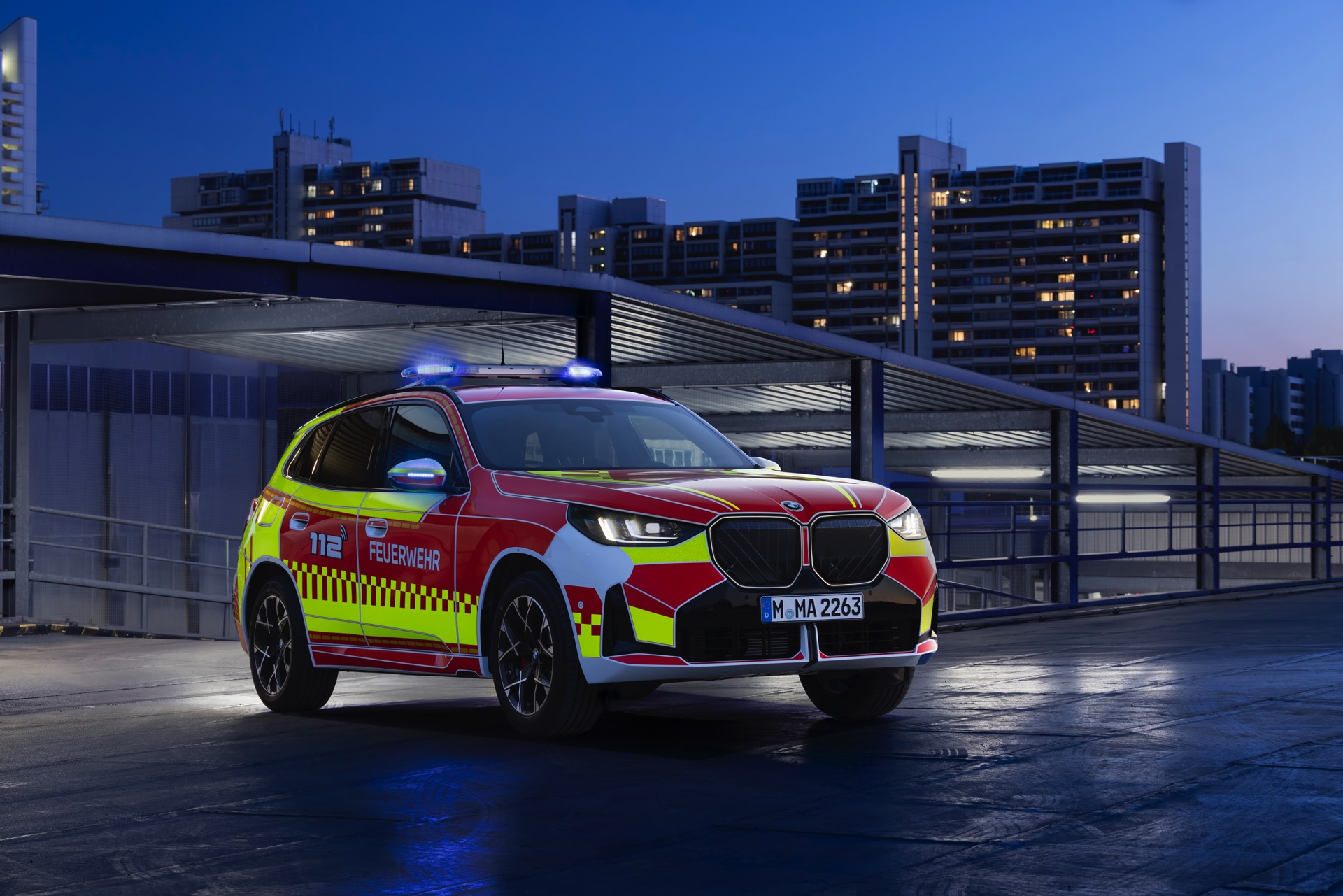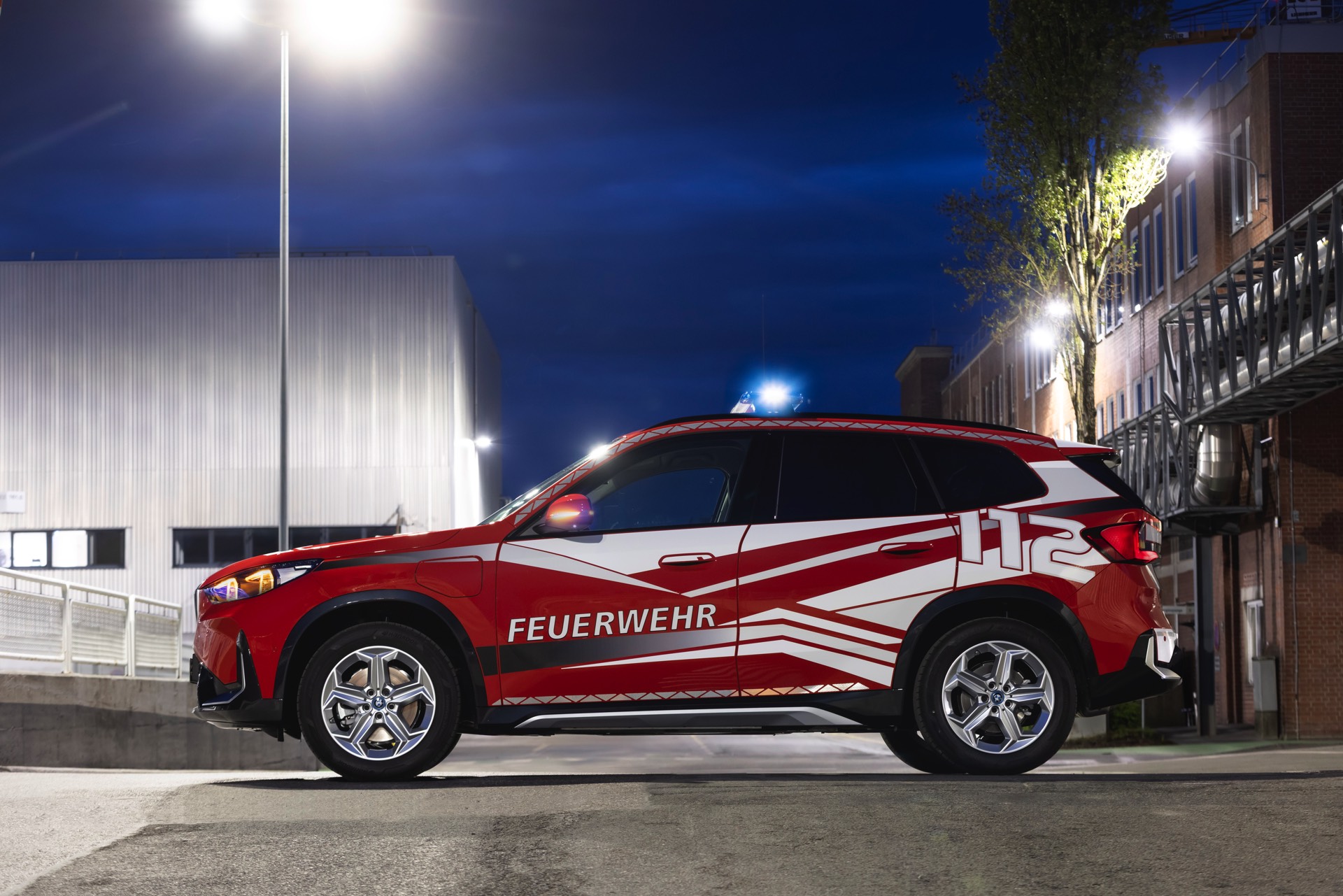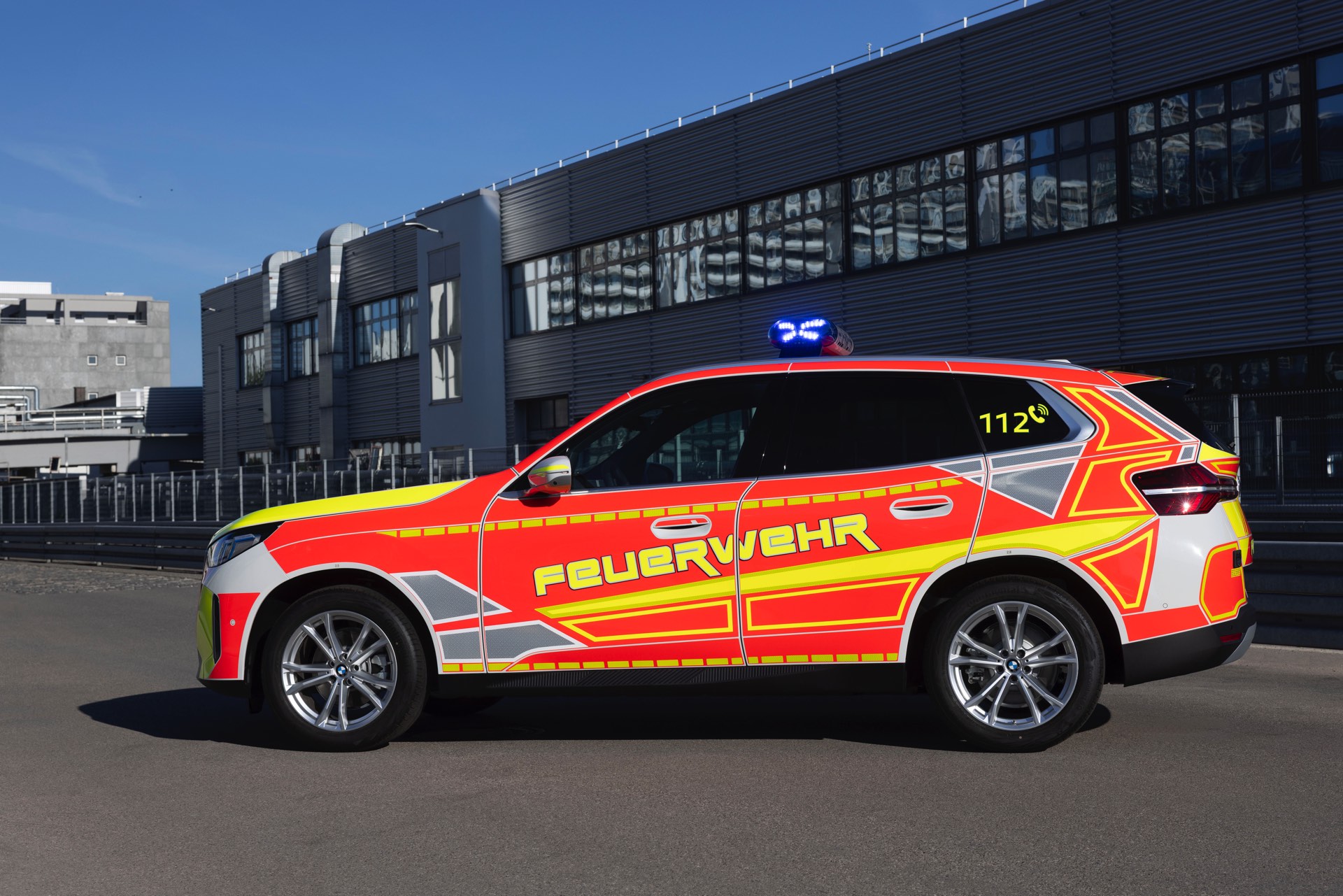 Eine Liga unterhalb des X3 ist der BMW X1 (U11) unterwegs, der auf der RettMobil 2025 ebenfalls im Feuerwehr-Look zu sehen ist. Als BMW X1 xDrive25e mit Plug-in-Hybrid-Antrieb bietet er gemäß WLTP bis zu 83 Kilometer Elektro-Reichweite und könnte so zumindest den einen oder anderen Einsatz lokal emissionsfrei absolvieren. Natürlich kommt auch der Feuerwehr-X1 mit einer speziellen Lichtsignalanlage samt Frontblitzern und zusätzlichen LEDs in der Heckklappe.