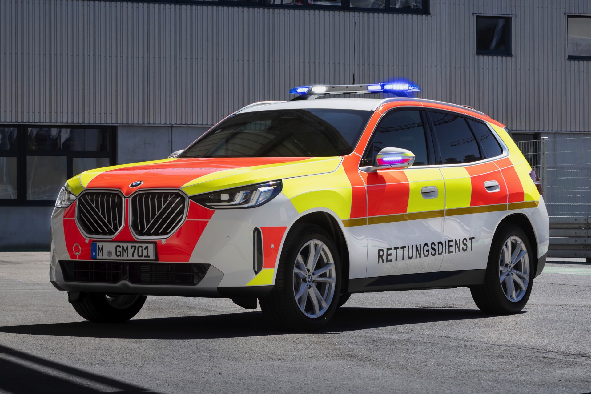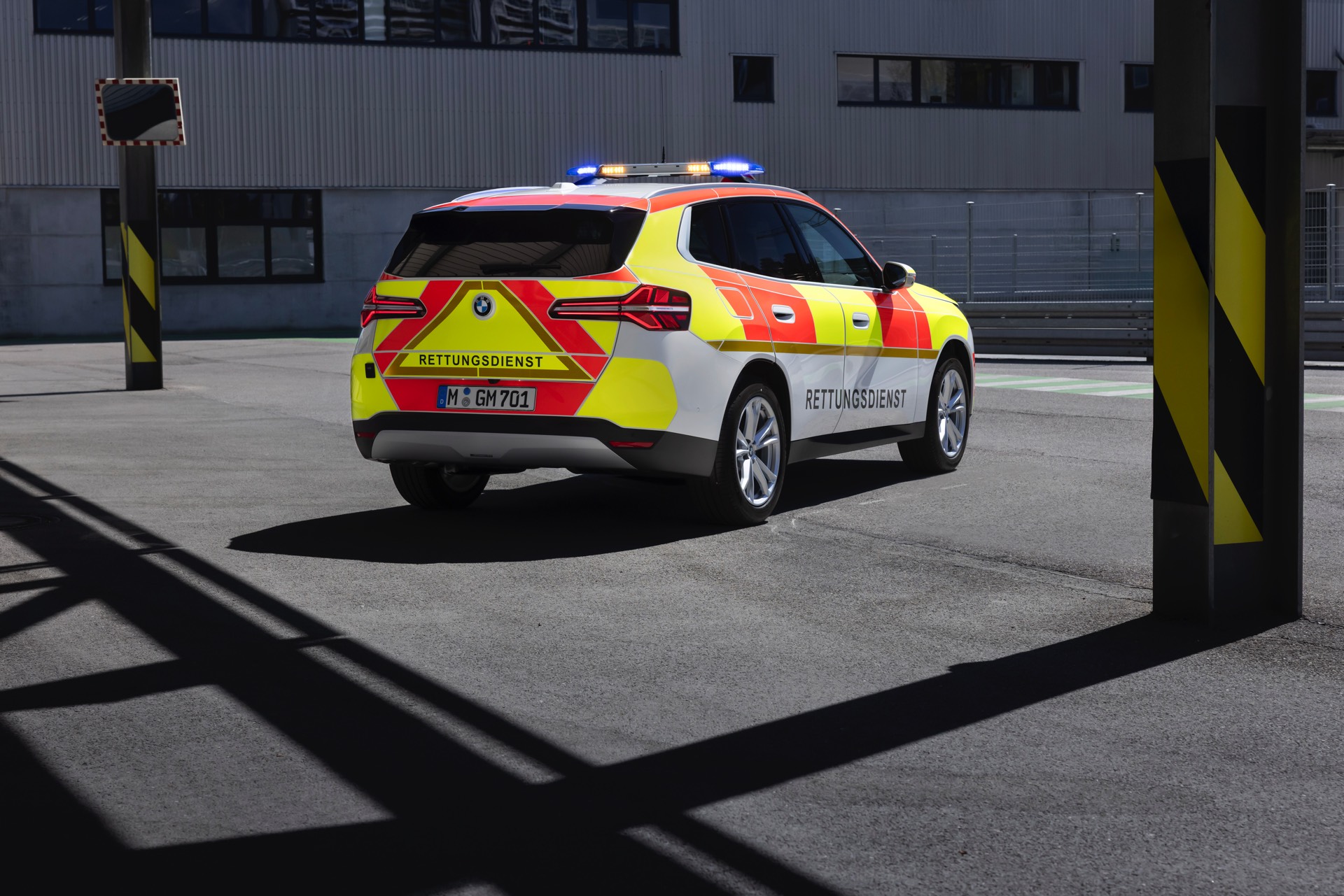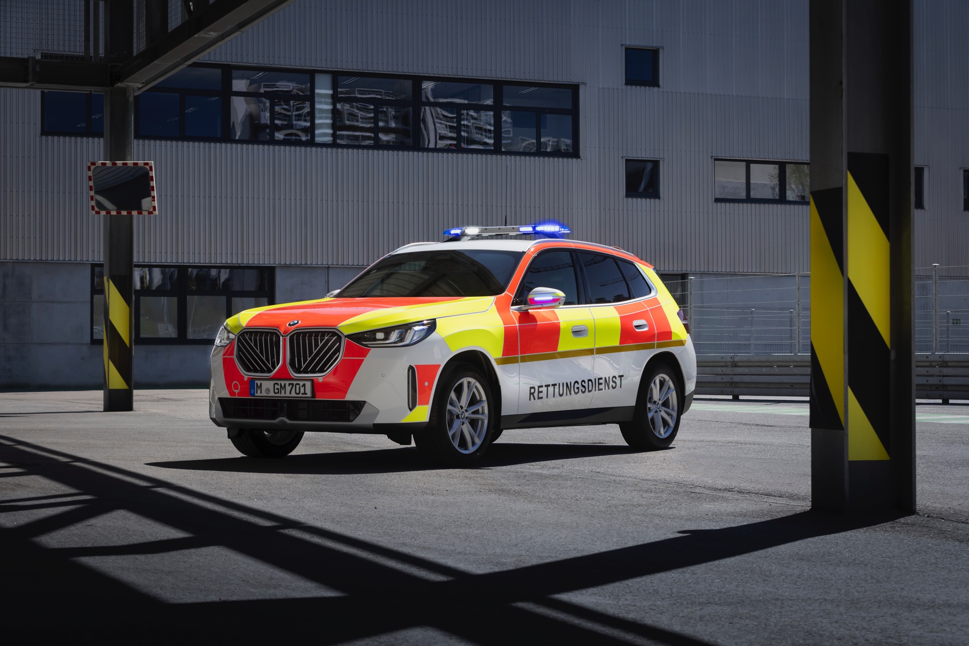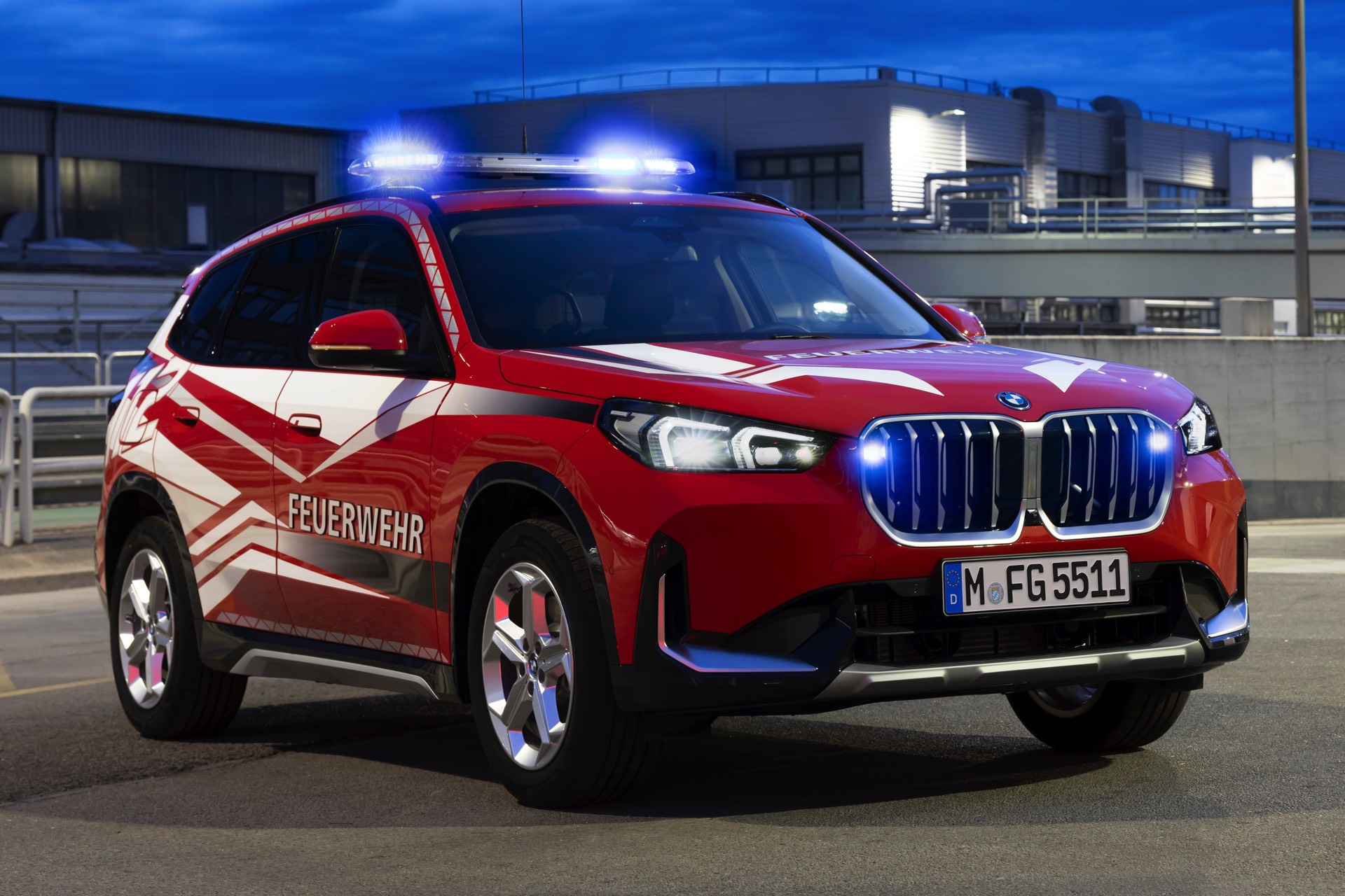Eine Liga unterhalb des X3 ist der BMW X1 (U11) unterwegs, der auf der RettMobil 2025 ebenfalls im Feuerwehr-Look zu sehen ist. Als BMW X1 xDrive25e mit Plug-in-Hybrid-Antrieb bietet er gemäß WLTP bis zu 83 Kilometer Elektro-Reichweite und könnte so zumindest den einen oder anderen Einsatz lokal emissionsfrei absolvieren. Natürlich kommt auch der Feuerwehr-X1 mit einer speziellen Lichtsignalanlage samt Frontblitzern und zusätzlichen LEDs in der Heckklappe.