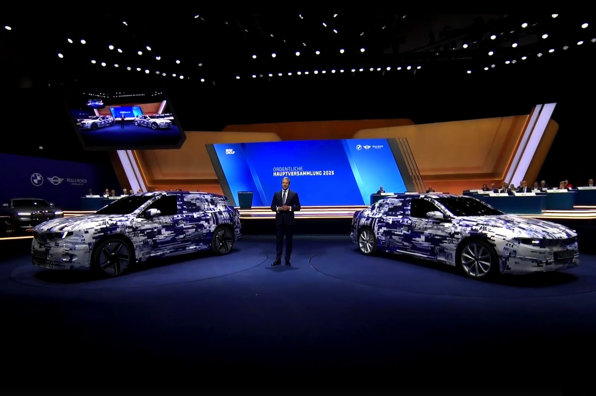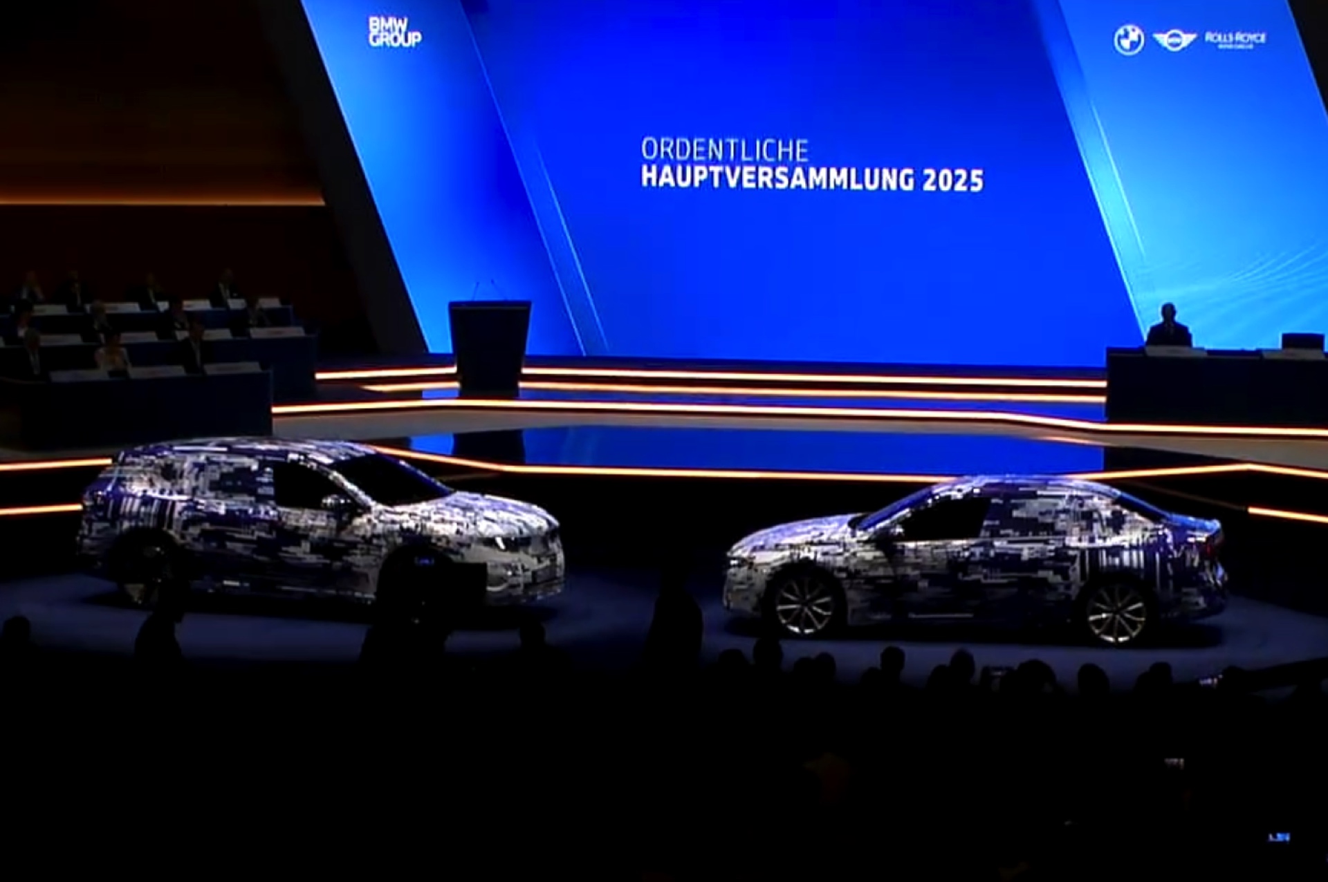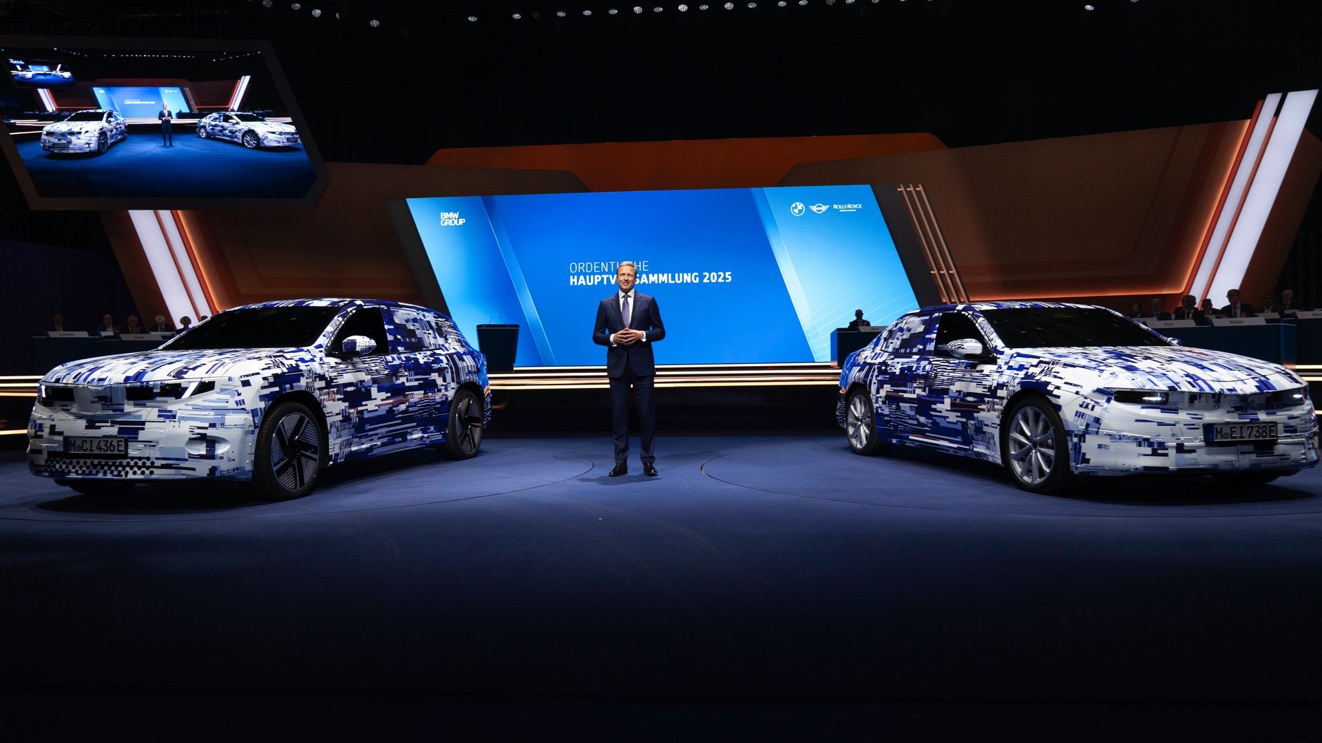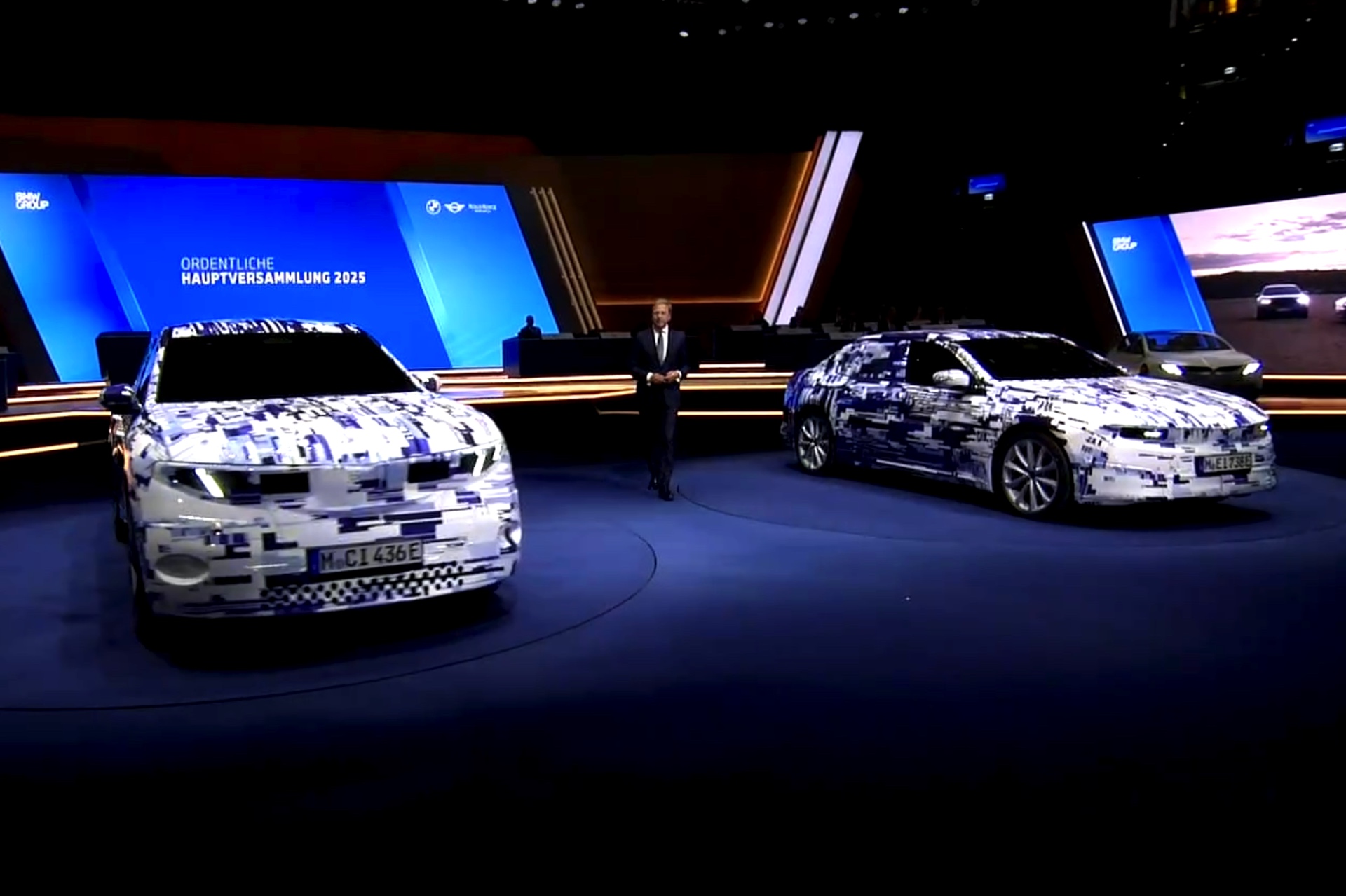 Im Rahmen der Hauptversammlung 2025 präsentierte Oliver Zipse die ersten beiden Vertreter der Neuen Klasse in einem völlig neuen Tarnkleid: BMW iX3 (NA5) und i3 (NA0) wurden mit einer Beklebung in markantem Muster präsentiert, aber der Vorstandsvorsitzende stellte natürlich dennoch die ungetarnten Varianten in den Fokus. Den Anfang wird dabei der BMW iX3 machen, dessen Serien-Version im September auf der IAA 2025 in München enthüllt werden soll – genau so, wie er wenige Wochen später auch weltweit in den Showrooms stehen soll.