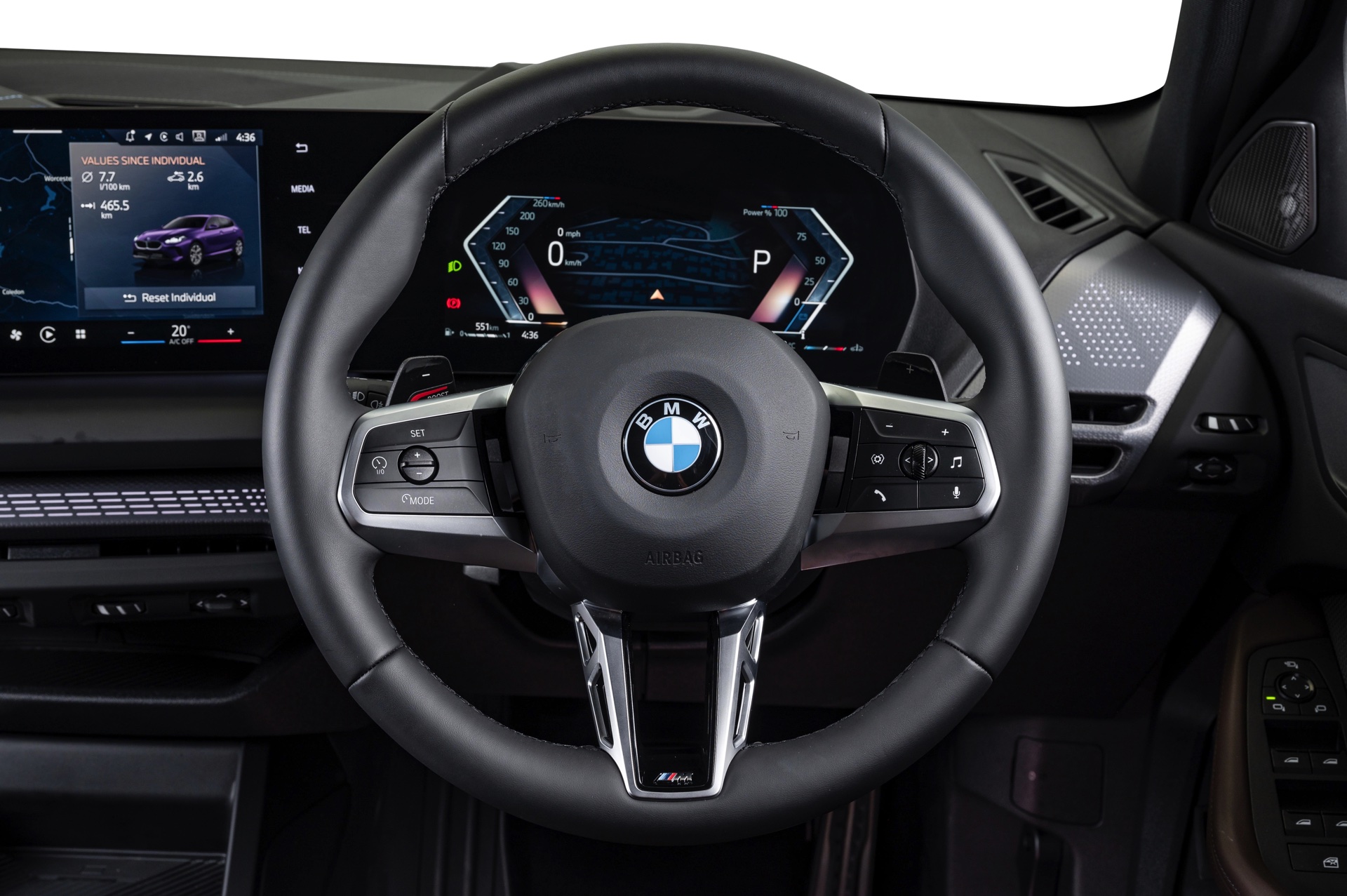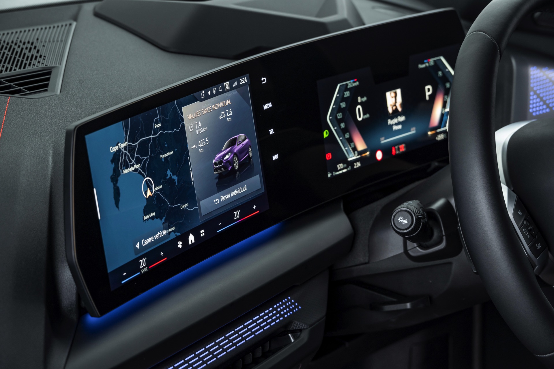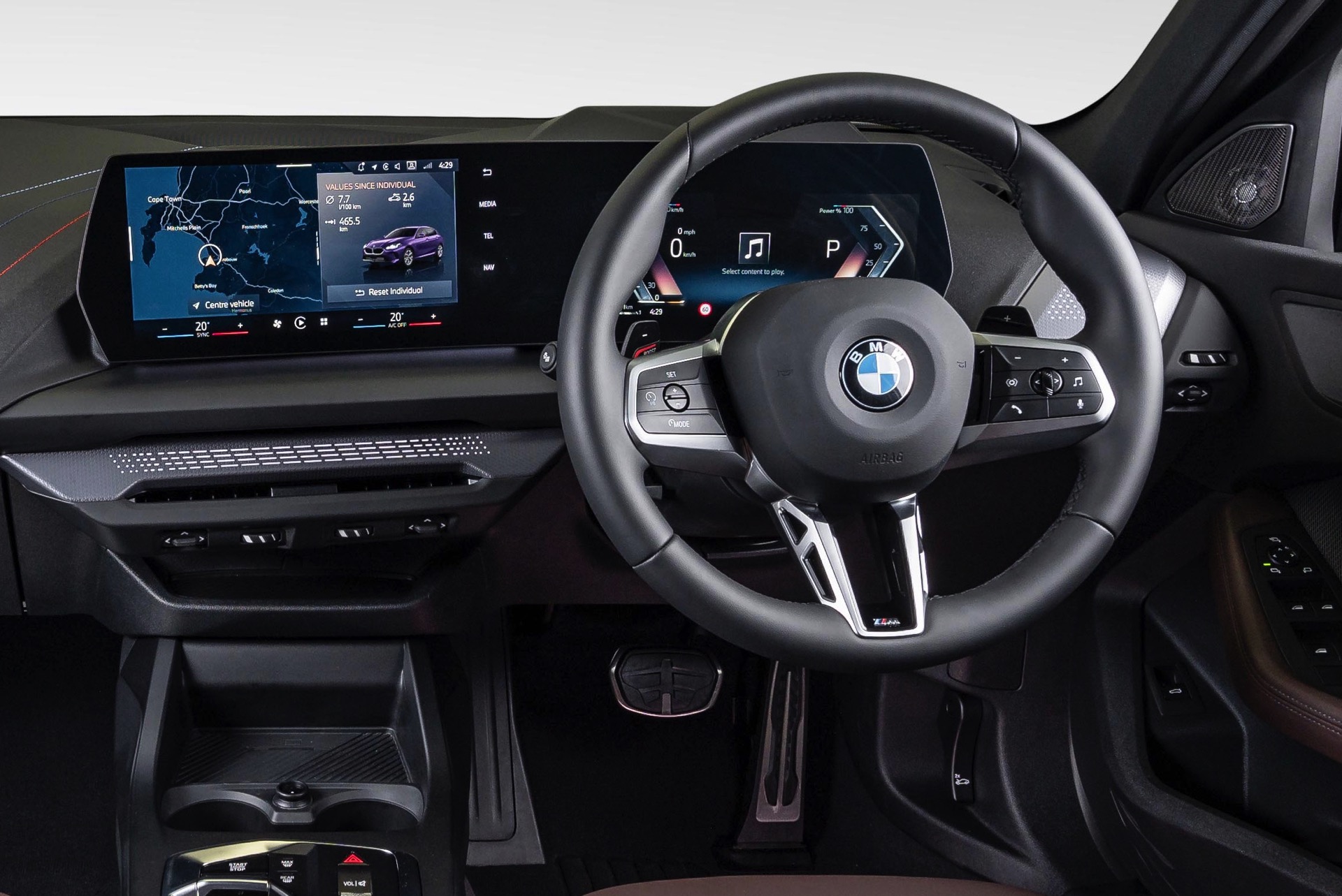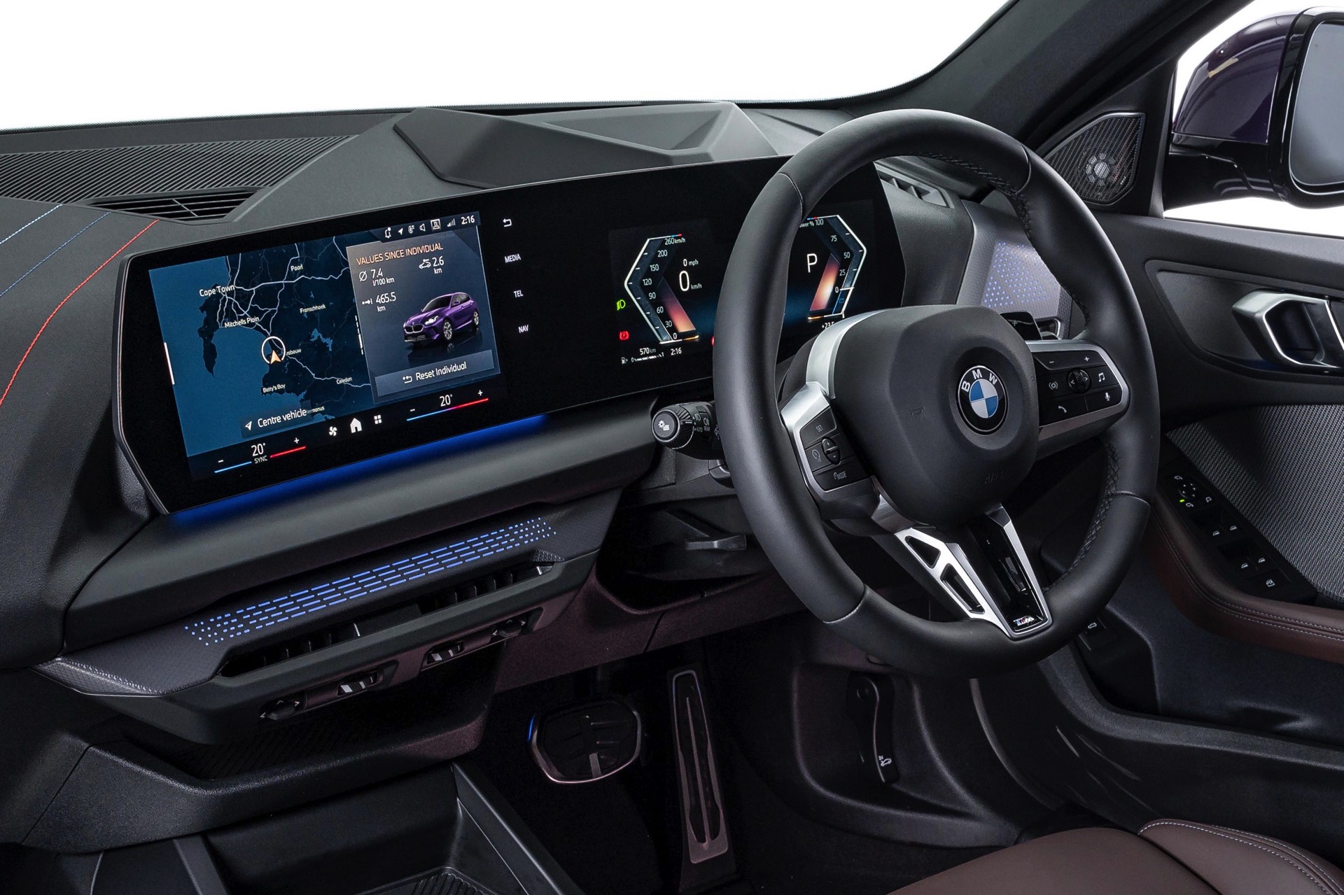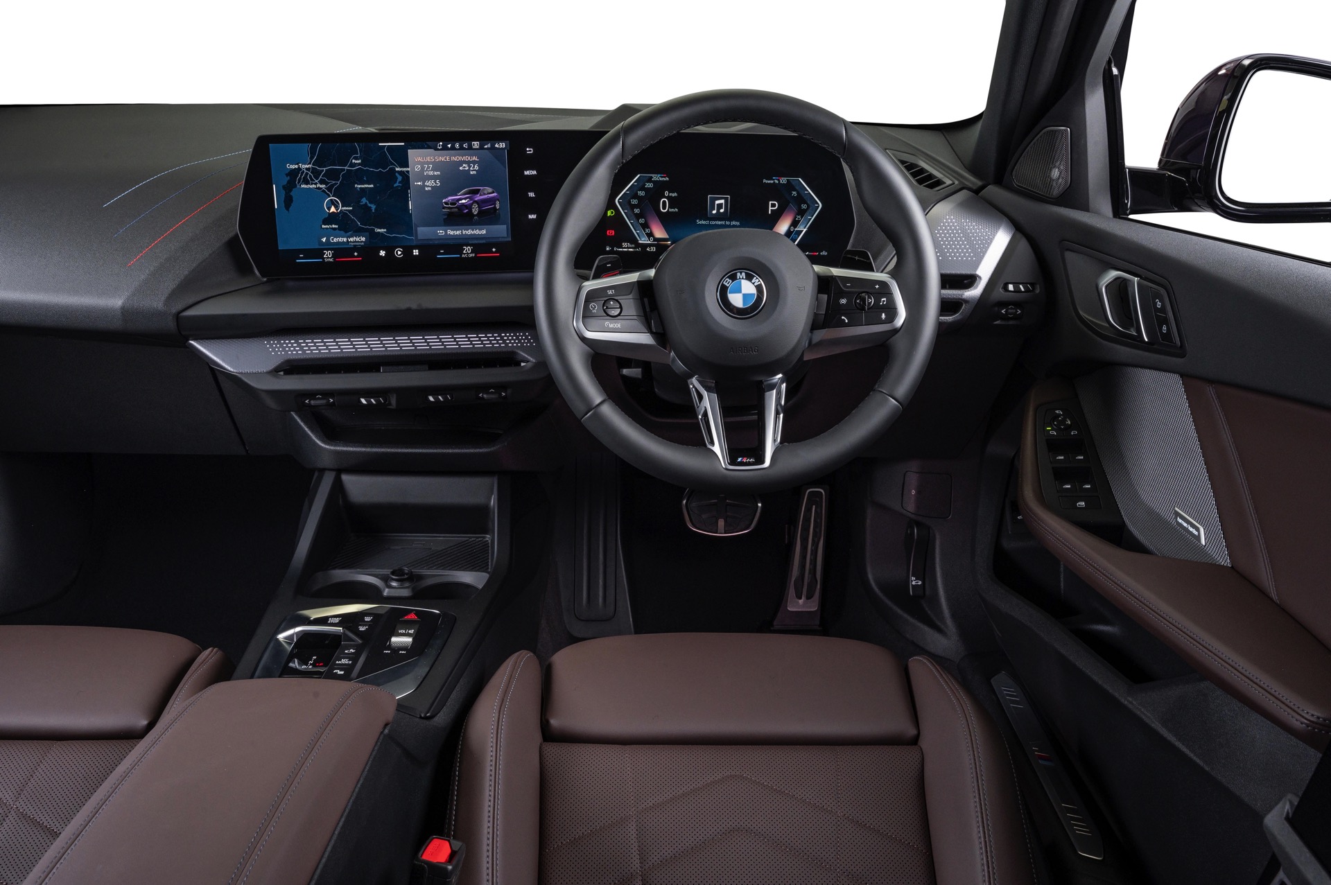 Im Innenraum des gezeigten F70 sehen wir die Interieur-Ausstattung Veganza perforiert im warmen Farbton Mokka. Dass es sich für den südafrikanischen Markt mit seinem Linksverkehr um einen Rechtslenker mit gespiegeltem Interieur handelt, versteht sich von selbst.