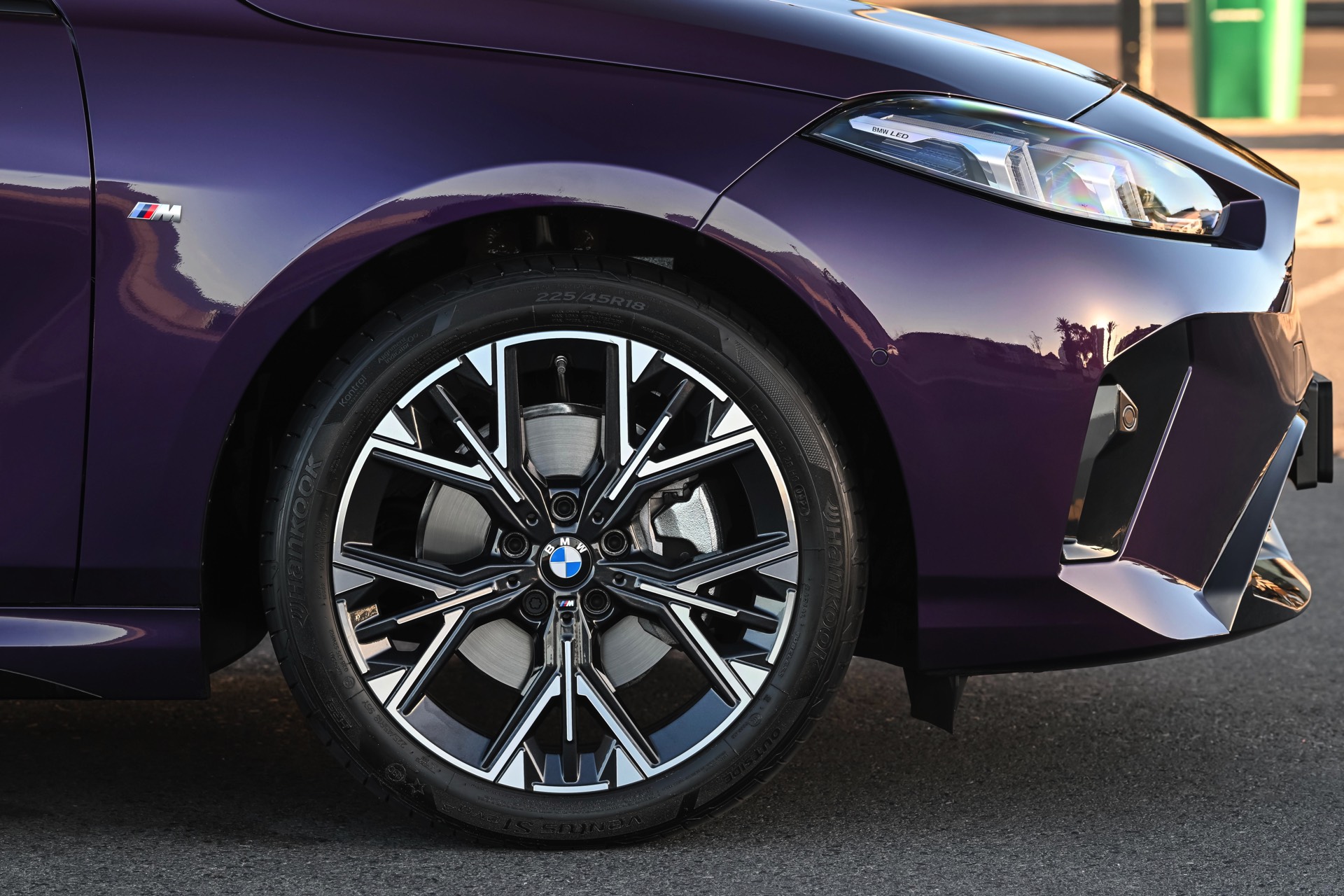Zu den wenigen Ausnahmen von den Oberflächen in Thundernight Metallic oder Hochglanzschwarz stellen lediglich der 118-Schriftzug und die glanzgedrehten Flächen der 18 Zoll großen Leichtmetallräder Y-Speiche 975 M Bicolor dar. Letztere zählen zum Standardumfang des M Sportpakets, sind aber für 950 Euro Aufpreis auch ab Werk mit den Hankook-Sportreifen Ventus S1 evo3 bestellbar. Während bei uns hinter den Felgen eines 1er mit M Sport Pro-Pakets mindestens die Sättel der M Sportbremse zu sehen wären, trägt der BMW 118 aus Südafrika “nur” die aus fahrdynamischer Sicht weniger standhafte Serien-Bremse.