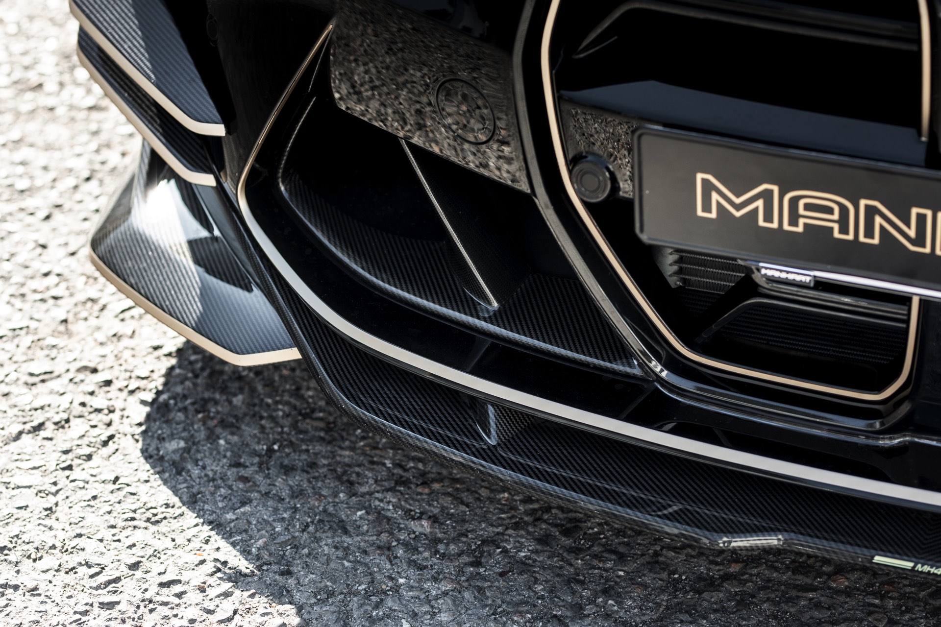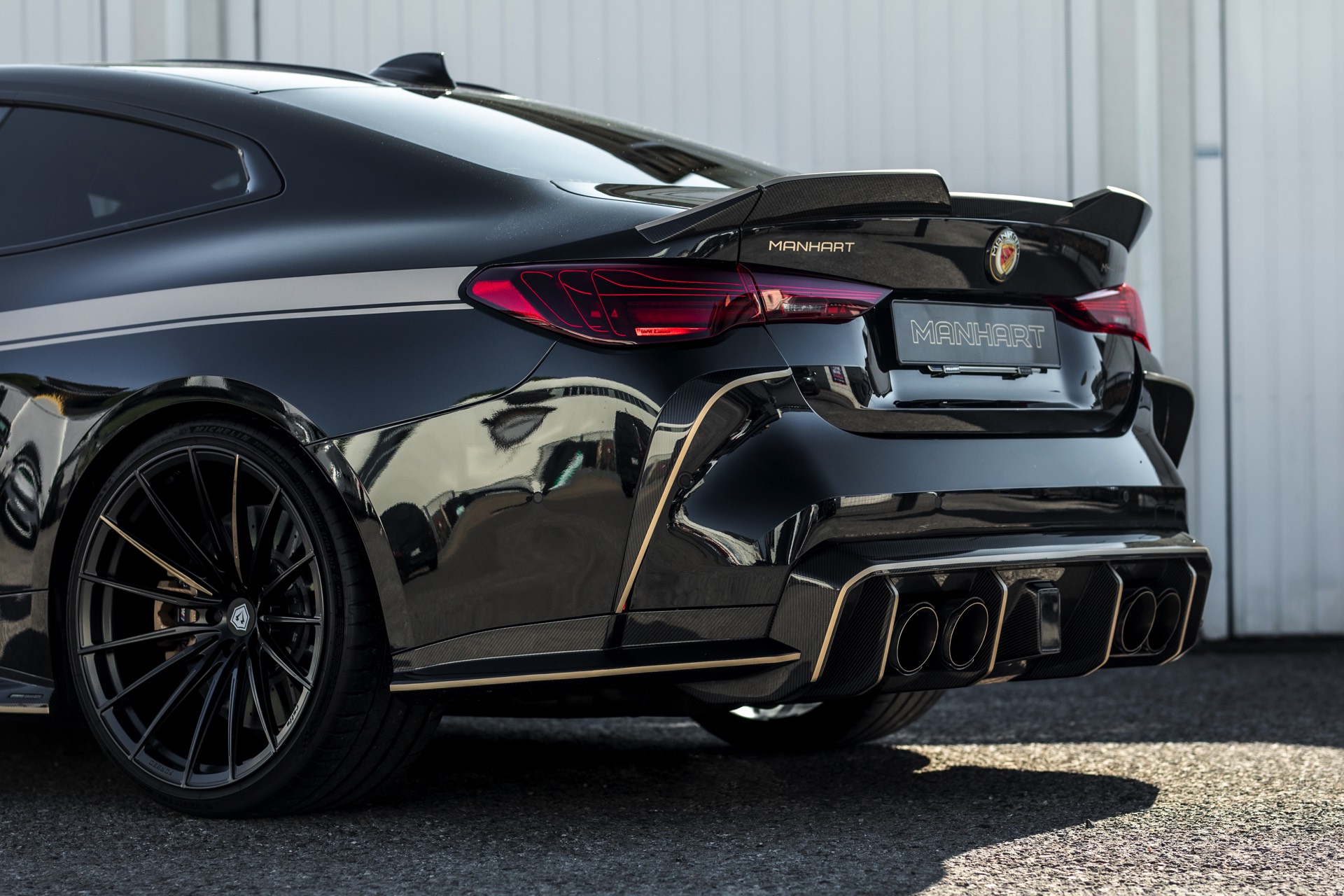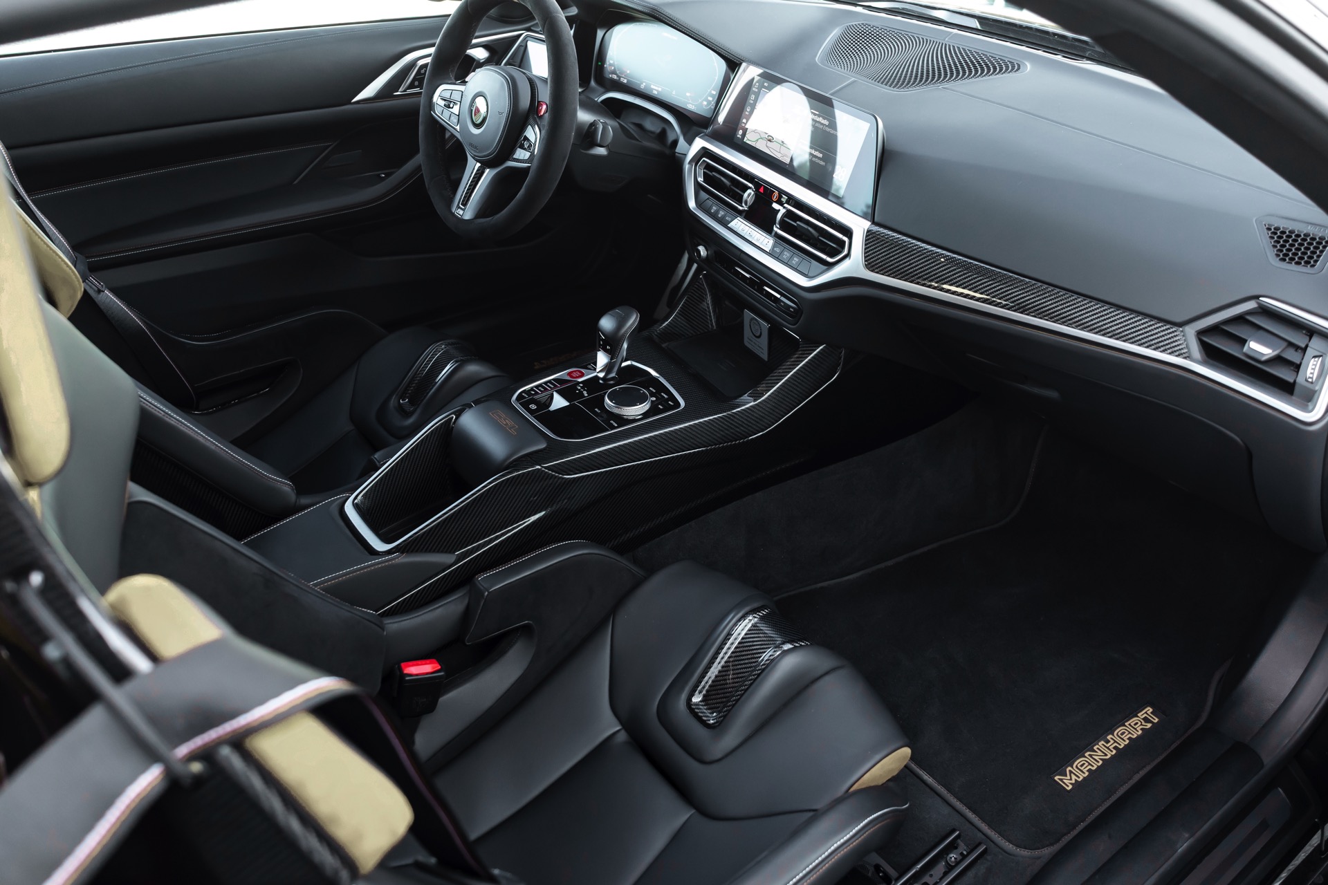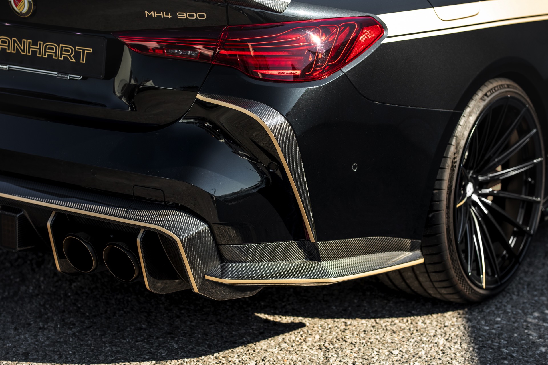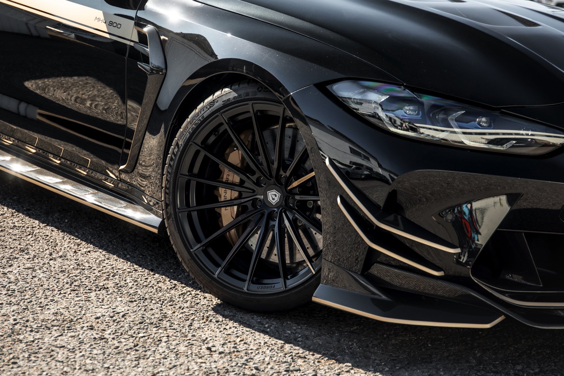 Passend zur enormen Kraft wurde auch die Optik des MH4 900 deutlich nachgeschärft: Der BMW M4 (G82) kombiniert seine schwarze Lackierung mit einem Carbon-Bodykit, das diverse Anbauteilen aus Sicht-Carbon umfasst. Dazu gibt es eine Dekor-Beklebung im Farbton Champagner und natürlich einen Satz Tuning-Felgen: Die vorne 20 und hinten sogar 21 Zoll großen Felgen von Raffa kommen in Frozen Black und werden dank eines H&R Gewindefahrwerks mit Manhart-Abstimmung und dezenter Tieferlegung perfekt in Szene gesetzt. Weiter im Werkszustand befindet sich die dahinter erkennbare Carbon-Keramik-Bremsanlage, die auf Wunsch für alle BMW M4 erhältlich ist.