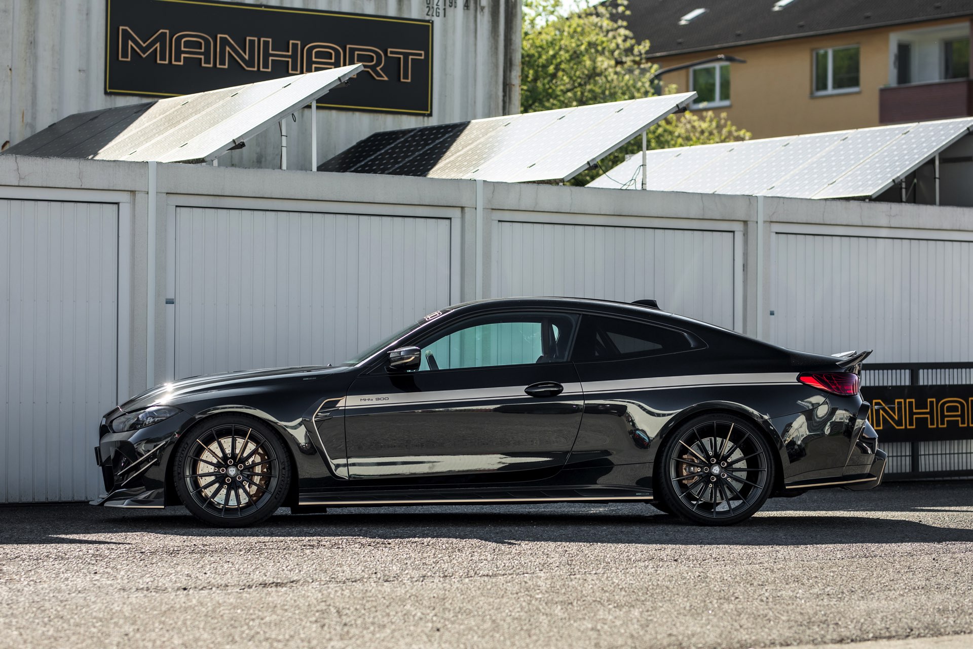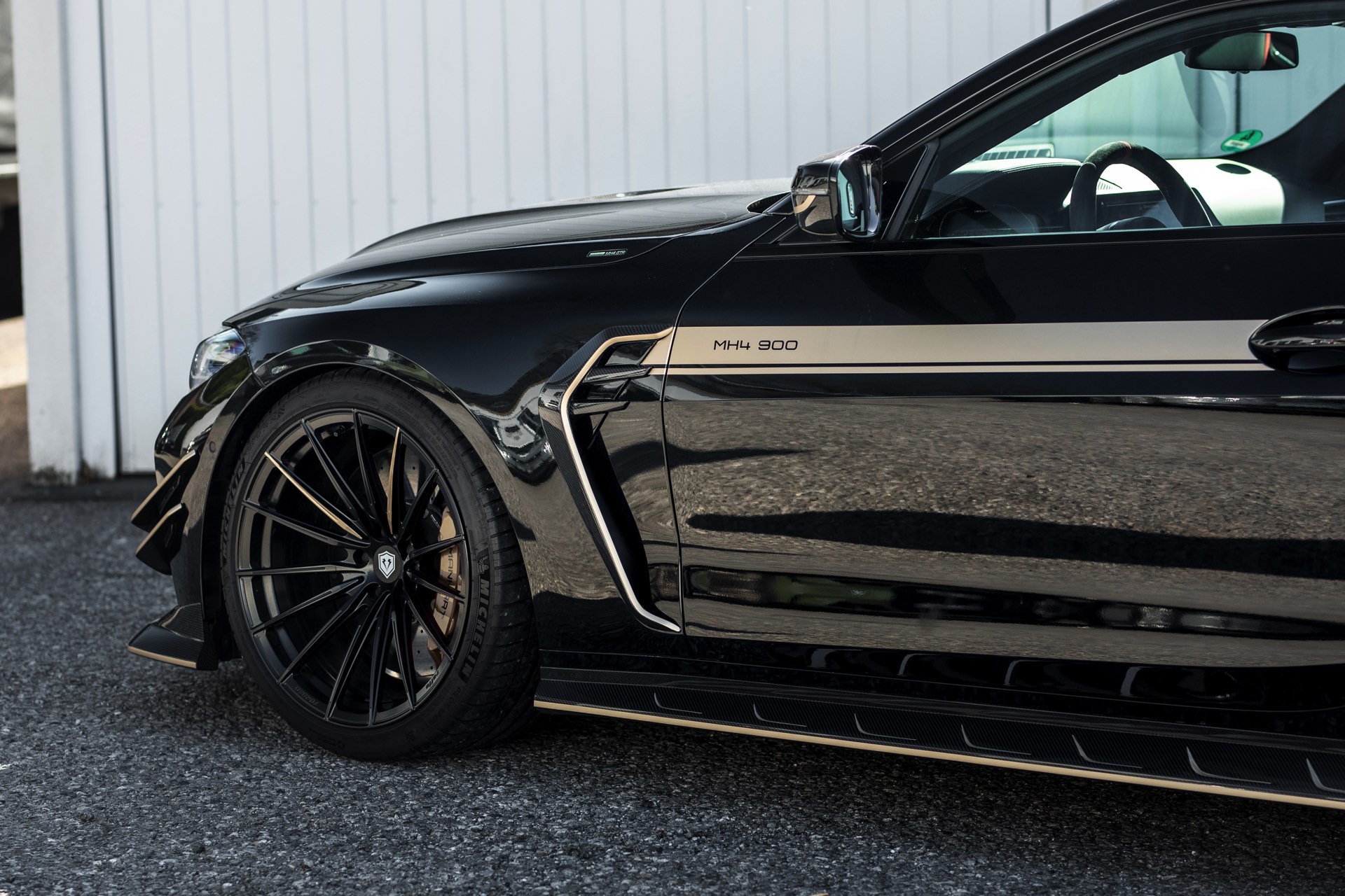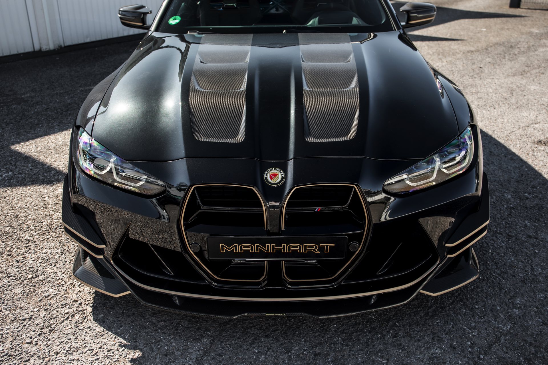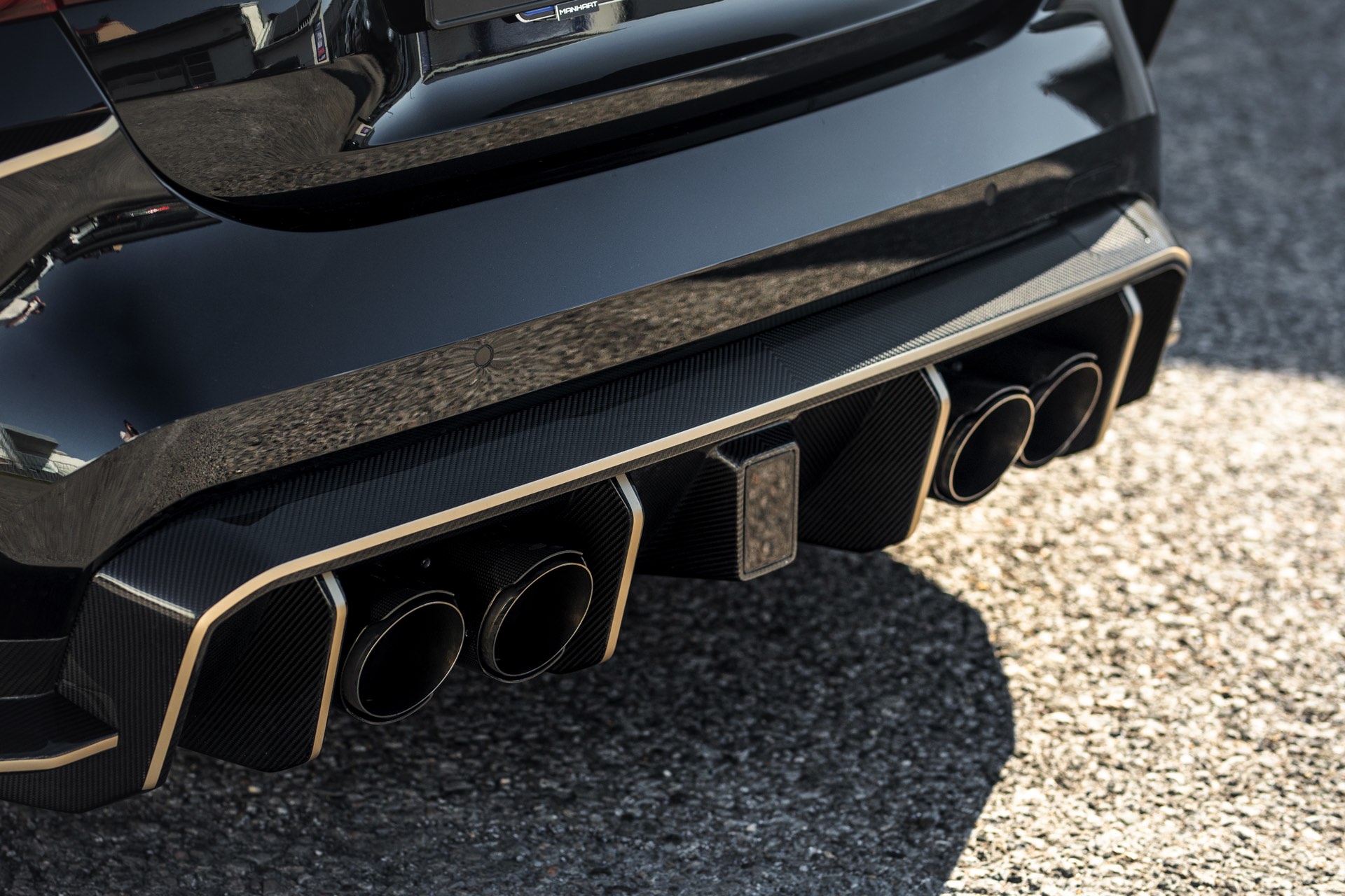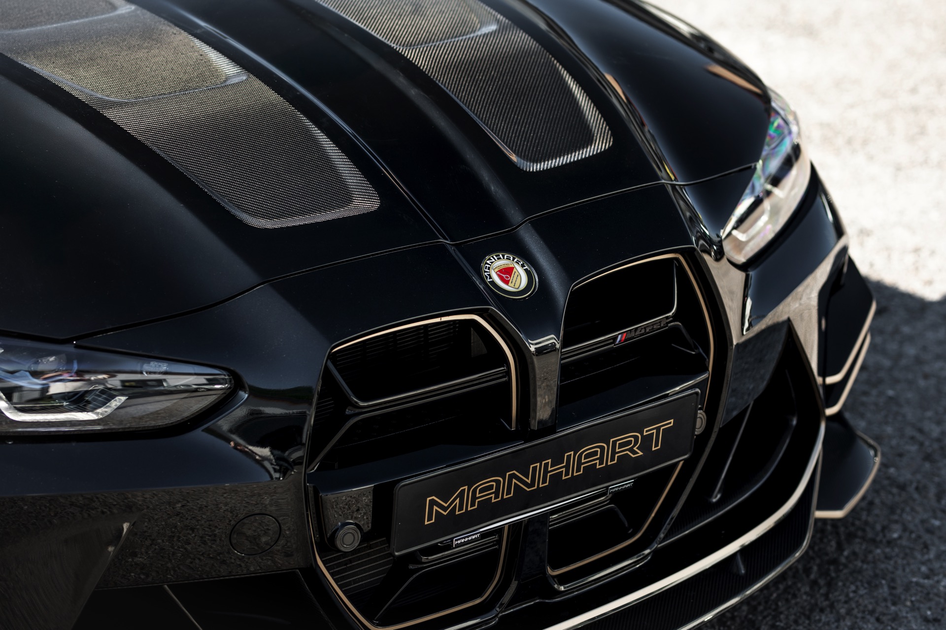 Passend zur enormen Kraft wurde auch die Optik des MH4 900 deutlich nachgeschärft: Der BMW M4 (G82) kombiniert seine schwarze Lackierung mit einem Carbon-Bodykit, das diverse Anbauteilen aus Sicht-Carbon umfasst. Dazu gibt es eine Dekor-Beklebung im Farbton Champagner und natürlich einen Satz Tuning-Felgen: Die vorne 20 und hinten sogar 21 Zoll großen Felgen von Raffa kommen in Frozen Black und werden dank eines H&R Gewindefahrwerks mit Manhart-Abstimmung und dezenter Tieferlegung perfekt in Szene gesetzt. Weiter im Werkszustand befindet sich die dahinter erkennbare Carbon-Keramik-Bremsanlage, die auf Wunsch für alle BMW M4 erhältlich ist.