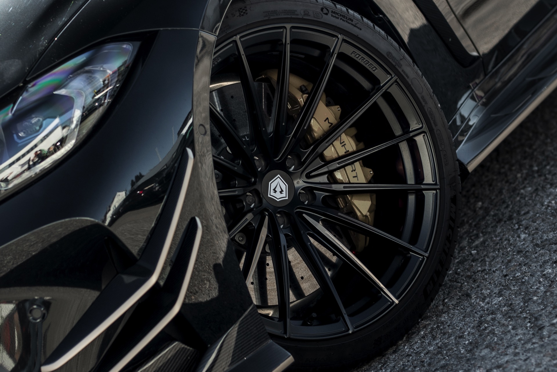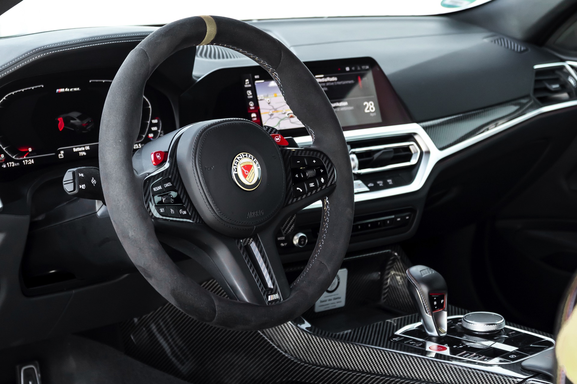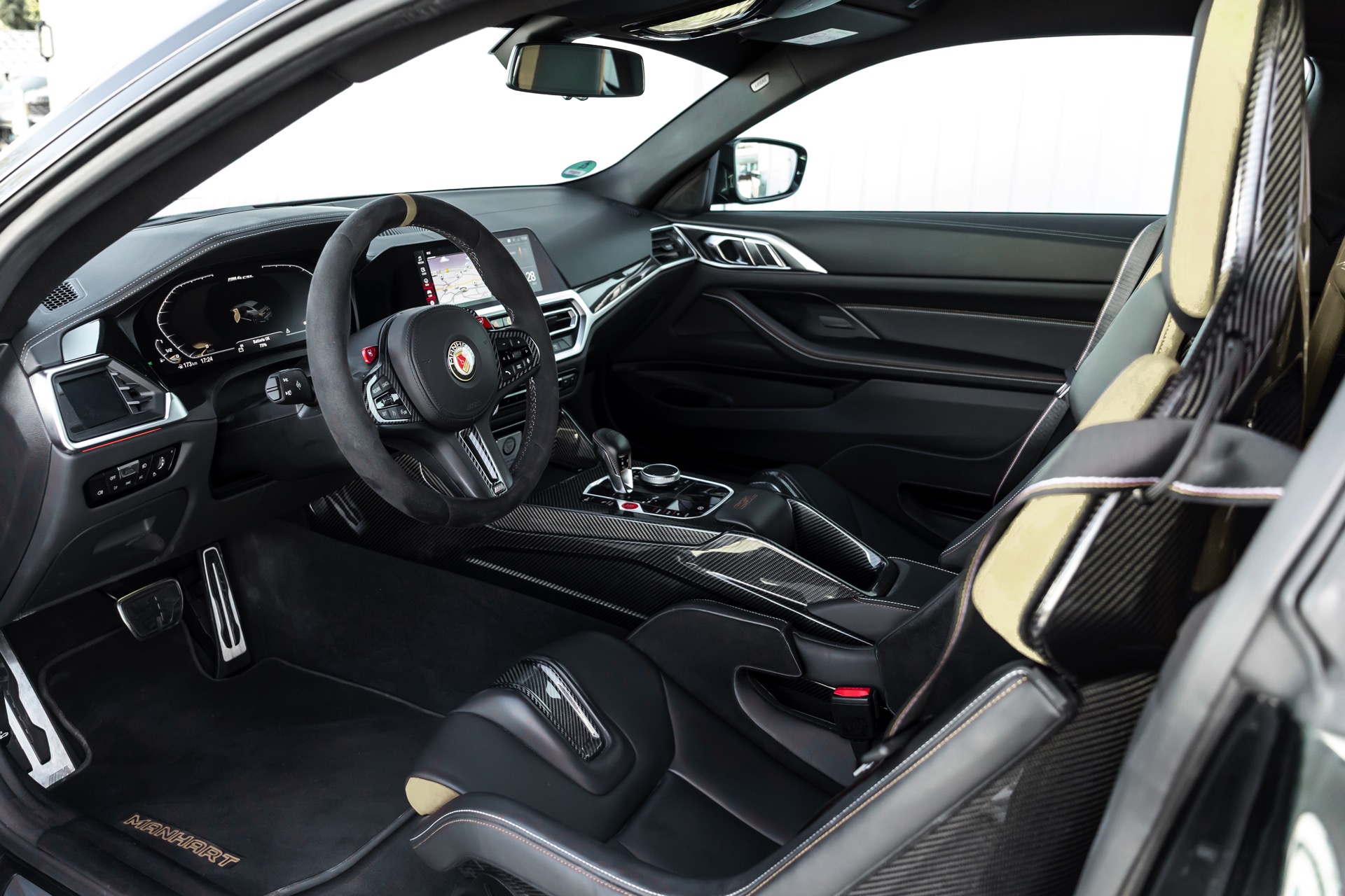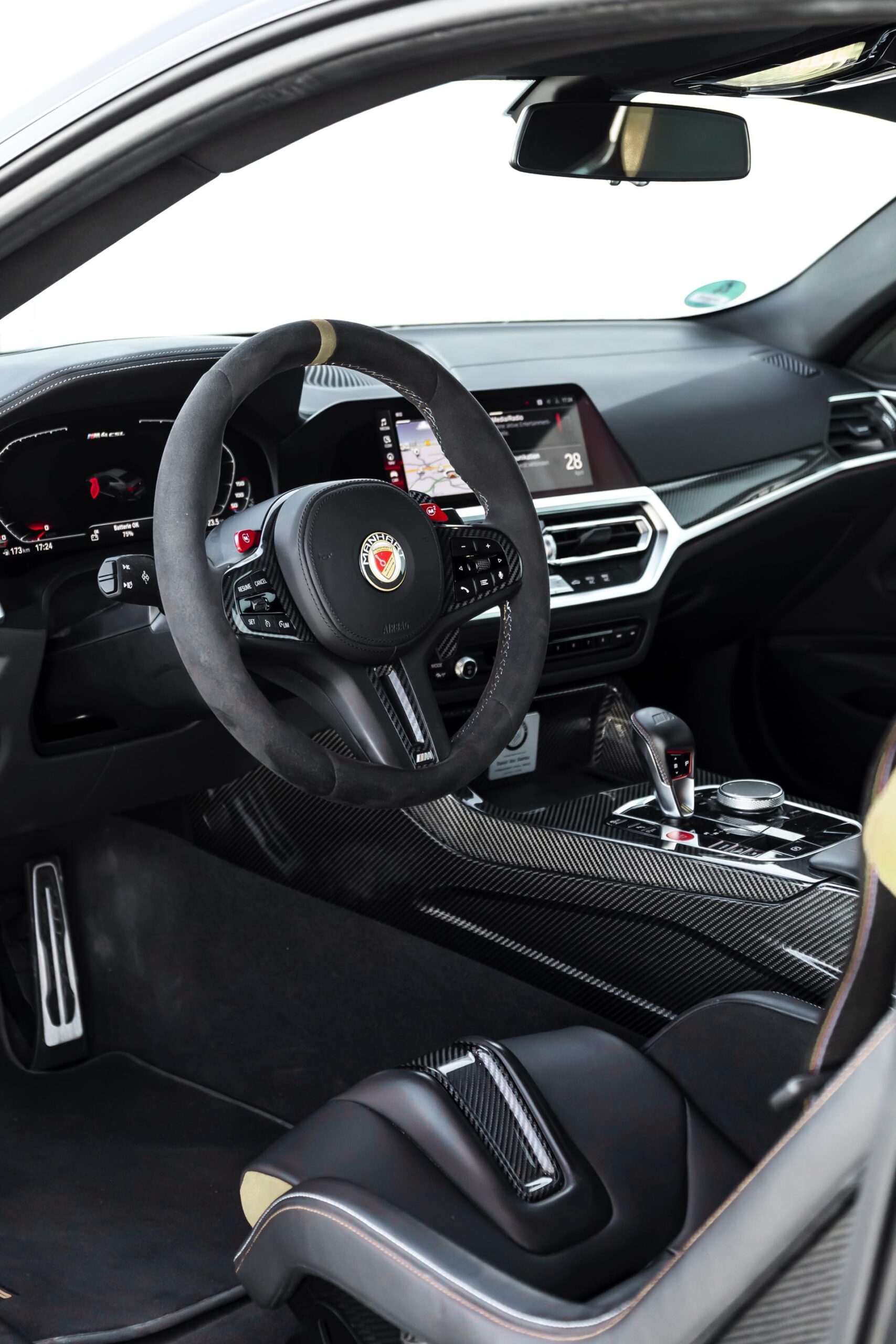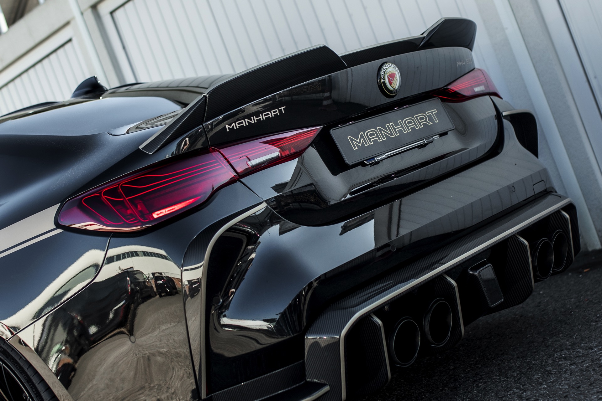 Passend zur enormen Kraft wurde auch die Optik des MH4 900 deutlich nachgeschärft: Der BMW M4 (G82) kombiniert seine schwarze Lackierung mit einem Carbon-Bodykit, das diverse Anbauteilen aus Sicht-Carbon umfasst. Dazu gibt es eine Dekor-Beklebung im Farbton Champagner und natürlich einen Satz Tuning-Felgen: Die vorne 20 und hinten sogar 21 Zoll großen Felgen von Raffa kommen in Frozen Black und werden dank eines H&R Gewindefahrwerks mit Manhart-Abstimmung und dezenter Tieferlegung perfekt in Szene gesetzt. Weiter im Werkszustand befindet sich die dahinter erkennbare Carbon-Keramik-Bremsanlage, die auf Wunsch für alle BMW M4 erhältlich ist.