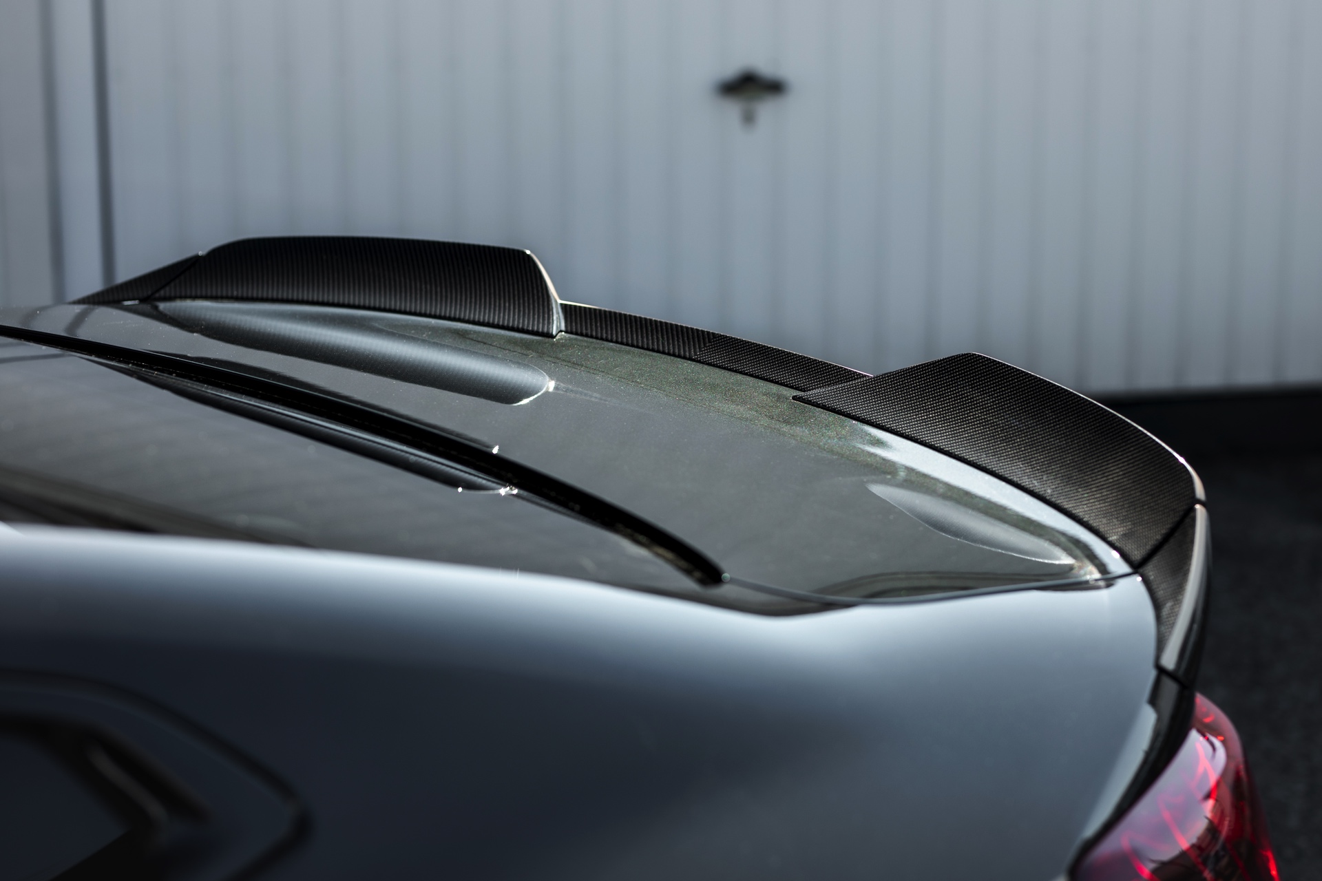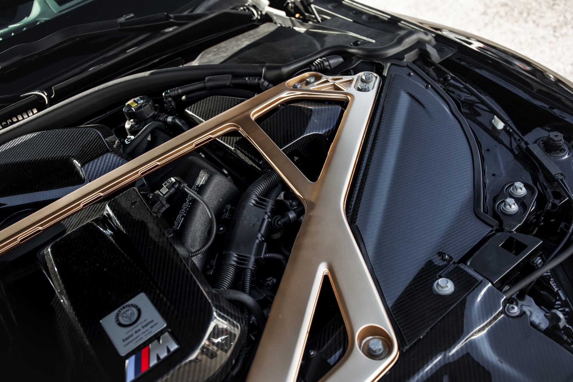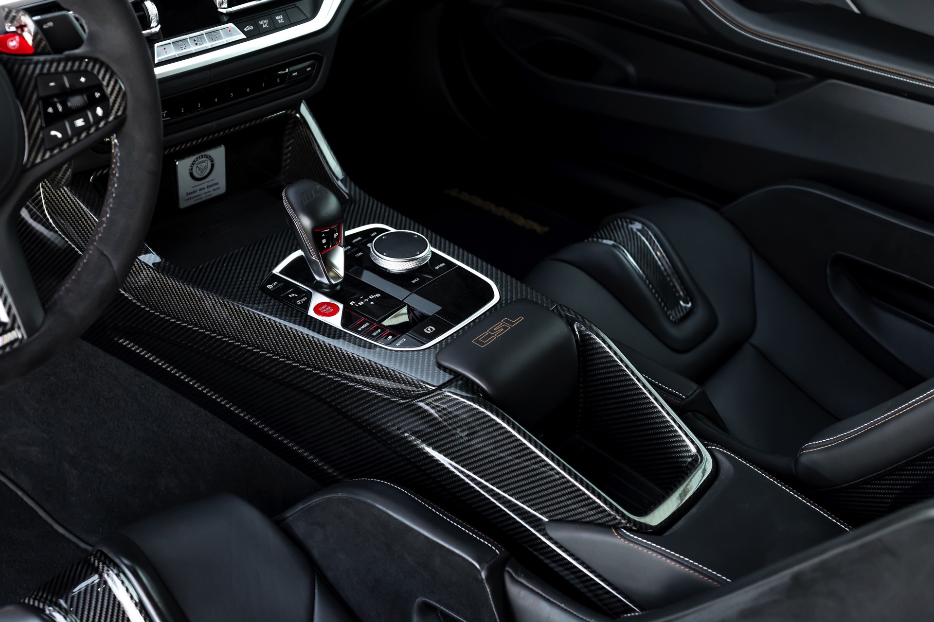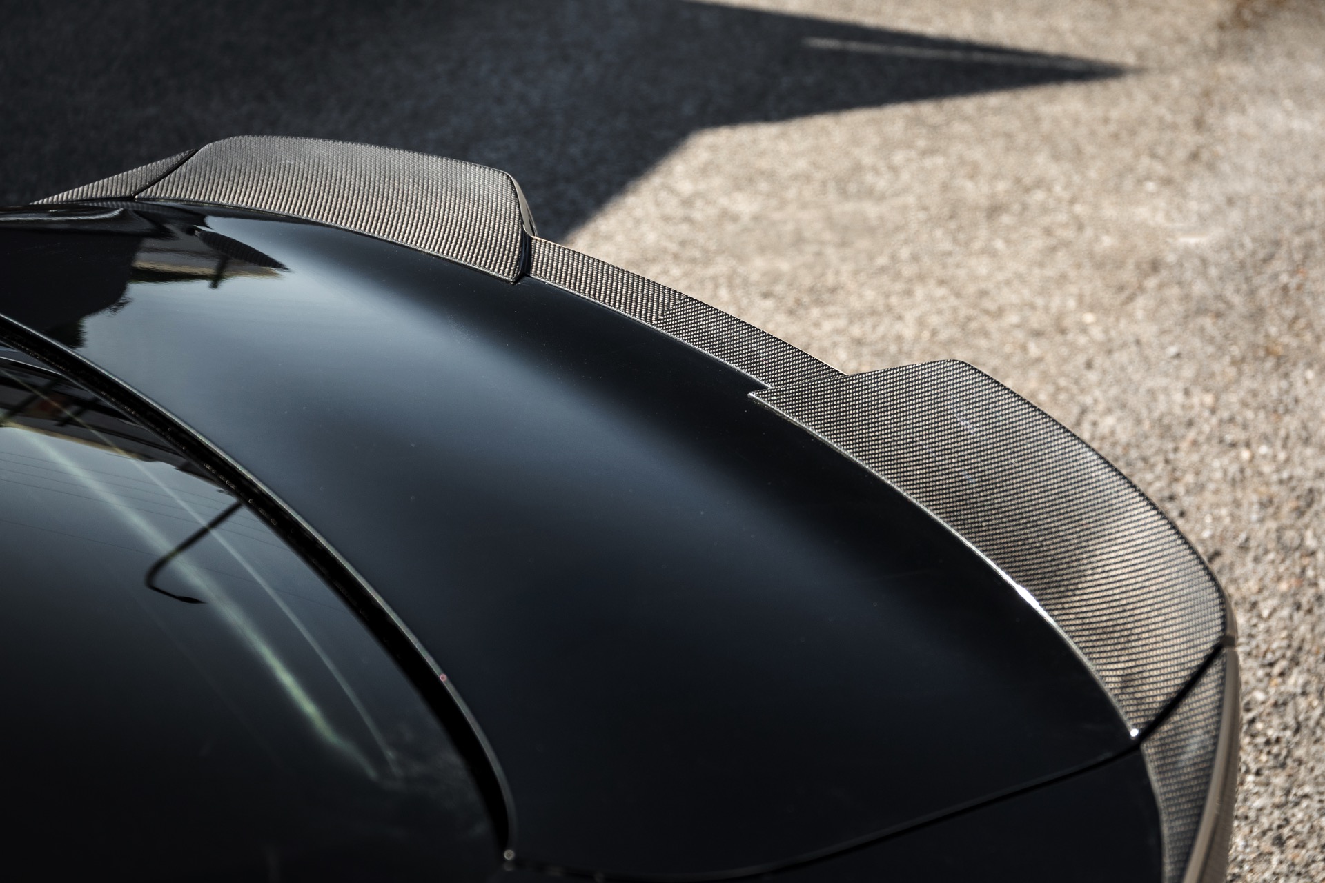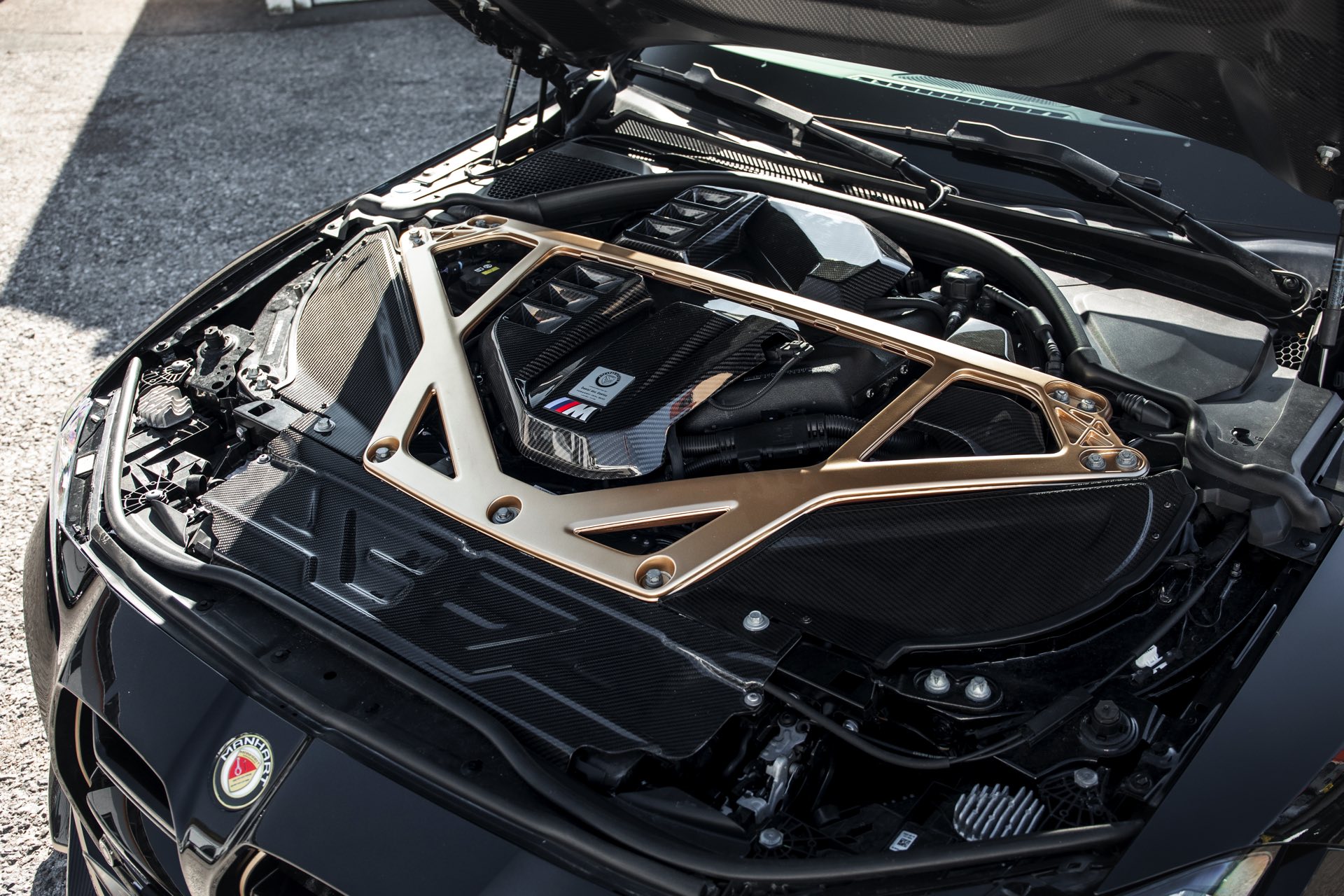 Passend zur enormen Kraft wurde auch die Optik des MH4 900 deutlich nachgeschärft: Der BMW M4 (G82) kombiniert seine schwarze Lackierung mit einem Carbon-Bodykit, das diverse Anbauteilen aus Sicht-Carbon umfasst. Dazu gibt es eine Dekor-Beklebung im Farbton Champagner und natürlich einen Satz Tuning-Felgen: Die vorne 20 und hinten sogar 21 Zoll großen Felgen von Raffa kommen in Frozen Black und werden dank eines H&R Gewindefahrwerks mit Manhart-Abstimmung und dezenter Tieferlegung perfekt in Szene gesetzt. Weiter im Werkszustand befindet sich die dahinter erkennbare Carbon-Keramik-Bremsanlage, die auf Wunsch für alle BMW M4 erhältlich ist.