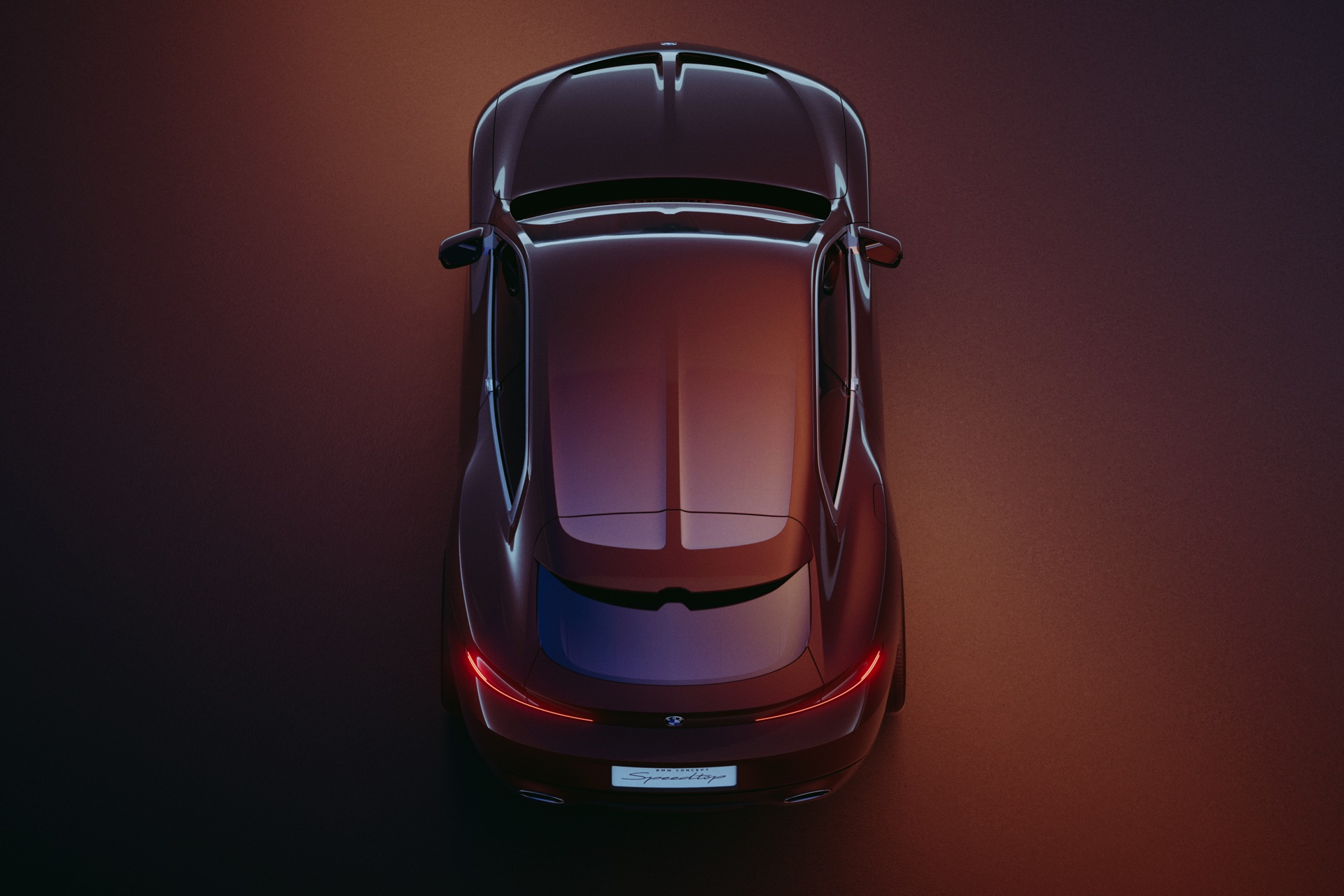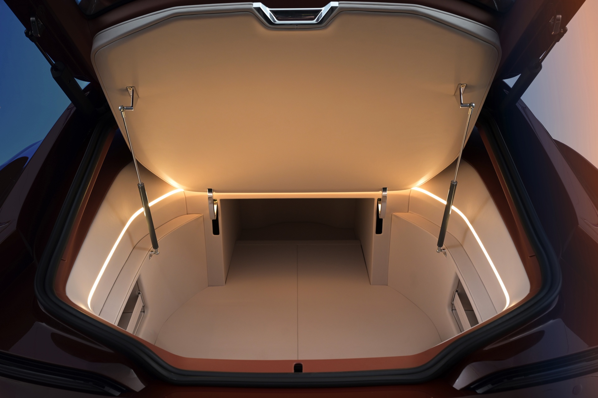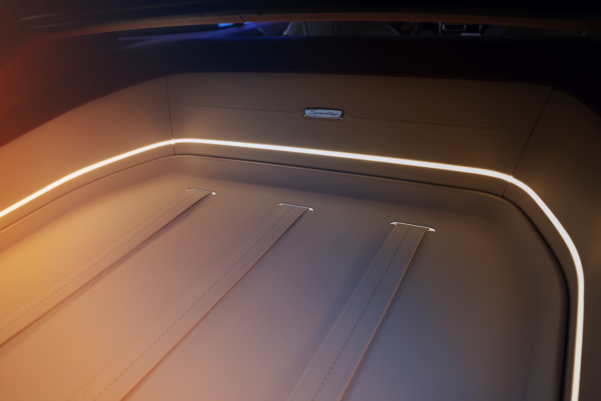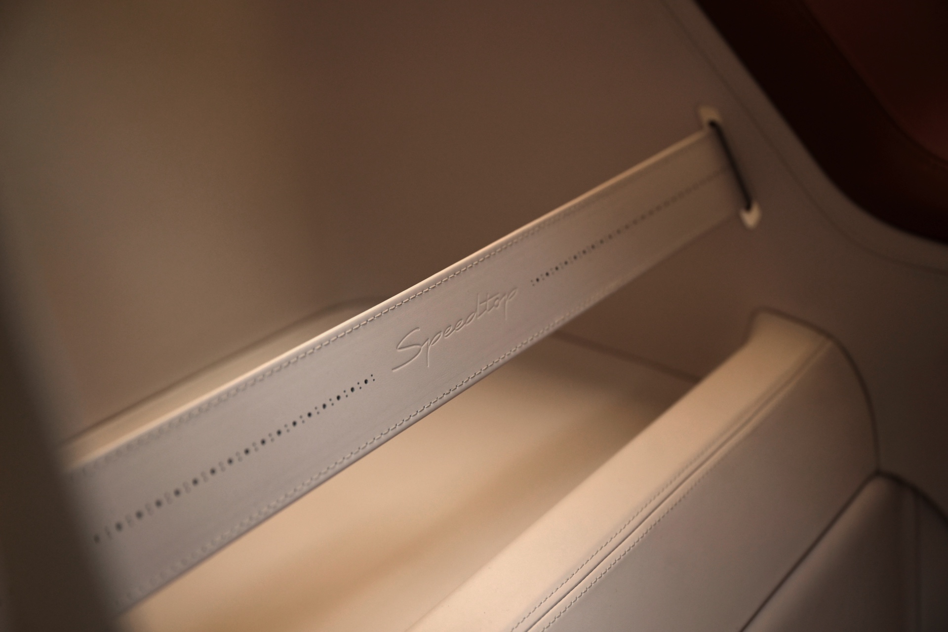 Das zentrale Zierelement auf dem Heck des Skytop wird am Dach des Speedtop zitiert und wer glaubt, dass ein derart eleganter Kombi sicher nicht viel Platz haben würde, wird hinter der elektrisch öffnenden Heckklappe eines Besseren belehrt: Unterhalb einer Abdeckung findet sich ein durchaus großzügiger Gepäckraum, in dem wahlweise ein Golfbag oder genügend Gepäck für einen Ausflug zu zweit Platz findet.