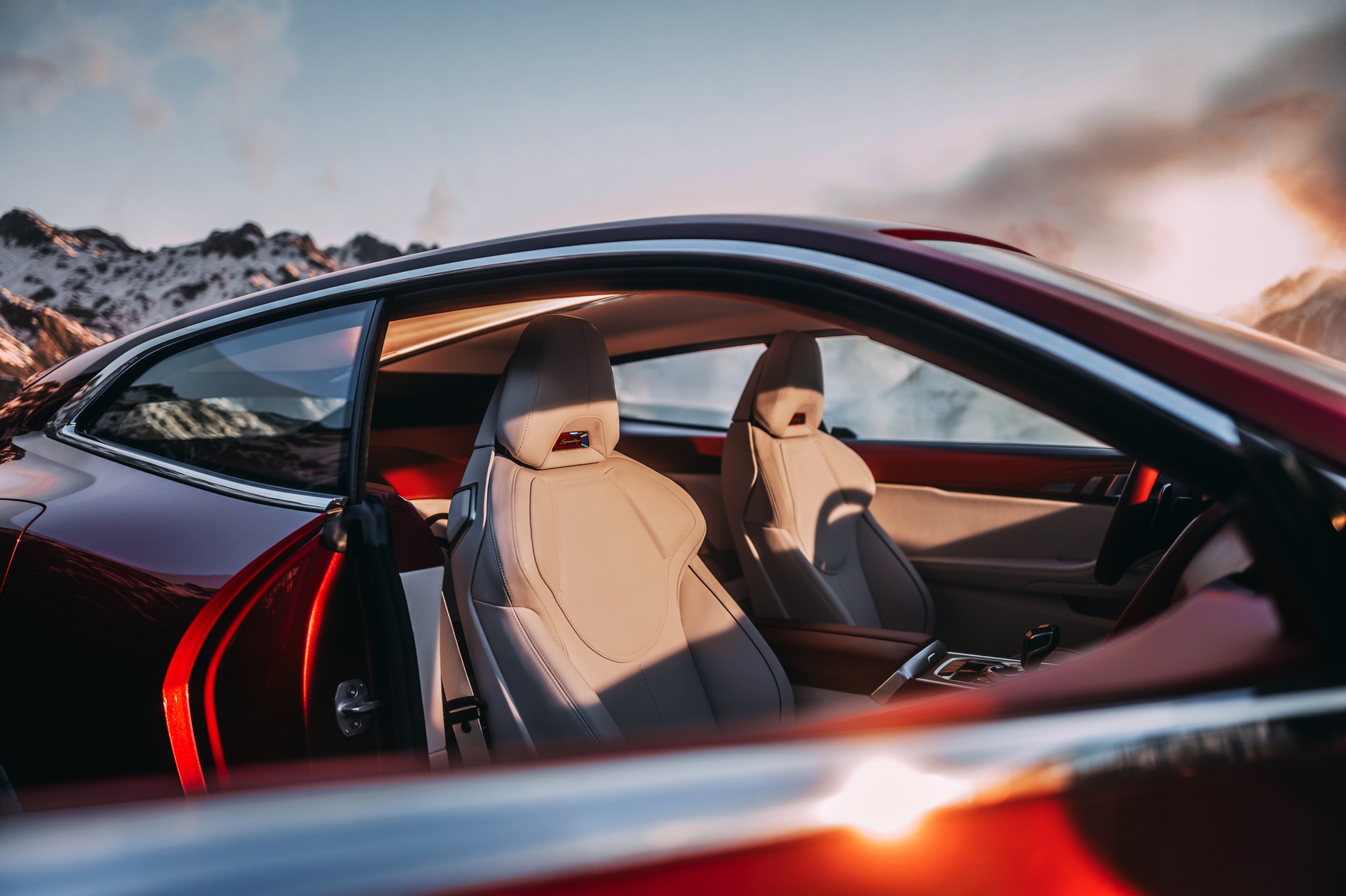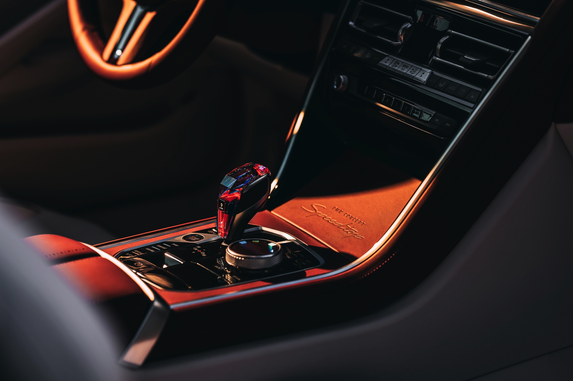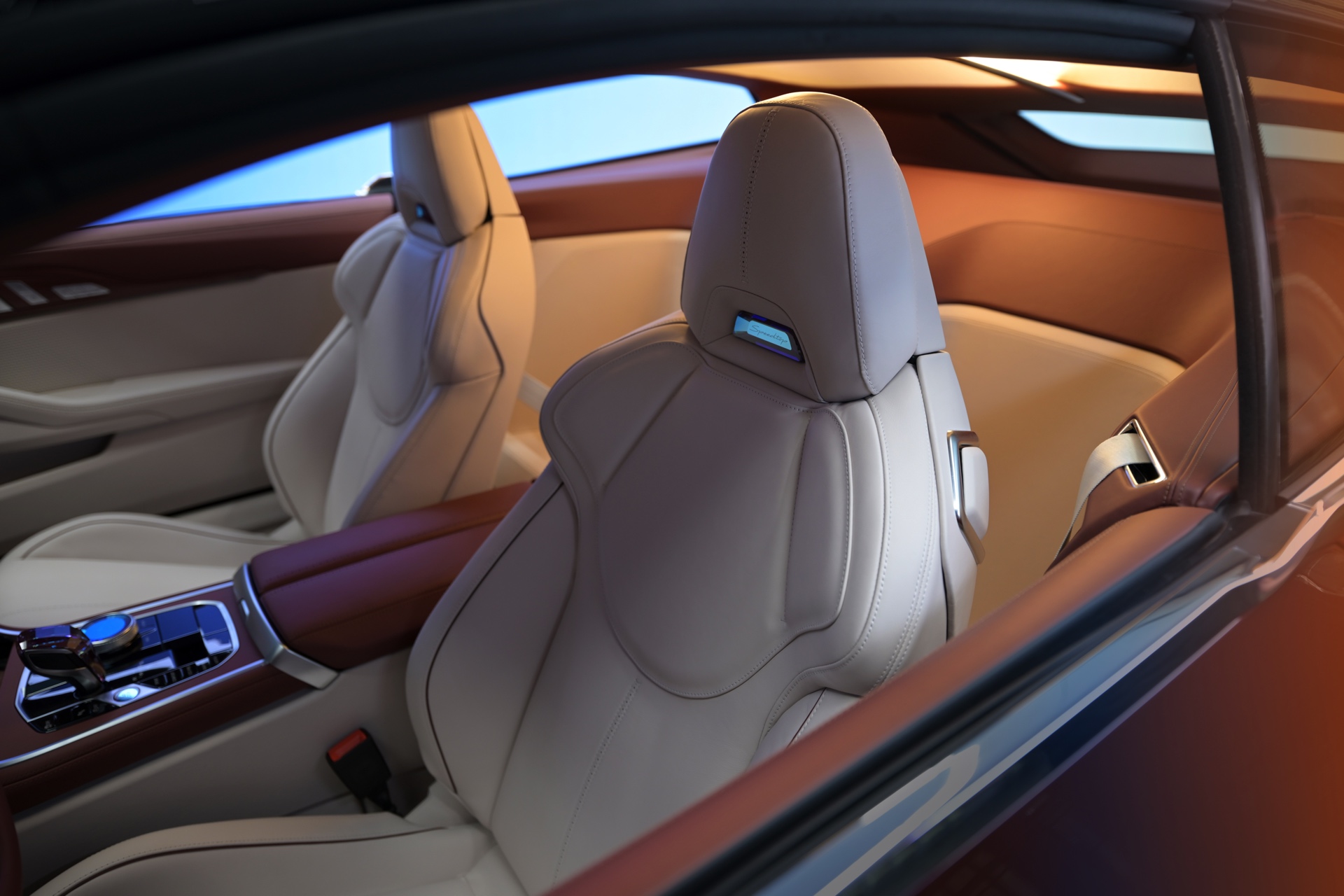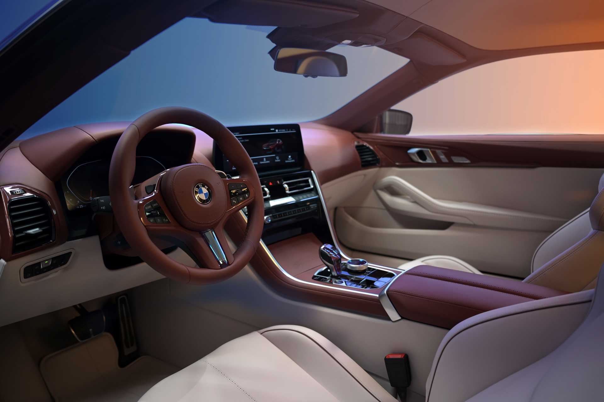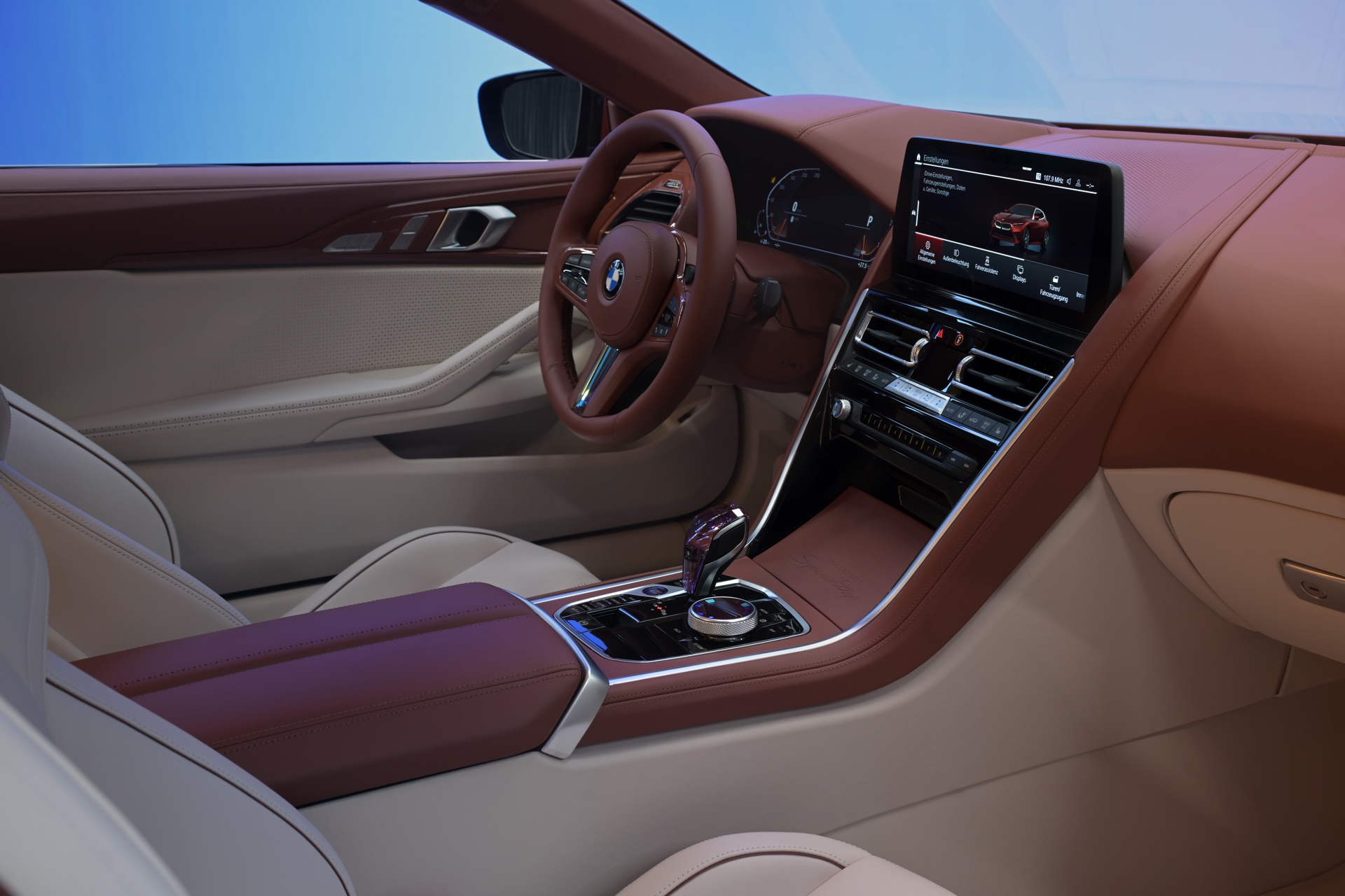 Anleihen an den BMW Skytop finden sich auch im Innenraum, dessen mit einer Bicolor-Lederausstattung in den Farben Sundown Maroon und Moonstone White veredeltes Cockpit eng an den 8er angelehnt ist. Hinter den Vordersitzen mit Details im Budapester-Stil findet sich jedoch keine Rückbank, sondern zwei Stellplätze für exklusive Gepäckstücke in passenden Farben.