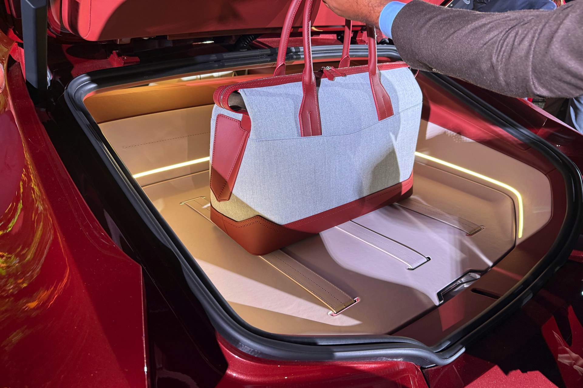 Unsere Live-Fotos vom Innenraum zeigen neben vielen Oberflächen mit Budapester Steppung auch die Bicolor-Lederausstattung. Der Kofferraum ist zwar auf den ersten Blick alles andere als üppig, aber unter der Abdeckung verbirgt sich tatsächlich noch ein zweites großes Abteil. Hier passt unter anderem ein Golfbag hinein – oder eben Gepäckstücke, dank derer sich auch ohne größere Umstände Reisen zu zweit realisieren lassen. Zu den schick umgesetzten Details gehört auch das angepasste Infotainment-System, das den Speedtop auch in einer digitalen Variante zeigt.