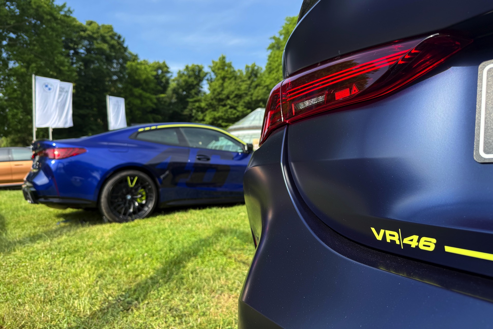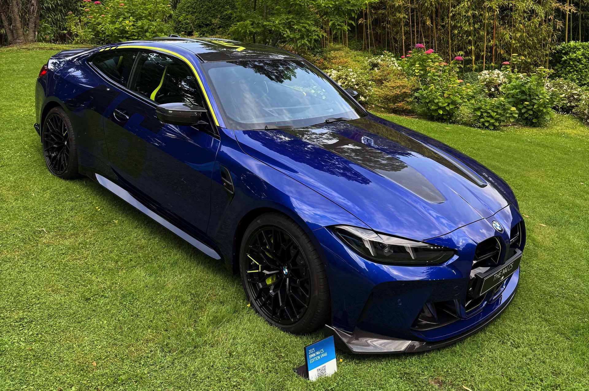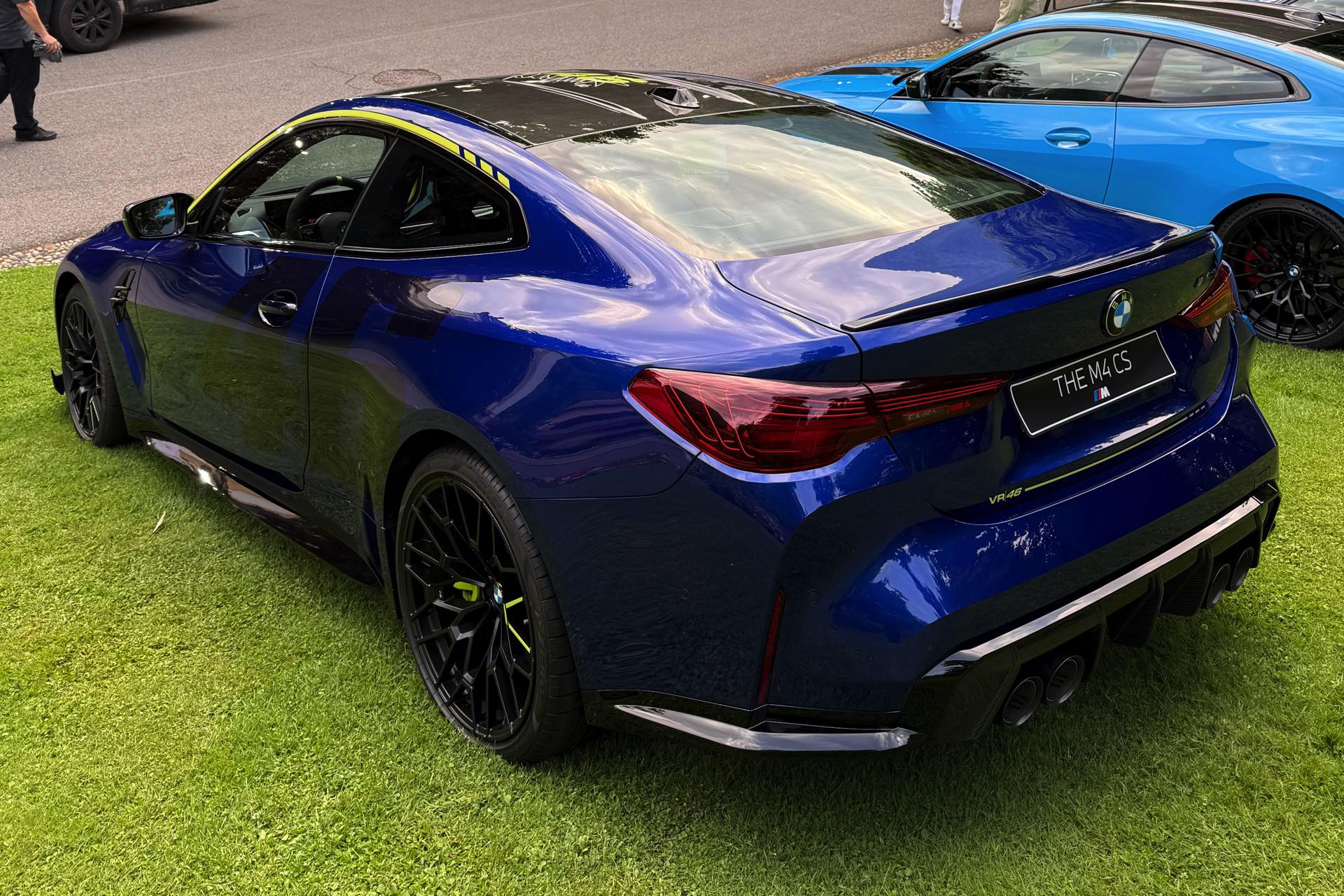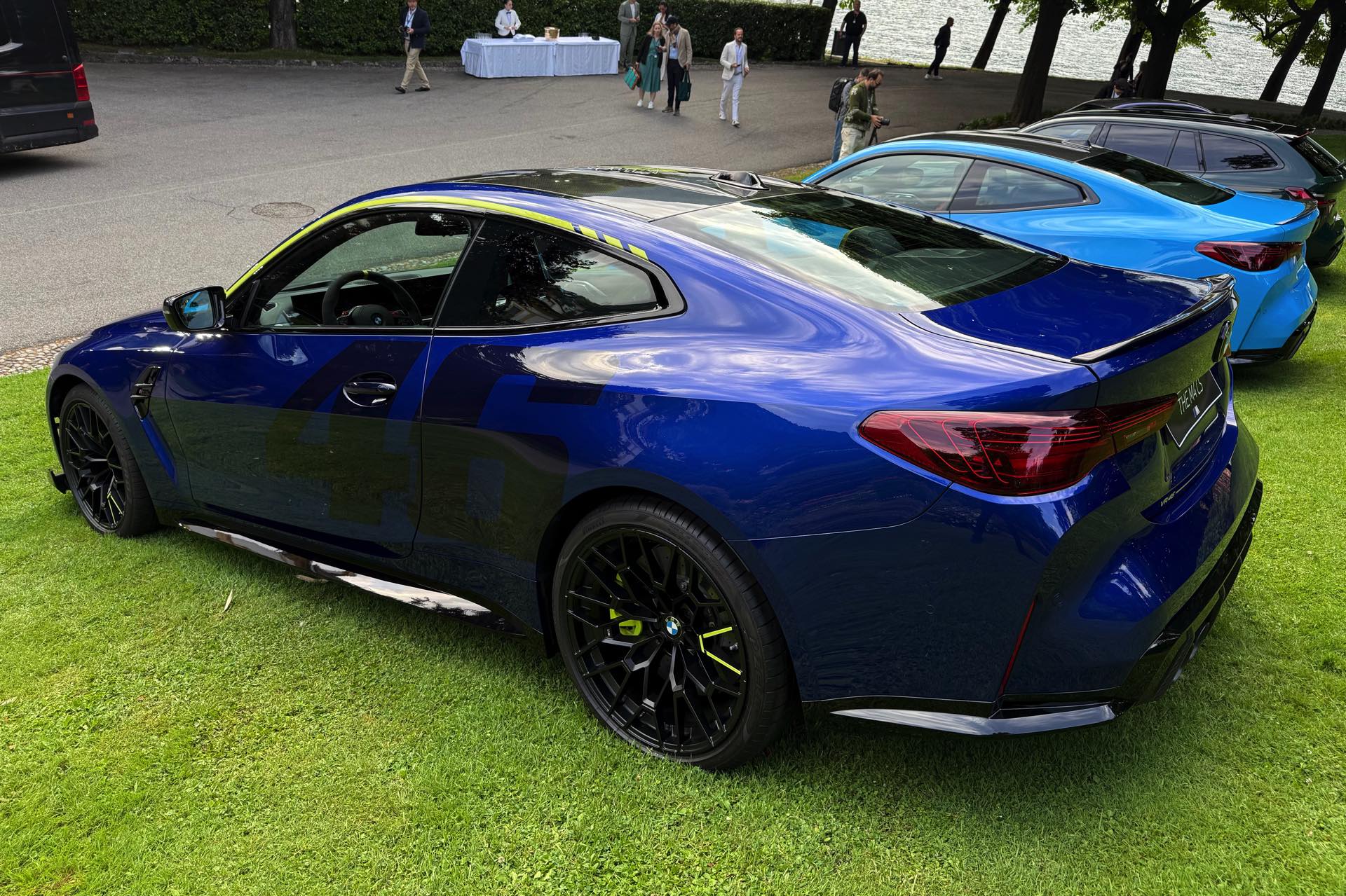 Die zunächst im Alleingang auf dem Gelände der nahen Villa Erba präsentierte Edition Style des BMW M4 CS VR46 erhielt im Lauf des Wochenendes Gesellschaft von ihrem Schwestermodell, konnte aber auch schon im Alleingang überzeugen: Mit ihrer matten Lackierung in Frozen Tanzanite Blue sticht sie selbst im Umfeld des Concorso d’Eleganza Villa d’Este mühelos aus der Masse heraus, dazu kommen einige Details im typischen Neongelb von Valentino Rossi – angefangen von der Nieren-Einfassung über einen Zierstreifen am Fuß der Heckklappe bis hin zu einem stilisierten V auf den Felgen und sogar den Bremssätteln.