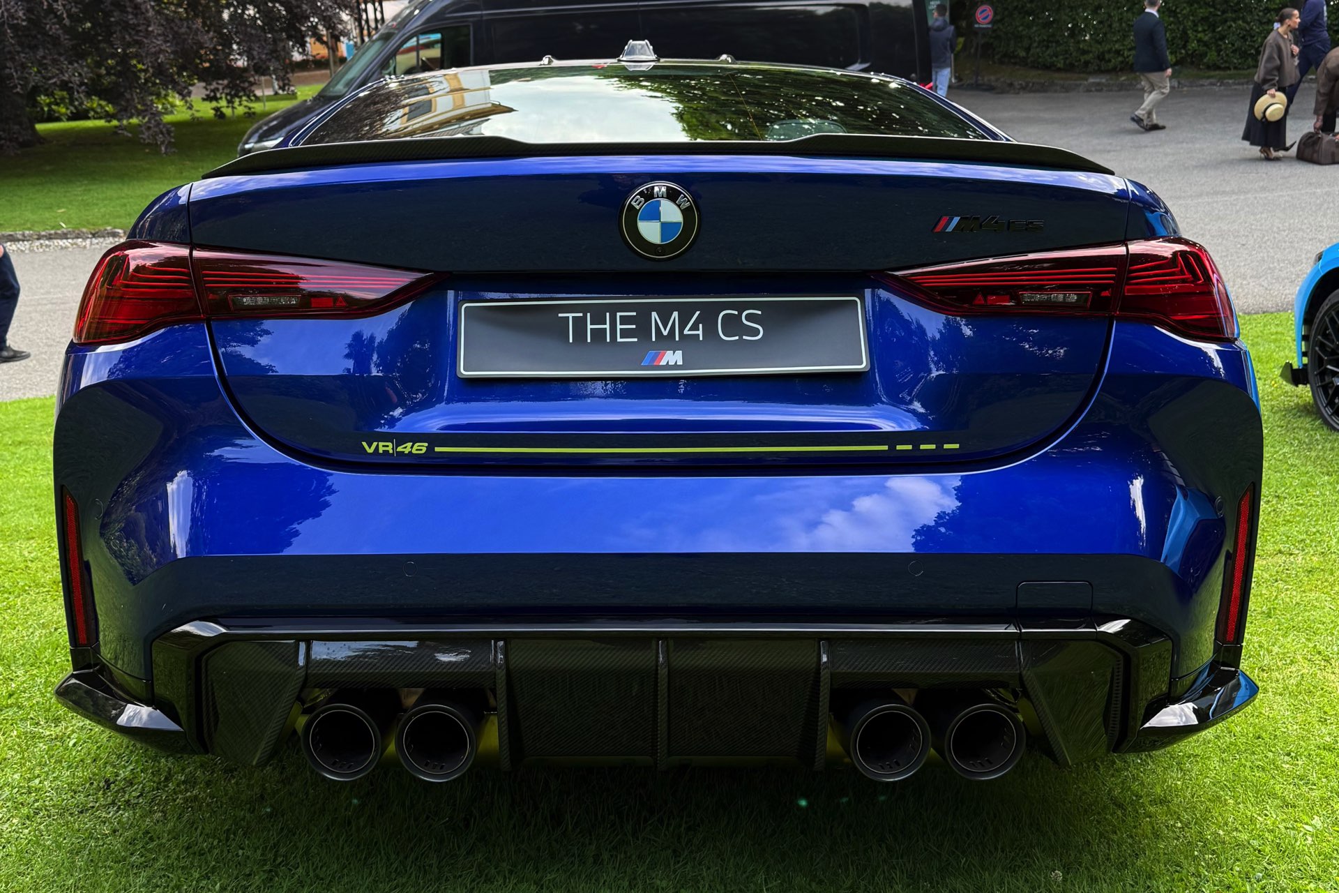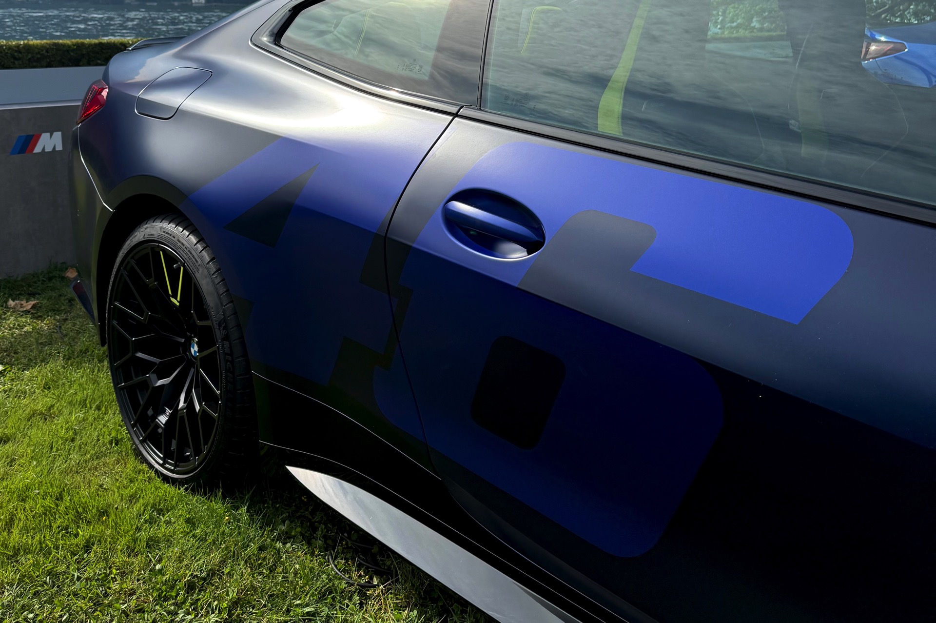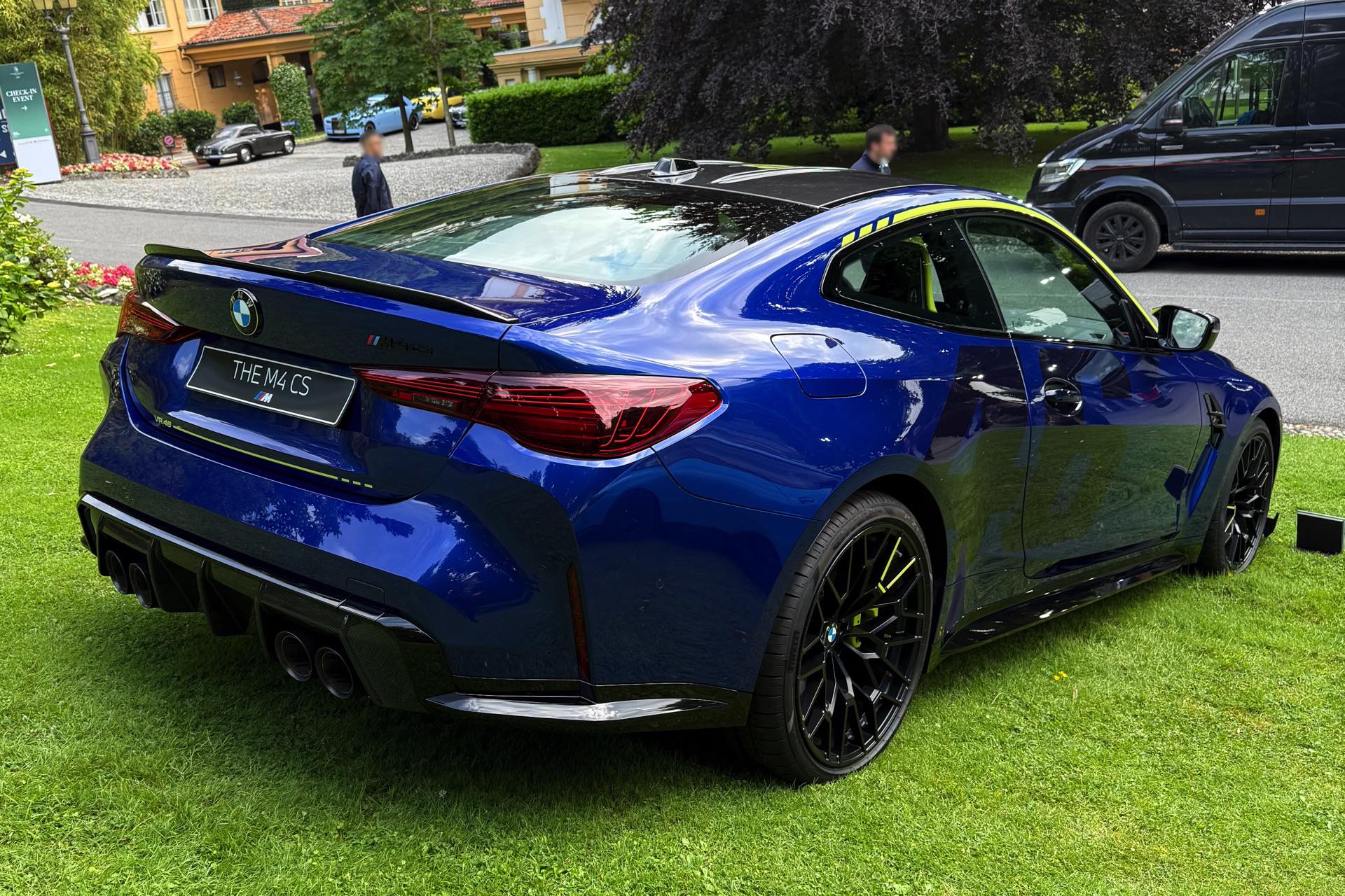 Die zunächst im Alleingang auf dem Gelände der nahen Villa Erba präsentierte Edition Style des BMW M4 CS VR46 erhielt im Lauf des Wochenendes Gesellschaft von ihrem Schwestermodell, konnte aber auch schon im Alleingang überzeugen: Mit ihrer matten Lackierung in Frozen Tanzanite Blue sticht sie selbst im Umfeld des Concorso d’Eleganza Villa d’Este mühelos aus der Masse heraus, dazu kommen einige Details im typischen Neongelb von Valentino Rossi – angefangen von der Nieren-Einfassung über einen Zierstreifen am Fuß der Heckklappe bis hin zu einem stilisierten V auf den Felgen und sogar den Bremssätteln.