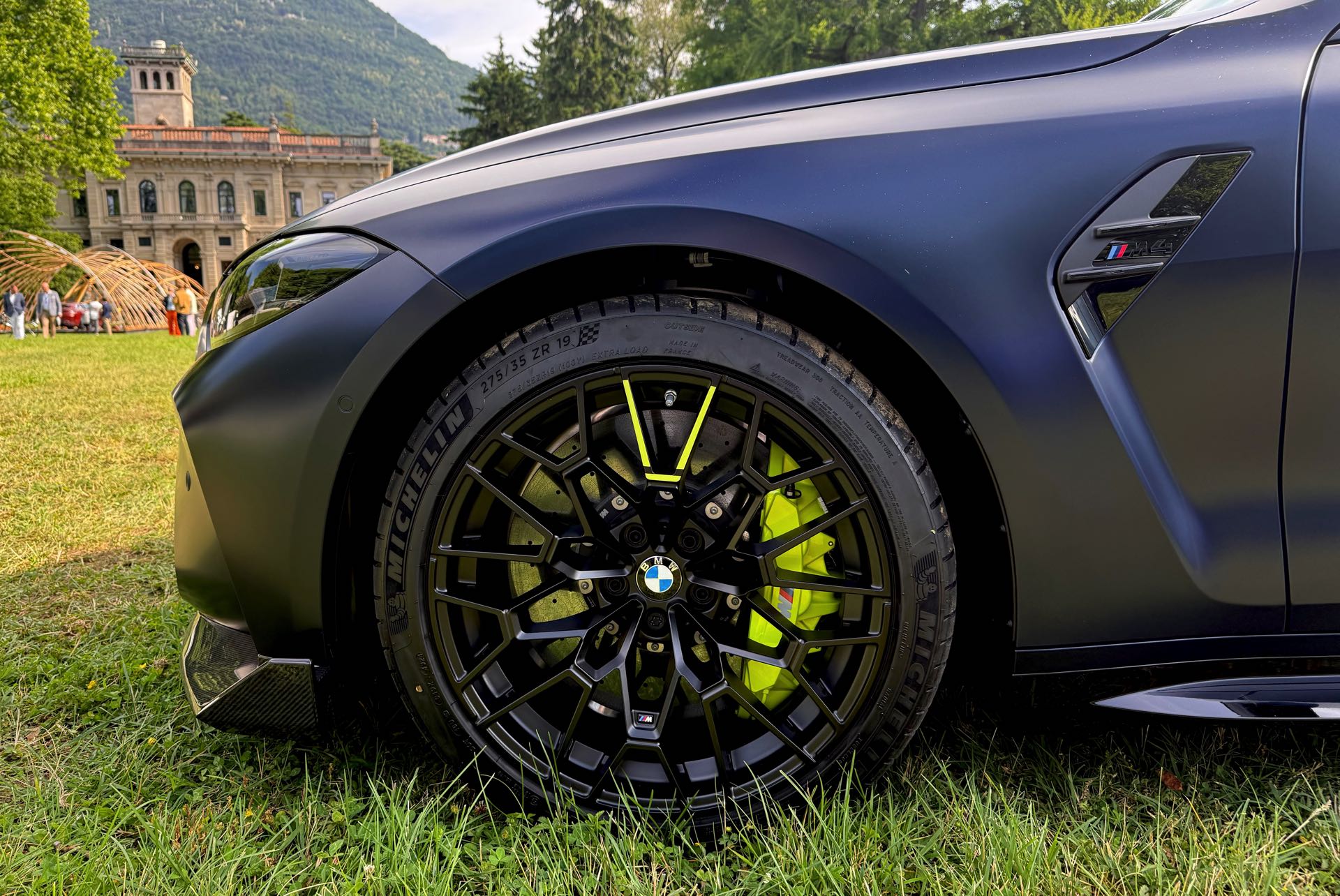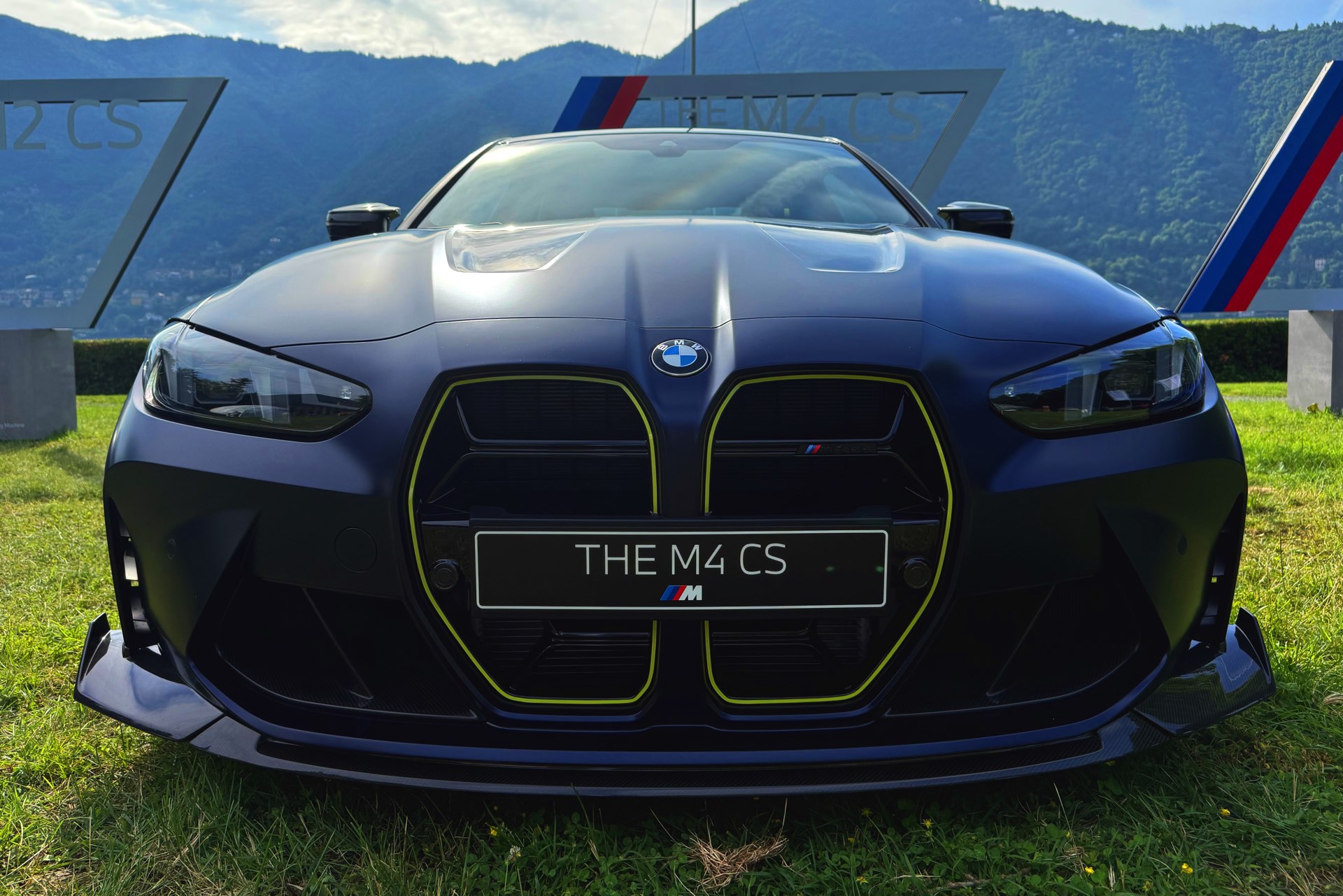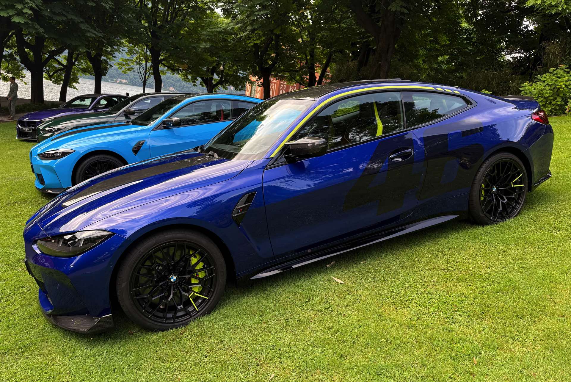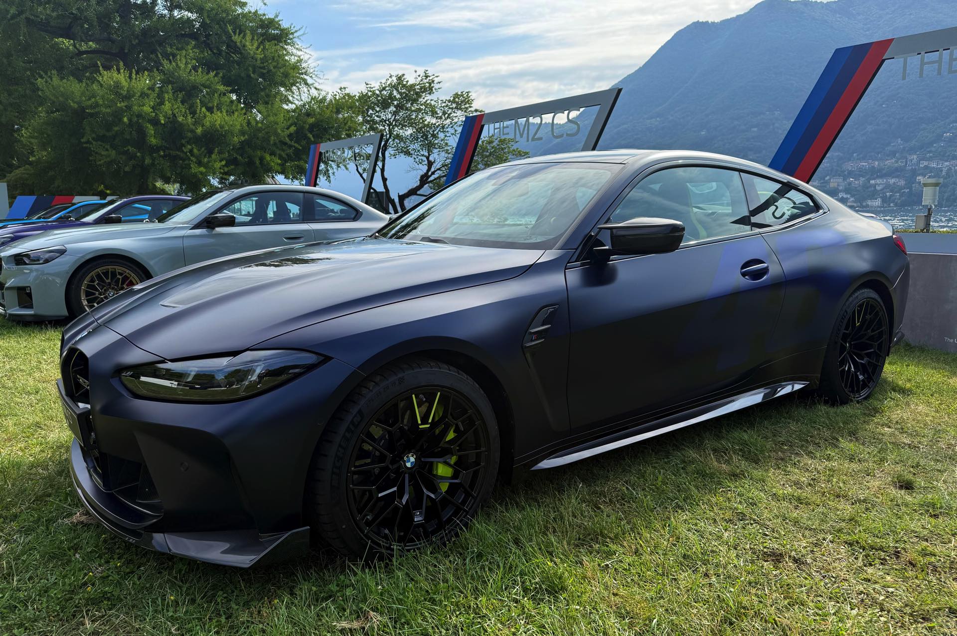 Die zunächst im Alleingang auf dem Gelände der nahen Villa Erba präsentierte Edition Style des BMW M4 CS VR46 erhielt im Lauf des Wochenendes Gesellschaft von ihrem Schwestermodell, konnte aber auch schon im Alleingang überzeugen: Mit ihrer matten Lackierung in Frozen Tanzanite Blue sticht sie selbst im Umfeld des Concorso d’Eleganza Villa d’Este mühelos aus der Masse heraus, dazu kommen einige Details im typischen Neongelb von Valentino Rossi – angefangen von der Nieren-Einfassung über einen Zierstreifen am Fuß der Heckklappe bis hin zu einem stilisierten V auf den Felgen und sogar den Bremssätteln.