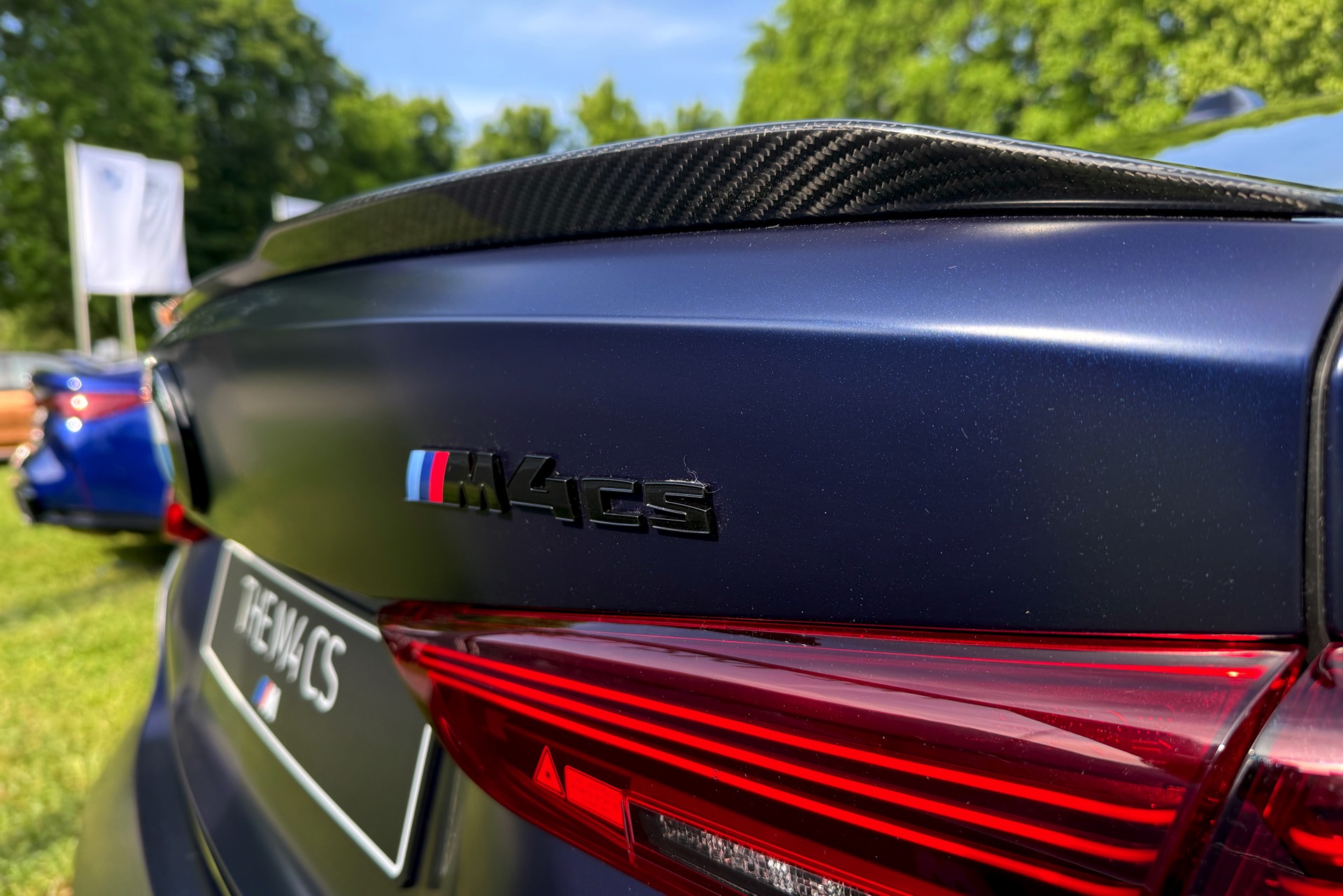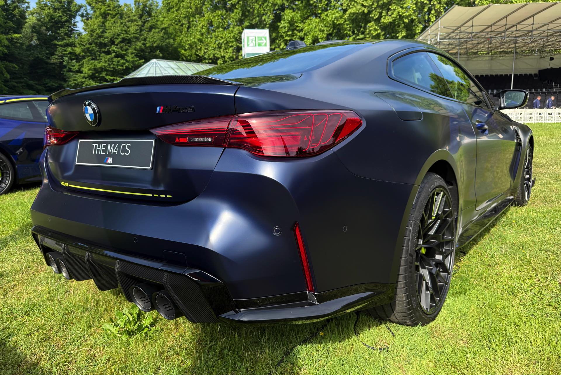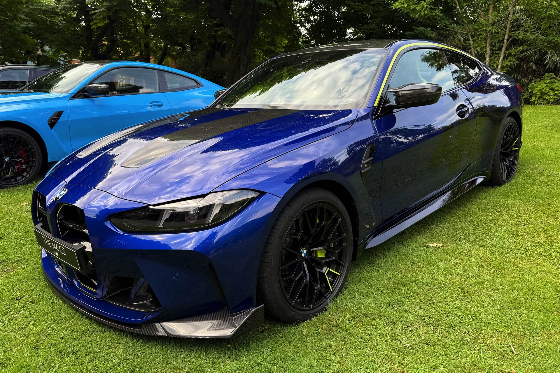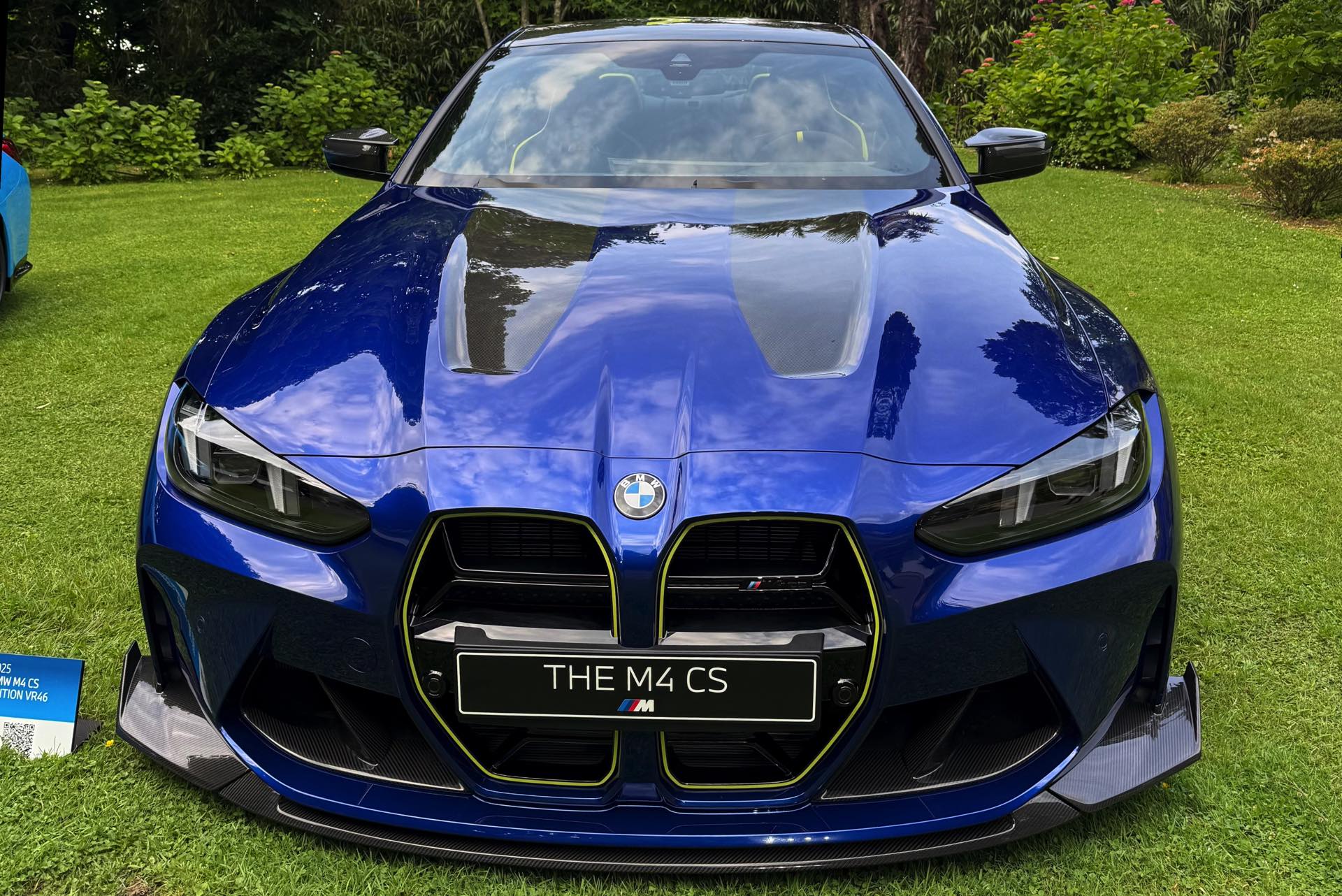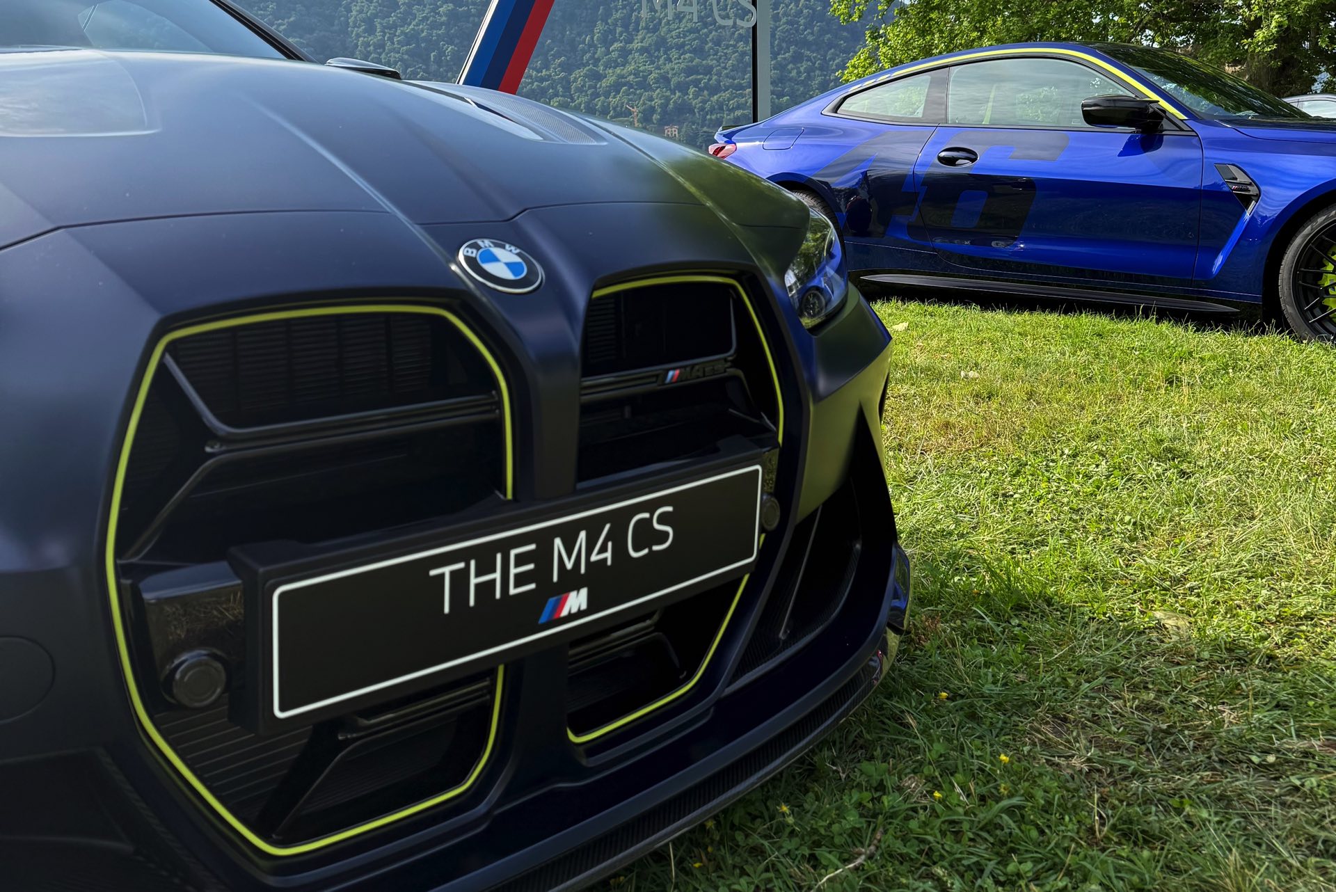 Zunächst zog bereits am Freitag Abend die Edition Sport viele Blicke auf sich, als sie nur wenige Meter von der Weltpremiere des BMW M2 CS entfernt präsentiert wurde: Mit der glänzenden Lackierung in Marina Bay Blue, dunklen Akzenten in Tanzanite Blue, neongelben Details und natürlich sämtlichen Carbon-Komponenten des regulären BMW M4 CS (G82 LCI) gibt es wirklich aus jedem Blickwinkel etwas zu entdecken. Der größte Hingucker sind dabei ohne Frage die in leichtem Kontrast abgesetzten Ziffern an der Seite, denn beide Varianten ziert eine riesige 46 im Stil einer dezenten Startnummer.