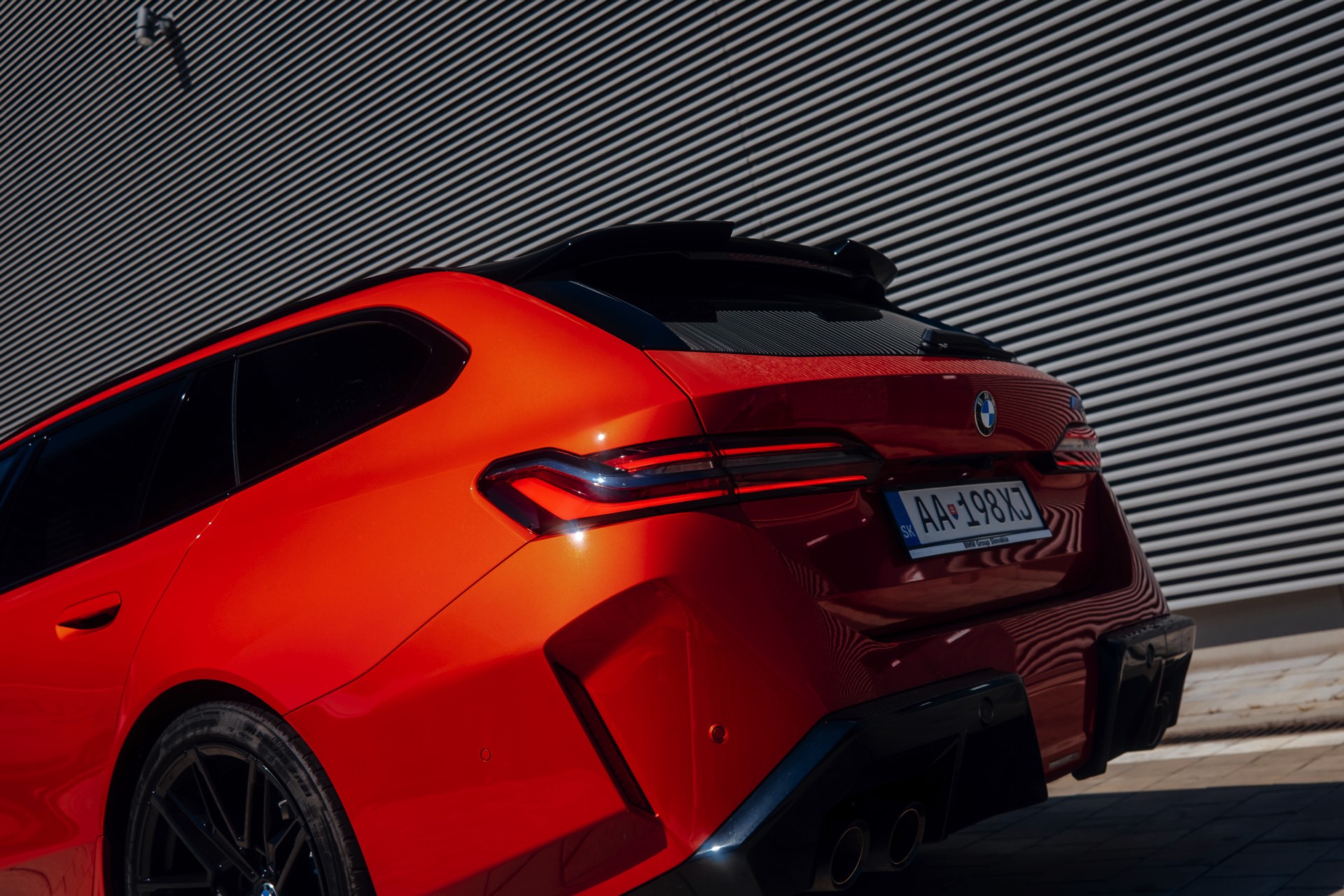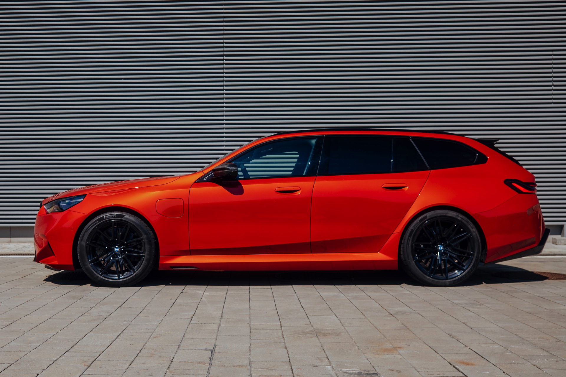Noch weiter auf die Spitze treiben lässt sich der Auftritt mit einer Individual-Lackierung wie Sakhir Orange III: Das vor einigen Jahren auf Fahrzeugen wie dem BMW M6 Gran Coupé (F06) oder dem M5 Competition (F10 LCI) regulär erhältliche Orange ist nun über das Sonderwunsch-Portfolio von BMW Individual unter dem Farbcode P93 erhältlich. Wie der BMW M5 Touring in Sakhir Orange wirkt, zeigt uns ein aktuelles Foto-Set von BMW Slovakia. Dort wurde ein Exemplar des Über-Kombis mit der Individual-Lackierung versehen und in einer konsequenten Orange-Schwarz-Konfiguration bestellt.
