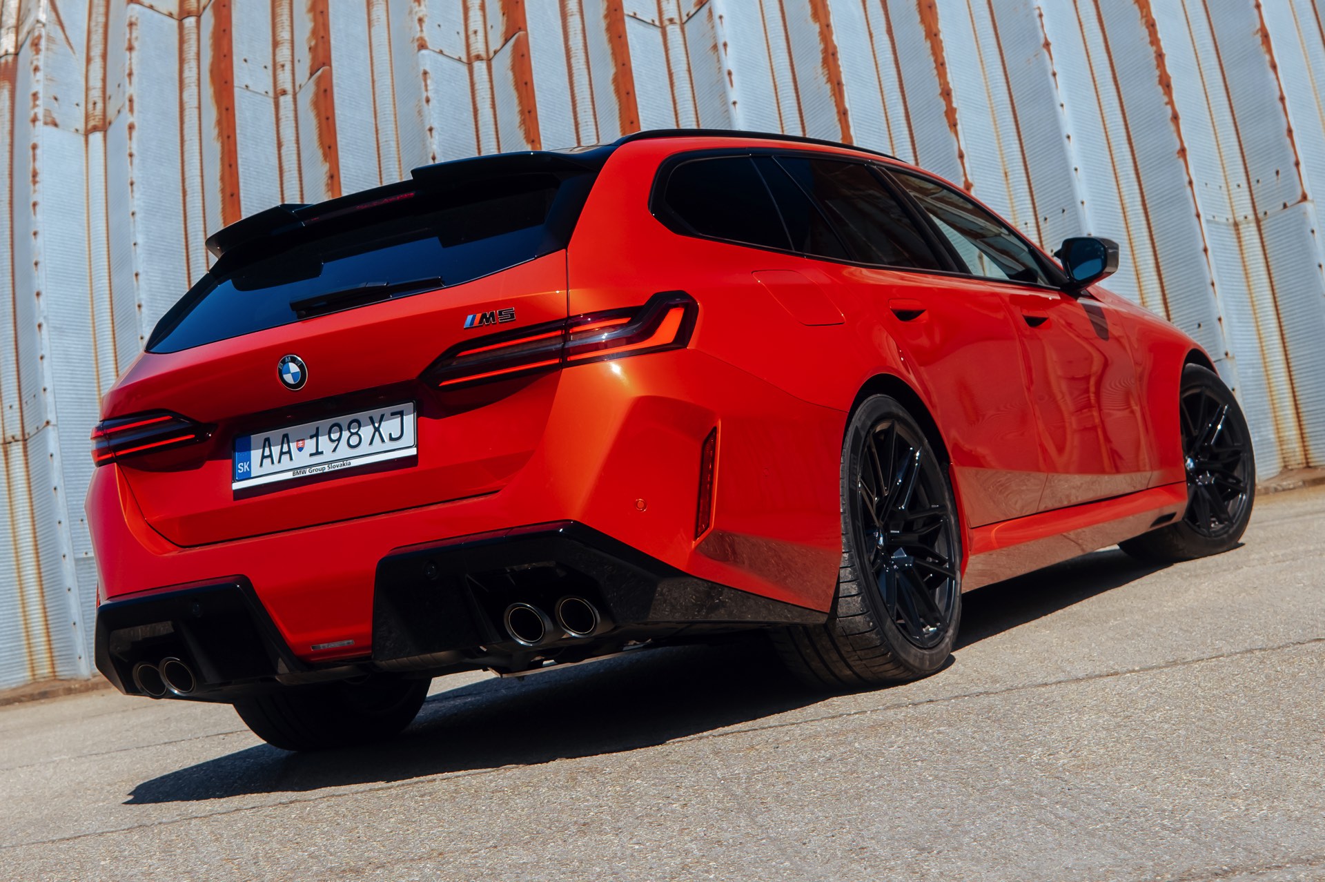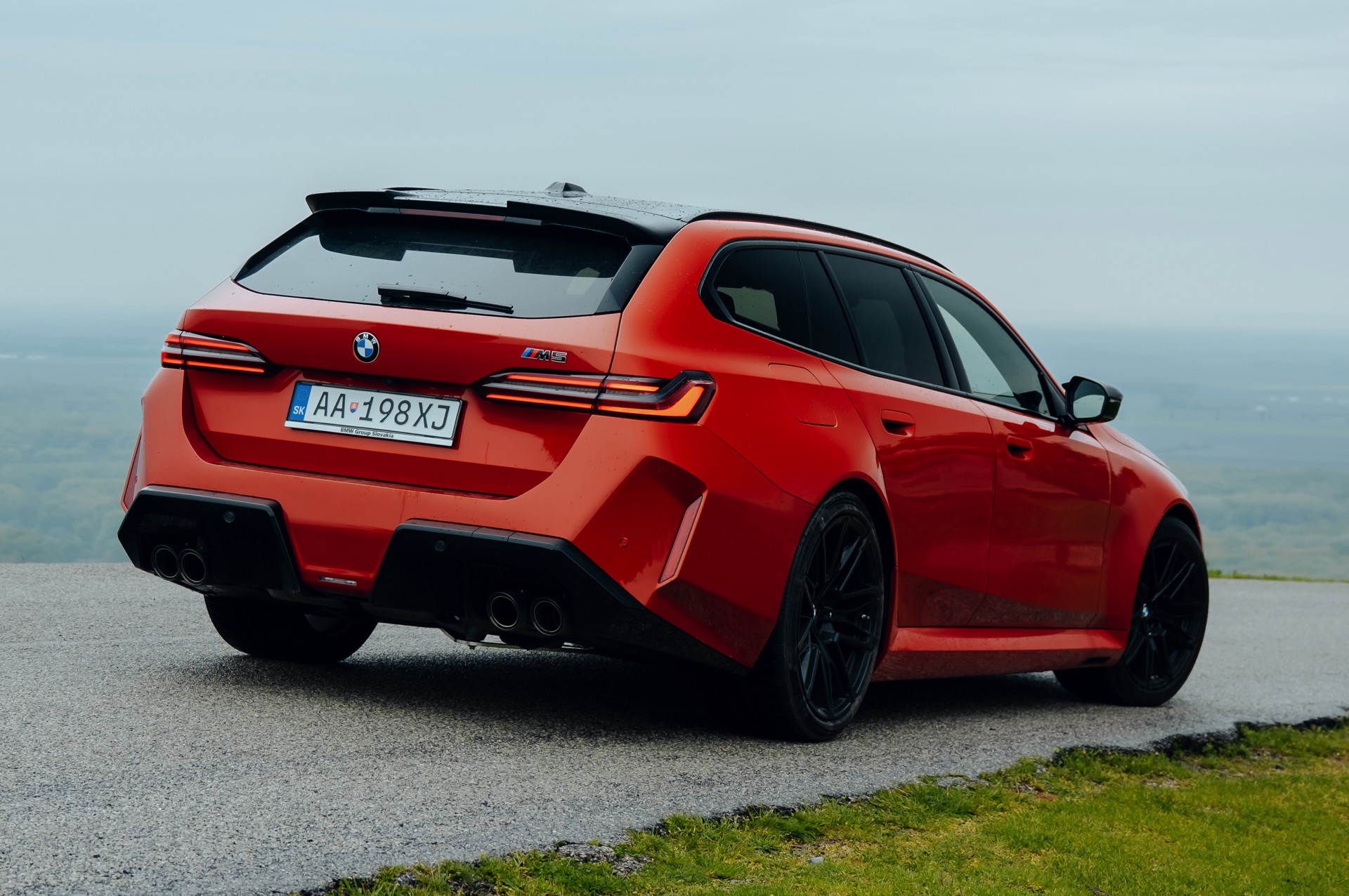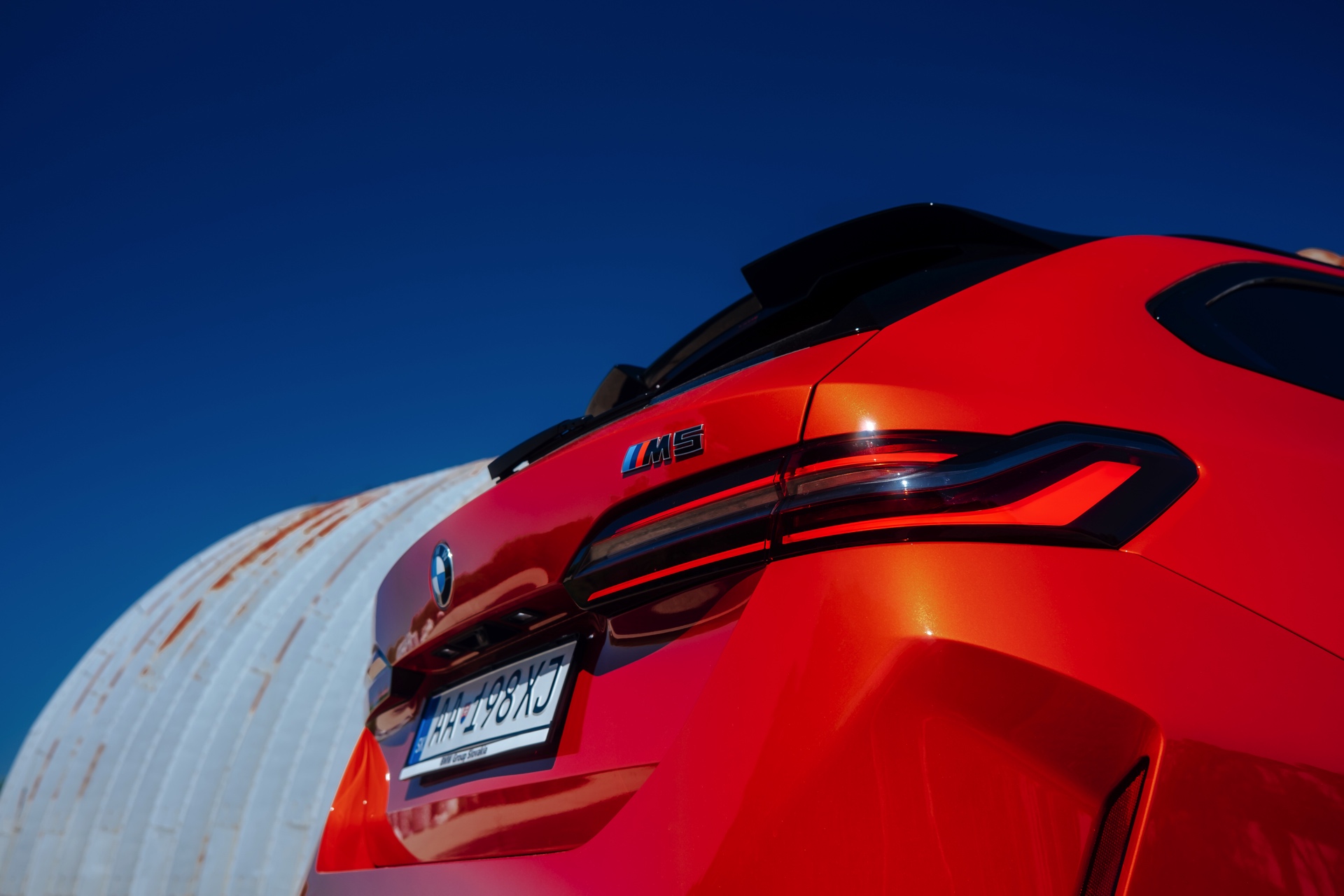 Der neue BMW M5 Touring (G99) zählt nicht nur zu den stärksten und schnellsten Kombis der Welt, er bietet auch einen extrem eigenständigen Look: Im Vergleich zum regulären 5er Touring (G61) ist der V8-Kombi volle sieben Zentimeter breiter, weil seine Kotflügel vorne und hinten mit Blick auf die benötigte Spurweite erheblich ausgestellt wurden, doch auch die Optik wurde mit massiven Lufteinlässen und einer Abgasanlage samt vier Endrohren am Heck dramatisch verändert.
