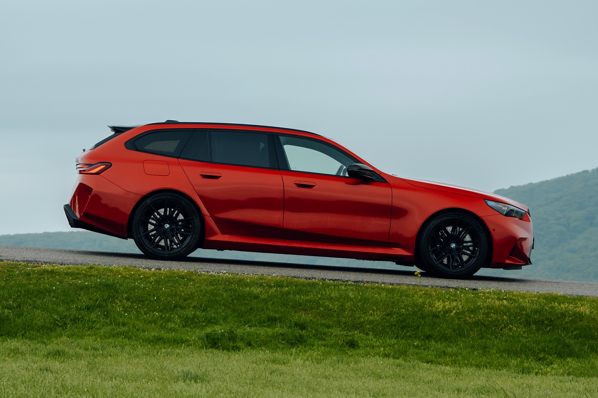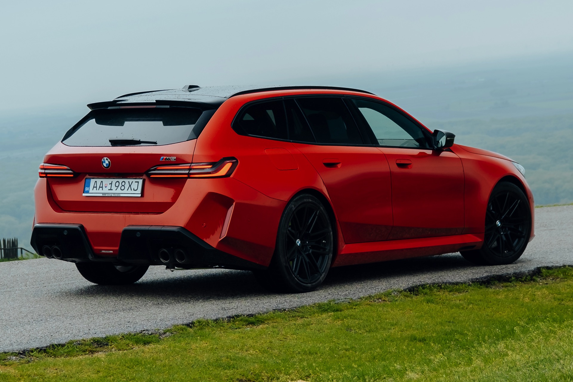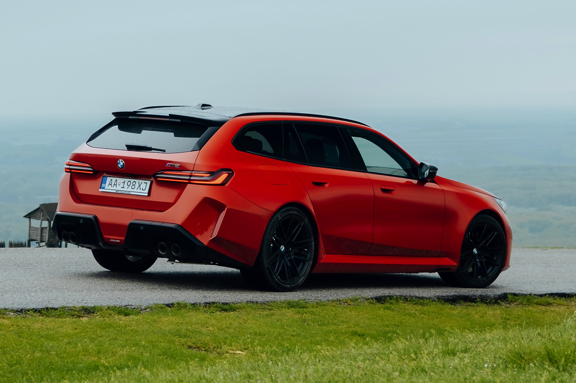 Der neue BMW M5 Touring (G99) zählt nicht nur zu den stärksten und schnellsten Kombis der Welt, er bietet auch einen extrem eigenständigen Look: Im Vergleich zum regulären 5er Touring (G61) ist der V8-Kombi volle sieben Zentimeter breiter, weil seine Kotflügel vorne und hinten mit Blick auf die benötigte Spurweite erheblich ausgestellt wurden, doch auch die Optik wurde mit massiven Lufteinlässen und einer Abgasanlage samt vier Endrohren am Heck dramatisch verändert.