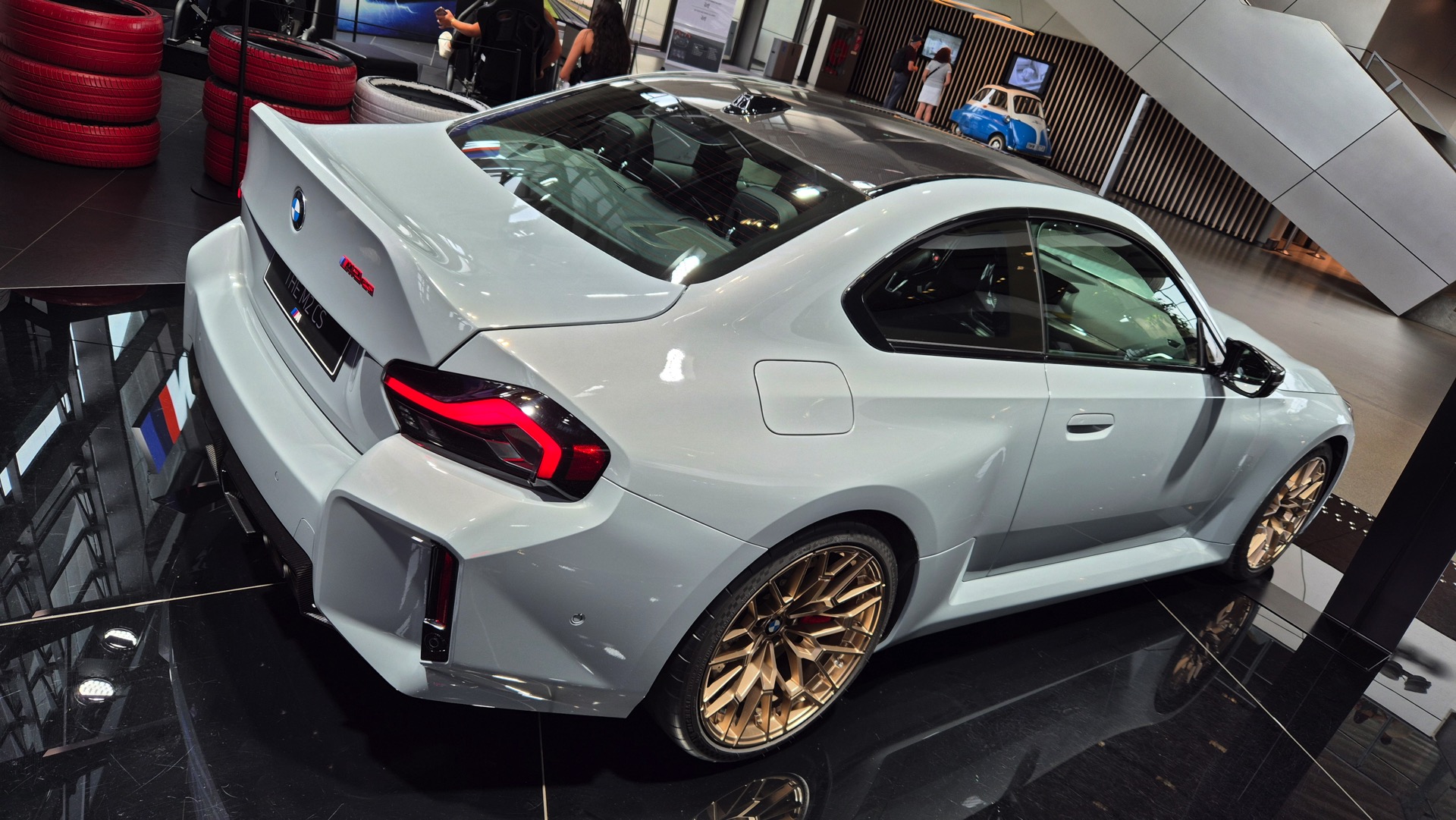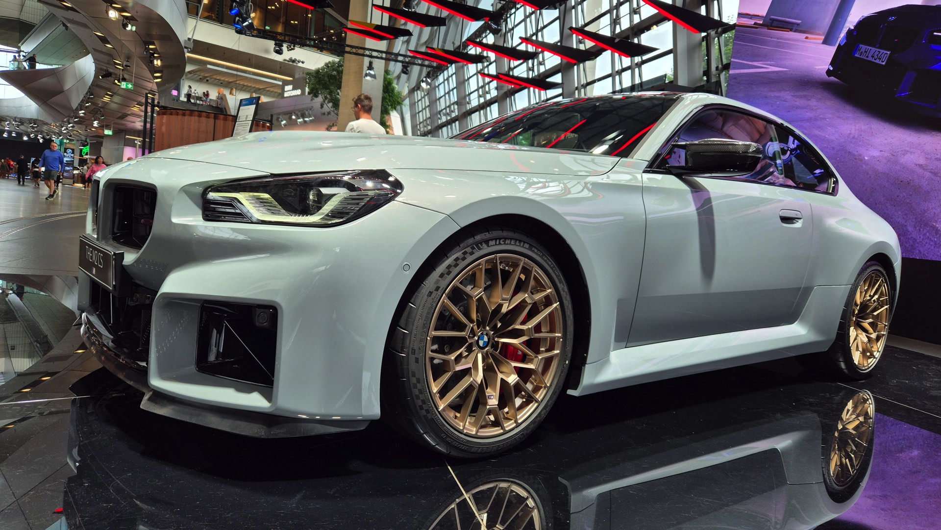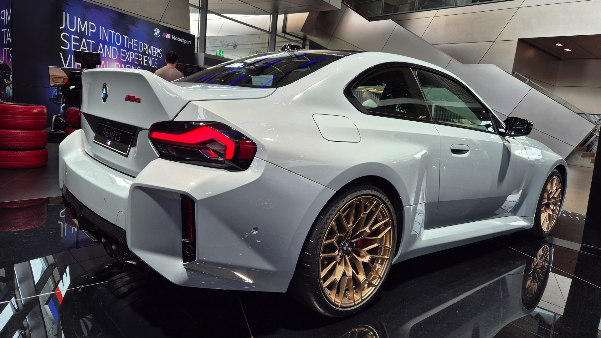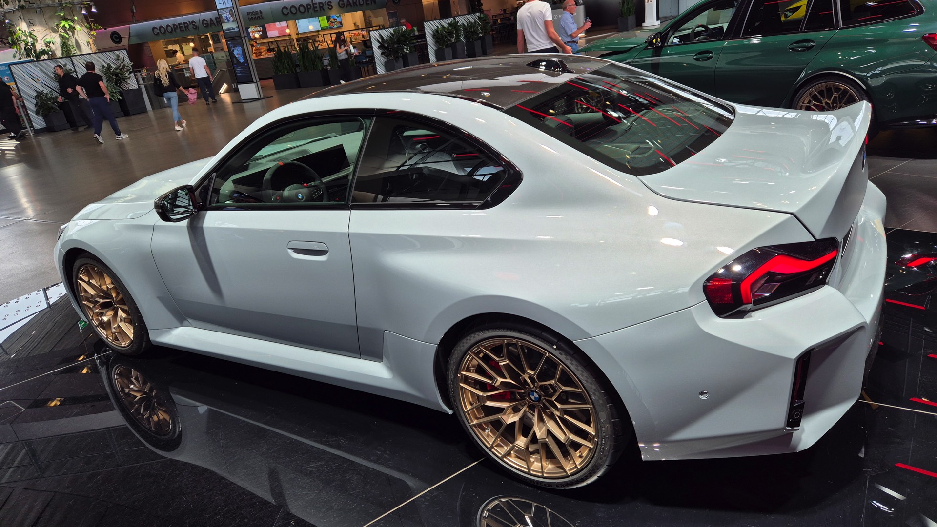 Unterhalb des Bürzels trägt der Top-G87 einen eigenständig gestalteten Diffusor-Einsatz, der seine Leichtbau-Ambitionen dank Sicht-Carbon auch zeigen darf. In der Seitenansicht stechen vor allem die vorne 19 und hinten 20 Zoll großen Felgen im Design Sternspeiche 827 M Goldbronze hervor, für die ab Werk drei unterschiedliche Reifentypen bestellt werden können: Zur Wahl stehen klassische Sportreifen, Track-Reifen und sogar sogenannte Ultra-Track-Reifen, die maximale Performance auf trockenem Untergrund versprechen.