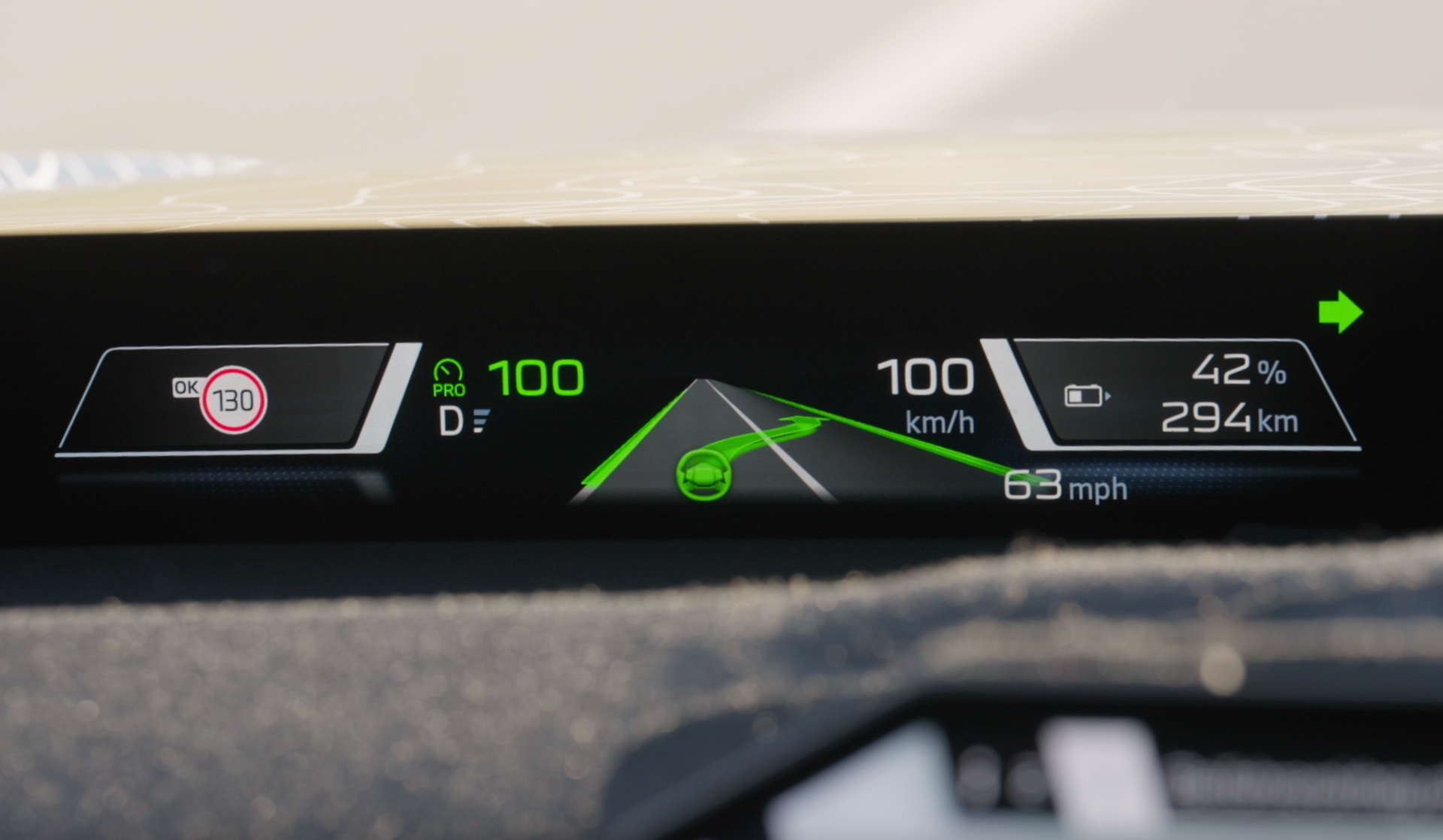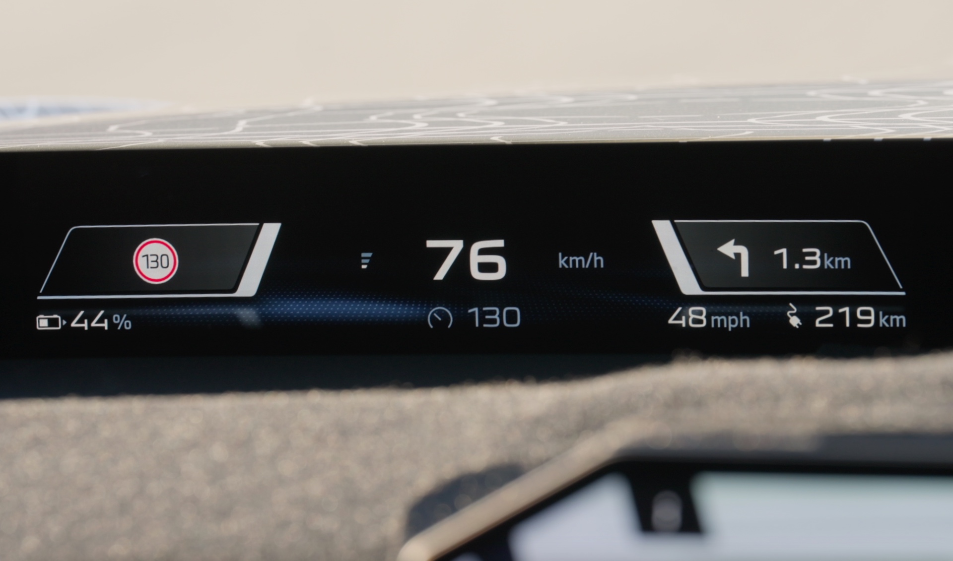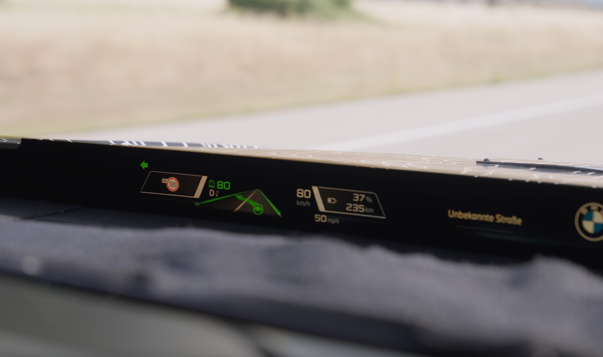 Noch spannender ist ohne Frage das auf voller Breite am Fuß der Frontscheibe platzierte Panoramic Vision Display. Der schmale Streifen dient zur Anzeige wichtiger Informationen, darunter die Geschwindigkeit und die verbleibende Reichweite. Welche Inhalte hier noch angezeigt werden, kann der Fahrer jederzeit über das iDrive-Menü konfigurieren. Im Gegensatz zum gewohnten Head-up-Display (HUD) ist das Panoramic Display für alle Insassen lesbar, während die ausschließlich für den Fahrer relevanten Infos in einem 3D-HUD mit deutlich vergrößerter Anzeigefläche ausgespielt werden. Das Video aus Miramas liefert uns auch den bisher klarsten Blick auf das zentrale Infotainment-Display von iDrive X, das mit seiner charakteristischen Form aus dem derzeit üblichen Rechteck-Look ausbricht.