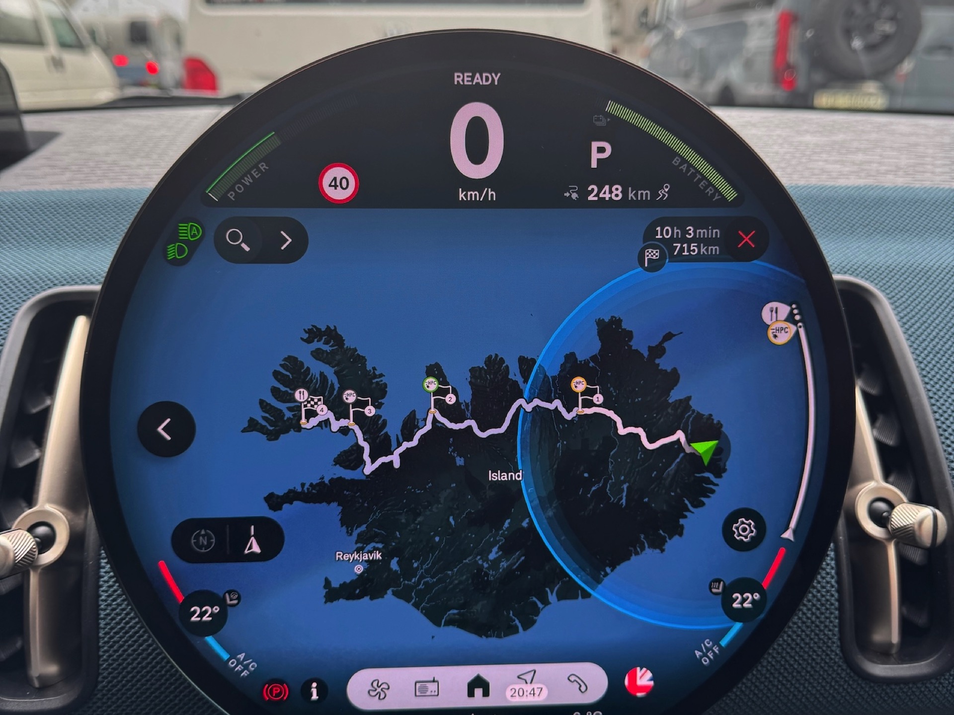 Die Ladestopps werden durch das vernetzte Navigationssystem exzellent kalkuliert, die Navigationskarte zeigt, wo in welchem Tempo nachgeladen werden kann. Leider tankt der Countryman SE nur mit maximal 130 Kilowatt – an sich nicht viel für eine derartige Langstreckentour, bei dem der Akku nicht allein bis 80 Prozent nachgefüllt werden sollte. Deutsche Städte und Ladesäulen fliegen nur so vorbei, während sich schnell herauskristallisiert, dass der Verbrauch deutlich oberhalb von 140 km/h durch die Umbauten am Fahrzeug in stattliche Höhen oberhalb der isländischen Hügelketten klettert. So sind es bis Hamburg zumeist 120 bis 130 km/h, die der Elektro-Crossover abgesehen von einem kurzen 180-km/h-Zwischenspurt abspult, ehe es auf der A7 südlich von Hamburg zäh wird.