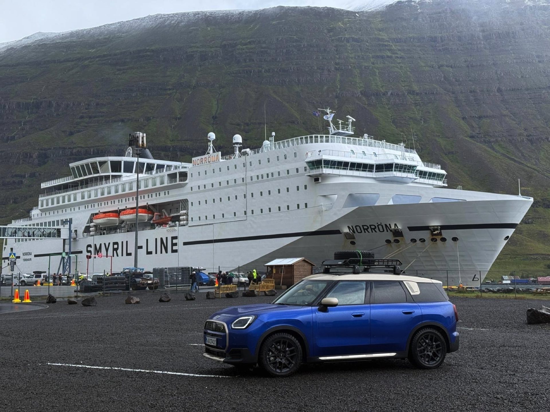 Nach Zwischenstopps in Hamburg und Hirtshals geht es auf die Fähre Norröna nach Sedisfjödur mit kurzem Zwischenstopp auf den Faröer Inseln – zwei lange Tage mit stattlicher Welle. Beim Einschiffen sorgt der Elektro-Countryman nicht nur wegen seiner Offroad-Optik für Gesprächsstoff. Islandfans aus Geländecampern, umgebauten Feuerwehrmobilen und Hardcore-Defendern interessieren sich für den Crossover, dessen Elektroantrieb die meisten noch mehr irritiert als fehlende Bodenfreiheit, Wassertanks oder Dachzelt. Zwei Tage muss es der Countryman im Bauch der Fähre aushalten und es wird für ihn deutlich angenehmer als für die meisten der mehr als 1.500 Passagiere, denn die Windstärken liegen wegen des rauen Wetters zwischen sieben und zehn – mit steten Wellen von sechs bis acht Metern.