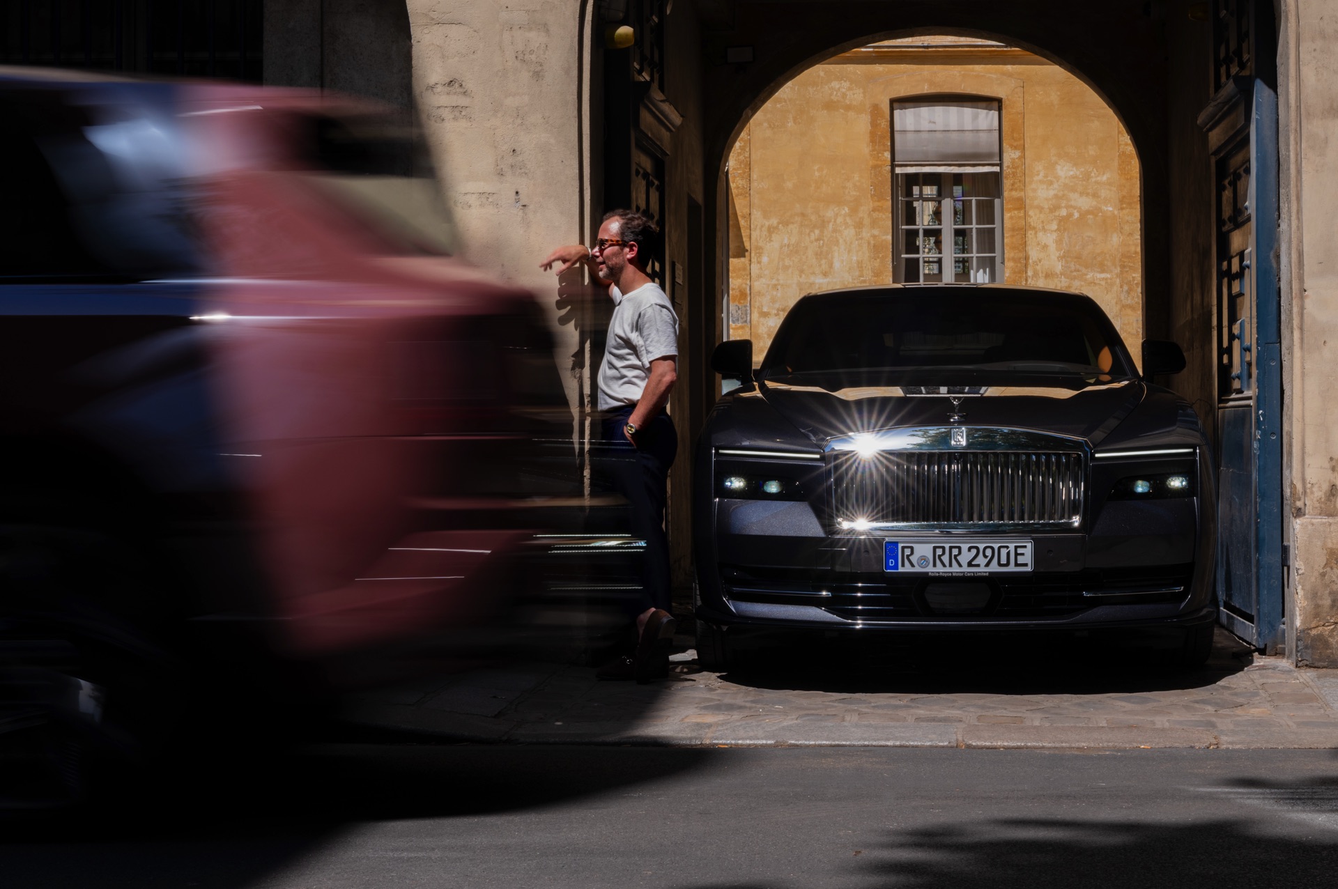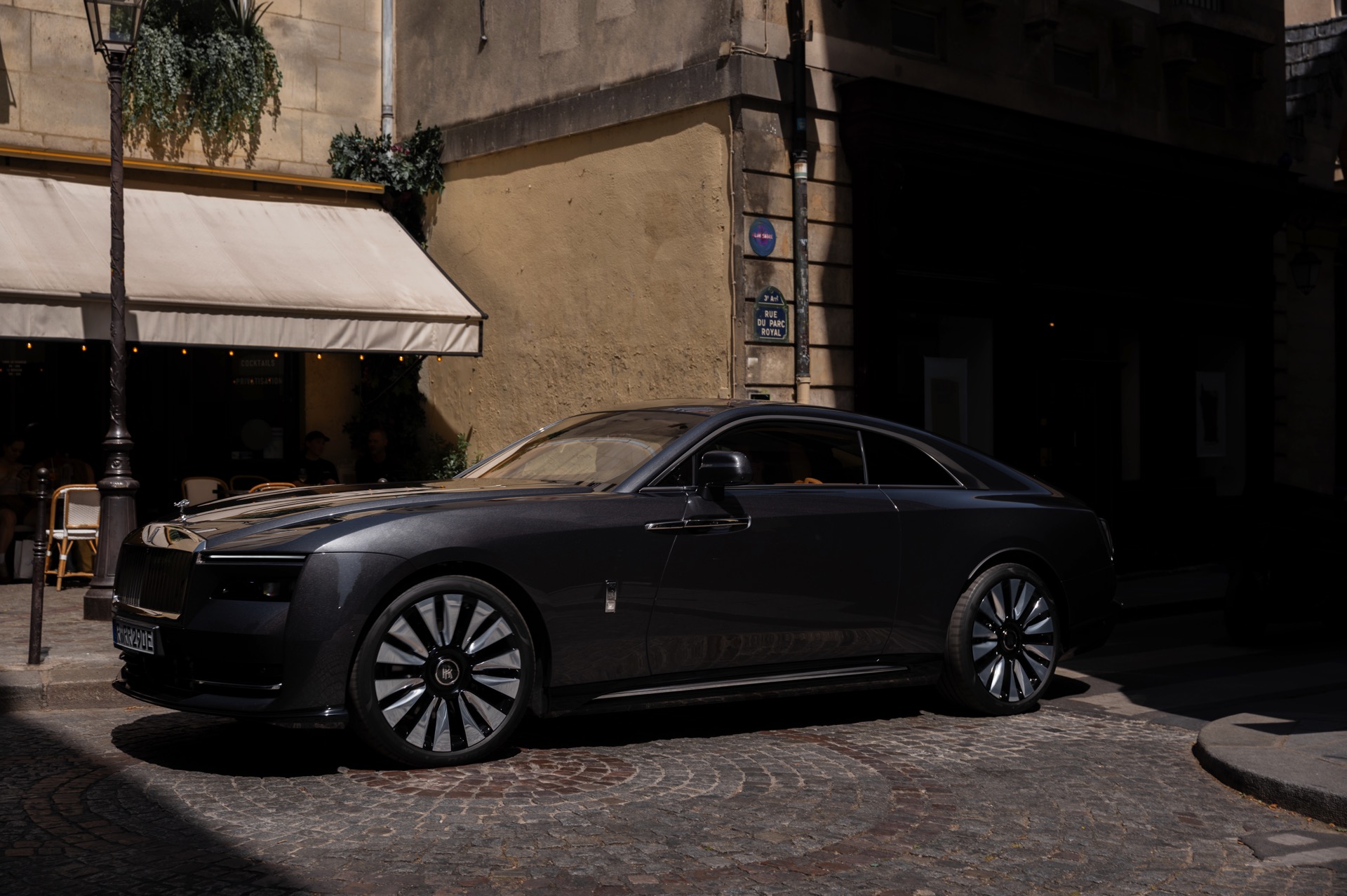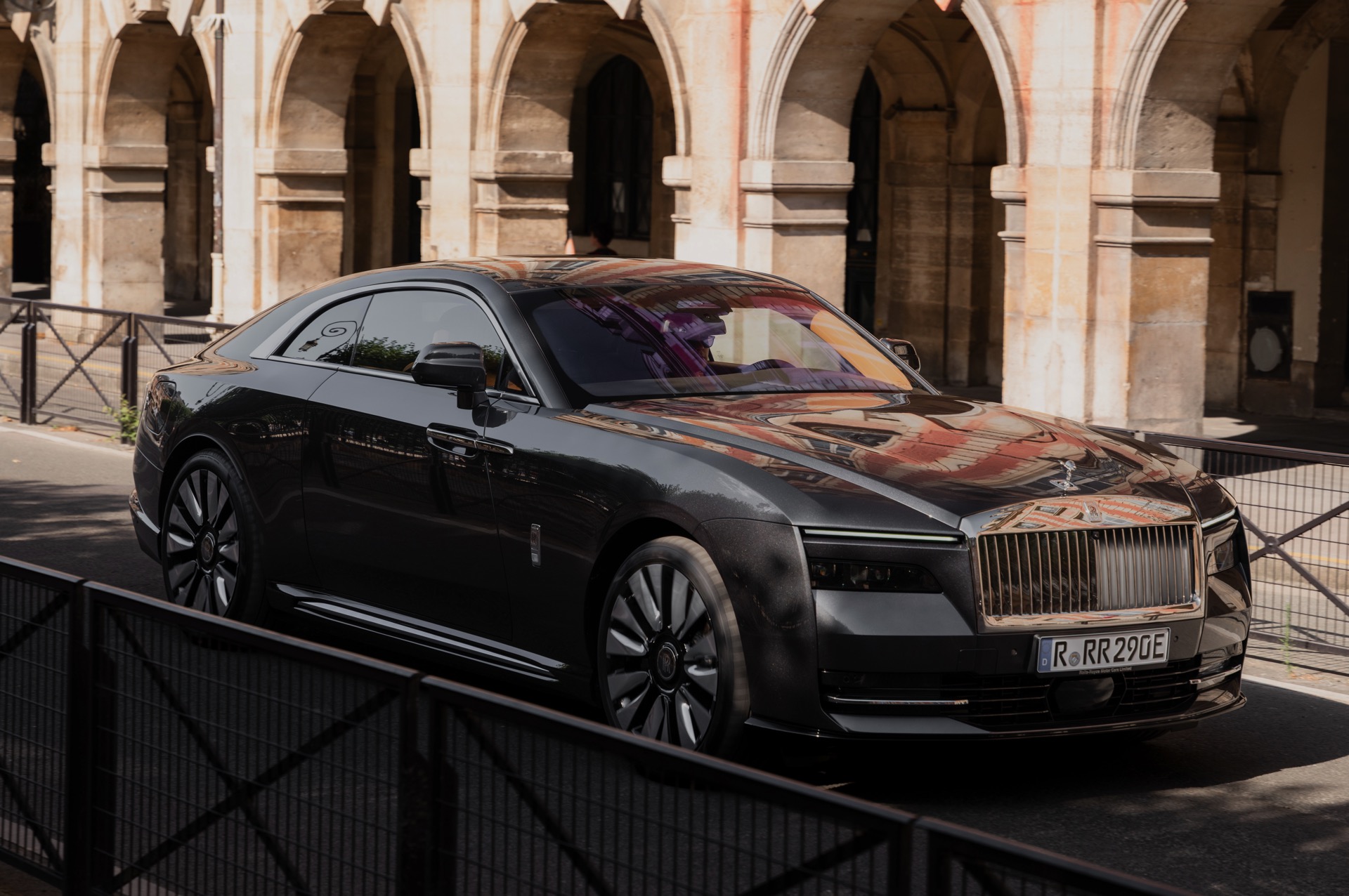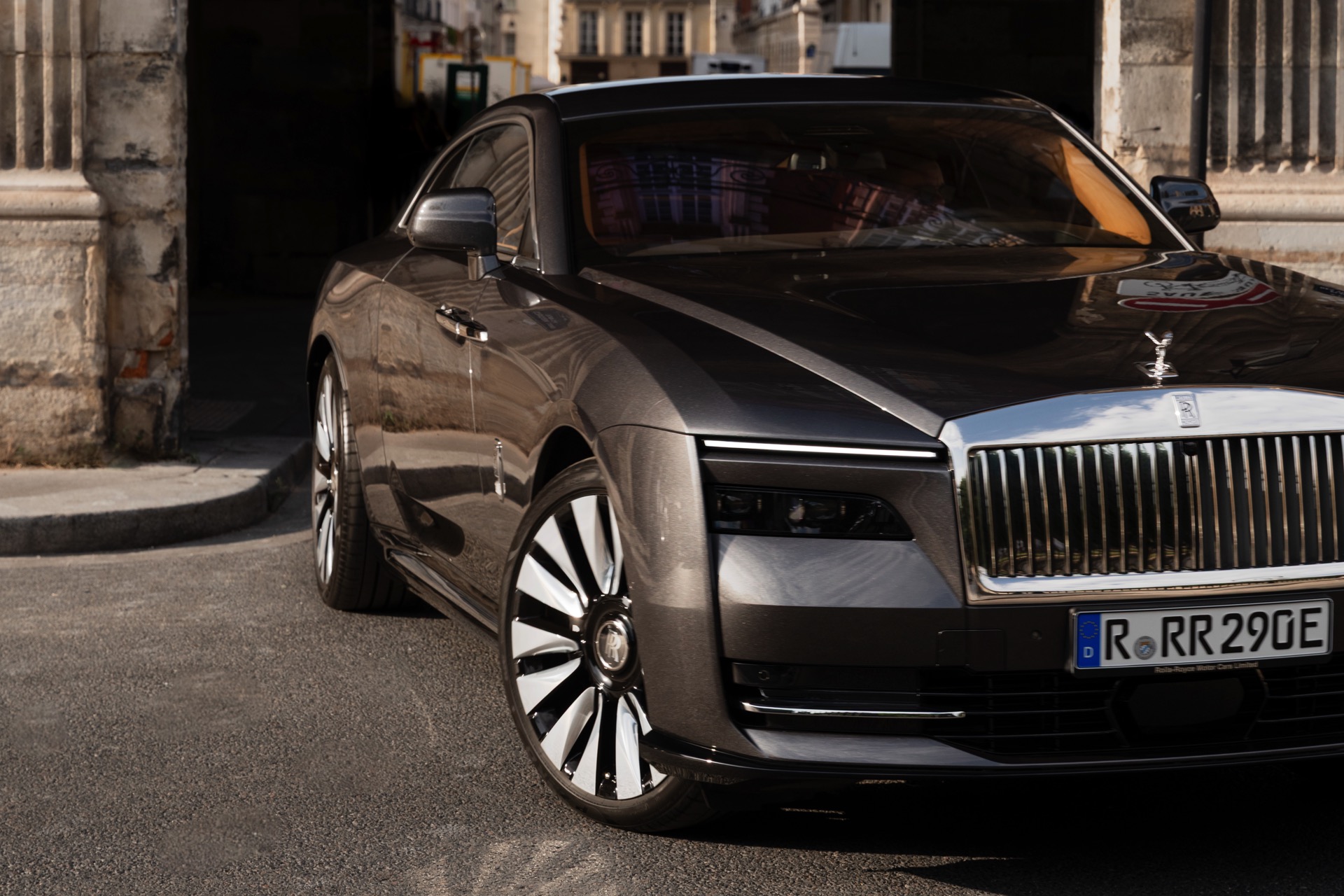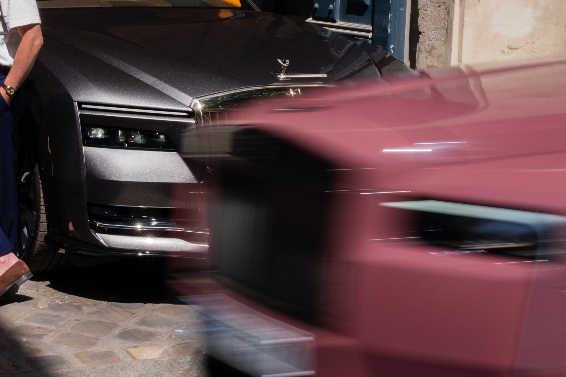 Mit zwölf Zylindern weniger, aber keinesfalls weniger reizvoll präsentiert sich auch ein Rolls-Royce Spectre zur Paris Fashion Week. Das elektrische Coupé, das vor wenigen Monaten in die Fußstapfen des Wraith getreten ist und seither im Alleingang die Nachfrage nach Elektroautos im absoluten Luxussegment bedient, glänzt in Gunmetal Metallic. Das dunkle Grau wird mit viel glänzendem Metall und XXL-Felgen kombiniert, wodurch sich ein luxuriös-eleganter Look ergibt.