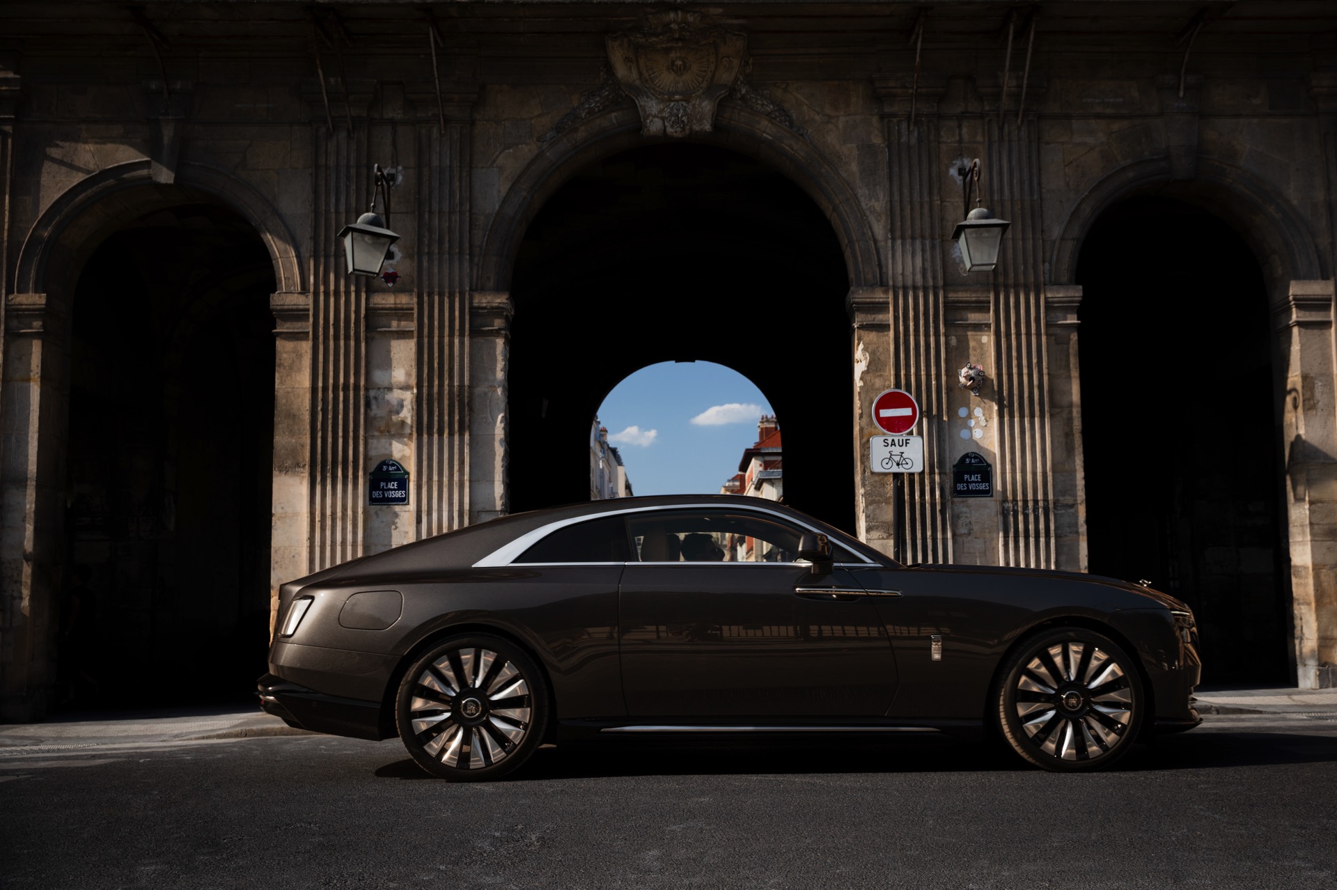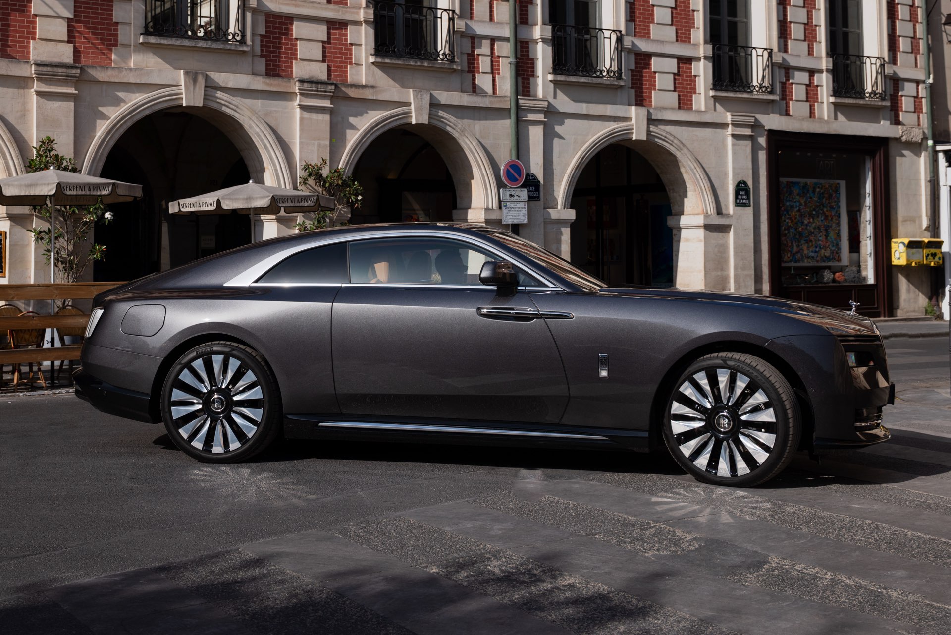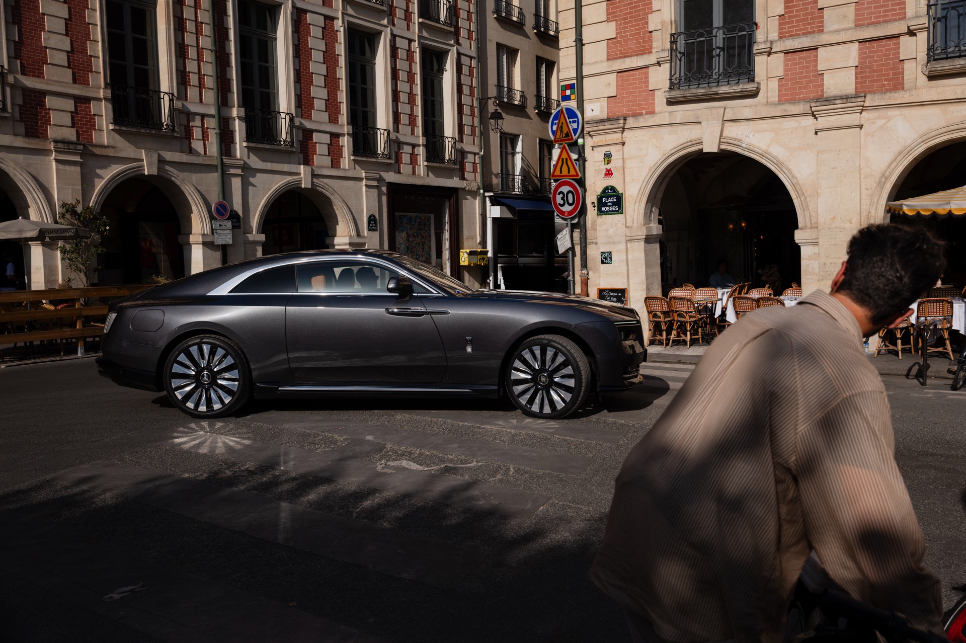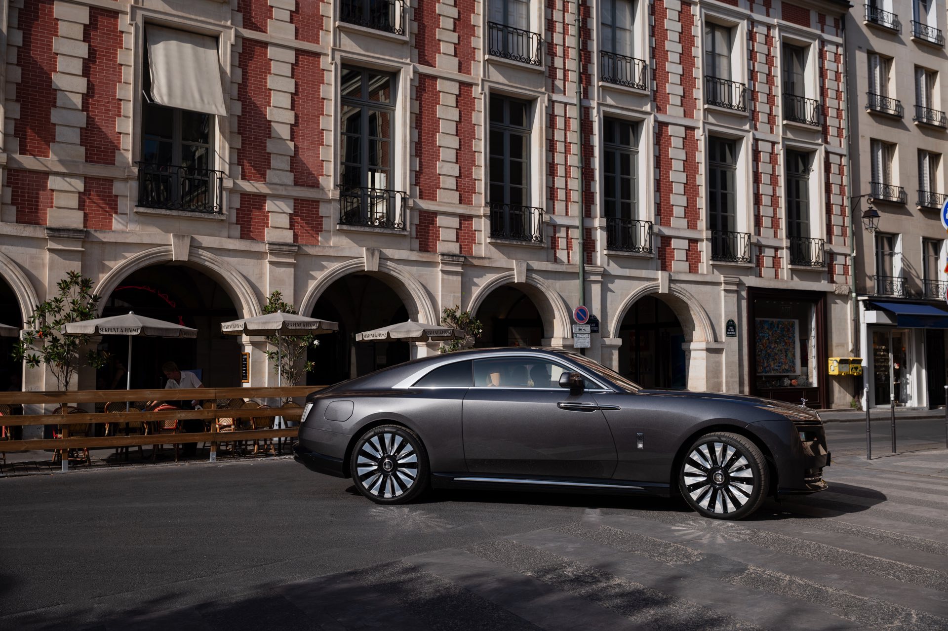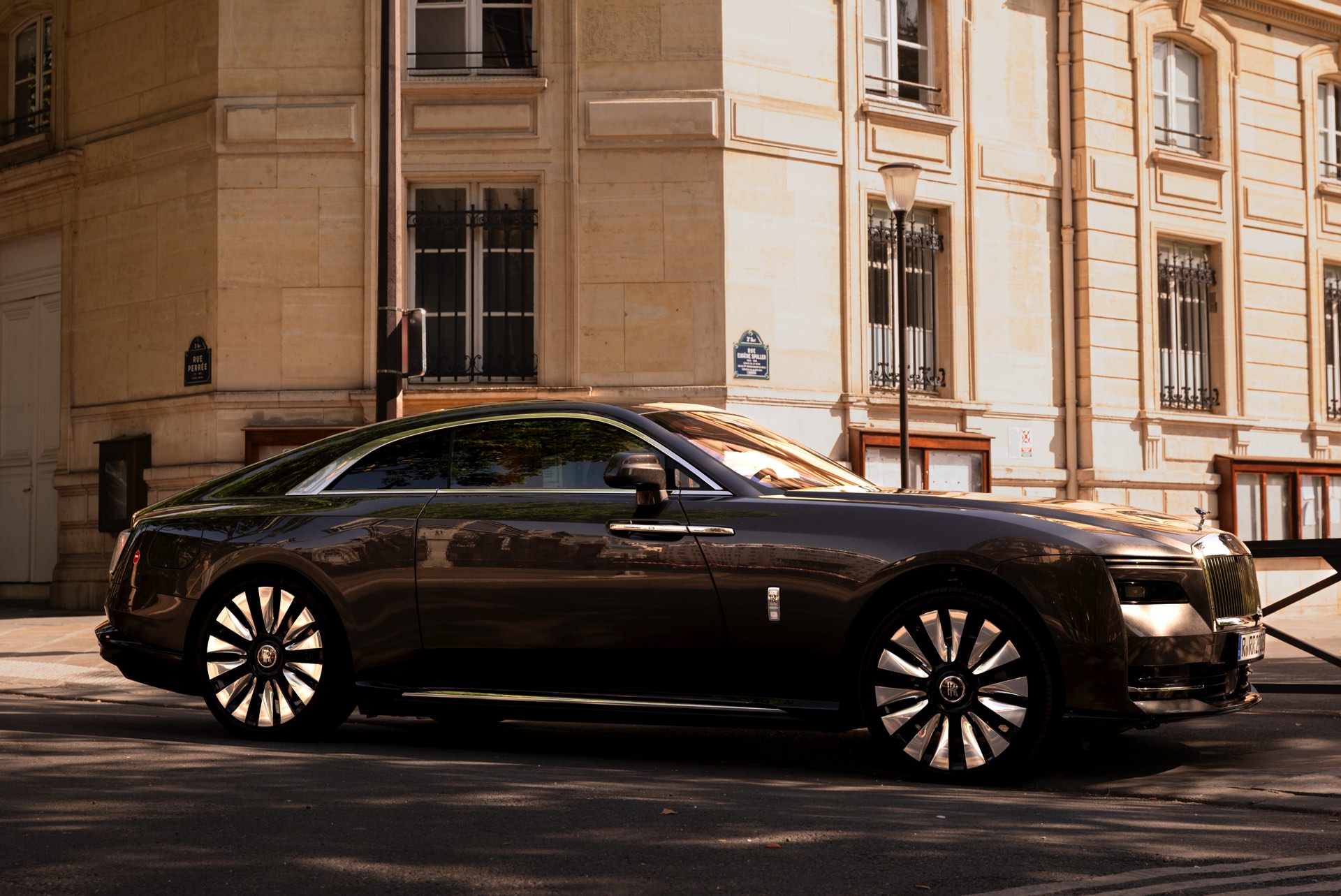 Mit zwölf Zylindern weniger, aber keinesfalls weniger reizvoll präsentiert sich auch ein Rolls-Royce Spectre zur Paris Fashion Week. Das elektrische Coupé, das vor wenigen Monaten in die Fußstapfen des Wraith getreten ist und seither im Alleingang die Nachfrage nach Elektroautos im absoluten Luxussegment bedient, glänzt in Gunmetal Metallic. Das dunkle Grau wird mit viel glänzendem Metall und XXL-Felgen kombiniert, wodurch sich ein luxuriös-eleganter Look ergibt.