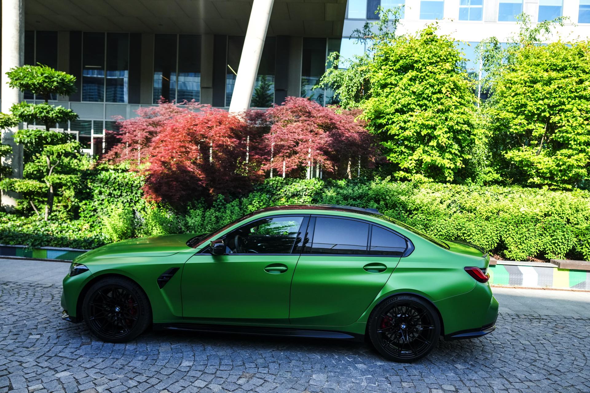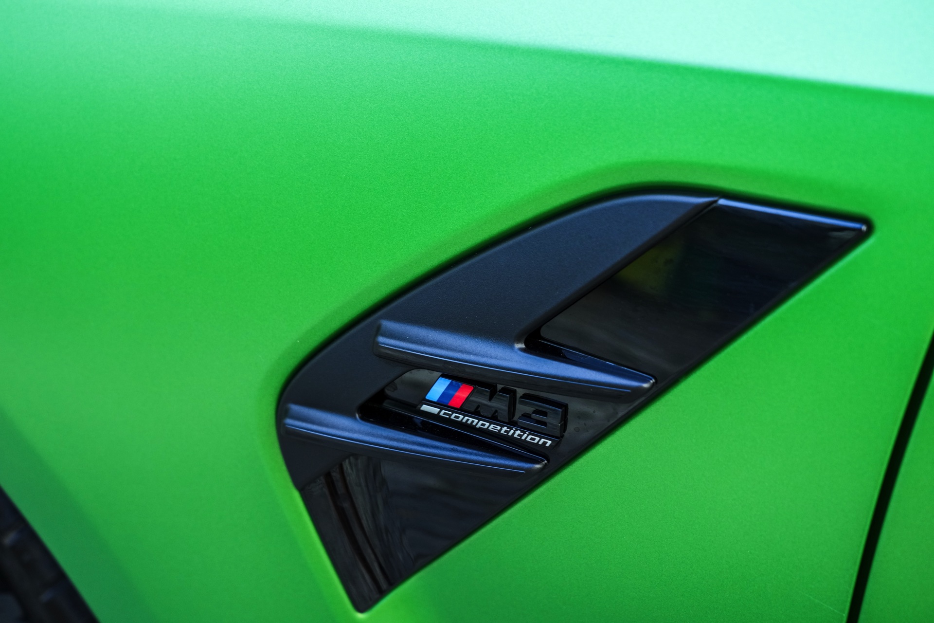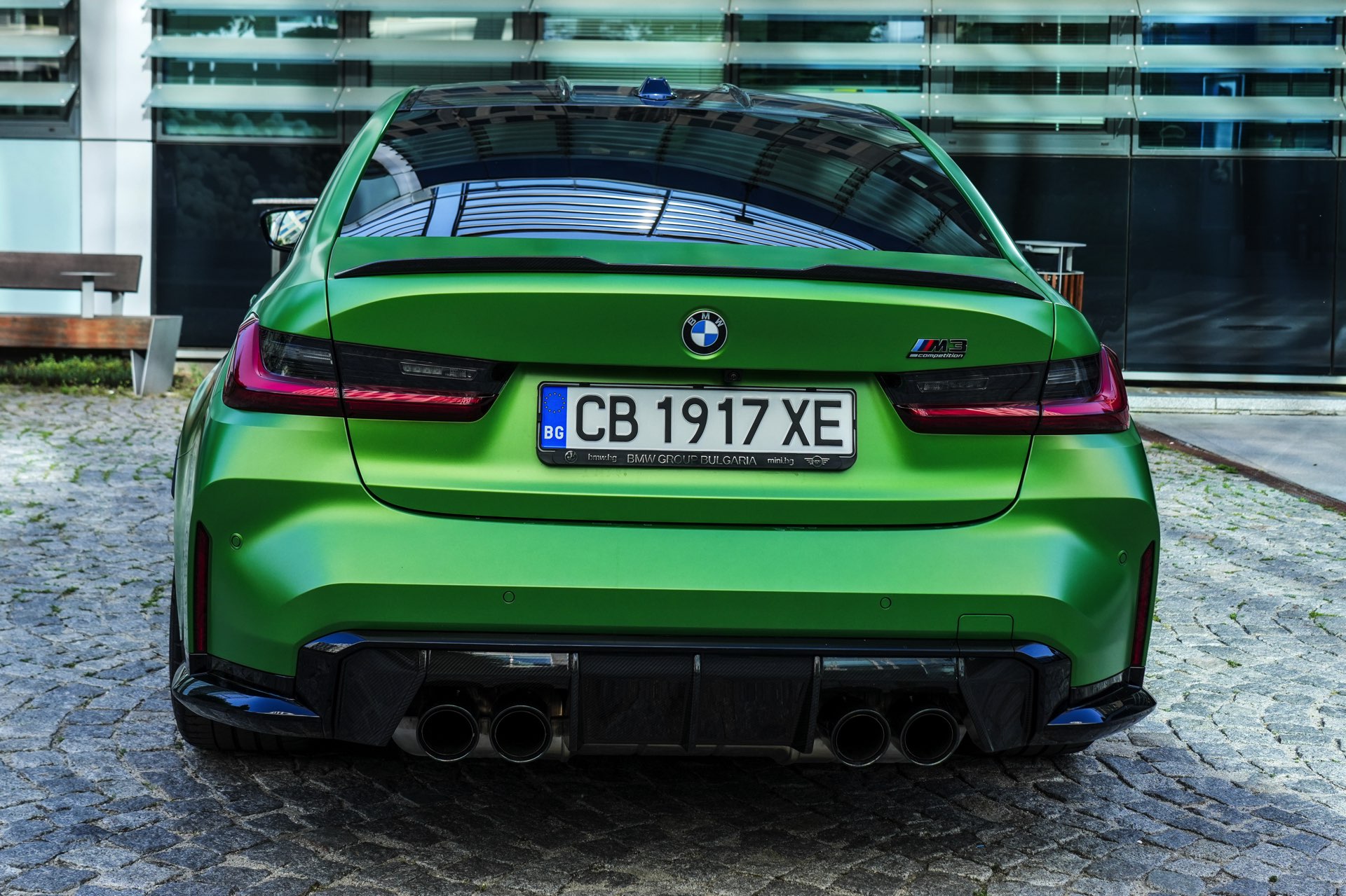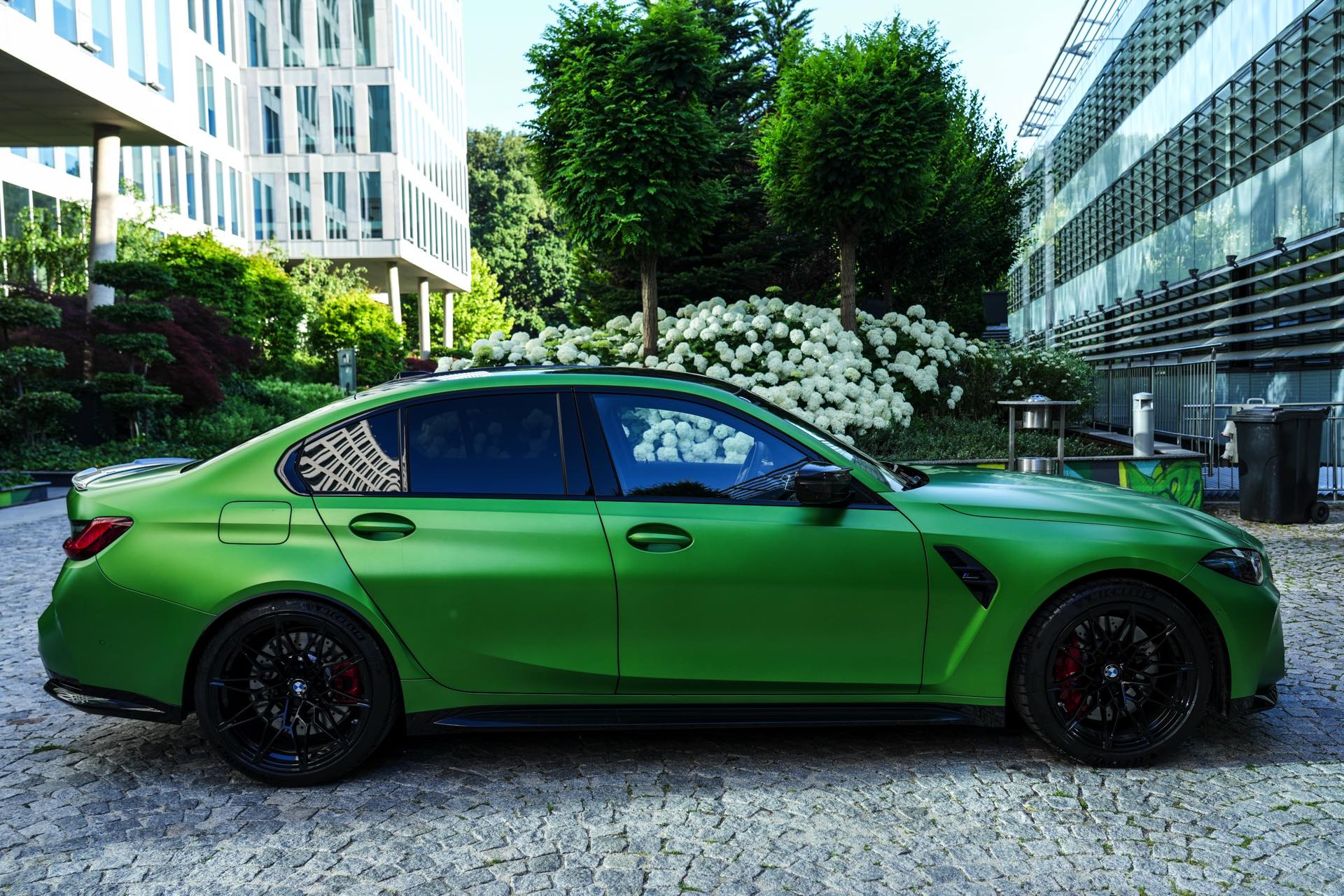 Am gezeigten Fahrzeug wird der Sonderwunsch-Lack Frozen Tampa Bay Green mit vielen dunklen Elementen kombiniert: Zum serienmäßigen Carbon-Dach kommt das M Carbon Exterieur-Paket, das unter anderem für Carbon-Außenspiegel, einen Carbon-Diffusor, eine Carbon-Spoilerlippe und entsprechende Blenden für die Lufteinlässe unterhalb der Scheinwerfer sorgt. Passend dazu trägt der gezeigte BMW M3 auch schwarze Felgen, denn wir sehen die vorne 19 und hinten 20 Zoll großen Schmiederäder Doppelspeiche 826 M Schwarz, die auf Wunsch auch ab Werk mit Track-Bereifung erhältlich sind. "