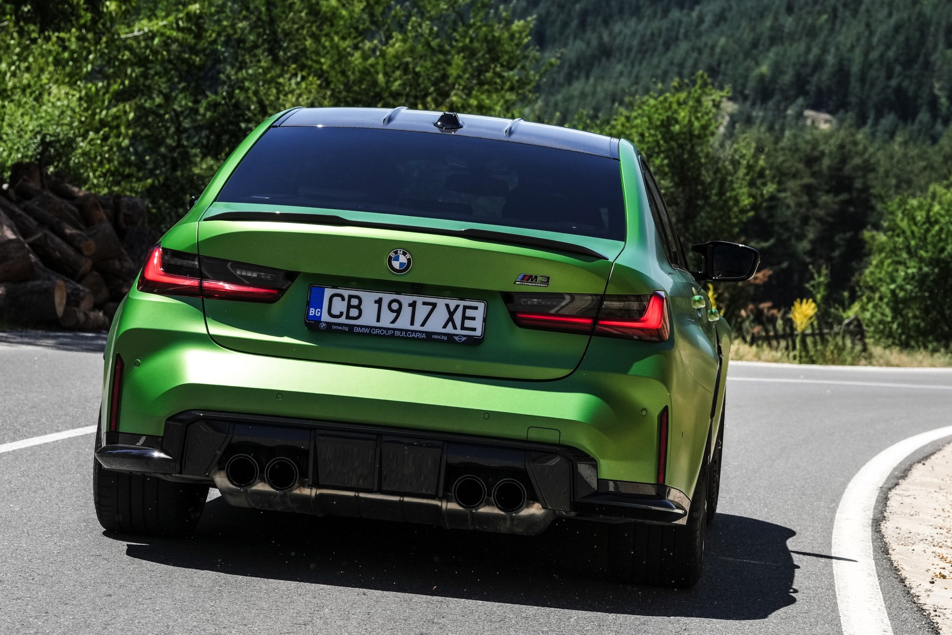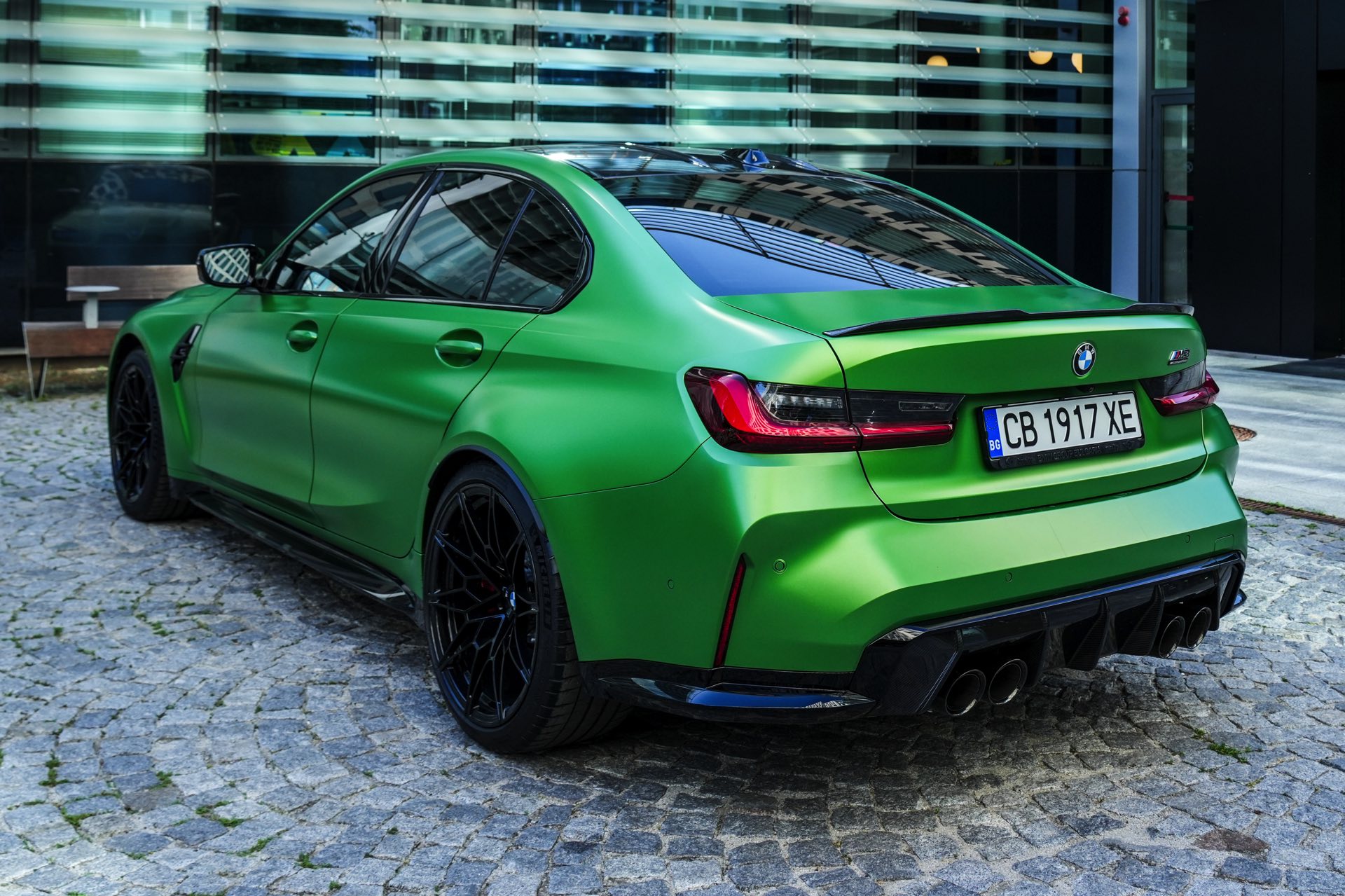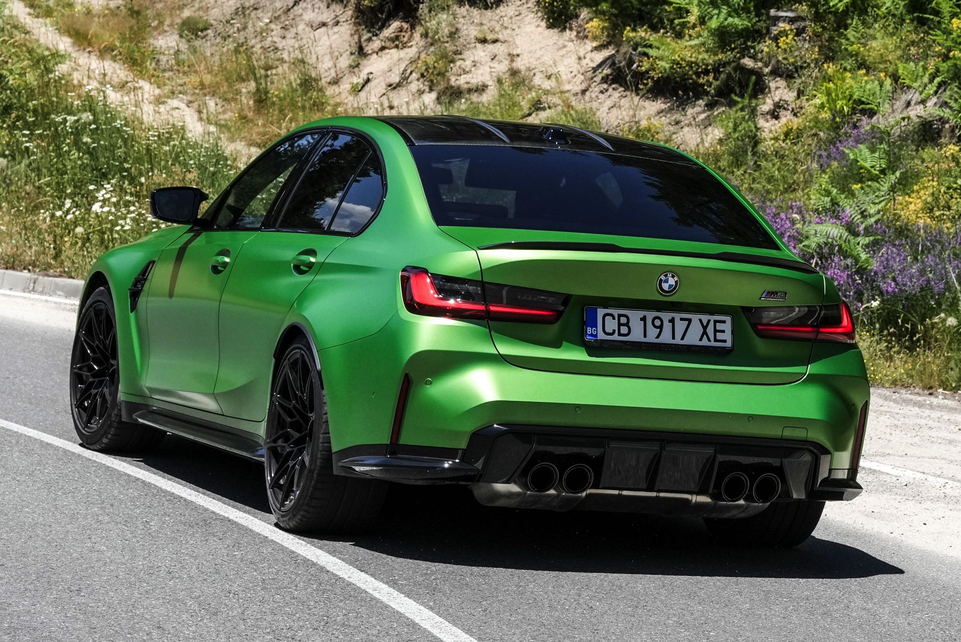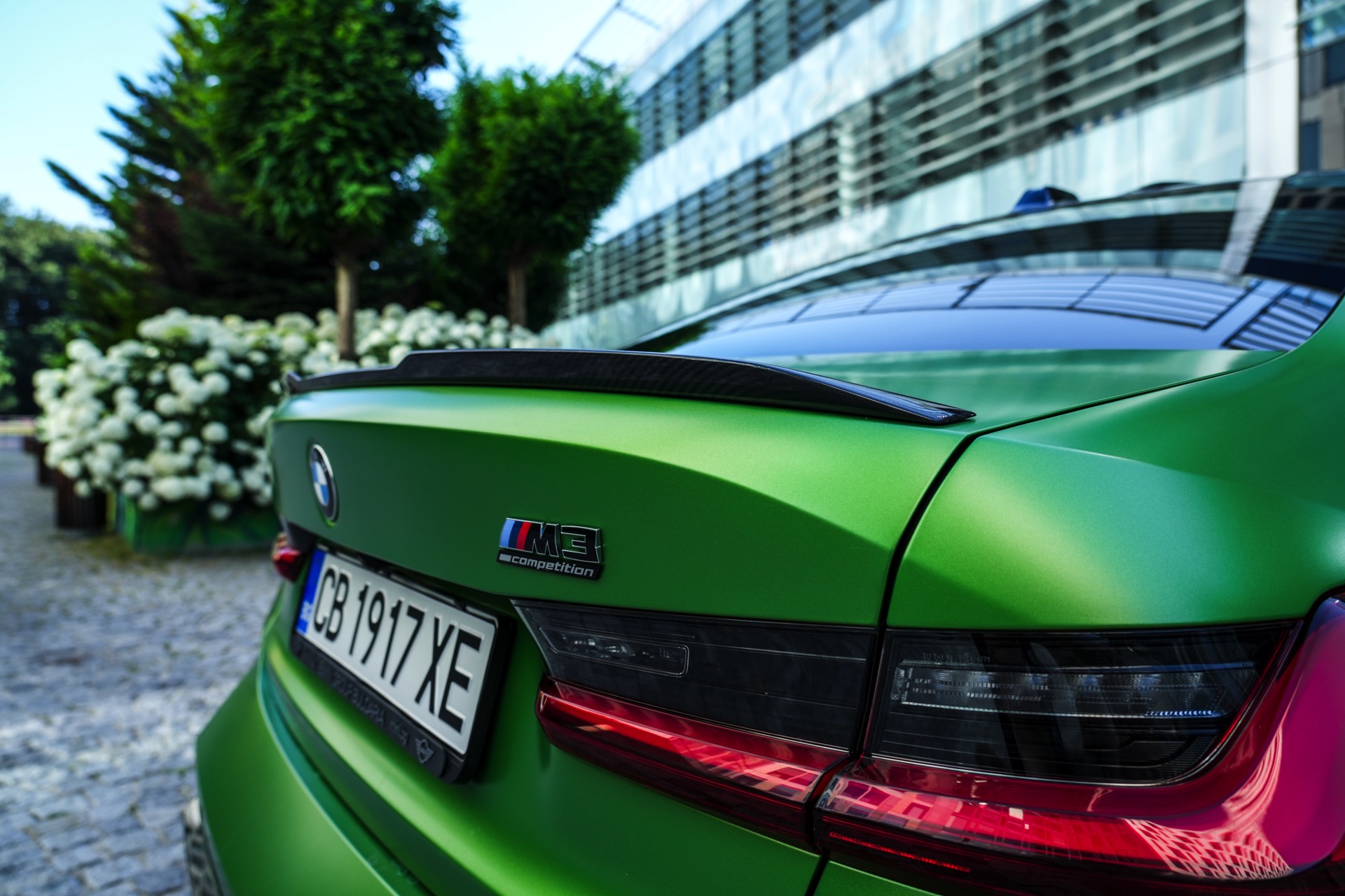 Am gezeigten Fahrzeug wird der Sonderwunsch-Lack Frozen Tampa Bay Green mit vielen dunklen Elementen kombiniert: Zum serienmäßigen Carbon-Dach kommt das M Carbon Exterieur-Paket, das unter anderem für Carbon-Außenspiegel, einen Carbon-Diffusor, eine Carbon-Spoilerlippe und entsprechende Blenden für die Lufteinlässe unterhalb der Scheinwerfer sorgt. Passend dazu trägt der gezeigte BMW M3 auch schwarze Felgen, denn wir sehen die vorne 19 und hinten 20 Zoll großen Schmiederäder Doppelspeiche 826 M Schwarz, die auf Wunsch auch ab Werk mit Track-Bereifung erhältlich sind. "