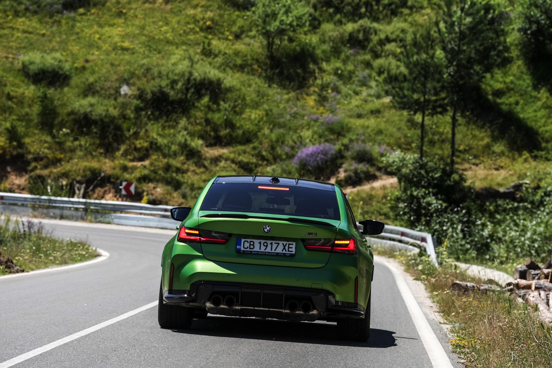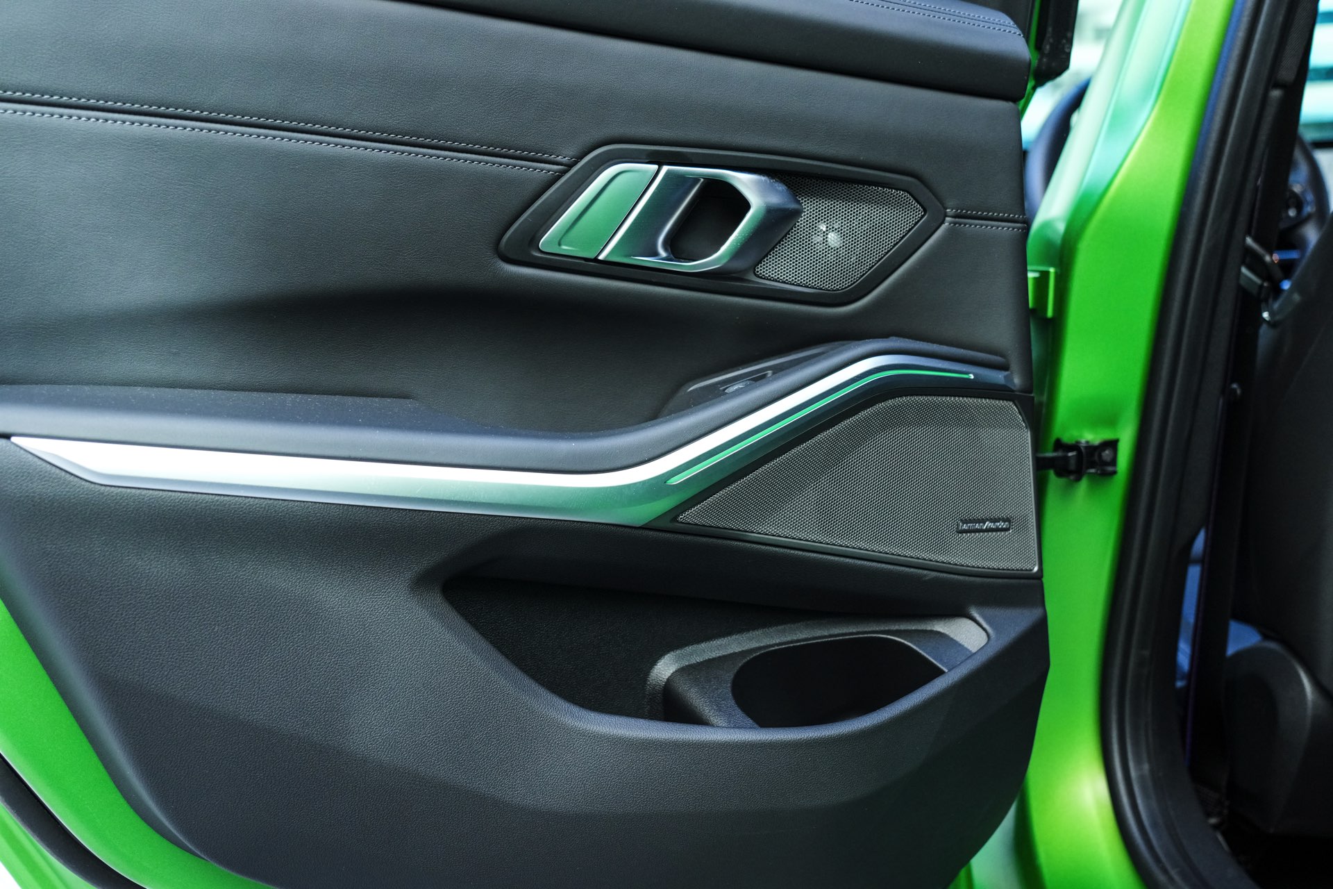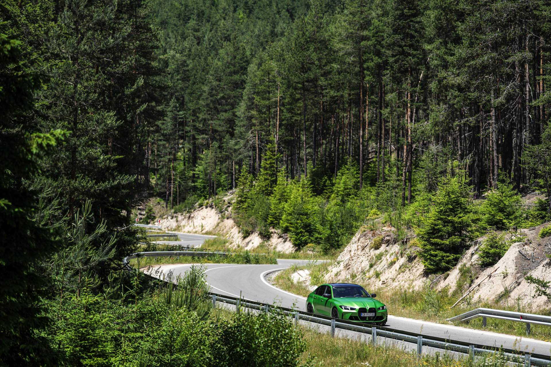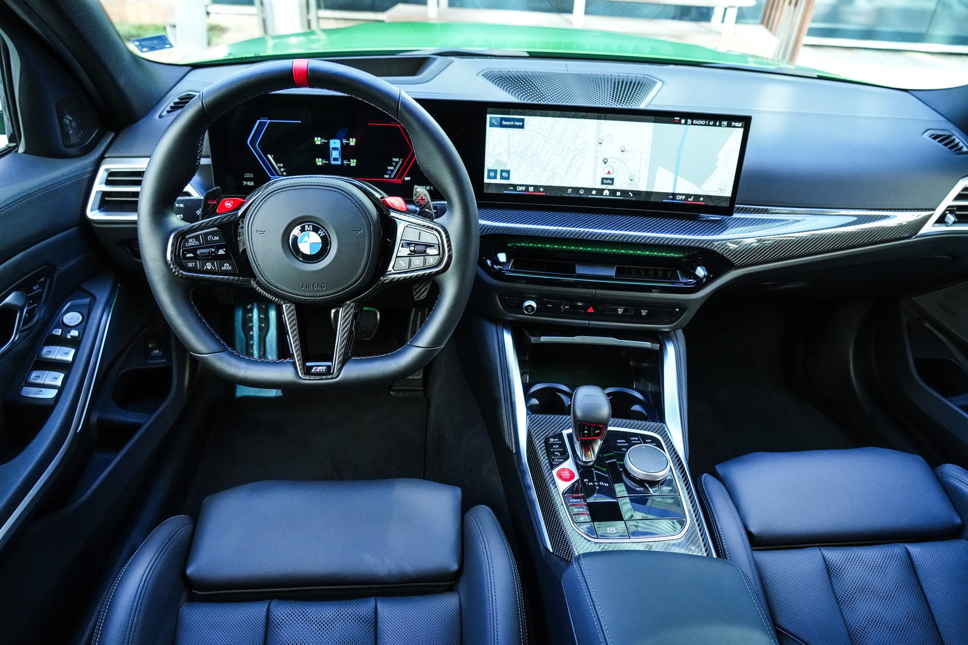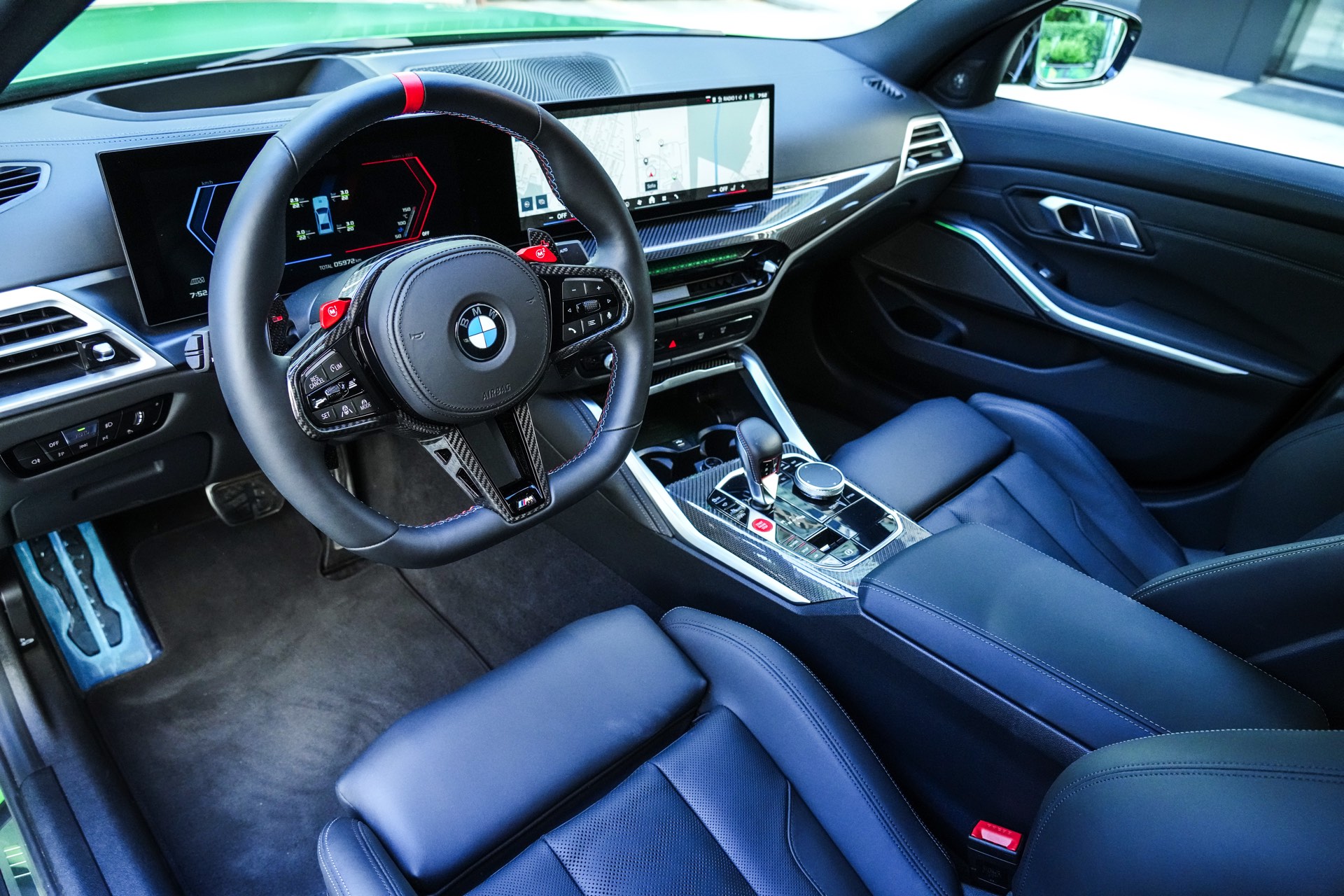 Am gezeigten Fahrzeug wird der Sonderwunsch-Lack Frozen Tampa Bay Green mit vielen dunklen Elementen kombiniert: Zum serienmäßigen Carbon-Dach kommt das M Carbon Exterieur-Paket, das unter anderem für Carbon-Außenspiegel, einen Carbon-Diffusor, eine Carbon-Spoilerlippe und entsprechende Blenden für die Lufteinlässe unterhalb der Scheinwerfer sorgt. Passend dazu trägt der gezeigte BMW M3 auch schwarze Felgen, denn wir sehen die vorne 19 und hinten 20 Zoll großen Schmiederäder Doppelspeiche 826 M Schwarz, die auf Wunsch auch ab Werk mit Track-Bereifung erhältlich sind. "