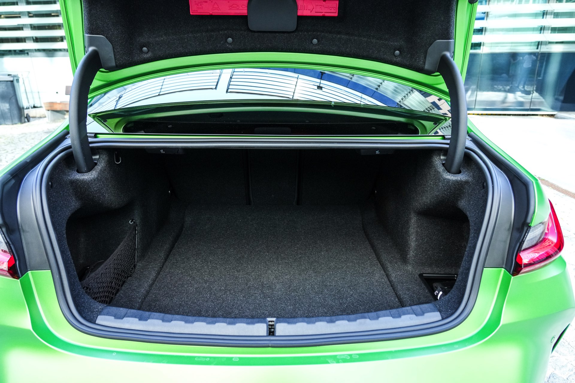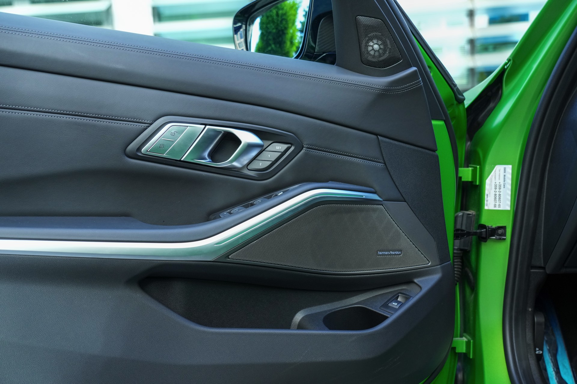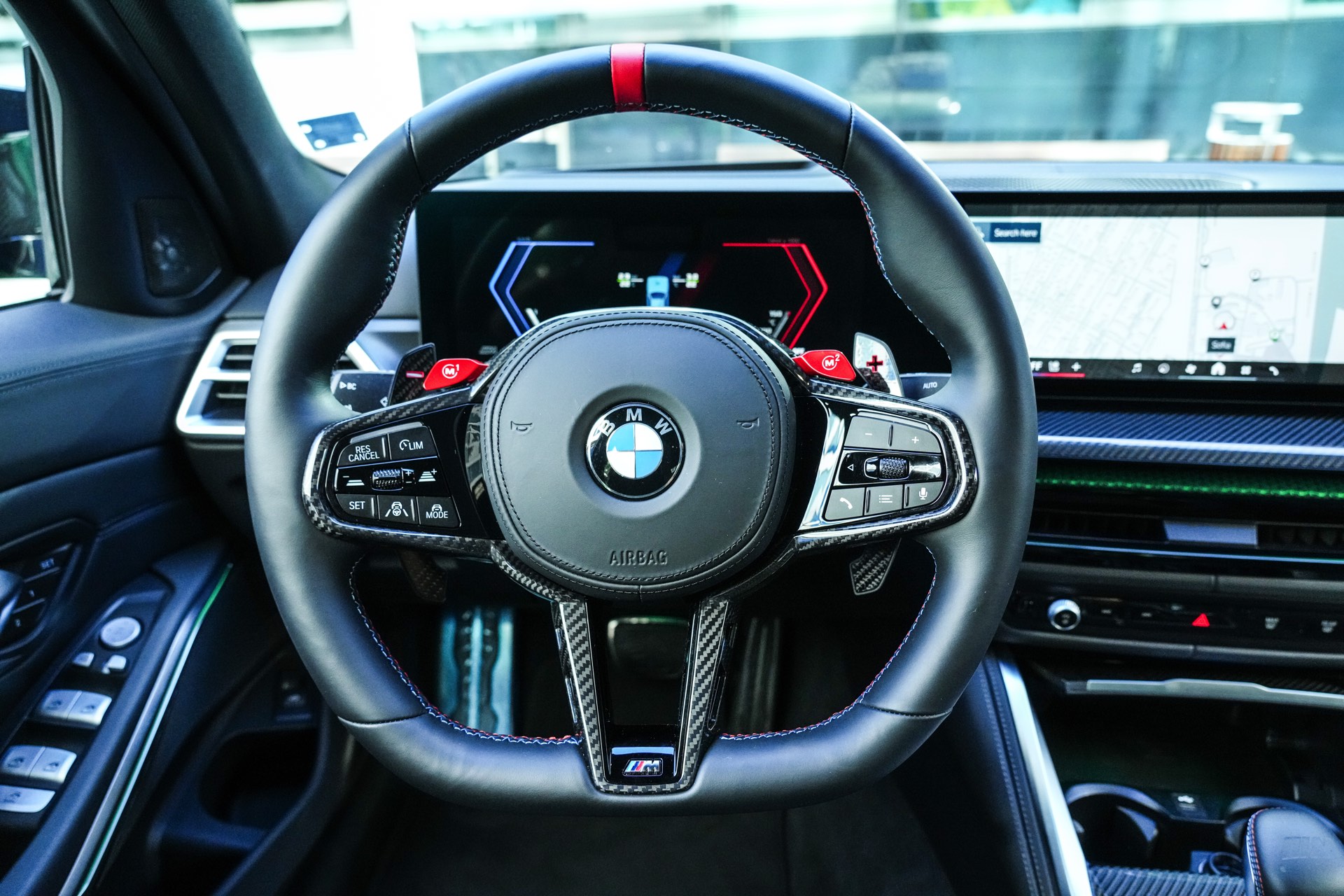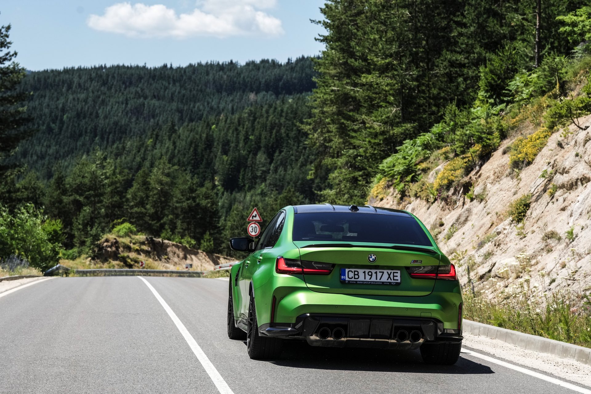 Am gezeigten Fahrzeug wird der Sonderwunsch-Lack Frozen Tampa Bay Green mit vielen dunklen Elementen kombiniert: Zum serienmäßigen Carbon-Dach kommt das M Carbon Exterieur-Paket, das unter anderem für Carbon-Außenspiegel, einen Carbon-Diffusor, eine Carbon-Spoilerlippe und entsprechende Blenden für die Lufteinlässe unterhalb der Scheinwerfer sorgt. Passend dazu trägt der gezeigte BMW M3 auch schwarze Felgen, denn wir sehen die vorne 19 und hinten 20 Zoll großen Schmiederäder Doppelspeiche 826 M Schwarz, die auf Wunsch auch ab Werk mit Track-Bereifung erhältlich sind. "