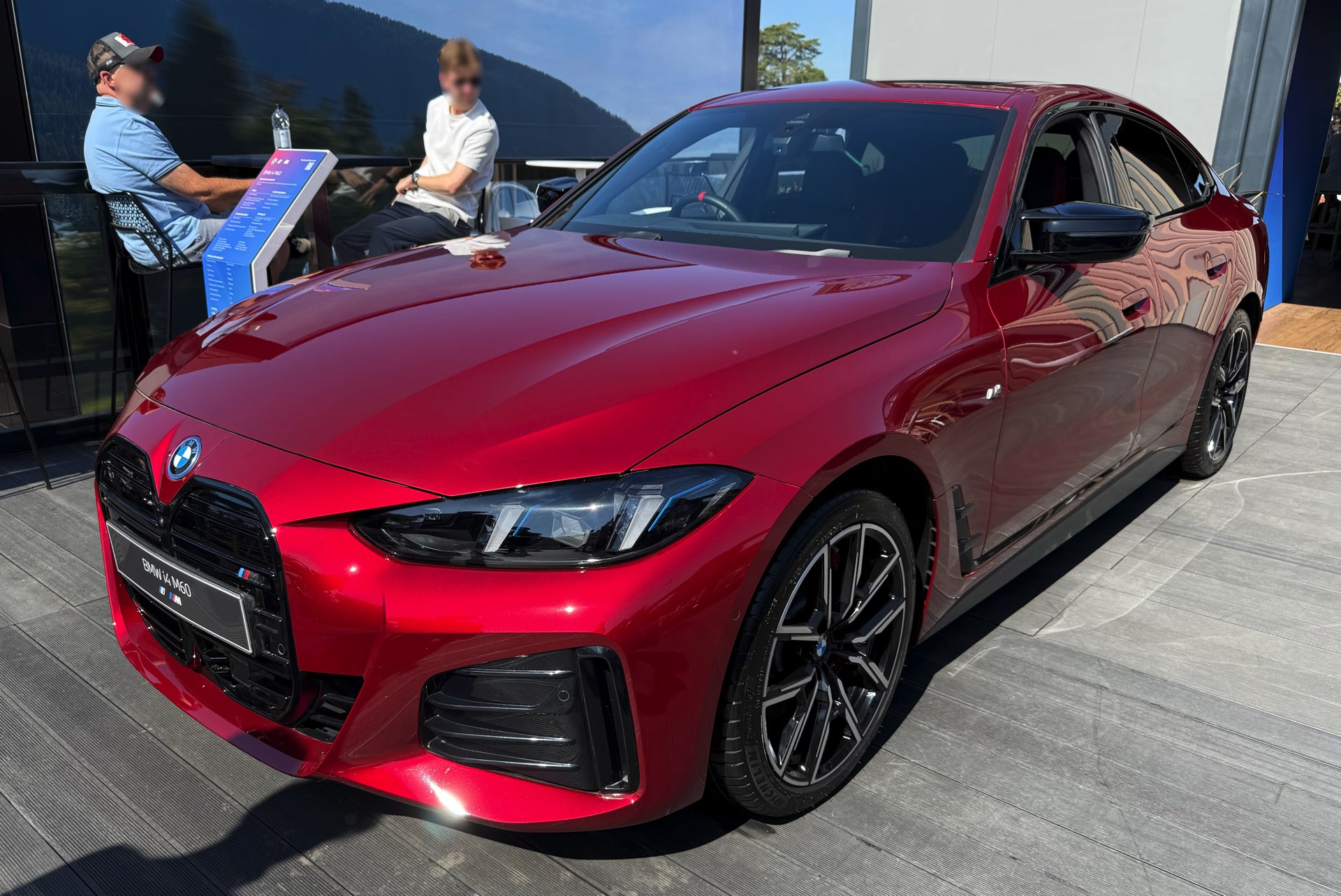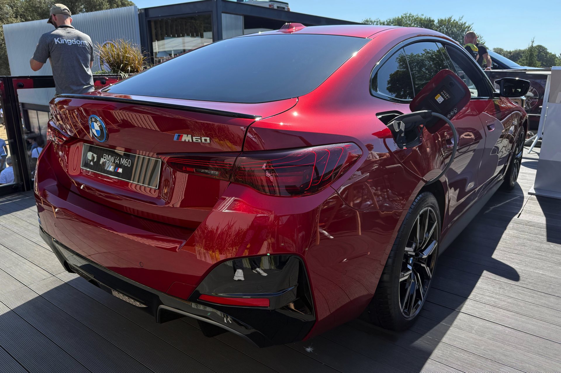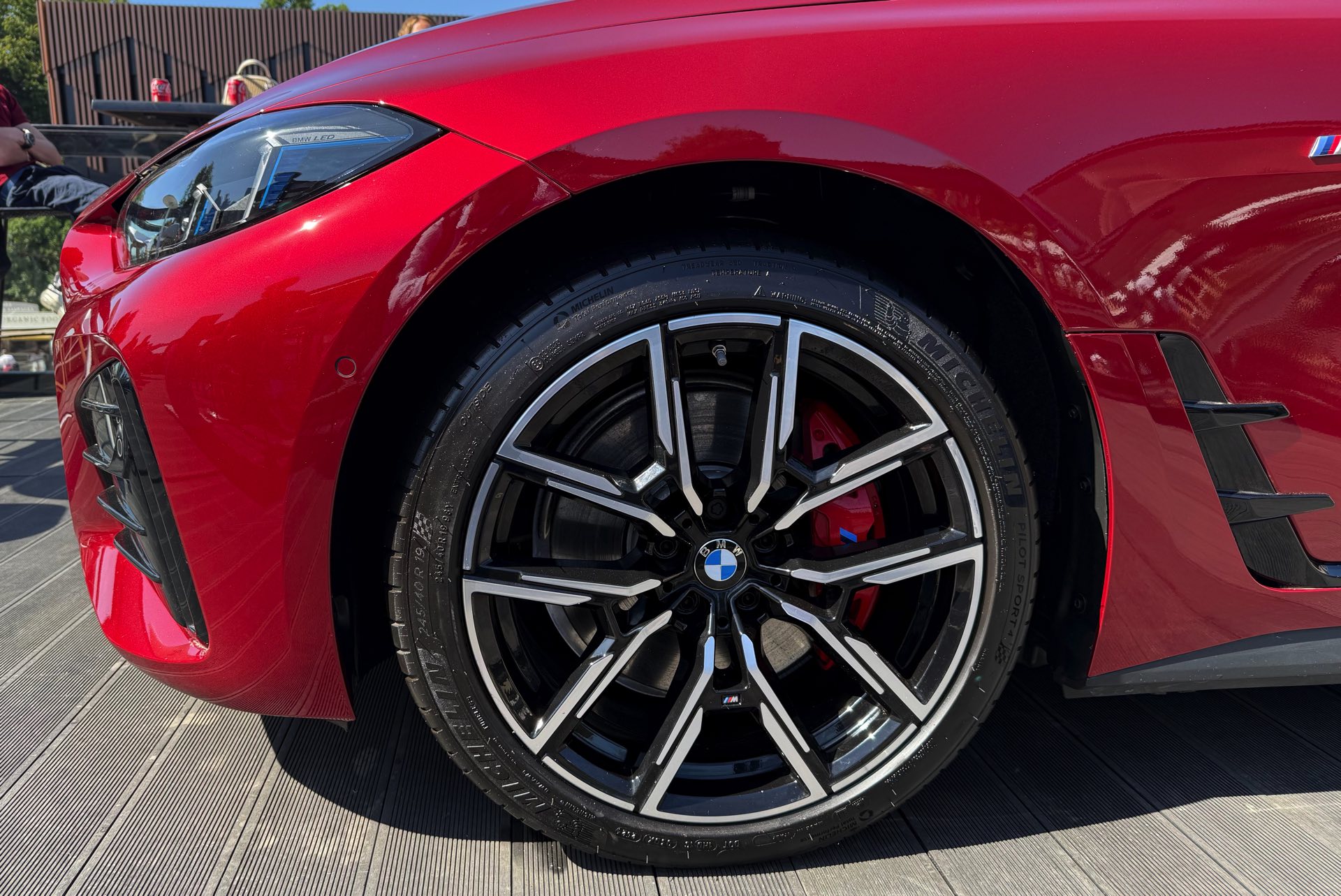 Beim Goodwood Festival of Speed 2025 glänzt der BMW i4 M60 in Fire Red Metallic, außerdem trägt er die 19 Zoll großen Leichtmetallräder Y-Speiche 859 M Bicolor: