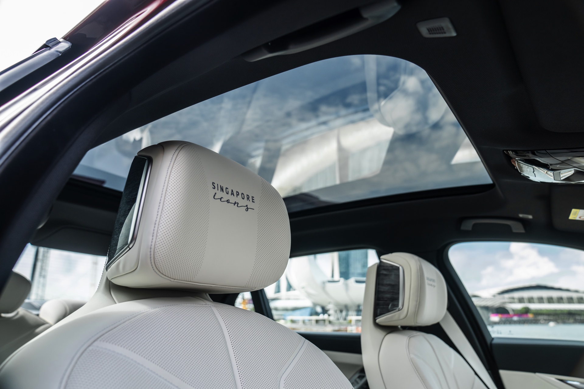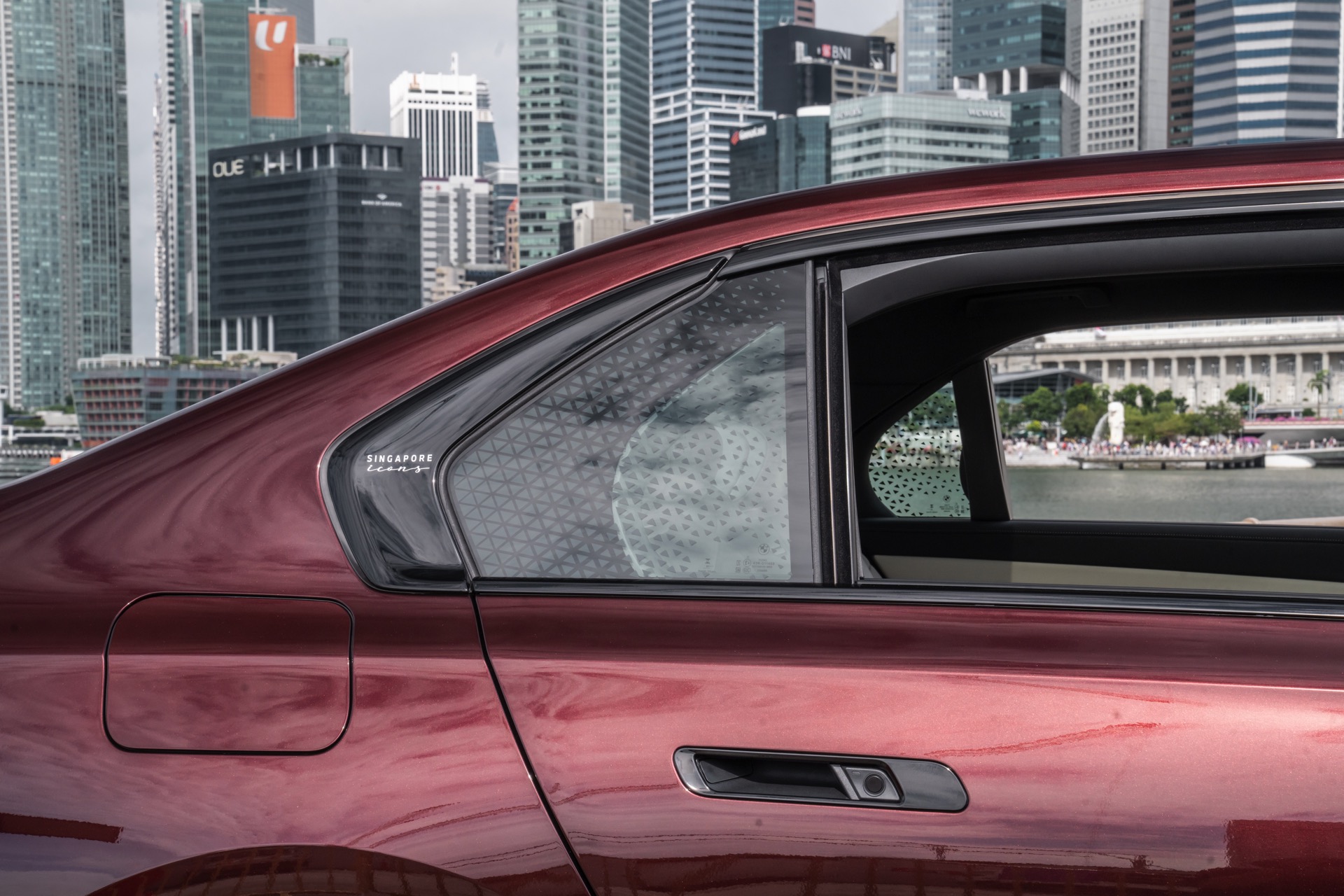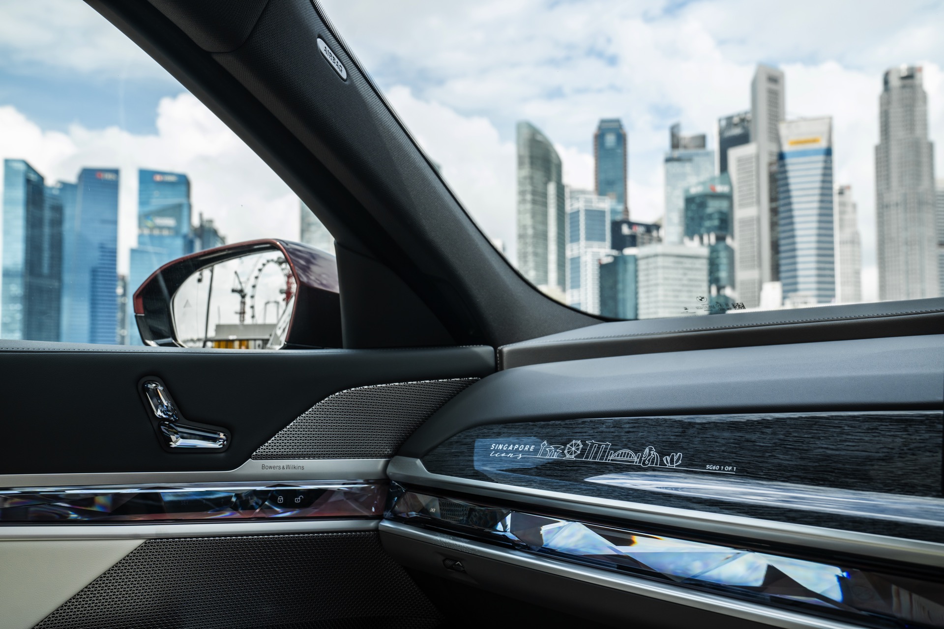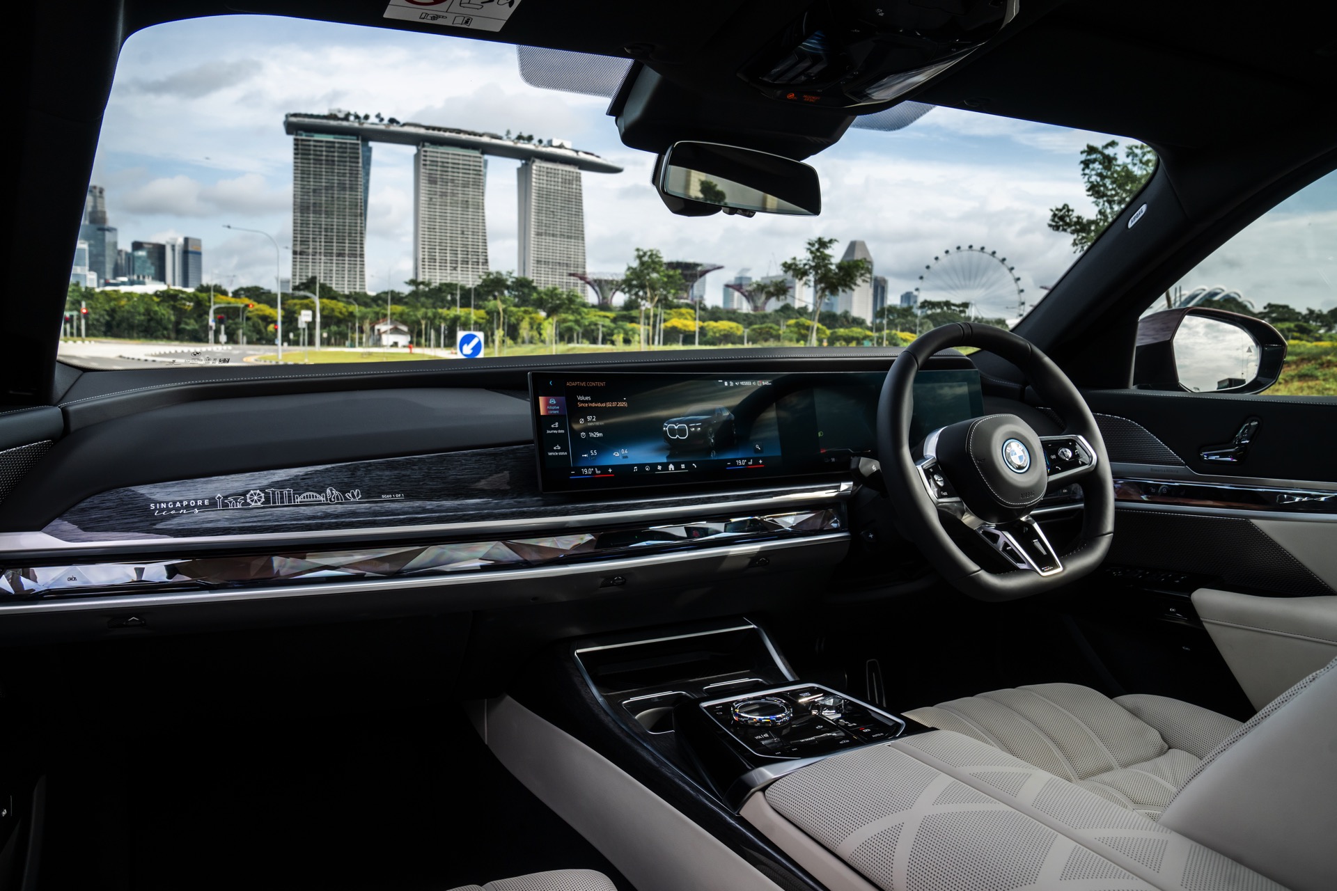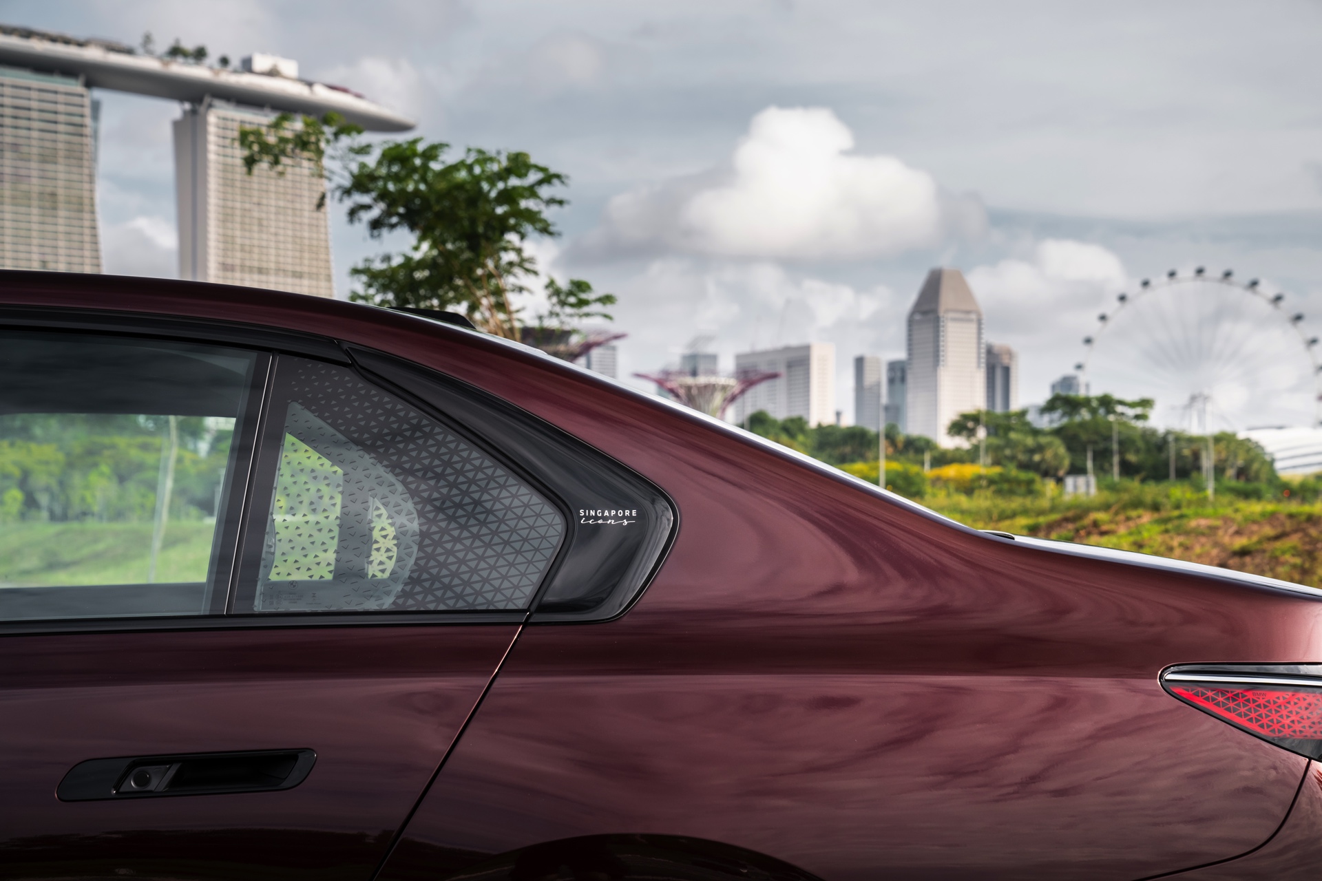 Das Interieur kommt mit Merino-Leder in Rauchweiß, sodass der rote BMW i7 die Farben der Flagge Singapurs aufgreift. Die Kopfstützen tragen einen gestickten “Singapore Icons”-Schriftzug und in das Holz der Interieurleisten wurden gleich sieben Ikonen der städtischen Skyline eingearbeitet. Die Nachbildung der Skyline wurde per Laser aus einem 27,5 Zentimeter breiten und weniger als einen Millimeter dicken Metall geschnitten.